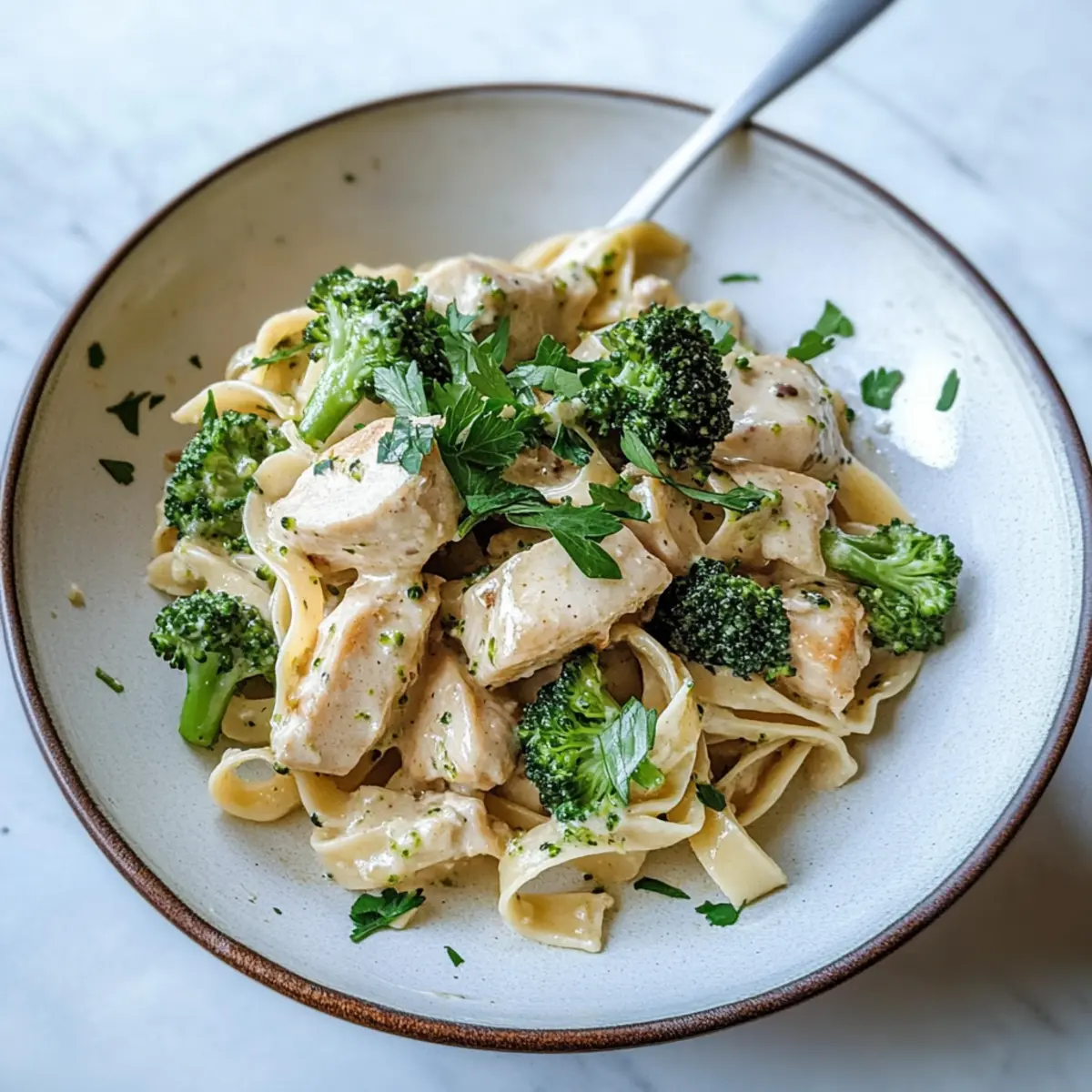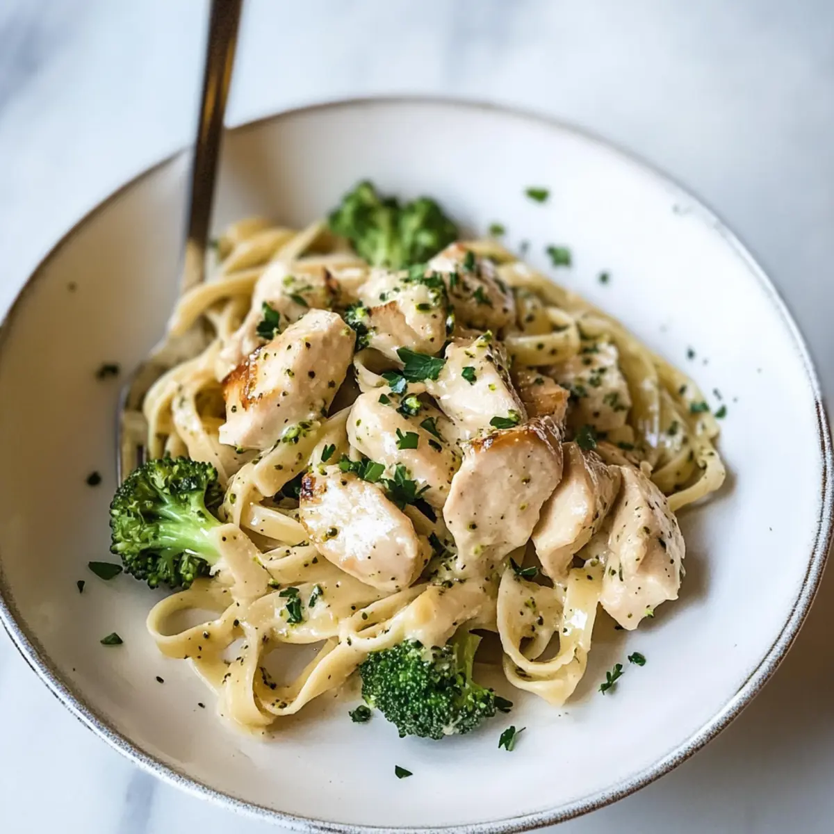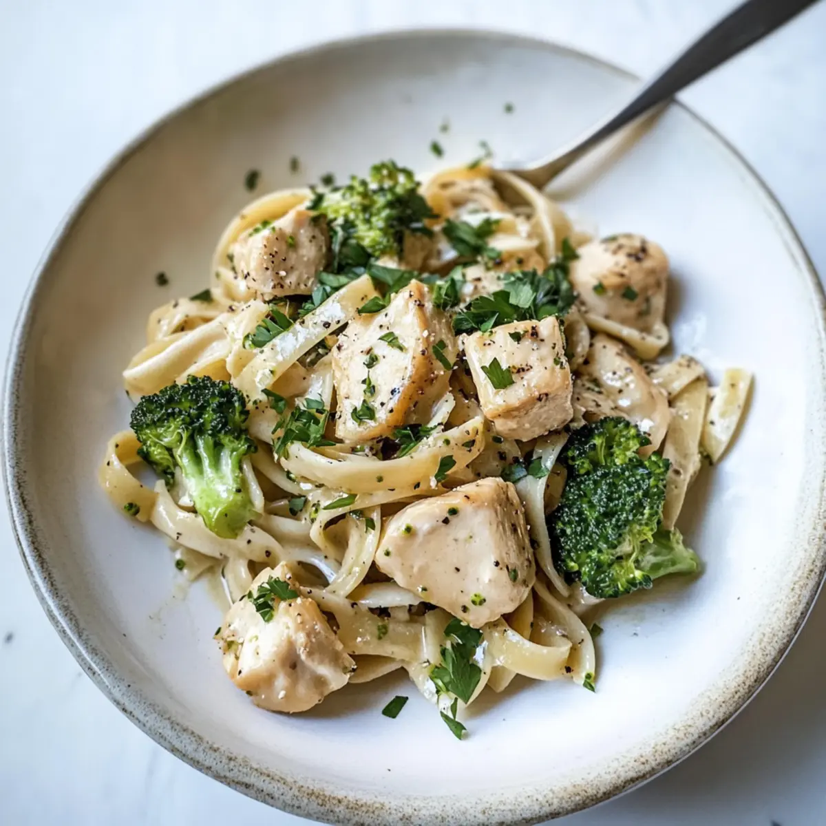 Während ich fröhlich in meiner Küche herumwerkelt, erinnere ich mich an die Momente, in denen ich ein schnelles, aber köstliches Gericht zaubern wollte, vor allem an stressigen Tagen. Heute präsentiere ich euch mein Rezept für das 20 Minuten Hähnchen Alfredo, das in kürzester Zeit auf den Tisch kommt und dabei absolut himmlisch schmeckt! Mit einer einzigartigen, cremigen Sauce aus eingeweichten Sonnenblumenkernen ist dieser glutenfreie Nudeltraum nicht nur eine wunderbare Wahl für alle, die auf Milchprodukte verzichten möchten, sondern auch außergewöhnlich gesund. Dabei sorgt die Kombination aus zarten Hähnchenstücken und knackigem Gemüse für die perfekte Balance auf dem Teller. Wer möchte nicht ein schnelles Abendessen, das sowohl sättigend als auch nährstoffreich ist? Seid ihr bereit, den Kochlöffel zu schwingen und euren Gaumen zu verwöhnen? Warum ist dieses Rezept besonders? Schnelligkeit: In nur 20 Minuten könnt ihr dieses köstliche Hähnchen Alfredo zubereiten – perfekt für hektische Wochentage. Gesundheitlich wertvoll: Die cremige Sauce aus Sonnenblumenkernen macht dieses Gericht nicht nur lecker, sondern auch nährstoffreich. Vielseitigkeit: Ihr könnt es leicht anpassen, indem ihr Gemüse wie Spinat oder Paprika hinzufügt. Dairy-Free Genuss: Ideal für alle, die Milchprodukte meiden möchten, ohne auf cremigen Geschmack zu verzichten. Familienfreundlich: Dieses Gericht wird von Groß bis Klein geliebt, perfekt für ein schnelles Abendessen mit der Familie. Praktisch: Die Verwendung von glutenfreien Pasta und einfachen Zutaten macht die Zubereitung kinderleicht. Probiert auch unbedingt meine anderen schnellen Rezepte für unbeschwerte Kochabende aus – hier geht’s zum Überblick. 20 Minuten Hähnchen Alfredo Zutaten • Für eine schnelle Zubereitung erhaltet ihr hier die perfekten Zutaten für euer 20 Minuten Hähnchen Alfredo! Für die Sauce Eingeweichte Sonnenblumenkerne – diese bieten eine cremige Basis ohne Milchprodukte. Olivenöl oder pflanzliche Butter – sorgt beim Sautieren für einen reichen Geschmack; könnt ihr auch durch jedes pflanzliche Öl ersetzen. Weißwein oder Gemüsebrühe – bringt Tiefe in die Sauce; Hühnerbrühe sorgt ebenfalls für tolles Aroma. Für das Gericht Hähnchenbrustfilets – Hauptquelle für Protein; in kleine Würfel schneiden für gleichmäßiges Garen. Meersalz – hebt den Geschmack hervor; je nach Vorliebe anpassen. Lauch – sorgt für einen milden Zwiebelgeschmack; auch Frühlingszwiebeln sind eine gute Alternative. Brokkoli – bietet Vitamine und Frische; kann durch Spinat oder Erbsen ersetzt werden. Glutenfreie Fettuccine oder Linguine – die perfekte glutenfreie Pasta; bitte spezifische Marken für bestes Ergebnis wählen. Frisch gehackte Petersilie oder Schnittlauch – für einen Hauch von Frische und beste Präsentation; falls nicht vorhanden, einfach weglassen. Mit diesen Zutaten seid ihr bestens gerüstet für euer leckeres 20 Minuten Hähnchen Alfredo! Schritt-für-Schritt-Anleitung für 20 Minuten Hähnchen Alfredo Step 1: Wasser zum Kochen bringen Bringt einen großen Topf mit gesalzenem Wasser zum Kochen. Wenn das Wasser sprudelnd kocht, fügt die glutenfreien Fettuccine oder Linguine hinzu und kocht sie nach den Anweisungen auf der Verpackung, bis sie al dente sind. Dies dauert etwa 8-10 Minuten. Während die Pasta kocht, bereitet ihr die anderen Zutaten vor. Step 2: Sauce zubereiten Nehmt einen Mixer und fügt die eingeweichten Sonnenblumenkerne zusammen mit etwas Wasser, einer Prise Salz und optional etwas Zitronensaft hinzu. Mixen bis eine cremige Konsistenz entsteht. Diese Soße wird das Herzstück eures 20 Minuten Hähnchen Alfredo. Lasst den Mixer zur Seite stehen, denn später wird die Sauce mit den anderen Komponenten kombiniert. Step 3: Hähnchen braten Erhitzt in einer großen Pfanne bei mittelhoher Hitze Olivenöl oder pflanzliche Butter. Fügt die in Würfel geschnittenen Hähnchenbrustfilets hinzu und würzt sie mit Meersalz. Bratet das Hähnchen etwa 7-10 Minuten lang, bis es goldbraun und durchgegart ist. Rührt gelegentlich um, damit es gleichmäßig gart, und nehmt das Hähnchen dann aus der Pfanne. Step 4: Gemüse sautieren In der gleichen Pfanne gebt ihr die geschnittenen Lauch und den Brokkoli hinzu. Sautiert diese Mischung für etwa 3 Minuten, bis das Gemüse eine leuchtende Farbe annimmt. Würzt sie dabei mit etwas Salz. Der Brokkoli sollte frisch und knackig bleiben. Fügt anschließend den Weißwein oder die Gemüsebrühe hinzu und lasst es für 2 Minuten köcheln, bis die Flüssigkeit fast verdampft ist. Step 5: Pasta abtropfen lassen Wenn die Pasta fertig ist, hebt eine Tasse des Kochwassers auf und lässt die restliche Pasta abtropfen. Dieses Kochwasser wird später verwendet, um die Sauce zu verfeinern. Daher ist es wichtig, diese Reservierung nicht zu vergessen! Step 6: Alles kombinieren Fügt nun die abgetropfte Pasta zusammen mit dem Hähnchen und der cremigen Sonnenblumensauce in die Pfanne mit dem sautierten Gemüse. Vermischt alles gut, sodass die Pasta gleichmäßig mit der Sauce überzogen ist. Falls die Sauce zu dick ist, gebt nach Bedarf etwas von dem reservierten Kochwasser hinzu, bis die gewünschte Konsistenz erreicht ist. Step 7: Servieren und garnieren Serviert das 20 Minuten Hähnchen Alfredo sofort auf großen Tellern oder in tiefen Schalen. Garniert das Gericht mit frisch gehackter Petersilie oder Schnittlauch für einen Hauch von Frische und optischer Attraktivität. Das Gericht ist jetzt bereit, genossen zu werden! Lagerungstipps für 20 Minuten Hähnchen Alfredo Kühlschrank: Bewahrt das Hähnchen Alfredo in einem luftdichten Behälter auf, wo es bis zu 3 Tage frisch bleibt. Gefrierschrank: Ihr könnt das Gericht auch einfrieren, aber es ist am besten, die Pasta separat aufzubewahren, da sie beim Auftauen an Textur verlieren kann. Hält sich bis zu 2 Monate. Wiederehitzen: Beim Erwärmen auf dem Herd fügt einen Spritzer Wasser oder Brüh