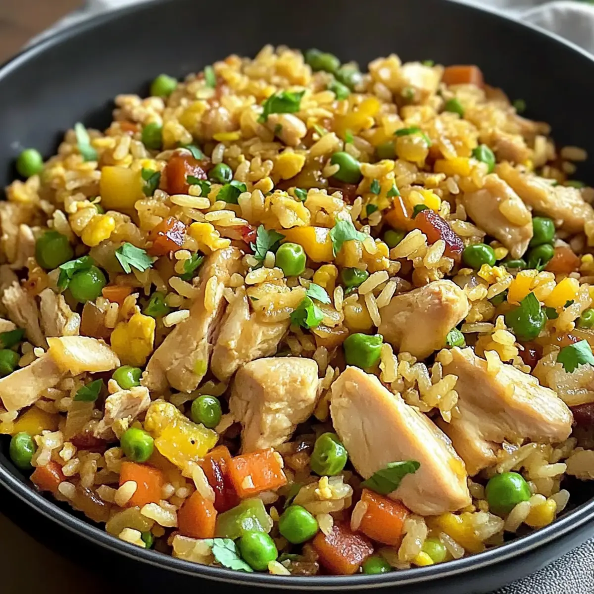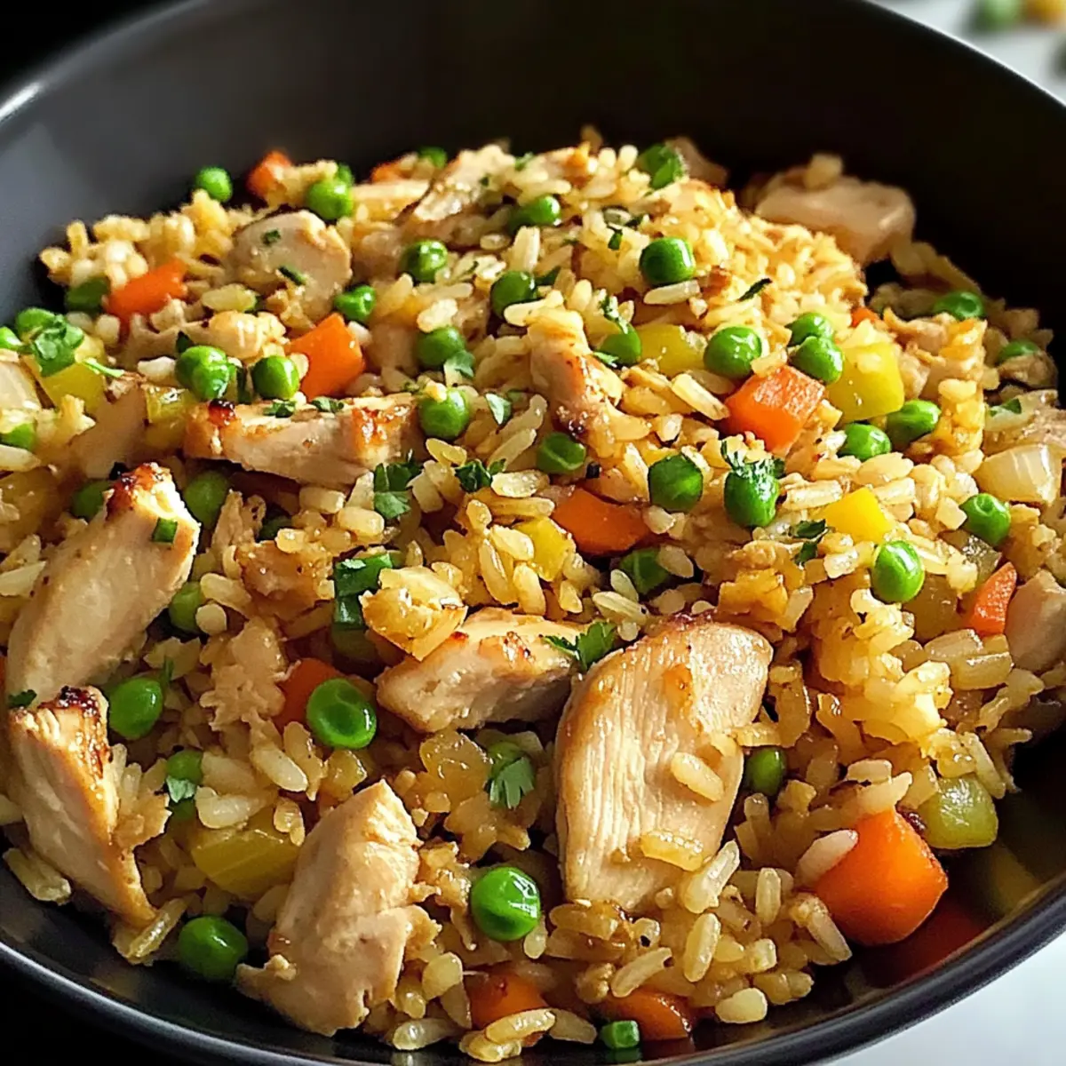 Irgendetwas an diesem gemütlichen Abend erinnerte mich an das lebhafte Treiben in einem asiatischen Restaurant. Der Duft von frisch gebratenem Hähnchen, knusprigem Bacon und knackigem Gemüse zog mich sofort in seinen Bann. Mein Rezept für Asiatischer Hähnchen gebratener Reis benötigt nur 20 Minuten und ist dabei eine fantastische Lösung für stressige Wochentage. Es vereint die Vorteile einer schnellen Zubereitung und der Tatsache, dass man mit übrig gebliebenem Reis eine köstliche Mahlzeit zaubern kann. Perfekt für die ganze Familie, wird dieses Gericht selbst die wählerischsten Esser begeistern! Neugierig, wie du mit wenigen Zutaten ein unvergessliches Geschmackserlebnis schaffen kannst? Warum wirst du dieses Rezept lieben? Einfache Zubereitung: Du brauchst nur 20 Minuten, um dieses köstliche Gericht zuzubereiten – ideal für hektische Abende! Vielseitig: Passe das Rezept an deinen Geschmack an, indem du Hähnchen gegen Garnelen oder Tofu tauschst. Perfektes Aroma: Die Kombination aus geröstetem Sesamöl und Sojasauce verleiht deinem gebratenen Reis eine unwiderstehliche Tiefe. Familienfreundlich: Dieses Gericht wird selbst die wählerischsten Esser begeistern und ist ideal für die ganze Familie. Wenn du auf der Suche nach weiteren köstlichen Ideen bist, schau dir auch meine Hähnchen Reis Bowl oder den Hähnchen mit Reis an! Asiatischer Hähnchen gebratener Reis Zutaten • Für die Sauce: Chinesischer Reiswein – sorgt für eine tiefere Geschmacksnote; alternativ kann trockener Sherry verwendet werden. Austernsauce – fügt einen herzhaften Umami-Geschmack hinzu; hochwertige Marken wie Lee Kum Kee erzielen die besten Ergebnisse. Hellsojasauce – verstärkt den Gesamtgeschmack; Low-Sodium-Sojasauce kann als weniger salzige Option genutzt werden. Sesamöl – bringt ein nussiges Aroma; verwende geröstetes Sesamöl für einen intensiveren Geschmack. Weiße Pfeffer – sorgt für subtile Schärfe. Gemahlener Ingwer – verleiht Wärme und Komplexität; frisch geriebener Ingwer kann alternativ verwendet werden. • Für das Pfannen-Gericht: Öl (zum Kochen) – nötig für das Anbraten der Zutaten; kann durch Raps- oder Erdnussöl ersetzt werden. Eier (2 große) – sorgen für Reichhaltigkeit und Protein; leicht unterkochen, um die Feuchtigkeit zu bewahren. Hähnchenbrust (225 g, in 1,5 cm große Stücke geschnitten) – die Hauptquelle für Protein; gekochte Garnelen oder Tofu sind gute Alternativen. Bacon (4 Scheiben, in 1,5 cm große Stücke geschnitten) – sorgt für zusätzlichen Geschmack und Knusprigkeit. Knoblauch (3 Zehen, fein gehackt) – essenzielle Aromatik. Zwiebel (1 mittelgroße, gewürfelt) – fügt Süße und Tiefe hinzu. Karotte (1 mittelgroße, fein gewürfelt) – sorgt für Farbe und Süße. Erbsen (½ Tasse) – tragen zur Farbe und Nährstoffreichhaltigkeit bei. Gekochter weißer Reis (4 Tassen, am Vortag zubereitet und gekühlt) – bildet die Basis des Gerichts; ideal für die perfekte Textur. Frischer Reis sollte abgekühlt werden, um Klumpen zu vermeiden. Frühlingszwiebeln (2 Stangen, in Scheiben geschnitten, Weiß- und Grünanteile getrennt) – für Garnitur und Geschmacksverbesserung. • Für das Garnieren: Frische Kräuter wie Koriander oder Basilikum – verleihen eine frische Note. Mit diesen Zutaten bist du bereit, einen köstlichen Asiatischen Hähnchen gebratenen Reis zuzubereiten, der sowohl schnell als auch anpassbar ist! Schritt-für-Schritt-Anleitung für Asiatischer Hähnchen gebratener Reis Step 1: Sauce zubereiten Mische in einer kleinen Schüssel 2 Esslöffel chinesischen Reiswein, 2 Esslöffel Austernsauce, 1 Esslöffel hellsojasauce, 1 Teelöffel Sesamöl, ¼ Teelöffel weiße Pfeffer und 1 Teelöffel gemahlenen Ingwer. Rühre gut um, bis sich alle Zutaten verbinden. Diese aromatische Sauce verleiht deinem Asiatischen Hähnchen gebratenen Reis eine köstliche Tiefe. Step 2: Zutaten vorbereiten Hacke 3 Zehen Knoblauch, würfle 1 Zwiebel und schneide 1 Karotte in feine Stücke. Achte darauf, die Frühlingszwiebeln zu schneiden, dabei die weißen von den grünen Teilen zu trennen. Schneide auch 225 g Hähnchenbrust und 4 Scheiben Bacon in kleine Stücke. Halte die vorbereiteten Zutaten griffbereit, um den Kochvorgang reibungslos und schnell zu gestalten. Step 3: Eier anbraten Erhitze eine große Pfanne oder einen Wok bei mittlerer Hitze und füge 1 Esslöffel Öl hinzu. Schlage 2 Eier in die Pfanne und rühre sie 2-3 Minuten lang, bis sie fest, aber leicht feucht sind. Schiebe die Eier an den Rand der Pfanne und halte sie warm, während du die anderen Zutaten kochst. Step 4: Bacon knusprig braten Gib die geschnittenen Bacon-Stücke in die Pfanne und brate sie für etwa 3 Minuten, bis sie goldbraun und knusprig sind. Achte darauf, die Temperatur nicht zu hoch zu wählen, um ein Anbrennen zu vermeiden. Füge dann den gehackten Knoblauch und die Zwiebel hinzu und brate alles zusammen, bis die Zwiebel glasig wird und der Knoblauch duftet (circa 1 Minute). Step 5: Hähnchen anbraten Füge die geschnittene Hähnchenbrust in die Pfanne und brate sie 1-1,5 Minuten, bis sie durchgegart ist und keine rosa Stellen mehr sichtbar sind. Achte darauf, das Fleisch gründlich zu rühren, damit es gleichmäßig gart. Wenn das Hähnchen fast durch ist, geht es weiter zur nächsten Zutat, um die Aromen zu intensivieren. Step 6: Gemüse hinzufügen Gib die gewürfelte Karotte, ½ Tasse Erbsen und ½ Tasse Mais in die Pfanne. Rühre alles gut durch und brate es für weitere 1–2 Minuten, bis das Gemüse schön knackig und bunte Farben sichtbar sind. Diese Mischung sorgt dafür, dass das Gemüse frisch bleibt und den Asiatischen Hähnchen gebratenen Reis lebendig macht. Step 7: Reis und Sauce einarbeiten Füge 4 Tassen gekochten, abgekühlten weißen Reis hinzu und zerkleinere etwaige Klumpen mit einem Holzlöffel. Gieße die vorbereitete Sauce über den Reis und mische alles gut durch. Lasse den Reis für 1-1,5 Minuten unter ständigem Rüh