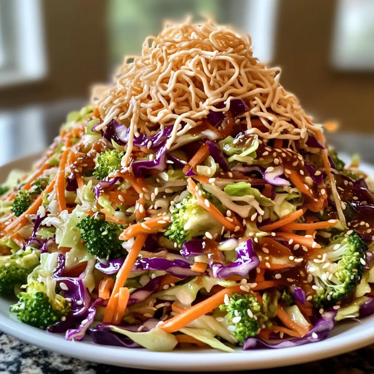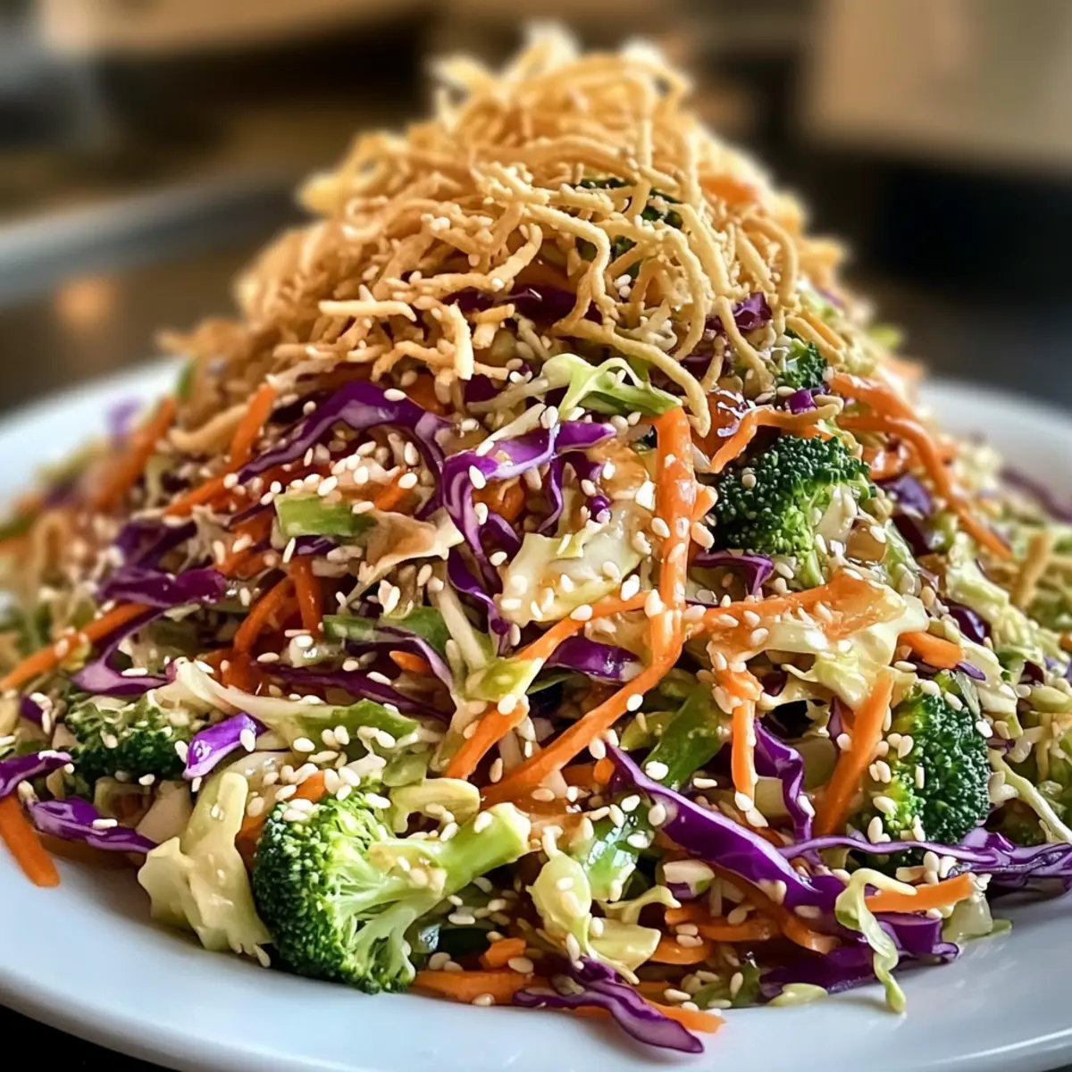 Füge die knusprigen Chow Mein-Nudeln oder Wontonstreifen kurz vor dem Servieren hinzu, damit sie ihren Crunch behalten. Diese zusätzlichen Texturen machen deinen Asiatischen Kohlsalat noch interessanter. Mische sanft, damit die Toppings gleichmäßig verteilt sind, ohne dass sie zerbrechen.