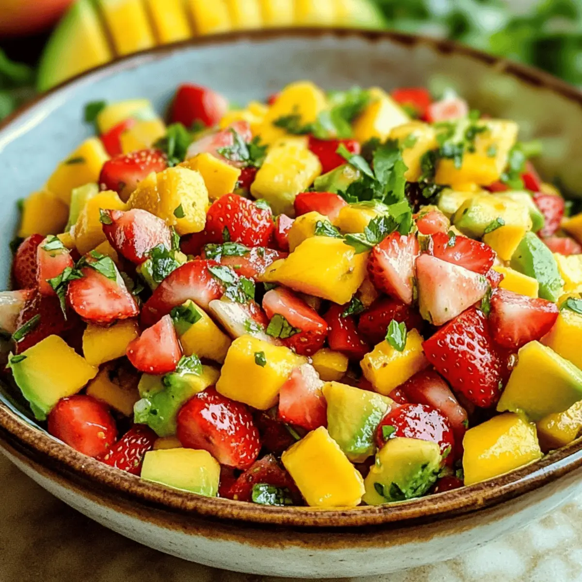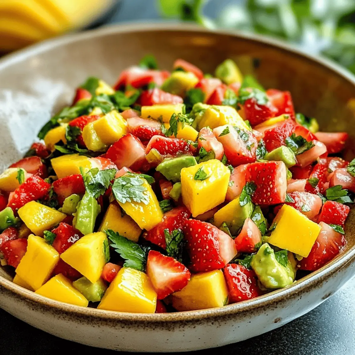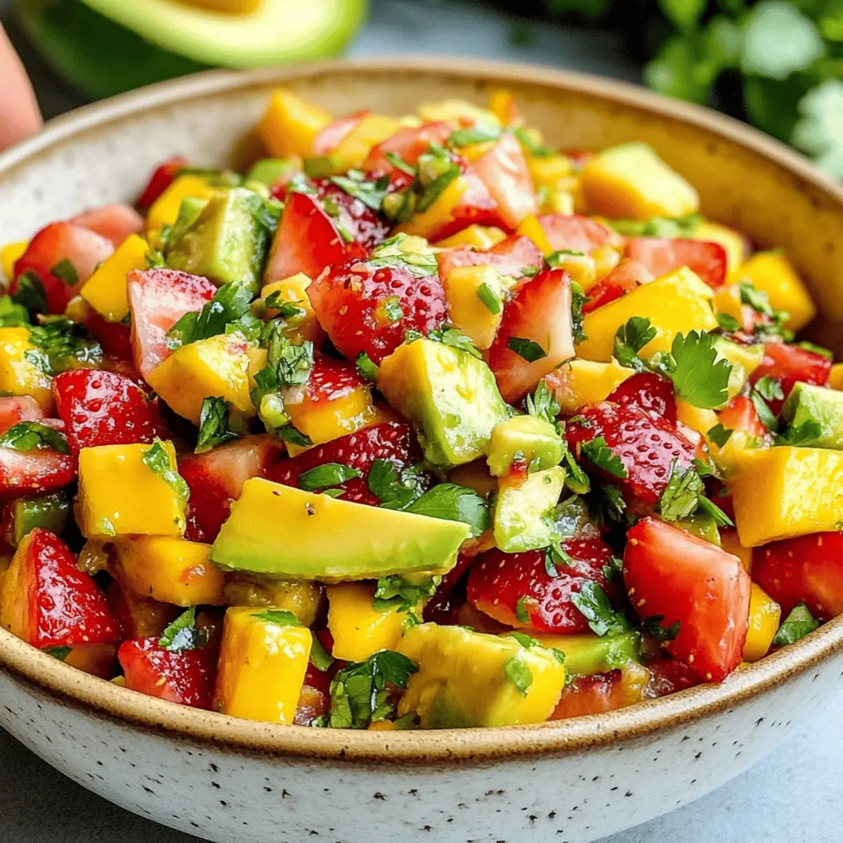Sommerzeit ist für mich die beste Zeit, um meinen Tisch mit leichten, frischen Snacks zu dekorieren. Diese Avocado Erdbeere Mango Salsa fängt die Essenz der warmen Tage perfekt ein und kombiniert die cremige Textur der Avocado mit der süßen Frische von reifen Erdbeeren und Mangos. Ein Hauch von Jalapeño bringt eine angenehme Schärfe ins Spiel, die diese Salsa zum idealen Begleiter für Grillabende macht. Egal, ob mit knusprigen Multigrain-Pita-Chips oder als Topping für gegrilltes Fleisch, dieses Rezept ist nicht nur gesund und vegan, sondern auch unglaublich vielseitig! Ich freue mich darauf, mit dir zu teilen, wie einfach es ist, diesen bunten Genuss zuzubereiten. Bist du bereit, deine Sommerpartys mit einem fruchtigen Highlight zu bereichern? Warum ist diese Salsa so besonders? Frische Aromen: Die Kombination aus Avocado, Erdbeeren und Mango sorgt für einen erfrischenden Geschmack, der perfekt in den Sommer passt. Einfache Zubereitung: Mit nur wenigen Zutaten und minimalem Aufwand ist diese Salsa im Handumdrehen gemacht. Vielseitig: Serviere sie mit Pita-Chips oder als Topping für deine Lieblingsgerichte, wie gegrilltes Hähnchen oder Fisch. Gesund und nahrhaft: Diese vegane und glutenfreie Salsa ist nicht nur lecker, sondern auch kalorienarm und vollwertig. Zum Ausprobieren bieten sich auch Variationen an, wie die Zugabe von frischer Minze oder gegrilltem Mais – so bleibt es spannend! Avocado Erdbeere Mango Salsa Zutaten • Eine köstliche Mischung für den Sommer! Für die Salsa Gehackte Erdbeeren – sorgen für eine süße und lebendige Farbe. Hinweis: Etwas mehr als ein halbes Pfund, das entspricht etwa 1 Tasse. Gehackte reife Mango – fügt tropische Süße und Textur hinzu. Hinweis: Verwende das Fruchtfleisch von 2 großen Mangos; Pfirsiche oder Ananas können auch verwendet werden. Gehackte Avocado – bringt Cremigkeit und gesunde Fette. Hinweis: Achte auf Reife für eine glatte Textur. Jalapeño – sorgt für Wärme und Geschmacksbalance. Hinweis: Entkerne und hacke für eine moderate Schärfe; kann für eine mildere Salsa weggelassen werden. Fein gehackte rote Zwiebel – fügt Schärfe und Knackigkeit hinzu. Hinweis: Menge nach Geschmack anpassen. Gehackter Koriander – gibt frische Kräuternoten. Hinweis: Optional, je nach Vorliebe; kann durch Petersilie ersetzt werden. Saft einer kleinen Limette – verbessert den Gesamtgeschmack und hilft, die Avocado vor dem Braunwerden zu schützen. Hinweis: Frisch gepresster Limett Saft ist am besten. Salz – hebt die Aromen der anderen Zutaten hervor. Hinweis: Nach Bedarf verwenden, den Geschmack anpassen. Multigrain Pita-Chips – empfohlen zum Servieren. Hinweis: Auch köstlich mit Tortilla-Chips oder als Belag auf gegrilltem Lachs oder Fisch-Tacos. Schritt-für-Schritt-Anleitung für Avocado Erdbeere Mango Salsa Schritt 1: Zutaten vorbereiten Beginne damit, die Erdbeeren, Mango, Avocado, Jalapeño, rote Zwiebel und den Koriander gründlich zu würfeln. Achte darauf, die Avocado erst kurz vor der Zubereitung zu schneiden, um ihre Frische zu bewahren. Das Würfeln sollte gleichmäßig sein, sodass die Salsa appetitlich aussieht und die Aromen harmonisch in jedem Biss verschmelzen. Schritt 2: Mischen der Zutaten Gib alle gewürfelten Zutaten in eine mittelgroße Schüssel. Vermenge die Erdbeeren, Mango, Avocado, Jalapeño, rote Zwiebel und den Koriander sorgfältig. Achte darauf, die Avocado nicht zu zerdrücken, damit die Salsa eine schöne Textur behält. Die Farben der Zutaten sollten lebhaft und ansprechend sein. Schritt 3: Limettensaft hinzufügen Presse den Saft einer kleinen Limette über die Mischung in der Schüssel aus. Dies verbessert nicht nur den Geschmack der Avocado Erdbeere Mango Salsa, sondern sorgt auch dafür, dass die Avocado nicht braun wird. Mische vorsichtig erneut, um die Aromen zu kombinieren, ohne die Avocado zu zerdrücken. Schritt 4: Mit Salz abschmecken Füge eine Prise Salz hinzu, um die Aromen der Salsa zu verstärken. Rühre behutsam um und probiere die Salsa, um sicherzustellen, dass die Geschmäcker ausgewogen sind. Je nach Vorliebe kannst du mehr Salz hinzufügen, um die Süße der Früchte zu betonen. Schritt 5: Präsentation und Servieren Gib die fertige Avocado Erdbeere Mango Salsa in eine schöne Schüssel und garniere sie mit frischem Koriander, wenn gewünscht. Serviere die Salsa sofort mit knusprigen Multigrain-Pita-Chips oder als köstliches Topping für gegrilltes Fleisch. Achte darauf, dass die Salsa farbenfroh und einladend aussieht. Expert Tips für Avocado Erdbeere Mango Salsa Frische ist entscheidend: Verwende möglichst frische Zutaten, um das beste Aroma zu erzielen. Die Avocado sollte kurz vor der Zubereitung geschnitten werden, um Oxidation zu vermeiden. Schärfe anpassen: Der Jalapeño kann je nach Vorliebe weggelassen oder in der Menge angepasst werden, um die gewünschte Schärfe zu erzielen. Schnippeltechnik: Schneide die Zutaten gleichmäßig klein, damit sie in der Salsa gleichmäßig verteilt sind und harmonisch miteinander schmecken. Beste Aufbewahrung: Lagere Reste in einem luftdichten Behälter im Kühlschrank bis zu 3 Tage. Beachte, dass die Avocado mit der Zeit bräunlich werden kann. Kreative Variationen: Trau dich, mit weiteren Zutaten zu experimentieren! Dessen ungeachtet kannst du frische Kräuter oder gegrillten Mais hinzufügen, um die Avocado Erdbeere Mango Salsa noch interessanter zu gestalten. Vorausplanung für Avocado Erdbeere Mango Salsa Die Avocado Erdbeere Mango Salsa ist perfekt für Meal Prep und spart dir wertvolle Zeit, besonders an hektischen Tagen! Du kannst die Erdbeeren, Mango und rote Zwiebel bis zu 24 Stunden im Voraus würfeln und in einem luftdichten Behälter im Kühlschrank aufbewahren. Für die besten Ergebnisse solltest du die Avocado erst unmittelbar vor der Zubereitung hinzufügen, um ihre Frische zu erhalten. Kombiniere die gewürfelten Zutaten, füge den Limettensaft hinzu und schmecke das Ganze mit Salz ab, wenn du ber