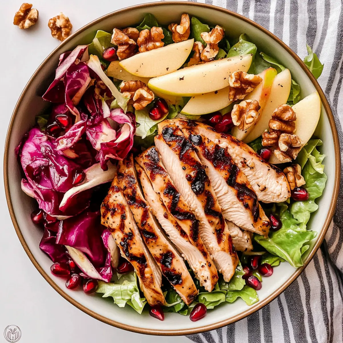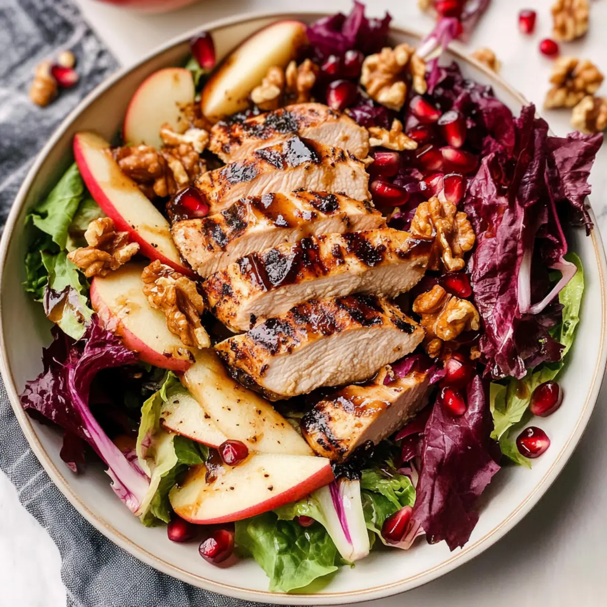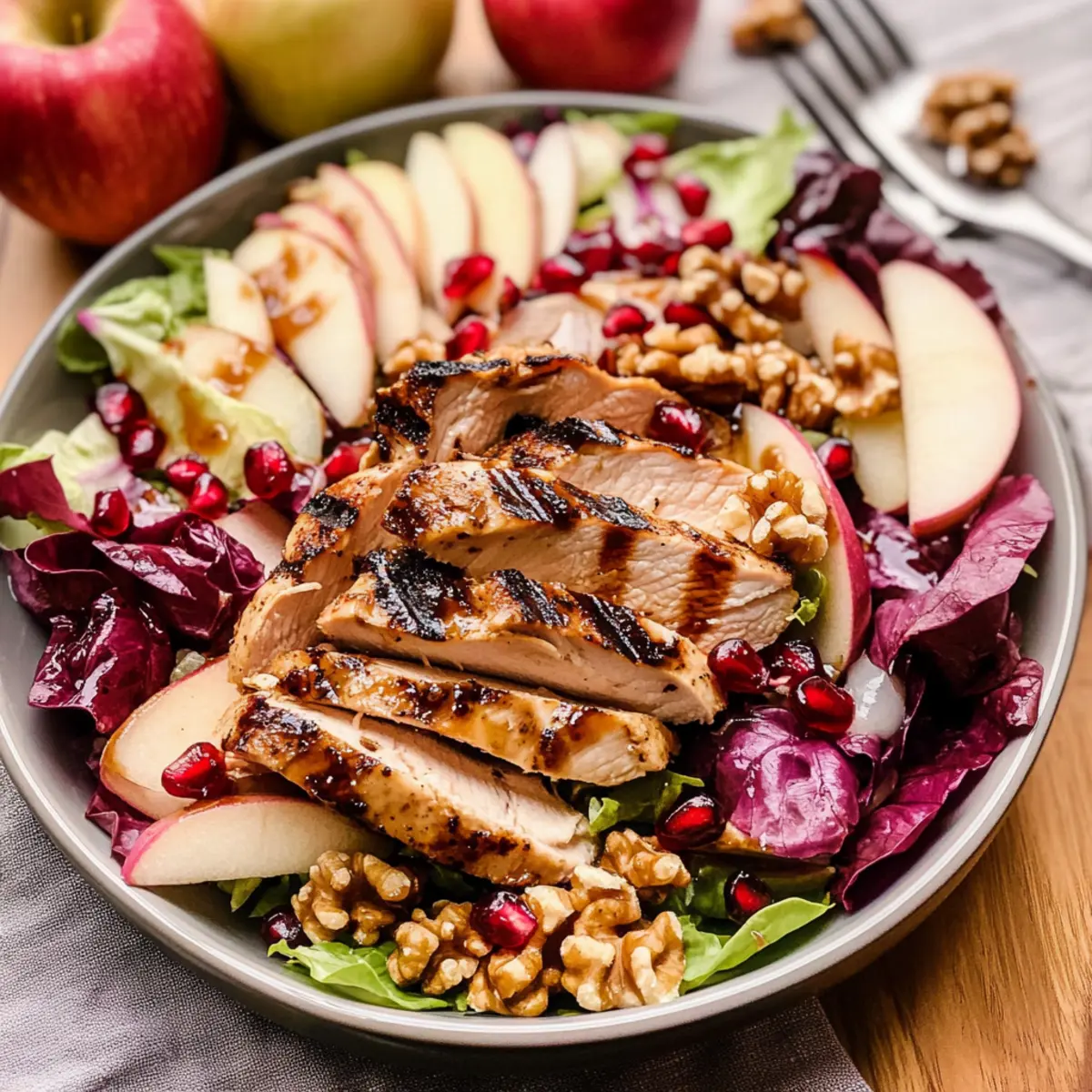 Es war ein dieser kühlen Herbsttage, an dem die Blätter sich in leuchtenden Farben verfärben und die Lust auf herzhafte, aber leichte Gerichte erwacht. Genau an solchen Tagen genieße ich es, einen Balsamico Gegrillten Hähnchensalat zuzubereiten, der mit knackigem Radicchio, süßen Apfelscheiben und saftigen Granatapfelkernen glänzt. Die cremige Maple-Dijon-Dressing verleiht diesem Gericht eine köstliche Note, während es gleichzeitig frisch und nahrhaft bleibt. Schnell zubereitet und ideal für all jene, die eine Abwechslung vom alltäglichen Fast Food suchen, ist dieser Salat die perfekte Wahl für ein genussvolles Herbstessen. Wer könnte da widerstehen? Bereit, in den Genuss dieser köstlichen Kombination zu kommen? Warum werden Sie dieses Rezept lieben? Frische Aromen: Die Kombination aus saisonalen Zutaten wie knackigem Radicchio und süßen Äpfeln bringt die Herbstgeschmäcker perfekt zur Geltung. Einfachheit: Mit nur wenigen Zutaten und unkomplizierten Schritten ist dieser Balsamico Gegrillte Hähnchensalat leicht zubereitet, ideal für jede Kochstufe. Vielfältig: Ob als leichtes Mittagessen oder als schmackhafte Beilage, dieser Salat passt zu vielen Gelegenheiten. Gesund und Nahrhaft: Mit einer ausgewogenen Mischung aus Protein und Ballaststoffen ist dieses Gericht nicht nur lecker, sondern auch sättigend. Zubereitungsfreude: Bereiten Sie alles im Voraus vor und lassen Sie sich von der cremigen Maple-Dijon-Dressing begeistern! Wenn Sie weitere kreative Rezepte suchen, probieren Sie unseren Honig Balsamico Hähnchen oder unser Gegrillter Kabeljau Geroestete Rezept aus. Balsamico Gegrillter Hähnchensalat Zutaten • Hier sind die Zutaten für den perfekten Balsamico Gegrillten Hähnchensalat. Für das Hähnchen Hähnchenbrustfilets ohne Knochen und Haut – Eine hervorragende Proteinquelle, die dünn geklopft werden sollte, um gleichmäßig zu garen. Olivenöl – Sorgt für Feuchtigkeit und Geschmack in der Marinade; kann durch Avocadoöl ersetzt werden. Balsamico-Essig – Verleiht der Marinade eine angenehme Säure und Tiefe. Dijon-Senf – Ergänzt die Marinade mit einer würzigen Note. Frischer Rosmarin – Fügt dem Hähnchen ein aromatisches Aroma hinzu; getrockneter Rosmarin kann bei Bedarf verwendet werden. Knoblauch – Frisch gehackt sorgt für einen kräftigen Geschmack. Salz und Pfeffer – Unverzichtbar zur Würzung; nach Geschmack verwenden. Für das Dressing Naturjoghurt – Basis für das cremige Dressing, das eine angenehme Säure bietet; kann durch saure Sahne ersetzt werden. Apfelessig – Sorgt für die nötige Säure im Dressing. Schalotten – Verleihen dem Dressing einen milden Zwiebelgeschmack. Ahornsirup – Süßt das Dressing auf natürliche Weise, Honig kann als Substitute verwendet werden. Für den Salat Radicchio – Bietet eine bittere Knackigkeit; kann durch Römersalat oder Grünkohl ersetzt werden, wenn nicht verfügbar. Endivie – Fügt eine knackige Textur hinzu; kann gegen Rucola nach Wunsch ausgetauscht werden. Granatapfelkerne – Für süße Akzente und eine aufregende Textur; auch getrocknete Cranberries können als Ersatz dienen. Honeycrisp-Äpfel – Bieten Süße und Spritzigkeit; jede knackige Apfelsorte ist geeignet. Italienische Petersilie – Eine frische Garnitur; optional. Walnüsse, halbiert oder gehackt – Fügen einen knusprigen Biss hinzu; können durch Pekannüsse oder Mandeln ersetzt werden. Parmesan, gehobelt – Für einen nussigen Geschmack; optional und kann bei einer milchfreien Variante weggelassen werden. Mit diesen Zutaten bereitest du dir den köstlichen Balsamico Gegrillten Hähnchensalat zu, der perfekt für die herbstlichen Aromen geeignet ist! Schritt-für-Schritt-Anleitung für Balsamico Gegrillter Hähnchensalat Step 1: Hähnchen vorbereiten Die Hähnchenbrustfilets gründlich abtrocknen und mit einem Fleischklopfer auf eine gleichmäßige Dicke von etwa 1,5 cm klopfen. Dadurch gart das Fleisch gleichmäßig und bleibt saftig. Step 2: Marinade herstellen In einer Schüssel Balsamico-Essig, Olivenöl, Dijon-Senf, frisch gehackten Rosmarin, zerdrückten Knoblauch sowie Salz und Pfeffer gut verrühren. Die Marinade sollte gut gemischt und aromatisch sein; ein ausgeglichener Geschmack zwischen süß und sauer ist erwünscht. Step 3: Hähnchen marinieren Die Hähnchenbrustfilets in einen verschließbaren Beutel geben und die Marinade gleichmäßig darüber gießen. Den Beutel zuknöpfen und das Hähnchen für 1-2 Stunden in den Kühlschrank legen, damit es die Aromen optimal aufnehmen kann. Step 4: Grill vorheizen Den Grill oder eine Grillpfanne auf mittlerer bis hoher Hitze vorheizen, etwa 5 Minuten. Um ein Ankleben zu verhindern, sollte die Grillfläche leicht mit Olivenöl eingepinselt werden. Step 5: Hähnchen grillen Das mariniert Hähnchen aus dem Beutel nehmen und überschüssige Marinade abtropfen lassen. Auf dem Grill etwa 5-7 Minuten pro Seite grillen, bis es eine goldene Farbe hat und die Innentemperatur 74 °C erreicht. Step 6: Hähnchen ruhen lassen Nach dem Grillen das Hähnchen auf einen Teller legen und 5 Minuten ruhen lassen. Diese Ruhezeit lässt die Säfte im Fleisch verteilen, sodass es zart und saftig bleibt, bevor es aufgeschnitten wird. Step 7: Dressing zubereiten In einer kleinen Schüssel Naturjoghurt, Dijon-Senf, Apfelessig, Olivenöl, fein gehackte Schalotten, Salz und Pfeffer gründlich vermengen. Das Dressing sollte cremig und ausgewogen sein – eine perfekte Ergänzung zum Balsamico Gegrillten Hähnchensalat. Step 8: Salatzutaten vorbereiten Radicchio und Endivie in feine Streifen schneiden, Äpfel entkernen und in Scheiben schneiden, die Petersilie grob hacken und die Granatapfelkerne herauslösen. Alle Vorbereitungen sollten zügig erfolgen, um die frischen Aromen zu bewahren. Step 9: Salat anrichten In einer großen Schüssel die vorbereiteten Blattsalate, Apfelscheiben, Granatapfelkerne und Petersilie vermengen. Das Dressing darüber gießen und alles vorsichtig durch