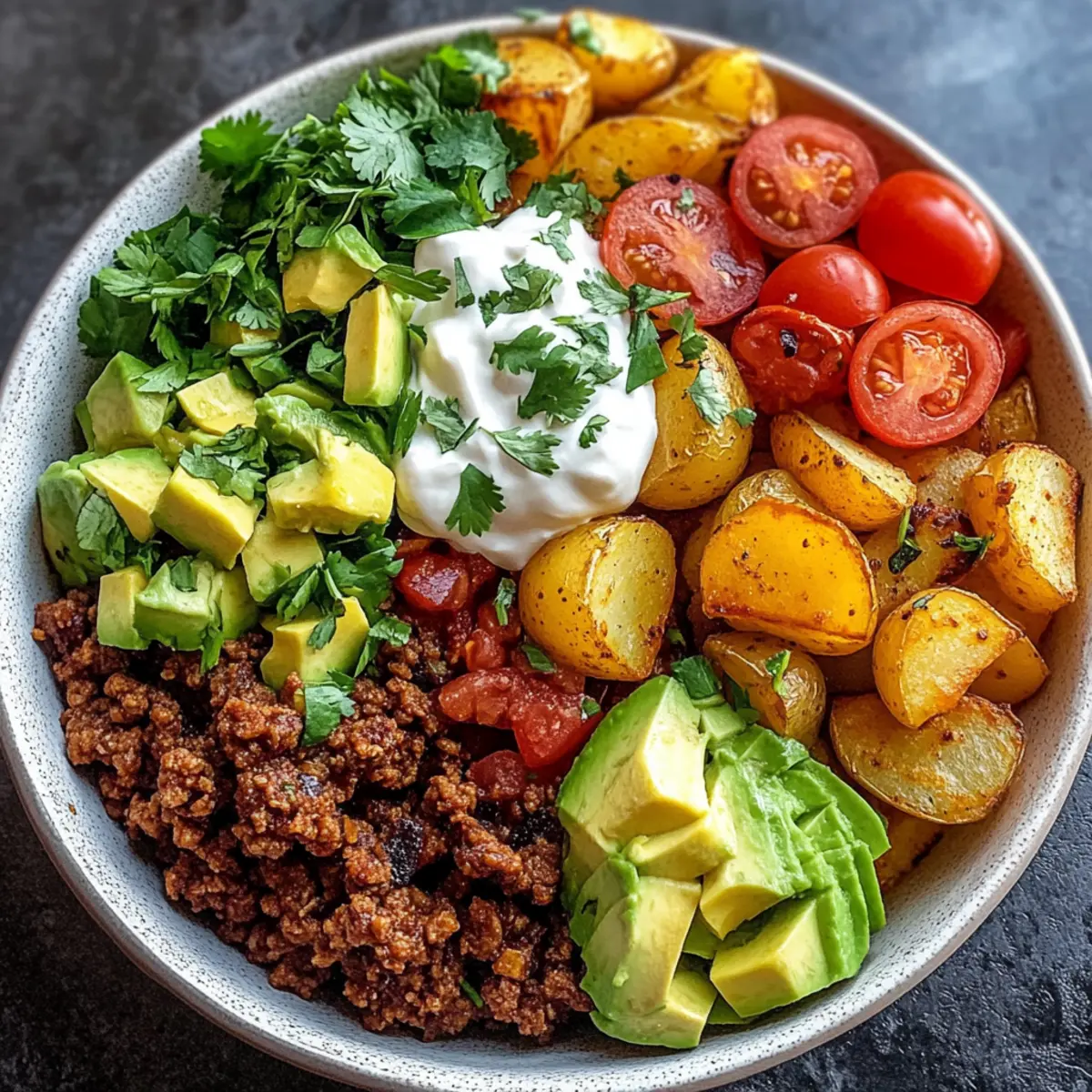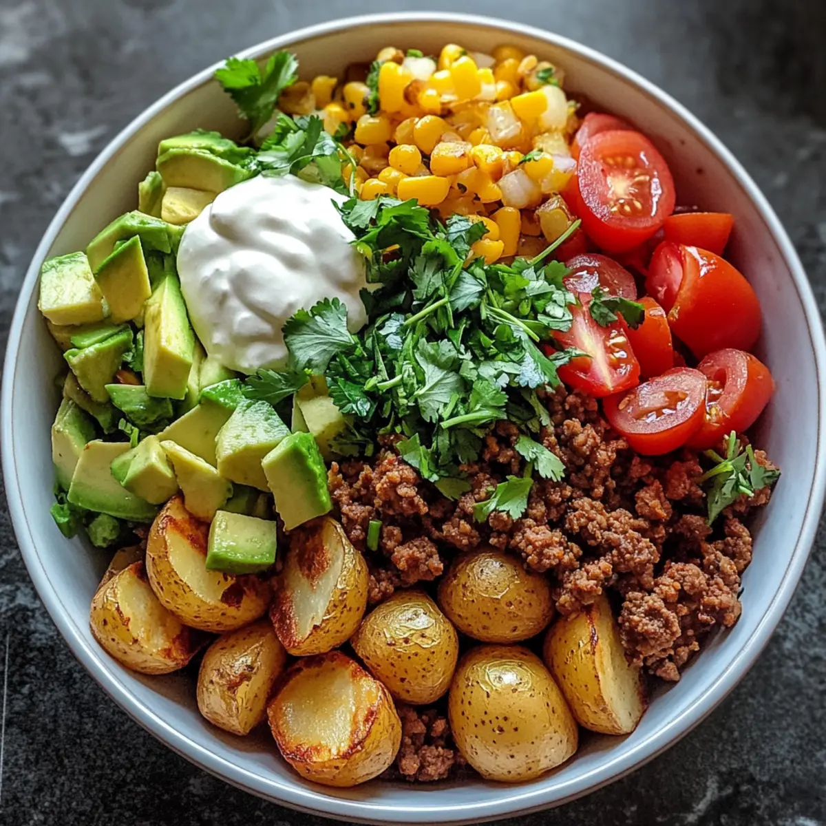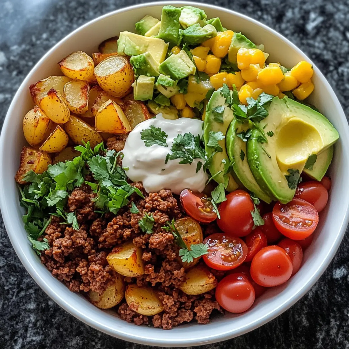 Als ich die Küche betrete, erfüllt der verführerische Duft von gerösteten Kartoffeln und herzhaften Gewürzen den Raum und zieht sofort meine Aufmerksamkeit auf sich. Heute präsentiere ich euch meine Beladene Kartoffel Taco Schüssel, ein Gericht, das die perfekte Harmonie aus knusprigen, goldbraunen Kartoffeln und einer köstlichen Füllung aus gewürztem Fleisch und frischem Gemüse bietet. Mit ihrer schnellen Zubereitung und der Möglichkeit, sie nach Herzenslust zu variieren, ist diese Schüssel nicht nur ideal für ein schnelles Abendessen unter der Woche, sondern auch ein Hit bei festlichen Zusammenkünften. Seid ihr bereit, euch in diese Geschmacksexplosion zu stürzen und mit mir die besten Variationen zu entdecken? Warum werden Sie dieses Rezept lieben? Beladene Kartoffel Taco Schüssel: Diese Schüssel vereint die besten Elemente aus Comfort Food und gesunder Ernährung. Einfache Zubereitung: Mit klaren Anleitungen und wenig Aufwand gelingt dieses Gericht auch Anfängern mühelos. Herzhafter Genuss: Die Kombination aus knusprigen Kartoffeln und würzigem Füllmaterial sorgt für ein unvergessliches Geschmackserlebnis. Vielseitige Anpassungen: Verwandeln Sie das Rezept ganz nach Ihren Vorlieben – ob mit Bohnen für eine vegetarische Variante oder verschiedenen Toppings, Ihrer Kreativität sind keine Grenzen gesetzt! Perfekt zum Vorbereiten: Ideal für Meal-Prep, die Komponenten bleiben frisch und können problemlos aufbewahrt werden. Freunde und Familie beeindrucken: Egal ob bei einem Abendessen oder einer feierlichen Zusammenkunft, diese Taco Schüssel wird Ihre Gäste begeistern. Nach der Zubereitung empfehlen wir auch, sich zusätzlich mit unseren Variationen für Beladene Kartoffel Taco Schüsseln inspirieren zu lassen! Beladene Kartoffel Taco Zutaten • Entdecken Sie die köstlichen Zutaten für die Beladene Kartoffel Taco Schüssel! Für die Kartoffeln Rustikale Kartoffeln – sorgen für die herzliche Basis der Schüssel; verwenden Sie Süßkartoffeln für eine süßere Note. Olivenöl – hilft beim gleichmäßigen Rösten für eine knusprige Textur; stellen Sie sicher, dass die Hitze schrittweise erhöht wird. Knoblauchpulver – fügt Tiefe und Würze hinzu, ohne zu überwältigen; frischer, gehackter Knoblauch kann ebenfalls verwendet werden. Zwiebelpulver – verstärkt das Geschmacksprofil der Kartoffeln; frische Zwiebel sorgt für zusätzlichen Crunch. Räucherpaprika – bringt eine subtile Rauchnote; bei Bedarf kann herkömmliches Paprikapulver verwendet werden. Salz und schwarzer Pfeffer – essenzielle Gewürze für die richtige Würze; nach Geschmack anpassen. Für die Füllung Gemahlenes Rindfleisch oder Pute – liefert den herzhaften Geschmack; verwenden Sie Bohnen für eine vegetarische Variante. Chilipulver – sorgt für den typischen Taco-Geschmack; passen Sie die Gewürze nach Belieben für mehr Schärfe an. Kreuzkümmel – fügt Wärme und Aroma hinzu; das Fehlen von Kreuzkümmel kann den Geschmack unausgewogen machen. Rote Zwiebel – liefert Süße und Textur; Schalotten sind eine mildere Alternative. Schwarze Bohnen – reich an Protein und für die Textur; beliebige Bohnen können als Ersatz verwendet werden. Maiskörner – sorgen für Süße und Farbauffrischung; frisch, aus der Dose oder tiefgekühlt funktionieren alle Optionen. Für die Toppings Cheddar Käse – sorgt für eine cremige Note und schmilzt wunderbar über dem Gericht; nutzen Sie bei Bedarf eine milchfreie Alternative für vegane Optionen. Cherrytomaten – bringen frische und Helligkeit ins Gericht; gewürfelte Paprika sind eine schöne Abwechslung. Avocado – erhöht die Cremigkeit des Gerichts; weglassen für eine kalorienärmere Variante. Frische Koriander – sorgt für einen kräuterlichen Abschluss und balanciert die Reichhaltigkeit; für einen einfacheren Geschmack kann Petersilie verwendet werden. Limettenviertel – sorgen für eine spritzige Frische; unerlässlich für einen frischen Kick. Sauerrahm – kühlt den scharfen Geschmack ab; griechischer Joghurt ist eine gesunde Alternative. Schritt-für-Schritt-Anleitung für die Beladene Kartoffel Taco Schüssel Schritt 1: Ofen vorheizen Heizen Sie Ihren Ofen auf 220°C vor. Dies ist die ideale Temperatur, um die Kartoffeln knusprig zu rösten. Stellen Sie sicher, dass der Ofen vollständig vorgeheizt ist, bevor Sie die Kartoffeln hineinlegen, damit sie gleichmäßig garen. Schritt 2: Kartoffeln vorbereiten Schneiden Sie die rustikalen Kartoffeln in gleich große Würfel. Legen Sie diese auf ein Backblech und beträufeln Sie sie großzügig mit Olivenöl. Bestreuen Sie die Kartoffeln mit Knoblauchpulver, Zwiebelpulver, Räucherpaprika, Salz und Pfeffer. Mischen Sie alles gut, sodass die Kartoffeln gleichmäßig mit den Gewürzen bedeckt sind. Schritt 3: Kartoffeln backen Schieben Sie das Backblech mit den vorbereiteten Kartoffeln in den vorgeheizten Ofen. Rösten Sie sie für etwa 25-30 Minuten, bis sie schön goldbraun und knusprig sind. Rühren Sie die Kartoffeln nach der Hälfte der Backzeit um, um eine gleichmäßige Bräunung zu erreichen. Schritt 4: Fleisch anbraten Während die Kartoffeln im Ofen sind, erhitzen Sie eine große Pfanne bei mittlerer Hitze. Fügen Sie das gemahlene Rindfleisch oder die Pute hinzu und braten Sie es an, bis es rundum braun ist. Vergessen Sie nicht, überschüssiges Fett abzugießen, um eine reichhaltige, aber nicht fettige Füllung zu erhalten. Schritt 5: Gewürze hinzufügen Wenn das Fleisch schön gebräunt ist, streuen Sie Chilipulver und Kreuzkümmel darüber. Fügen Sie die gewürfelte rote Zwiebel hinzu und kochen Sie alles weiter, bis die Zwiebel weich geworden ist, etwa 3-4 Minuten. Diese Gewürze verleihen der Füllung den charakteristischen Geschmack der Beladenen Kartoffel Taco Schüssel. Schritt 6: Bohnen und Mais hinzufügen Mischen Sie die abgetropften schwarzen Bohnen und die Maiskörner unter das Fleisch. Lassen Sie alles für weitere 3-4 Minuten erhitzen, bis 