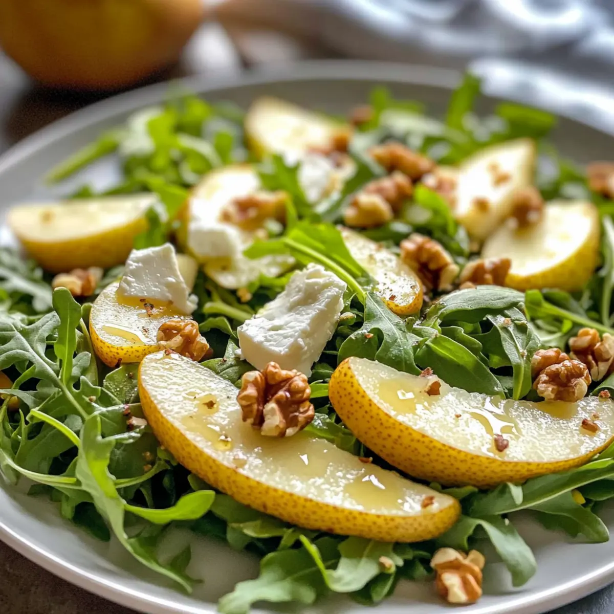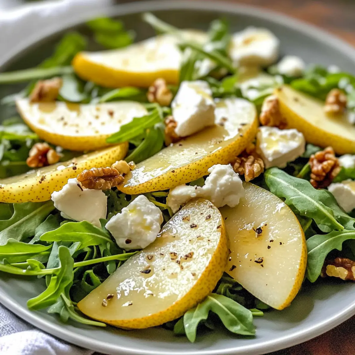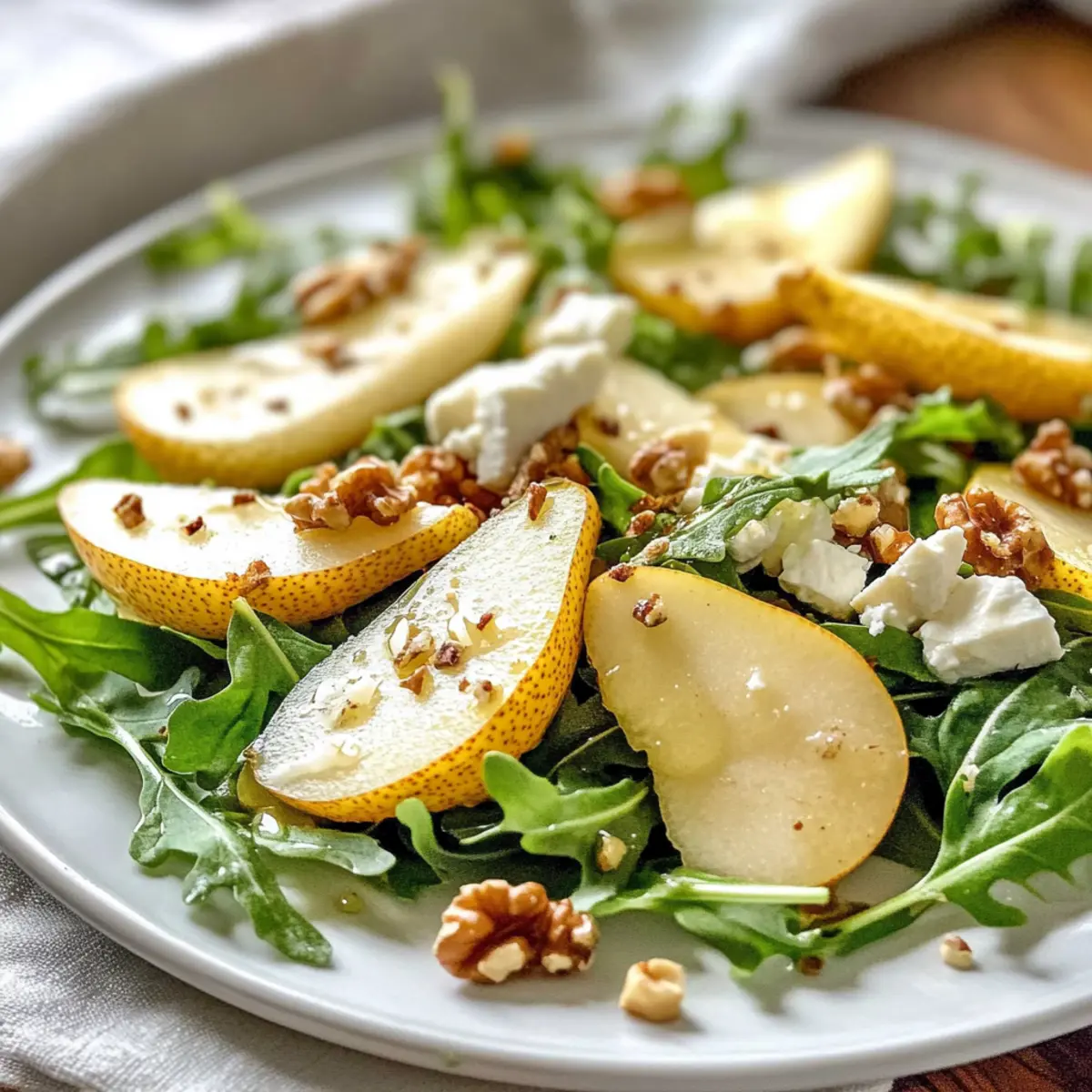 Draußen bläst der Herbstwind, und die bunten Blätter tanzen über den Boden – genau die richtige Zeit, um etwas Frisches und Leichtes auf den Tisch zu bringen. Mein Birnen- und Rucola-Salat mit Honig-Vinaigrette vereint die knackigen Aromen von süßen Bartlett-Birnen und dem pfeffrigen Rucola, abgerundet durch cremigen Ziegenkäse und nussige Walnüsse. In nur 10 Minuten ohne Kochen zubereitet, ist dieses Gericht eine gesunde und schnelle Wahl, die nicht nur köstlich ist, sondern auch perfekt für entspannte Lunches oder elegante Abendessen mit Freunden. Warum sich mit Fastfood zufriedengeben, wenn man so ein erfrischendes Geschmackserlebnis kreieren kann? Lass uns gemeinsam diesen herbstlichen Genuss entdecken! Warum wird dieser Salat dein Favorit? Frische Zutaten: Der Birnen- und Rucola-Salat kombiniert knackige Birnen mit pfeffrigem Rucola, was ein einzigartiges Geschmackserlebnis bietet. Ideal für alle, die fruchtige und herzhafte Noten lieben. Einfache Zubereitung: In nur 10 Minuten zauberst du ein köstliches Gericht, das keine Kochkünste erfordert. Das ist perfekt, wenn die Zeit knapp ist und du trotzdem etwas Besonderes möchtest. Gesund und nährstoffreich: Mit etwa 203 Kalorien pro Portion ist dieser Salat nicht nur leicht, sondern auch voller wertvoller Nährstoffe. Vielseitigkeit: Du kannst schnell Protein hinzufügen, indem du gegrilltes Hähnchen oder Quinoa integrierst. Das macht ihn zur perfekten Hauptspeise oder Beilage. Geliefert für jeden Anlass: Ob als leichtes Mittagessen oder als eleganter Teil eines Abendessens, dieser Salat wird garantiert ein Hit bei deinen Gästen! Birnen- und Rucola-Salat Zutaten • Hinweis: Hier sind die frischen Zutaten für deinen Birnen- und Rucola-Salat mit Honig-Vinaigrette, die das Geschmackserlebnis perfekt abrunden. Für den Salat Rucola – liefert eine pfeffrige Note, die perfekt mit der Süße der Birnen harmoniert. Bartlett-Birnen – sorgt für eine saftige Süße und eine knackige Textur (ca. 2 Birnen, gewürfelt). Ziegenkäse – bringt Cremigkeit und einen leicht säuerlichen Geschmack in die Mischung. Walnüsse – fügen einen köstlichen Crunch und nussigen Geschmack hinzu; kann auch durch Pekannüsse oder Mandeln ersetzt werden. Frischer Thymian – gibt der Mischung aromatische Frische und Erdigkeit. Für die Vinaigrette Olivenöl – dient als reichhaltiger Basis für das Dressing. Apfelessig – sorgt für milde Säure, die die Süße des Honigs ausgleicht. Frischer Zitronensaft – verstärkt die Frische des Dressings und ergänzt den Salat. Honig – sorgt für natürliche Süße in der Vinaigrette. Schalotten – fügt eine milde Zwiebelnote und Tiefe zum Dressing hinzu. Knoblauch – rundet die Vinaigrette mit herzhaftem Geschmack ab. Salz und schwarzer Pfeffer – verstärken den Gesamtgeschmack und die Würze. Schritt-für-Schritt-Anleitung für Birnen- und Rucola-Salat mit Honig-Vinaigrette Step 1: Vinaigrette vorbereiten Gib in ein Einmachglas 4 Esslöffel Olivenöl, 2 Esslöffel Apfelessig, 1 Esslöffel frischen Zitronensaft, 1 Esslöffel Honig, 1 fein gehackte Schalotte und 1 Teelöffel gehackten Knoblauch. Würze mit einer Prise Salz und frisch gemahlenem schwarzen Pfeffer. Verschließe das Glas und schüttele es kräftig, bis die Mischung gut emulgiert und cremig wird. Stelle die Vinaigrette zur Seite, damit die Aromen sich entfalten können. Step 2: Salat anrichten Nimm eine große Schüssel und gib 100 g frischen Rucola hinein. Füge 2 gewürfelte Bartlett-Birnen, 100 g zerbröckelten Ziegenkäse, eine Handvoll grob gehackte Walnüsse und 2 Teelöffel frischen Thymian hinzu. Mische alles vorsichtig mit den Händen oder einer Salatgabel, damit die Zutaten gleichmäßig verteilt werden, ohne den Rucola zu zerdrücken. Step 3: Salat anziehen Gib die vorbereitete Honig-Vinaigrette über die Salatzutaten in der Schüssel. Verwende eine große Gabel oder die Hände, um den Salat sanft zu wenden, sodass die Vinaigrette gleichmäßig verteilt wird. Achte darauf, dass der Rucola und die Birnen gut mit dem Dressing überzogen sind, was etwa 1-2 Minuten dauert. Step 4: Würzen überprüfen Nimm einen kleinen Bissen aus dem Salat, um den Geschmack zu überprüfen. Füge bei Bedarf etwas mehr Salz oder frisch gemahlenen Pfeffer hinzu, um die Aromen zu intensivieren. Dies gibt deinem Birnen- und Rucola-Salat mit Honig-Vinaigrette die perfekte Balance zwischen süß und herzhaft. Step 5: Servieren Serviere den Salat sofort auf einer schönen Schüssel oder auf Tellern. Achte darauf, die Zutaten gleichmäßig zu verteilen, sodass jeder Bissen ein abgerundetes Geschmackserlebnis bietet. Dieser frische Birnen- und Rucola-Salat mit Honig-Vinaigrette ist ideal für ein leichtes Mittagessen oder als elegante Beilage zu einem Abendessen. Lagerungstipps für Birnen- und Rucola-Salat Zimmertemperatur:: Bei Zimmertemperatur sollte der Salat sofort serviert werden, um die Frische der Zutaten zu gewährleisten. Ideal für Buffets oder gesellige Anlässe. Kühlschrank:: Reste des Birnen- und Rucola-Salats können bis zu 3 Tage im Kühlschrank aufbewahrt werden, jedoch getrennt von der Vinaigrette, um die Frische des Rucolas zu erhalten. Vinaigrette:: Die Honig-Vinaigrette kann bis zu einer Woche im Kühlschrank aufbewahrt werden. Vor dem Servieren gut schütteln, da sie sich setzen kann. Wiedererwärmen:: Dieser Salat ist am besten frisch, daher empfiehlt es sich, ihn nicht zu erwärmen. Wenn du Reste hast, serviere sie kalt oder zimmerwarm als erfrischende Beilage. Experten Tipps für Birnen- und Rucola-Salat Frische Birnen: Verwende reife, aber feste Bartlett-Birnen, um die perfekte Süße und Textur zu erzielen. Achte darauf, sie nicht zu lange vor der Zubereitung zu schneiden, da sie schneller braun werden. Vinaigrette vorausplanen: Bereite die Honig-Vinaigrette einen Tag im Voraus zu. So haben sich die Aromen optimal entfaltet, und du sparst Zeit bei der Zubereitung des Salats. Schmecken und anpassen: Taste den Salat n