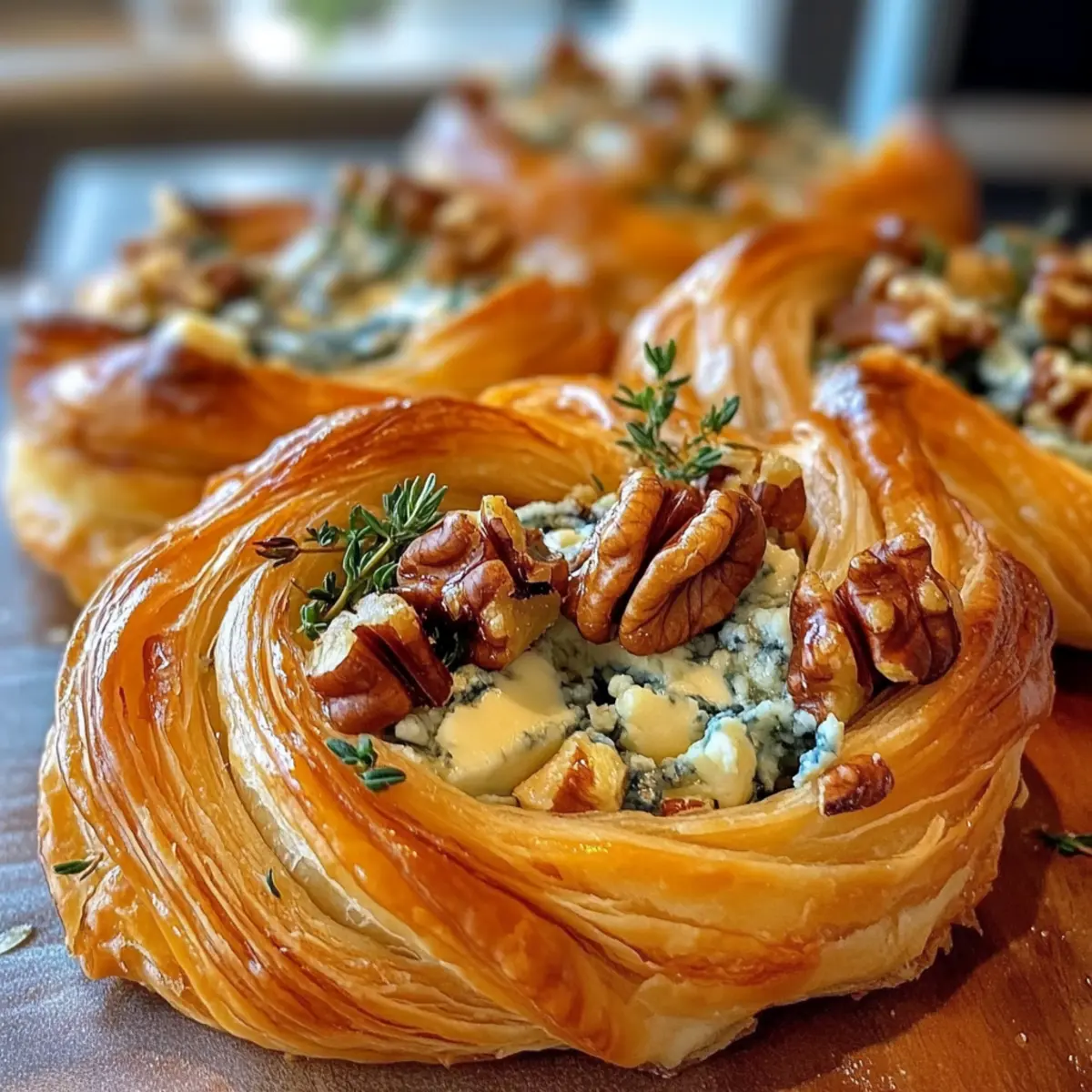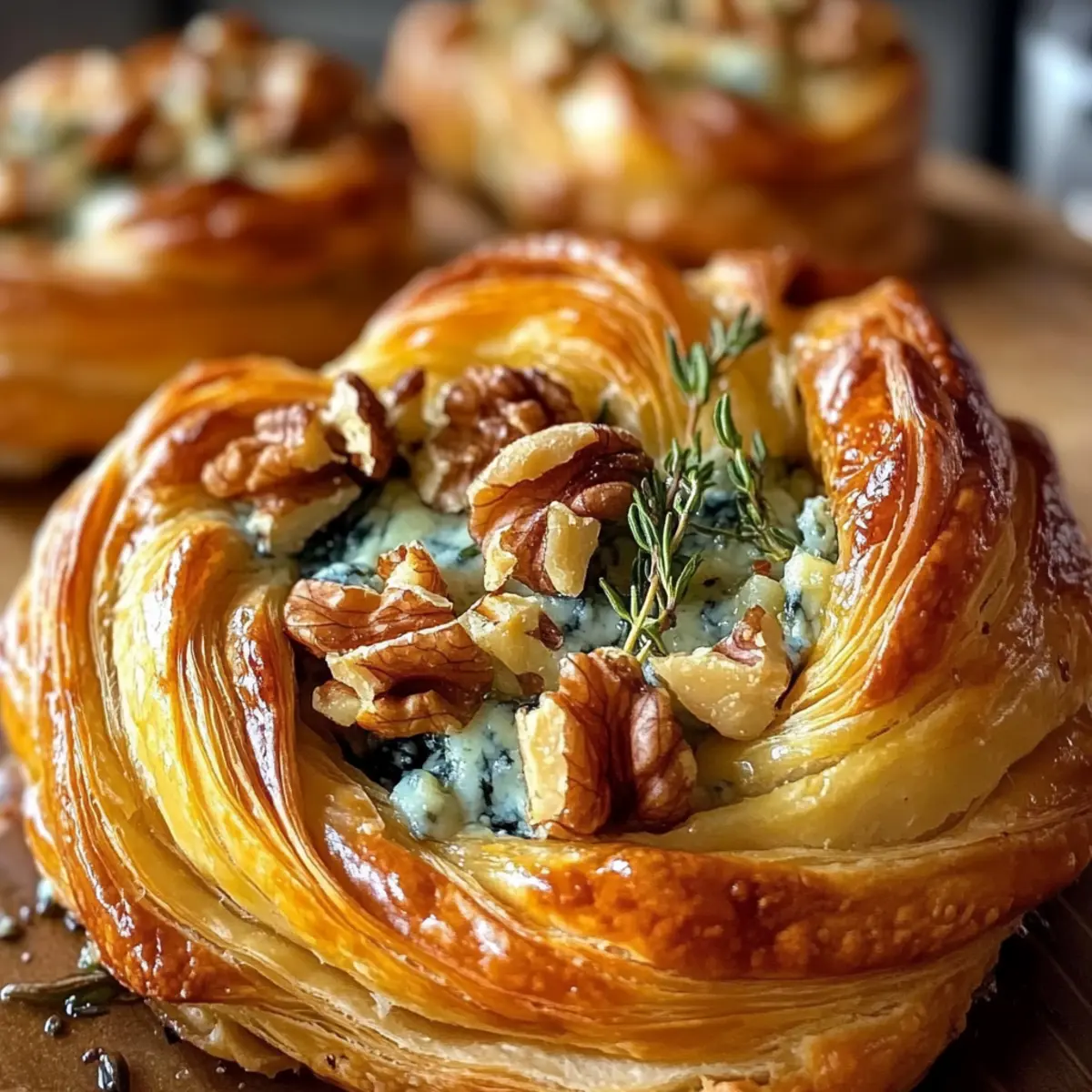 Eines der entzückendsten Hausmannskost-Erlebnisse, die ich je hatte, war, als ich zum ersten Mal einen Blauschimmelkäse, Walnüsse und Thymian auseinanderziehbaren Blätterteigwirbel zubereitet habe. Die Kombination aus dem cremigen, kräftigen Käse und den knackigen Nüssen entfaltet sich in einem goldbraunen, blättrigen Teig und sorgt für einen himmlischen Genuss. Was diesen Snack so besonders macht, ist seine einfache Zubereitung – perfekt für gesellige Abende oder eine schnelle Vorspeise. Und das Beste? Er ist nicht nur ein echter Blickfang, sondern auch eine köstliche Möglichkeit, Farbe und Geschmack auf den Tisch zu bringen. Bereit für eine Geschmacksexplosion, die deine Gäste umhauen wird? Lass uns gemeinsam in die Details eintauchen! Warum ist dieser Snack so besonders? Einfachheit: Dieses Rezept erfordert nur grundlegende Kochkenntnisse und ist schnell zubereitet. Reichhaltiger Genuss: Der kräftige Blauschimmelkäse gepaart mit den knackigen Walnüssen sorgt für einen unvergleichlichen Geschmack. Perfekte Optik: Dieser wunderschöne Blätterteigwirbel ist der star jeder Feier und eignet sich hervorragend als Vorspeise oder Snack. Flexibilität: Ob bei einem gemütlichen Couchabend oder als eleganter Appetizer – dieser Snack passt zu jedem Anlass! Zügige Zubereitung: Ideal für spontane Einladungen; du kannst ihn in weniger als einer Stunde machen. Erwecke einen Hauch von Gourmetküche in deinem Zuhause mit diesem Blauschimmelkäse, Walnüsse und Thymian auseinanderziehbaren Blätterteigwirbel – du wirst nicht enttäuscht sein! Blauschimmelkäse, Walnüsse und Thymian Zutaten • Für den Teig: Blätterteig – Ideal zum schnellen Arbeiten; verwende vorgerollten oder selbstgemachten Teig für beste Ergebnisse. Honig – Fügt eine süße Note hinzu; als Alternative kann auch Ahornsirup verwendet werden. • Für die Füllung: Blauschimmelkäse – Sorgt für einen kräftigen, würzigen Geschmack; kann durch Feta ersetzt werden für eine mildere Variante. Parmesankäse – Verleiht zusätzliche Cremigkeit; Grana Padano ist auch eine gute Wahl. Walnüsse – Fügen Crunch und Erdigkeit hinzu; Pekannüsse sind ein denkbarer Ersatz. Frischer Thymian – Bringt aromatische Frische; getrockneter Thymian ist im Notfall möglich, frisch ist jedoch empfehlenswert. Milch – Wird zum Bestreichen verwendet, um eine goldene Farbe zu erzielen; Sahne ist eine reichhaltigere Alternative. Meersalz und frisch gemahlener Pfeffer – Essentiell für die Würze; verwende grobes Salz für einen intensiveren Geschmack. Mit diesen Zutaten zauberst du den köstlichen Blauschimmelkäse, Walnüsse und Thymian auseinanderziehbaren Blätterteigwirbel, der deine Gäste begeistern wird! Schritt-für-Schritt-Anleitung für Blauschimmelkäse, Walnüsse und Thymian auseinanderziehbarer Blätterteigwirbel Schritt 1: Ofen vorheizen Heize den Ofen auf 180 °C (350 °F) oder 200 °C (390 °F) für Umluft vor. Dieser Schritt ist wichtig, um sicherzustellen, dass der Blauschimmelkäse, Walnüsse und Thymian auseinanderziehbare Blätterteigwirbel gleichmäßig gebacken wird und eine schöne goldbraune Farbe bekommt. Bereite ein Backblech mit Backpapier vor, um die fertigen Wirbel darauf zu platzieren. Schritt 2: Blätterteig vorbereiten Löse den Blätterteig vorsichtig aus der Verpackung und rolle ihn auf einer leicht bemehlten Oberfläche aus. Begebe dich dann dazu, etwas Honig gleichmäßig auf zwei Blätterteigplatten zu träufeln. Dieser süße Touch wird die Aromen des Blauschimmelkäses und der Walnüsse im späteren Backprozess harmonisch abrunden und sorgt für eine köstliche Karamellisierung. Schritt 3: Toppings hinzufügen Verteile nun gleichmäßig die grob gehackten Walnüsse, den zerbröckelten Blauschimmelkäse sowie den Parmesan auf den beiden Honig-bestrichenen Blätterteigplatten. Streue frische Thymianblätter darüber und würze das Ganze mit Meersalz und frisch gemahlenem Pfeffer. Achte darauf, dass alles gleichmäßig verteilt ist, um ein ausgewogenes Geschmackserlebnis zu gewährleisten. Schritt 4: Rollen und schneiden Rolle jede Blätterteigplatte vorsichtig auf, bis sie eine feste Rolle bildet, und schneide sie dann der Länge nach in zwei Hälften. Diese Technik ist entscheidend für das Schichten der Aromen im Blauschimmelkäse, Walnüsse und Thymian auseinanderziehbaren Blätterteigwirbel. Tucke die Kanten ein, um die Füllung sicher zu verschließen. Schritt 5: Drehen und formen Nehme die geschnittenen Streifen und drehe sie vorsichtig zu einer spiralförmigen Form. Platziere die Wirbel auf das zuvor vorbereitete Backblech mit Backpapier. Dieser Schritt gibt den Blauschimmelkäse, Walnüsse und Thymian auseinanderziehbaren Blätterteigwirbel ihre charakteristische Form und sorgt dafür, dass sie beim Backen gut aufgehen. Schritt 6: Bestreichen und backen Bestreiche die Oberflächen der Blätterteigwirbel leicht mit Milch, um eine goldene Farbe zu erreichen. Schiebe das Backblech dann in den vorgeheizten Ofen und backe die Wirbel 25 bis 30 Minuten lang, bis sie goldbraun und schön aufgegangen sind. Halte ein Auge auf die Wirbel, um sicherzustellen, dass sie nicht verbrennen. Schritt 7: Garnieren und servieren Nehme die gebackenen Blauschimmelkäse, Walnüsse und Thymian auseinanderziehbaren Blätterteigwirbel aus dem Ofen und lasse sie kurz abkühlen. Garniere sie schließlich mit weiteren frischen Thymianblättern für zusätzlichen Duft und Geschmack. Serviere die Wirbel warm und genieße ihre köstlichen Aromen bei der nächsten Zusammenkunft! Expert Tips für Blauschimmelkäse, Walnüsse und Thymian Teig kalt halten: Halte den Blätterteig bis zur Verwendung kalt, um ein optimales Aufgehen zu gewährleisten. Warmer Teig kann das Ergebnis beeinträchtigen. Füllung nicht überladen: Überfülle die Wirbel nicht, da sie sonst ungleichmäßig backen und die Füllung herausfallen kann. Gleichmäßiges Backen: Drehe das Backblech nach der Hälfte der Backzeit, um eine gle