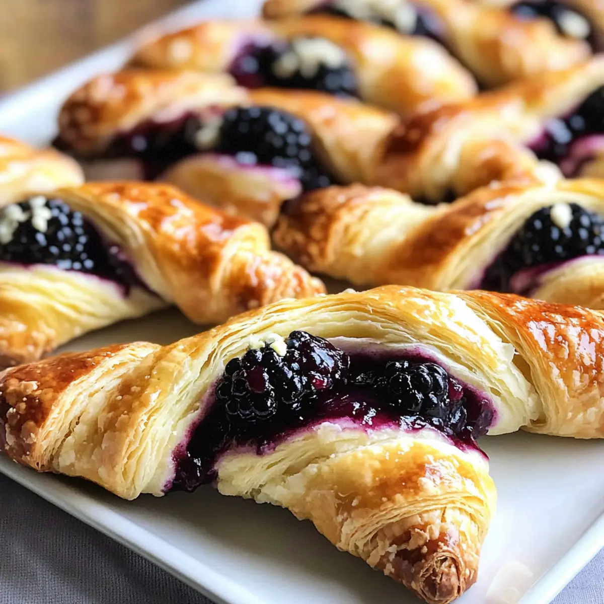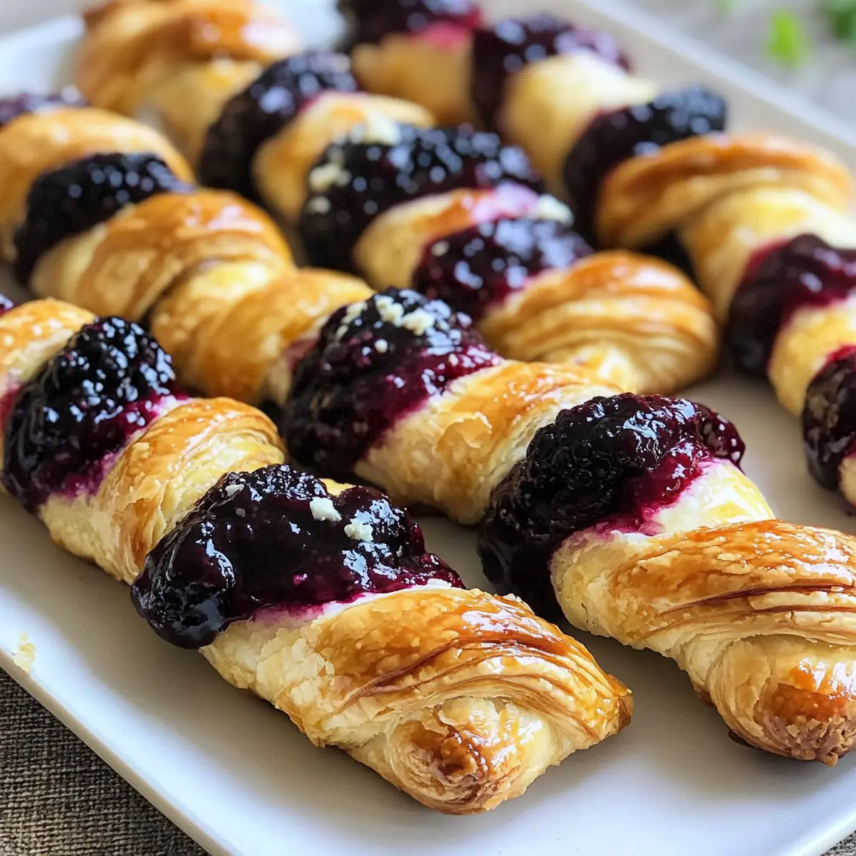 Beim Öffnen des Ofens durchströmt der köstliche Duft von frisch gebackenem Blätterteig das ganze Haus und lässt das Wasser im Mund zusammenlaufen. Diese Brombeer Ziegenkäse Blätterteig Drehungen sind nicht nur ein Genuss für die Sinne, sondern auch unglaublich vielseitig – ideal für jeden Anlass, von einem entspannten Snack bis hin zu einem eleganten Abendessen. Die Kombination aus der cremigen Ziegenkäsefüllung und der süßen Brombeermarmelade macht diese Leckerei zu einem wahren Publikumsliebling. Zudem sind sie im Handumdrehen zubereitet, sodass sie perfekt für alle sind, die mit wenig Aufwand beeindrucken möchten. Möchtest du wissen, wie du diese köstlichen Drehungen ganz einfach selbst zaubern kannst? Warum sind diese Drehungen so besonders? Einfachheit: Die Zubereitung ist unkompliziert und erfordert nur grundlegende Kochkenntnisse, sodass du dich ganz auf die Aromen konzentrieren kannst. Vielseitigkeit: Mit verschiedenen Käsesorten oder Marmeladen kannst du die Drehungen an deinen Geschmack anpassen. Perfekt für persönliche Vorlieben! Schnelligkeit: In kürzester Zeit bereit, sodass du auch spontane Gäste beeindrucken kannst. Publikumsliebling: Der köstliche Mix aus cremigem Ziegenkäse und süßer Brombeermarmelade wird sicher die Herzen deiner Freunde erobern. Probiere auch die Variation Ideen für noch mehr Abwechslung! Einladender Duft: Der warme Duft, der beim Backen entsteht, zieht jeden in die Küche und weckt Appetit auf mehr. Brombeer Ziegenkäse Blätterteig Drehungen Zutaten Für den Blätterteig • Blätterteig – Verwende aufgetauten Blätterteig für die optimale Fluffigkeit; überhitze ihn nicht, um ein Ankleben zu vermeiden. Für die Füllung • Brombeeren – Süße und Geschmack; du kannst sie durch andere Beeren oder 1 Tasse fertige Marmelade ersetzen. • Ziegenkäse – Cremigkeit; kann durch Frischkäse ersetzt werden, wenn du einen milden Geschmack bevorzugst. • Zitronensaft – Frische; bringt Säure ins Spiel und balanciert die Süße aus. • Zucker – Süße und Verdickungshelfer für die Marmelade. • Wasser – Hilft, die Brombeermarmelade einzudicken. Für das Topping • Eier – Eigelb-Mischung für den Glanz beim Backen und zur besseren Haftung des Zuckers. • Rohrzucker – Knusprigkeit und Süße für das Topping. • Frischer Thymian – Kräuteraroma; kann durch andere frische Kräuter ersetzt werden. • Zitronenschale – Aroma- und Geschmacksverstärker. Diese Brombeer Ziegenkäse Blätterteig Drehungen sind perfekt für liebevolle Anlässe und bringen jeden zum Staunen! Schritt-für-Schritt-Anleitung für Brombeer Ziegenkäse Blätterteig Drehungen Step 1: Marmelade vorbereiten Koche in einem kleinen Topf die Brombeeren, Wasser, Zitronensaft und Zucker bei mittlerer Hitze für 20-30 Minuten. Zerdrücke die Beeren mit einer Gabel, bis sie eine dicke Marmelade bilden. Wenn die Mischung gut eingedickt ist und die Beeren weich sind, nimm den Topf vom Herd und lasse die Marmelade abkühlen. Step 2: Blätterteig vorbereiten Nimm den aufgetauten Blätterteig aus der Verpackung und lasse ihn etwa 20-25 Minuten bei Zimmertemperatur ruhen. Rolle den Teig anschließend auf einer leicht bemehlten Arbeitsfläche zu einem Rechteck aus, das etwa 30×40 cm groß ist. Achte darauf, dass der Teig gleichmäßig dick bleibt, um eine gleichmäßige Backzeit zu gewährleisten. Step 3: Blätterteig füllen Verteile die Hälfte des Ziegenkäses gleichmäßig auf dem Blätterteig und achte darauf, genug Rand zu lassen. Dann verteile die abgekühlte Brombeermarmelade über den Ziegenkäse. Diese Kombination aus Ziegenkäse und Marmelade ist das Herzstück deiner Brombeer Ziegenkäse Blätterteig Drehungen und sorgt für einen herrlichen Geschmack. Step 4: Drehungen formen Schneide den gefüllten Blätterteig in 12 gleichmäßige Streifen, ca. 1,5 cm breit. Falte jeden Streifen in der Mitte und drehe ihn vorsichtig, während du ihn leicht spannst. Platziere die gedrehten Stücke aufs Backblech, das du zuvor mit Backpapier ausgelegt hast, und achte darauf, dass sie genügend Platz zum Aufgehen haben. Step 5: Fertigstellen und Backen Verquirle ein Ei in einer kleinen Schüssel und bestreiche die Oberseiten der Drehungen mit dem Ei. Bestreue sie anschließend mit Rohrzucker und etwas Zitronenschale sowie frischem Thymian für zusätzlichen Geschmack. Backe die Drehungen im vorgeheizten Ofen bei 200°C (400°F) für 16-18 Minuten oder bis sie goldbraun und knusprig sind. Step 6: Abkühlen und Servieren Lass die frisch gebackenen Brombeer Ziegenkäse Blätterteig Drehungen auf einem Kuchengitter abkühlen, damit sie ihre Knusprigkeit behalten. Serviere sie warm und genieße die köstliche Kombination aus der cremigen Füllung und dem süßen Teig. Diese Leckereien sind perfekt für jedes Event und werden mit Sicherheit zum Hit! Brombeer Ziegenkäse Blätterteig Drehungen Variationen Lass deiner Kreativität freien Lauf und passe dieses Rezept nach deinem Geschmack an – die Möglichkeiten sind grenzenlos! Cream Cheese: Ersetze den Ziegenkäse durch Frischkäse für eine mildere, cremige Variante, die ebenfalls köstlich ist. Brombeer-Jam: Nutze deine Lieblingskonfitüre, sei es Himbeere, Erdbeere oder sogar Aprikose, für eine fruchtige Abwechslung. Vegane Option: Wähle pflanzlichen Frischkäse und veganen Blätterteig für eine köstliche, tierfreundliche Version. Du wirst den Unterschied kaum bemerken! Kräuter-Boost: Experimentiere mit verschiedenen frischen Kräutern wie Basilikum oder Oregano, um einen zusätzlichen Geschmackskick zu erzielen. Schokoladenstückchen: Füge dunkle Schokoladenstückchen zur Füllung hinzu, um einen süßen, dekadenten Twist zu schaffen, der die Sinne verführt. Nussige Note: Bestreue die Drehungen vor dem Backen mit gehackten Nüssen oder Mandeln für zusätzlichen Crunch und Aroma. Würzige Schärfe: Integriere eine Prise Cayennepfeffer oder einen Schuss Chilisauce zur Marmelade, um deiner Füllung eine