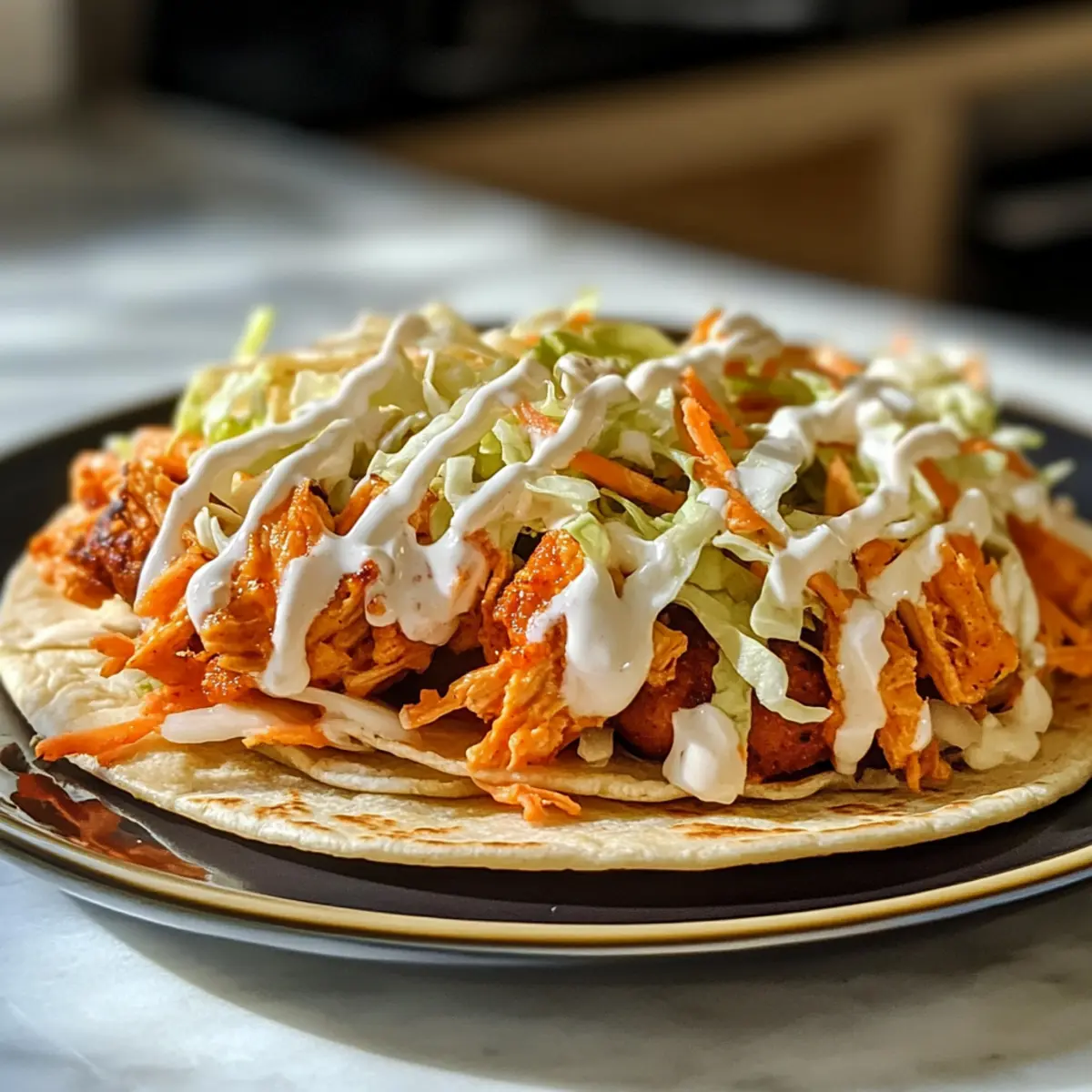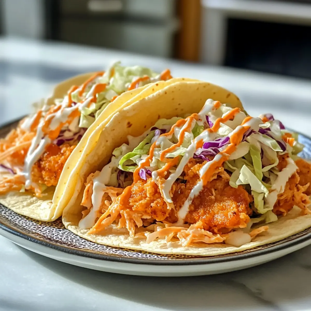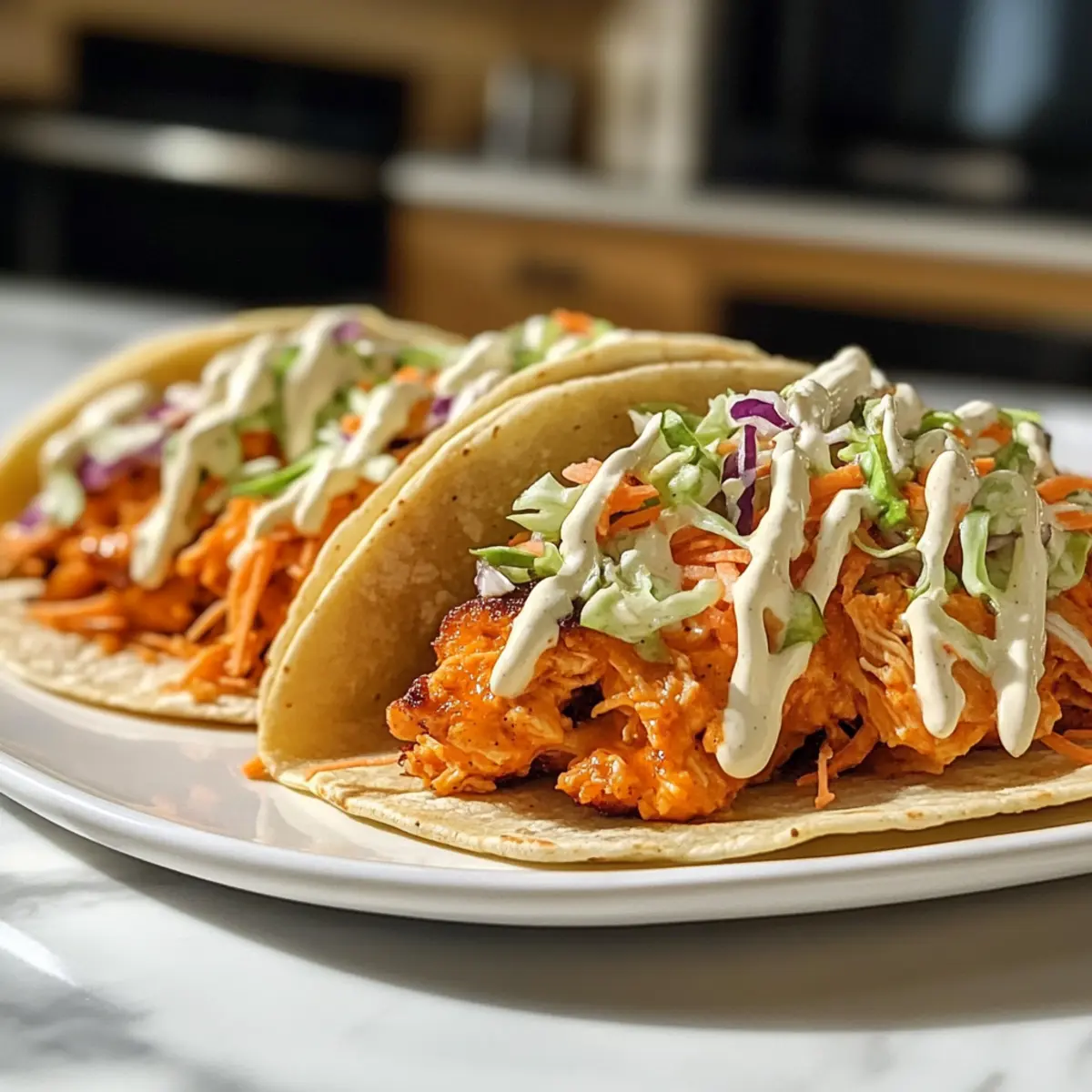 Nimm die Hähnchen-Patties aus der Pfanne und platziere sie auf den gerösteten Tortillas. Belege jedes Taco mit einer großzügigen Menge des gekühlten Ranch-Slaw und träufle nach Belieben etwas griechisches Joghurt-Ranch-Dressing oder zusätzliche Buffalo-Sauce darüber.