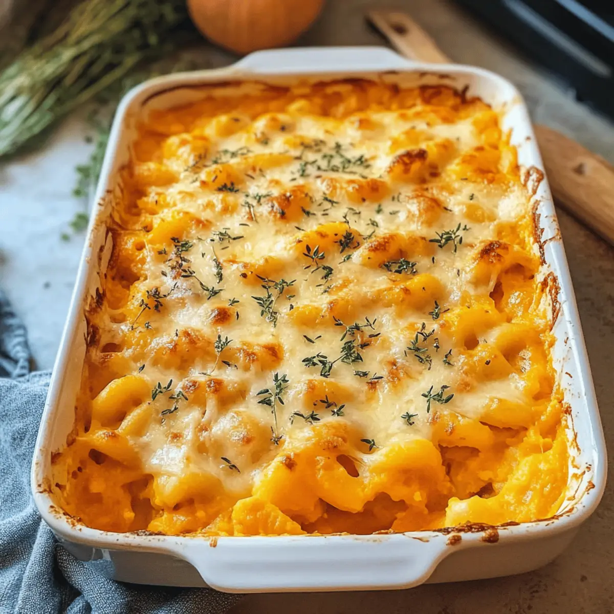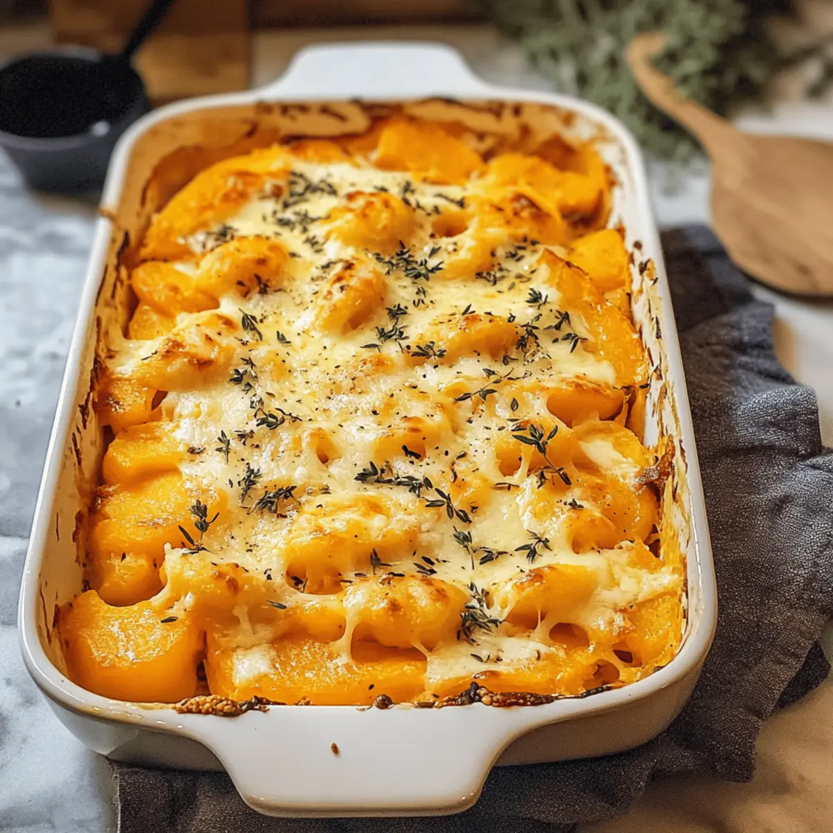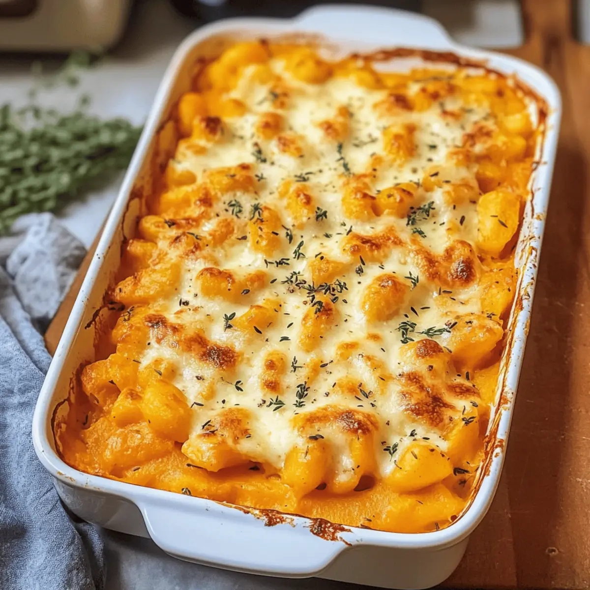 Es gibt nichts Schöneres, als die ersten kühlen Herbsttage mit einem warmen, herzlichen Gericht zu begrüßen! Mein Butternut-Kürbis-Auflauf vereint die süße Cremigkeit von Butternut-Kürbis mit aromatischem Knoblauch und frischem Thymian – eine Kombination, die sofort für Gemütlichkeit sorgt. Dieses einfache Rezept ist in weniger als 40 Minuten zubereitet und perfekt, um die ganze Familie zu verwöhnen. Ob als schnelles Abendessen nach einem langen Tag oder als schmackhafte Option fürs Wochenende: Dieser Auflauf ist nicht nur ein echter Genuss, sondern auch ein vegetarisches Highlight, das alle Liebhaber von Comfort Food begeistern wird. Neugierig, wie sich dieser herbstliche Traum auf deinem Teller entfaltet? Lass uns gemeinsam in die Zubereitung eintauchen! Warum werden Sie dieses Rezept lieben? Schlichtheit: Die Zubereitung des Butternut-Kürbis-Auflaufs ist kinderleicht und benötigt nur grundlegende Kochkenntnisse. Wärmender Genuss: Diese herzhafte Kombination aus Kürbis, Gnocchi und Käse bringt die perfekte Herbststimmung auf Ihren Tisch. Flexibilität: Passen Sie das Rezept nach Belieben an – ob mit verschiedenen Käsesorten oder zusätzlichen Gemüsevariationen. Zum Beispiel, probieren Sie es mit Hokkaido-Kürbis für einen anderen Geschmack! Schnell und einfach: In weniger als 40 Minuten ist dieser Auflauf fertig, perfekt für hektische Wochentage. Crowd-Pleaser: Eine garantiert schmackhafte Wahl, die nicht nur Vegetarier anspricht, sondern auch alle anderen begeistern wird – ideal für Ihr nächstes Herbst-Dinner! Butternut-Kürbis-Auflauf Zutaten Für den Auflauf: Butternut-Kürbis – sorgt für die süße Cremigkeit, die diesem Gericht seine Seele verleiht. Kann durch Hokkaido-Kürbis ersetzt werden. Gnocchi – bringt eine herzhafte Konsistenz, die wunderbar mit dem Kürbis harmoniert. Verwendet Gnocchi aus dem Kühlregal, kein Vorabkochen notwendig. Mozzarella – für eine reichhaltige, schmelzende Käsekruste. Feta, Parmesan oder geriebener Gouda sind köstliche Alternativen. Schmand – fügt Cremigkeit hinzu und bindet die Sauce perfekt. Kann durch Crème fraîche oder griechischen Joghurt ersetzt werden. Gemüsebrühe – liefert Geschmack und Feuchtigkeit. Kann selbstgemacht oder als Pulver verwendet werden. Tomatenmark – verleiht dem Gericht zusätzliche Tiefe und Aroma. Frühlingszwiebeln – sorgen für eine frische Komponente und einen leichten Biss. Knoblauch – für den herzhaften Geschmack, der das Gericht aufpeppt. Salz, Pfeffer, Muskatnuss – entscheidende Gewürze, die das Aroma verfeinern. Thymian – bringt eine frische Kräuternote und einen schönen Duft zum Servieren. Schritt-für-Schritt-Anleitung für Butternut-Kürbis-Auflauf Step 1: Kürbis vorbereiten Den Butternut-Kürbis längs halbieren, die Kerne entfernen, schälen und in dünne Scheiben schneiden. Achten Sie darauf, gleichmäßige Stücke zu schneiden, damit der Auflauf gleichmäßig gar wird. Diese vorbereiteten Kürbisscheiben sorgen für die süße Cremigkeit im Butternut-Kürbis-Auflauf und schaffen die Basis für das Gericht. Step 2: Zutaten mischen In einer großzügigen Auflaufform Schmand, Gemüsebrühe und Tomatenmark gründlich vermengen. Den Knoblauch pressen und zusammen mit Salz, Pfeffer und einer Prise Muskatnuss einrühren, um die Sauce zu würzen. Die Mischung sollte cremig und gut miteinander verbunden sein, sodass sie später die Kürbisscheiben umhüllt. Step 3: Eingeben Gnocchi in die vorbereitete Sauce geben und vorsichtig unterrühren, gefolgt von den geschnittenen Frühlingszwiebeln. Achten Sie darauf, dass die Gnocchi gut mit der Soße bedeckt sind. Anschließend die vorbereiteten Kürbisscheiben gleichmäßig auf der Gnocchi-Mischung verteilen, um in jedem Bissen die Süße des Kürbis zu genießen. Step 4: Backen Den Backofen auf 180 Grad Umluft vorheizen. Den vorbereiteten Auflauf großzügig mit Mozzarella bestreuen, sodass eine köstliche Käsekruste entsteht. Den Butternut-Kürbis-Auflauf im Ofen etwa 30-40 Minuten backen, bis die Oberseite goldbraun und blubbernd ist, was ein Zeichen für den perfekten Genuss ist. Step 5: Servieren Den fertigen Auflauf aus dem Ofen nehmen und kurz abkühlen lassen. Anschließend mit frischem Thymian garnieren, um ein herrliches Aroma hinzuzufügen. Der Butternut-Kürbis-Auflauf kann heiß serviert werden und macht jede Mahlzeit zu einem herbstlichen Fest. Was passt gut zu Butternut-Kürbis-Auflauf? Ein gelungener Abend wird erst durch die richtigen Beilagen zu einem unvergesslichen Erlebnis. Knoblauchbrot: Perfekt, um die köstliche Soße aufzusaugen und bringt eine herzhaft-knusprige Textur. Jeder Bissen wird damit zur Geschmacksexplosion! Frischer grüner Salat: Erfrischende Blattsalate mit einem leichten Dressing sorgen für einen klaren Kontrast zum cremigen Auflauf und bringen Frische auf den Teller. Geröstete Kichererbsen: Sie fügen einen knackigen Biss und eine proteinreiche Note hinzu, die wunderbar mit dem buttrigen Geschmack des Kürbis harmoniert. Äpfel und Walnüsse: Ein herbstlicher Obstsalat aus Äpfeln und gerösteten Walnüssen bringt Süße und Crunch ins Spiel – ideal, um die Aromen zu ergänzen! Cremige Polenta: Diese weiche Beilage verleiht dem Gericht zusätzliche Cremigkeit und eine sanfte Textur, die den Auflauf ideal abrundet. Weißwein: Ein Glas gekühlter Sauvignon Blanc passt hervorragend, um die Aromen des Auflaufs zu unterstreichen und einen Hauch von Eleganz hinzuzufügen. Kürbis-Muffins: Als süßer Abschluss bilden sie eine harmonische Verbindung zu den Kürbisnoten des Auflaufs und zaubern ein Lächeln auf die Gesichter Ihrer Gäste. Aufbewahrungstipps für Butternut-Kürbis-Auflauf Kühlschrank: Reste des Butternut-Kürbis-Auflaufs können bis zu 3 Tage im Kühlschrank aufbewahrt werden. Lagern Sie ihn in einem luftdichten Behälter, um die Frische zu erhalten. Gefrierfach: Der Auflauf kann auch bis zu 2 Monate im Gefrierfach aufbewahrt werden. Am besten in Portionsg