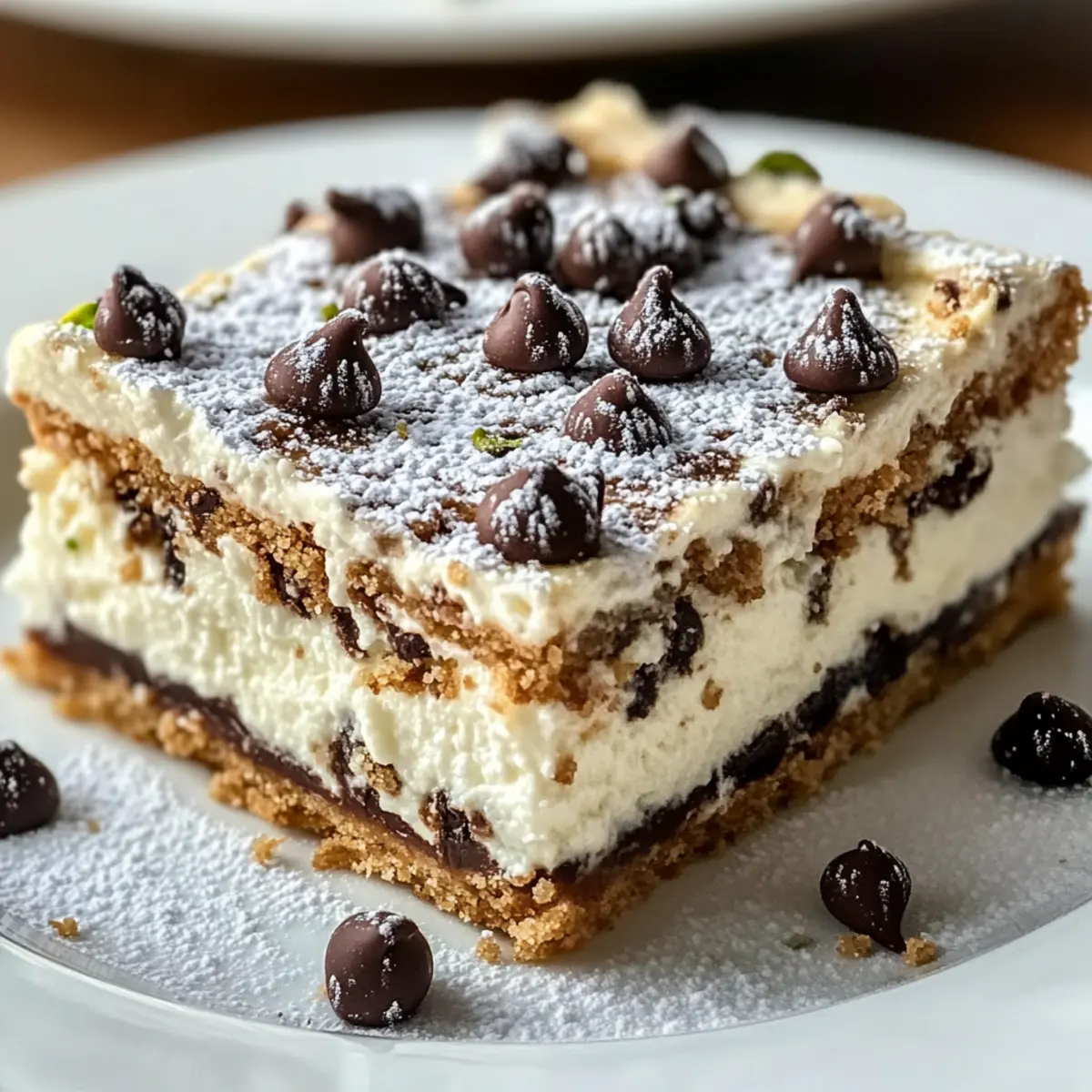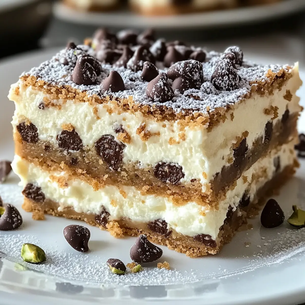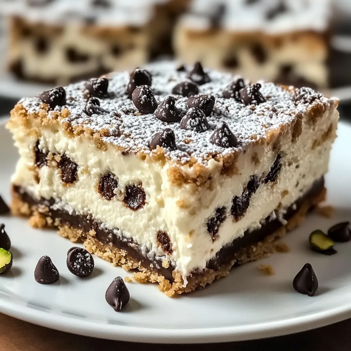 Schneide die kalten Cannoli Käsekuchen Riegel in gleich große Quadrate oder Rechtecke. Bestäube sie vor dem Servieren großzügig mit Puderzucker und dekoriere sie nach Belieben mit Schokoladenstückchen oder gehackten Pistazien, um ein ansprechendes Aussehen zu erzielen.