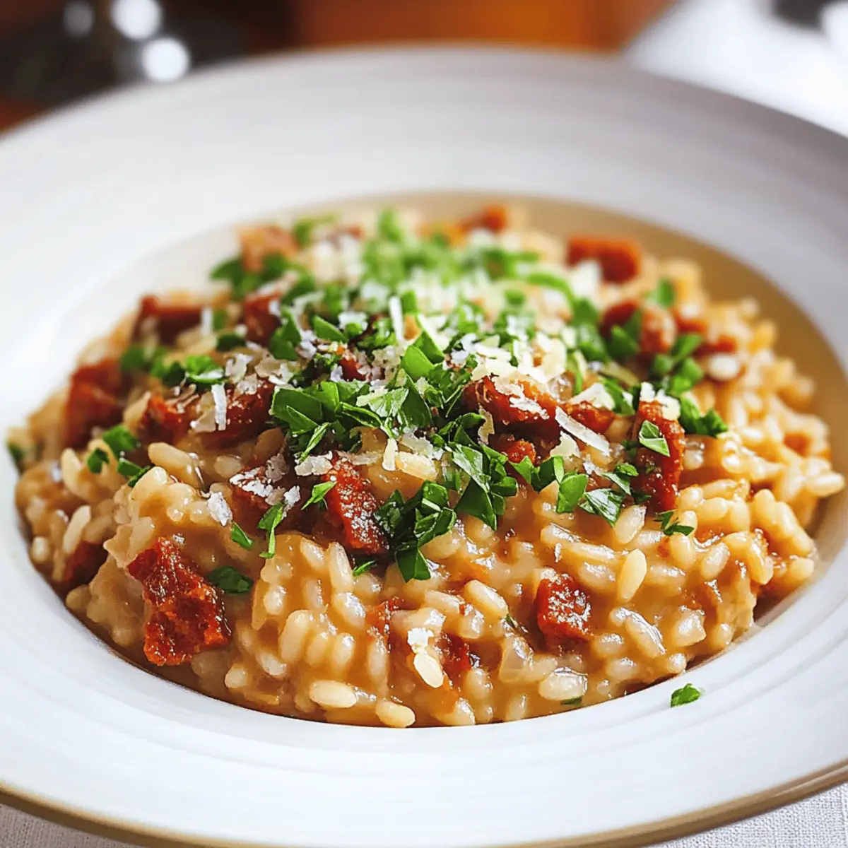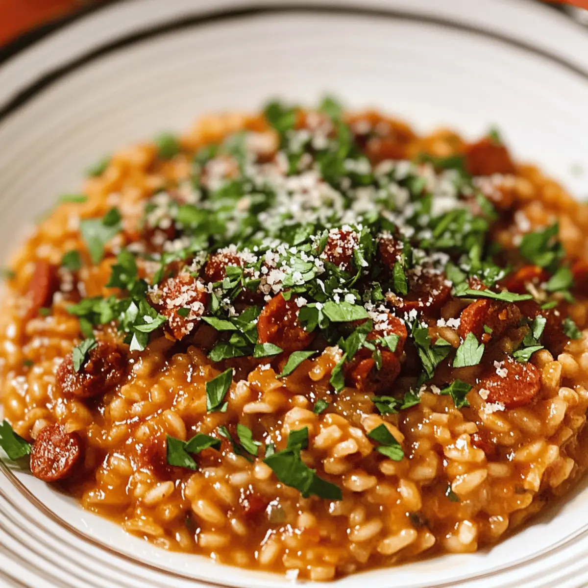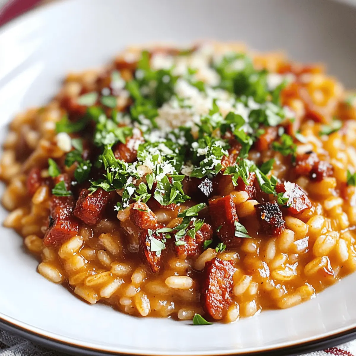 Als ich neulich mit Freunden im Küchenspass vertieft war, kam plötzlich der verführerische Duft von geräucherter Chorizo und dampfendem Risotto auf. Es war, als ob der Ofen uns ein kleines Geheimnis verriet: Jamie Olivers Smoky Chorizo Risotto. Dieses Rezept ist nicht nur leicht zuzubereiten, sondern bietet auch eine wohltuende Wärme, die die kalten Abende zu einem Fest macht. Mit der Kombination aus würziger Chorizo, cremigem Parmesan und einem köstlichen Tomaten-Rotwein-Basis wird es schnell zu einem Lieblingsgericht für gemütliche Abendessen oder besondere Anlässe. Bereit, die Gesten des Kochens zu erlernen und sich in eine Welt voller Geschmack zu stürzen? Lass uns gemeinsam den Kochlöffel schwingen! Warum wirst du dieses Chorizo-Risotto lieben? Einfachheit, das Rezept ist so leicht zu folgen und benötigt nur grundlegende Kochfähigkeiten! Reiche Aromen, die Kombination aus geräucherter Chorizo und würzigem Parmesan sorgt für ein unvergessliches Geschmackserlebnis. Perfekte Konsistenz, dank der speziellen Risotto-Reis-Sorte erhältst du die perfekte, cremige Textur. Vielseitigkeit, du kannst die Chorizo gegen eine vegetarische Variante austauschen oder dein Risotto mit Gemüse anpassen, um mehr Farbe und Nährstoffe hinzuzufügen. Schnelles Gericht, in etwa 30 Minuten zauberst du ein wunderbares Abendessen, das perfekt für hektische Wochentage ist. Also, wenn du auf der Suche nach einem Kochtipps für gesunde Gerichte bist, ist dieses Rezept genau das Richtige für dich! Chorizo-Risotto Zutaten • Für ein perfektes Geschmackserlebnis! Olivenöl – sorgt für eine geschmackvolle Grundlage und kann durch Pflanzenöl ersetzt werden, wenn du es leichter magst. Schalotten – fügen Süße und Tiefe hinzu; bei Bedarf kannst du auch Zwiebeln verwenden. Knoblauch – bringt Aroma und herzhaften Geschmack; verwende Knoblauchpulver, wenn dir frischer Knoblauch fehlt (1 Zehe = 1/8 TL Knoblauchpulver). Chorizo (80g) – liefert den rauchigen, würzigen Geschmack des Risottos; vegetarische Chorizo kann als Ersatz verwendet werden. Frische Petersilie (15g) – bringt Frische ins Gericht; du kannst auch andere frische Kräuter wie Basilikum oder Koriander verwenden. Hühner- oder Gemüsebrühe (750ml–1L) – bildet die Basis des Risottos; selbstgemachte Brühe ist ideal, aber auch gekaufte funktioniert gut. Gehackte Tomaten aus der Dose (400g) – sorgt für Säure und Reichhaltigkeit; du kannst auch passierte Tomaten verwenden, wenn du magst. Risotto-Reis (300g) – ist entscheidend für die cremige Konsistenz; Arborio oder Carnaroli wird empfohlen. Verwende keinen gewöhnlichen Reis. Rotwein (200ml) – verstärkt die Geschmacksvielfalt; alternativ kannst du Weißwein oder zusätzliche Brühe verwenden. Parmesan (50g, gerieben) – sorgt für Cremigkeit und Umami; nutze bei Bedarf vegetarischen Käse. Mit dieser Mischung aus Zutaten zauberst du ein Chorizo-Risotto, das sowohl sättigend als auch geschmackvoll ist! Schritt-für-Schritt-Anleitung für das Chorizo-Risotto Step 1: Basis vorbereiten Erhitze in einer großen Pfanne bei mittlerer Hitze 2 Esslöffel Olivenöl. Füge die fein gehackten Schalotten, den Knoblauch, die Chorizo und die Petersilienstiele hinzu. Brate alles etwa 5 Minuten lang, bis die Schalotten weich sind und die Chorizo ihre Farbe wechselt und zu duften beginnt. Step 2: Flüssigkeiten erwärmen Während die Basis kocht, bring in einem separaten Topf 750 ml Hühner- oder Gemüsebrühe zusammen mit den gehackten Tomaten zum sanften Köcheln. Stelle sicher, dass die Flüssigkeit heiß ist, damit sie beim Hinzufügen zum Risotto die Garzeit nicht verlängert. Step 3: Reis hinzufügen Rühre nun 300 g Risotto-Reis in die Pfanne mit der Chorizo-Basis ein, bis die Reiskörner gut mit dem Öl und den Aromen überzogen sind. Koche alles für etwa 2 Minuten, bis der Reis leicht glasig wird und anfängt, duften. Step 4: Mit Wein köcheln Gieße jetzt 200 ml Rotwein in die Pfanne und lasse ihn sprudeln, bis er fast vollständig aufgesogen ist. Rühre kontinuierlich, während der Wein verdampft, um sicherzustellen, dass der Reis die Aromen gut aufnimmt und die Mischung nicht ansetzt. Step 5: Brühe einarbeiten Beginne nun damit, die heiße Brühe-Tomaten-Mischung schöpfkellenweise hinzuzufügen. Rühre ständig um und füge immer erst die nächste Kelle hinzu, wenn die vorherige fast vollständig absorbiert ist. Diesen Vorgang wiederholst du für etwa 20 Minuten, bis der Reis cremig und al dente ist. Step 6: Fertigstellen Sobald der Reis zart, aber noch bissfest ist, füge die letzte Kelle Flüssigkeit hinzu und schalte die Hitze aus. Rühre 50 g frisch geriebenen Parmesan unter das Risotto, würze nach Belieben mit Salz und Pfeffer und decke die Pfanne für 5 Minuten ab, damit sich die Aromen setzen können. Step 7: Anrichten Serviere das Chorizo-Risotto in tiefen Tellern und streue nach Belieben mehr Parmesan und frisch gehackte Petersilie als Garnierung darüber. Genieße diese köstliche und cremige Kreation, die sowohl für ein gemütliches Abendessen als auch für besondere Anlässe geeignet ist. Chorizo-Risotto einfach vorbereiten Dieses Chorizo-Risotto ist ideal für die Meal Prep und lässt sich mühelos im Voraus vorbereiten! Du kannst die Chorizo (80g), Schalotten und Knoblauch für bis zu 24 Stunden im Voraus anbraten und in einem luftdichten Behälter im Kühlschrank lagern, um die Aromen frisch zu halten. Die Brühe und die gehackten Tomaten können ebenfalls bereits zusammen gemischt werden und bis zum Kochen im Kühlschrank aufbewahrt werden. Wenn du bereit bist, das Risotto zu vollenden, erhitze einfach die vorbereitete Basis und füge den Risotto-Reis hinzu. Dies spart dir Zeit in der Küche und ermöglicht es dir, ein köstliches, klassisches Gericht an stressigen Abenden zu genießen, das dennoch genau so lecker schmeckt wie frisch zubereitet! Lagerungstipps für Chorizo-Risotto Zimmertemperatur: Halte das Risotto nicht länger als 2 Stunden be