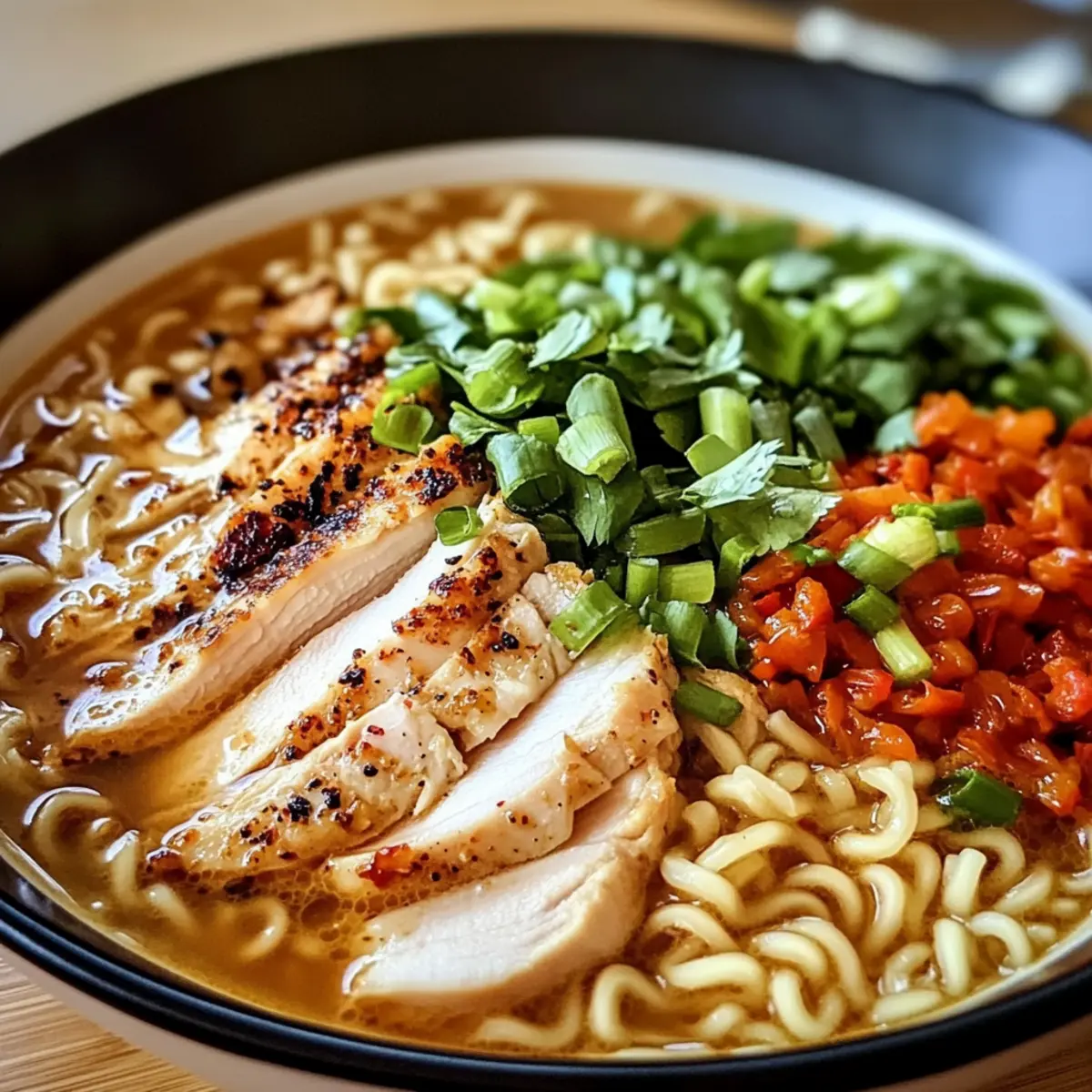 In einer kühlen Abendstunde, während der Duft von Knoblauch durch meine Küche zieht, zaubere ich das perfekte Wohlfühlessen: Cremige Knoblauchhähnchen Ramen. Diese einfache, aber unglaublich schmackhafte Rezeptur vereint zartes Hühnchen, aromatische Brühe und eine samtige Knoblauchsoße – das ideale Gericht für gemütliche Familienabende oder besondere Anlässe. In nur 30 bis 40 Minuten bereit, verwandelt es die gewöhnten Ramen in ein echtes Highlight. Zudem ist es anpassbar: Ob scharf für die Abenteuerlustigen oder vegetarisch für die Pflanzenliebhaber – hier finden alle ihren Platz am Tisch. Neugierig, wie dieses Gericht eure nächste Mahlzeit aufpeppen kann? Lass uns gemeinsam diese köstliche Reise beginnen! Warum wirst du dieses Rezept lieben? Einfachheit: Die Zubereitung dieses cremigen Gerichts ist kinderleicht und benötigt keine ausgeklügelten Kochkünste. Vielseitigkeit: Du kannst es nach Belieben anpassen, sei es scharf für die Pepp-Fans oder als vegetarische Variante für pflanzenbasierte Genießer. Unschlagbarer Geschmack: Die Kombination aus knusprigem Hühnchen, aromatischer Brühe und einer cremigen Knoblauchsoße sorgt für ein Geschmackserlebnis, das die gesamte Familie begeistert. Schnelle Zubereitung: In nur 30 bis 40 Minuten verwandelt sich dein Abendessen in ein Gourmet-Erlebnis, perfekt für hektische Wochentage. Wohlfühlfaktor: Jeder Löffel ist wie eine Umarmung an kalten Abenden; das macht dieses Rezept zum idealen Komfortessen für kuschelige Abende zu Hause. Entdecke auch unsere Vegetarische Ramen-Option, die nicht nur köstlich schmeckt, sondern auch gesund ist! Cremige Knoblauchhähnchen Ramen Zutaten Für die Brühe • Hühnerbrust (ohne Knochen und Haut) – Hauptquelle für Protein, kann für die vegetarische Option durch Tofu ersetzt werden. • Hühnerbrühe – Die Basis für die Suppe, für eine vegetarische Variante kann Gemüsebrühe benutzt werden. • Wasser – Passt die Konsistenz an; mehr Brühe sorgt für zusätzlichen Geschmack. • Schlagsahne – Fügt der Brühe Cremigkeit hinzu, kann durch Milch oder eine pflanzliche Alternative für eine leichtere Variante ersetzt werden. Für die Ramen • Ramen-Nudeln – Hauptkohlenhydratquelle, glutenfreie Nudeln sind ebenfalls eine gute Option. Für die Aromen • Knoblauch (gehackt) – Verleiht der Brühe Geschmack; frischer Knoblauch ist intensiver als Pulver. • Olivenöl – Zum Anbraten; kann durch andere Öle wie pflanzliches oder Sesamöl ersetzt werden. • Sojasauce – Sorgt für Umami und Salzigkeit; benutze Tamari für eine glutenfreie Variante. • Ingwer (gerieben) – Gibt ein warmes, aromatisches Aroma; gemahlener Ingwer ist auch möglich. Für die Verfeinerung • Maisstärke (mit Wasser vermischt) – Verdickt die Brühe; Arrowroot-Pulver kann ebenfalls verwendet werden. • Rote Pfefferflocken (optional) – Fügt Schärfe hinzu; Menge nach Belieben anpassen. • Gemüse nach Wahl (z.B. Spinat, Pak Choi, Paprika) – Bereichert die Suppe mit Nährstoffen und Geschmack, verwende, was vorhanden ist. Zum Garnieren • Grüne Zwiebeln (in Scheiben) – Für die Garnitur und zusätzlichen Crunch; können durch Schnittlauch ersetzt werden. • Frischer Koriander (optional) – Bringt Frische; kann weggelassen werden, wenn nicht gewünscht. • Salz und Pfeffer – Zum Würzen nach Geschmack; nach diätetischen Bedürfnissen anpassen. Schritt-für-Schritt-Anleitung für Cremige Knoblauchhähnchen Ramen Schritt 1: Hähnchen anbraten Erhitze Olivenöl in einem großen Topf auf mittlerer Hitze. Würze die Hühnerbrüste mit Salz und Pfeffer und brate sie für 5-7 Minuten pro Seite, bis sie goldbraun sind. Das Hähnchen sollte leicht durchgegart sein (ein internes Thermometer sollte 75°C anzeigen). Nimm das Hähnchen aus dem Topf und lasse es ruhen, während du mit dem nächsten Schritt fortfährst. Schritt 2: Aromaten anschwitzen Im gleichen Topf füge den gehackten Knoblauch und den geriebenen Ingwer hinzu. Brate sie 1-2 Minuten lang an, bis sie aromatisch sind und leicht goldbraun werden. Achte darauf, dass der Knoblauch nicht anbrennt, da er sonst bitter werden kann. Dieser Schritt sorgt für die geschmackliche Basis deiner Cremigen Knoblauchhähnchen Ramen. Schritt 3: Flüssigkeit hinzufügen Gieße die Hühnerbrühe und das Wasser in den Topf und bringe die Mischung zum Köcheln. Rühre gut um, damit sich der angebratene Knoblauch und Ingwer gleichmäßig in der Brühe verteilen. Lass die Brühe für etwa 5 Minuten leicht köcheln, um die Aromen zu intensivieren. Schritt 4: Nudeln kochen Füge die Ramen-Nudeln in die köchelnde Brühe hinzu und koche sie nach den Anweisungen auf der Verpackung. In der Regel dauert das etwa 4-5 Minuten, bis die Nudeln gar sind. Achte darauf, dass sie al dente bleiben, damit sie beim Servieren ihren Biss behalten. Schritt 5: Cremige Soße zubereiten Rühre die Schlagsahne und die Sojasauce in die Brühe ein. Füge nach Belieben die roten Pfefferflocken hinzu, um etwas Schärfe hinzuzufügen. Lass die Mischung für weitere 2-3 Minuten leicht köcheln, bis sie gut vermischt und leicht eingedickt ist. Die Cremigkeit wird das Gericht harmonisch abrunden. Schritt 6: Brühe verdicken Mische die Maisstärke mit etwas Wasser in einer kleinen Schüssel, bis sie glatt ist. Gieße die Mischung langsam in den Topf und rühre kontinuierlich um, bis die Brühe leicht eindickt (das dauert etwa 1-2 Minuten). Die Konsistenz sollte reichhaltig und cremig sein, ideal für Cremige Knoblauchhähnchen Ramen. Schritt 7: Gemüse hinzufügen Gib das gewünschte Gemüse wie Spinat oder Pak Choi in die Brühe. Koche alles für weitere 2-3 Minuten, bis das Gemüse welkt und zart wird. Diese Ergänzung bereichert nicht nur das Gericht mit Nährstoffen, sondern sorgt auch für zusätzliche Farbe und Textur. Schritt 8: Hähnchen vorbereiten Schneide das ruhende Hähnchen in dünne Scheiben. Achte darauf, dass die Stücke gleichmäßig sind, damit sie beim Servier