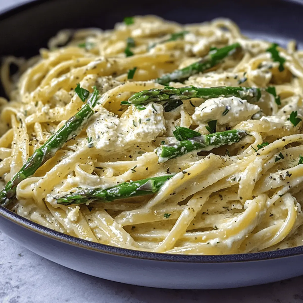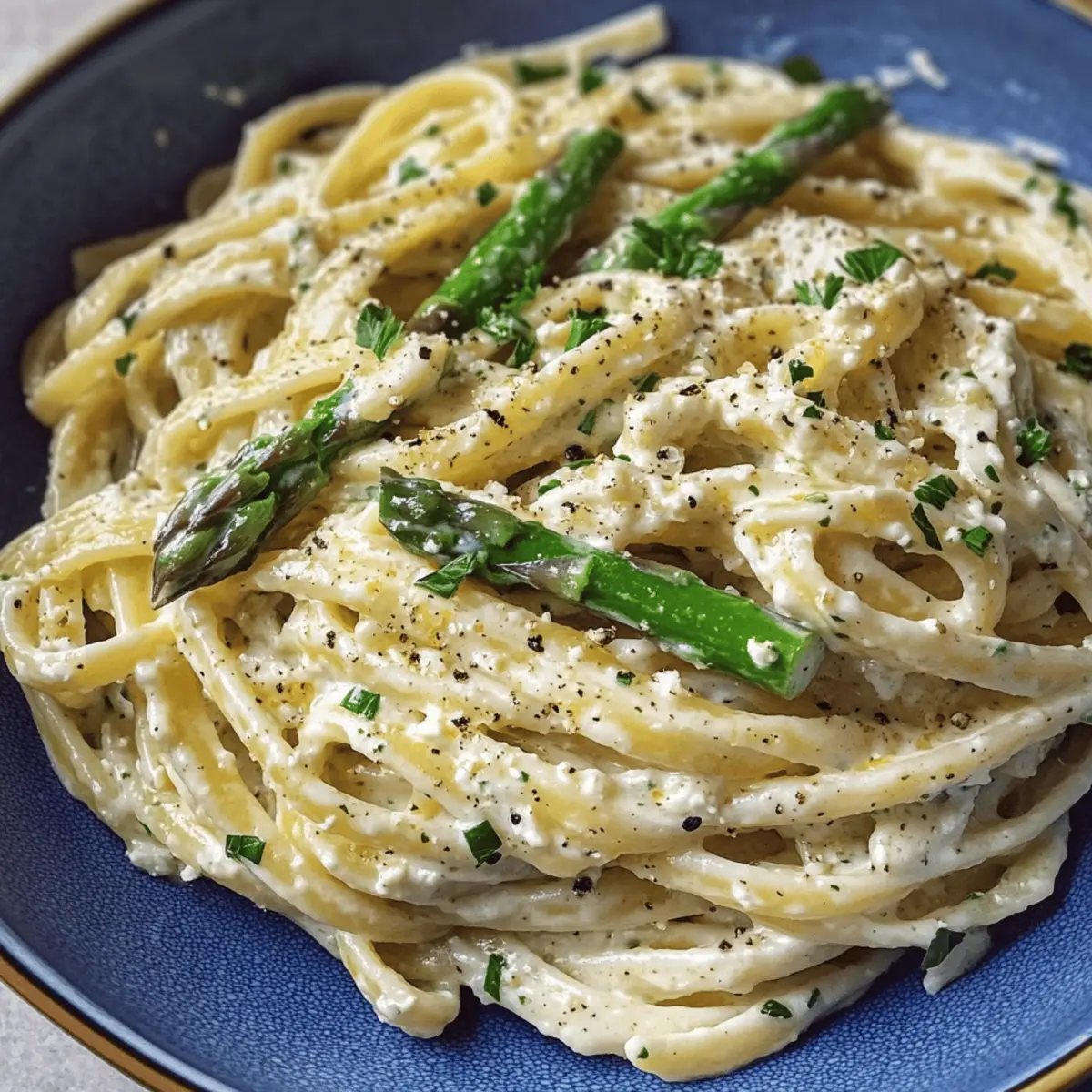 5. Kombinieren: Die abgetropfte Pasta in die heiße Sauce geben und gut vermischen. Die vorbereitete Feta-Sauce unter die Pasta heben und den Spargel vorsichtig einfügen.