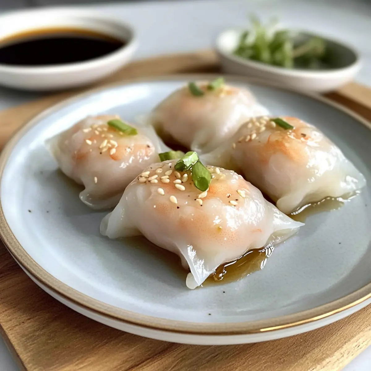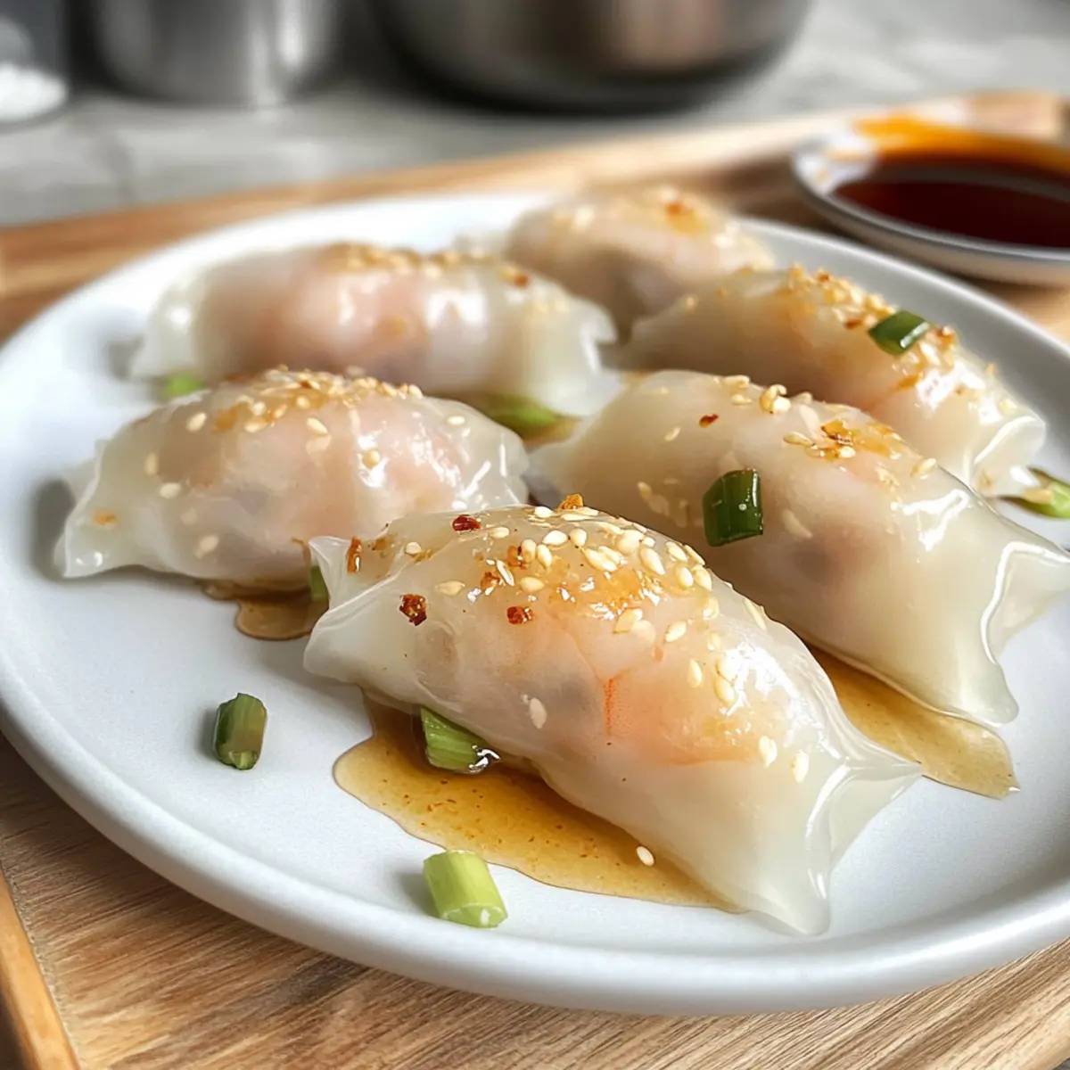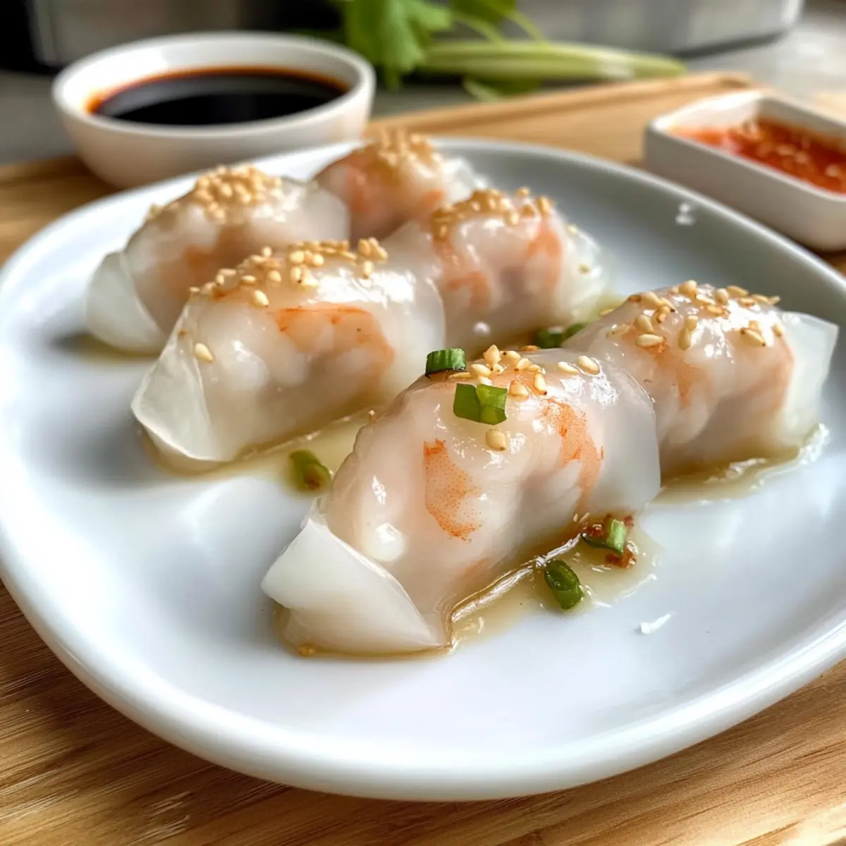 Es ist unglaublich, wie ein kleines Gericht so viele Erinnerungen hervorrufen kann. Diese einfachen Dampfnudeln mit Reisnudel und Garnelen, bekannt als Har Gow, bringen den authentischen Geschmack von Dim Sum direkt in Ihre Küche. Mit ihrem zarten, glutenfreien Reisnudel-Wrap umhüllen sie saftige Garnelen und eine köstliche Füllung – eine wahre Freude für jeden Gaumen! Die Zubereitung dieser köstlichen kleinen Päckchen ist nicht nur kinderleicht, sondern auch eine großartige Möglichkeit, Familie und Freunde zu verwöhnen. Sie sind perfekt als Vorspeise oder Snack geeignet und sorgen für ein geselliges Miteinander. Neugierig, wie Sie diese delikate Mischung aus Geschmack und Textur selbst zubereiten können? Lassen Sie uns gemeinsam in die Welt des Dampfdämpfens eintauchen! Warum sind diese Dampfnudeln so besonders? Einfachheit trifft Genuss: Diese Dampfnudeln sind nicht nur schnell zubereitet, sondern auch kinderleicht. Ein Geschmackserlebnis: Die Kombination aus zarten Garnelen und knackigen Bambussprossen sorgt für einen umami-reichen Biss, den niemand widerstehen kann. Glutenfrei und vielseitig: Durch die Nutzung von Reisnudeln ist dieses Rezept für alle geeignet, die glutenfrei essen möchten. Wechseln Sie die Füllung nach Belieben – probieren Sie zum Beispiel vegetarische Optionen oder andere Fischsorten. Perfektes Fingerfood: Ideal für gesellige Abende oder als appetitanregende Vorspeise – serviert mit einer scharfen Dip-Sauce wird es zum echten Hit! Schnell und saftig: Mit einer kurzen Garzeit von nur 9 Minuten gelingen Ihnen die Dampfnudeln stets perfekt, sodass Sie mehr Zeit für Ihre Gäste haben. Dampfnudeln mit Reisnudel und Garnelen Zutaten • Entdecken Sie die perfekten Zutaten für köstliche Dampfnudeln! Für die Füllung Rohe, geschälte Garnelen – Sie sorgen für den Hauptgeschmack; frische oder gefrorene Garnelen sind ideal. Bambussprossen – Sie fügen eine knusprige Textur und leichten Süße hinzu; Wasser-Kastanien eignen sich als Ersatz. Austernsauce – Diese verleiht der Füllung eine umami-reiche Tiefe; für eine vegane Variante verwenden Sie Sojasauce. Sesamöl – Es sorgt für einen nussigen Geschmack, aber Erdnussöl ist eine schmackhafte Alternative. Ingwer, gehackt – Frisch geriebener Ingwer bringt Wärme; gemahlener Ingwer ist nur die letzte Wahl. Maisstärke – Sie bindet die Füllung; alternativ kann auch Tapiokastärke verwendet werden. Für die Wraps Reispapier – Diese glutenfreie Option bietet eine zähe Textur, besonders wenn sie dampfgemacht wird; runde Reispapierblätter sind am besten geeignet. Für die Dipsauce Sojasauce – Sie liefert eine salzige Note für die Dipsauce; wählen Sie eine natriumarme Variante für eine gesündere Option. Zucker – Er balanciert die Salzigkeit der Dipsauce aus; Honig kann für natürlichere Süße verwendet werden. Chiliöl – Es bringt Würze in die Dipsauce; passen Sie die Menge je nach Schärfewunsch an. Sesamsamen – Sie eignen sich hervorragend als Garnitur und verleihen einen subtilen nussigen Geschmack. Genießen Sie die Zubereitung dieser Dampfnudeln mit Reisnudel und Garnelen und lassen Sie sich von den Geschmäckern verzaubern! Schritt-für-Schritt-Anleitung für Dampfnudeln mit Reisnudel und Garnelen Step 1: Füllung vorbereiten Die Garnelen gründlich abtropfen lassen und in kleine Stücke hacken. In einer Schüssel die gehackten Garnelen mit fein geschnittenen Bambussprossen, Austernsauce, Sesamöl, Ingwer, Maisstärke, Salz und Pfeffer gut vermengen. Diese Mischung sollte gut verbunden und leicht klebrig sein, um die zarten Dampfnudeln mit Reisnudel und Garnelen perfekt zu füllen. Step 2: Reispapier vorbereiten Schneiden Sie die Reispapierblätter in Viertel und legen Sie sie auf eine saubere, flache Oberfläche. Bereiten Sie eine flache Schüssel mit warmem Wasser vor. Tauchen Sie die Reispapierstücke nacheinander für etwa 10 bis 15 Sekunden in das Wasser, bis sie weich und biegsam sind, aber nicht überweichen, um ein Reißen zu vermeiden. Step 3: Dampfnudeln wickeln Legen Sie ein Stück rehydriertes Reispapier auf einen sauberen Teller oder eine Arbeitsfläche. Platzieren Sie einen Löffel der Garnelenfüllung in der Mitte des Blattes. Klappen Sie die Ränder um die Füllung und formen Sie pleatige Falten, um sicherzustellen, dass die Füllung gut versiegelt ist. Dieser Schritt bringt die Dampfnudeln mit Reisnudel und Garnelen in ihre charakteristische Form. Step 4: Dampfnudeln dämpfen Stellen Sie einen Dampftopf oder einen Bambusdämpfer auf den Herd und füllen Sie ihn mit Wasser. Bringen Sie das Wasser zum Kochen und legen Sie die gefüllten Dampfnudeln auf das Dampfgestell, ohne dass sie sich berühren. Dämpfen Sie die Dampfnudeln für etwa 9 Minuten. Sie sollten nach dem Dämpfen etwas glänzend und leicht durchsichtig sein. Step 5: Servieren Nehmen Sie die Dampfnudeln vorsichtig aus dem Dampfgarer und lassen Sie sie kurz abkühlen. Servieren Sie die warmen Dampfnudeln mit Reisnudel und Garnelen sofort auf einem Teller, zusammen mit einer hausgemachten Dipsauce aus Sojasauce, Zucker und Chiliöl, um die Geschmäcker zu verstärken. Lagerungstipps für Dampfnudeln mit Reisnudel und Garnelen Kühlschrank: Bewahren Sie die Dampfnudeln in einem luftdichten Behälter für bis zu 1 Tag auf. Achten Sie darauf, dass sie nicht übereinander gestapelt sind, um ein Ankleben zu vermeiden. Einfrieren: Sie können die Dampfnudeln mit Reisnudel und Garnelen ungekocht bis zu 2 Monate im Gefrierschrank aufbewahren. Legen Sie sie auf ein Backblech, um sie vor dem Einfrieren zu flashen, und verpacken Sie sie dann in einen gefriergeeigneten Beutel. Wiederaus dem Gefrierfach: Lassen Sie die gefrorenen Dampfnudeln vor dem Dämpfen für etwa 30 Minuten bei Raumtemperatur auftauen, um ein gleichmäßiges Garen zu gewährleisten. Erwärmen: Dämpfen Sie die gekühlten oder aufgetauten Dampfnudeln für 5-7 Minuten, bis sie durchwärmt sind. Achten Sie darauf, sie schnell zu serv