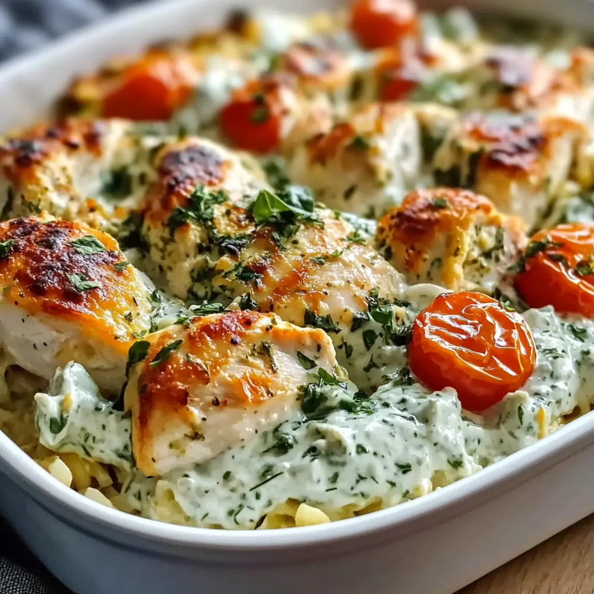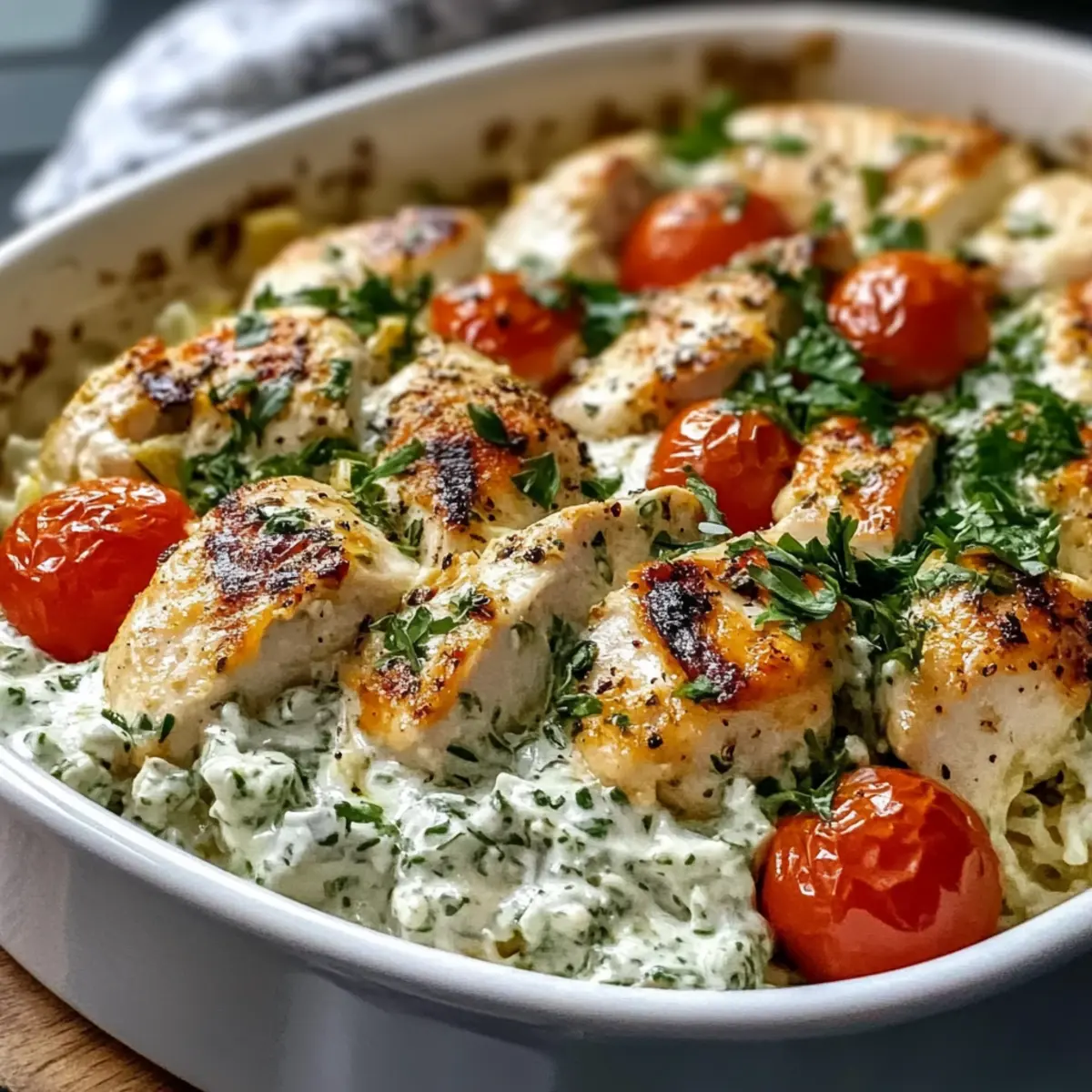 Als ich das erste Mal meinen Ofen für diesen Dump-und-Bake Hähnchen Tzatziki Auflauf vorheizte, konnte ich kaum glauben, wie einfach und schnell sich ein solches Geschmackserlebnis zubereiten lässt. Diese herzhafte und cremige Kombination aus zartem Hähnchen, frischem Gemüse und würzigem Tzatziki verwöhnt die Sinne und sorgt gleichzeitig für eine mühelose Reinigung nach dem Essen. Ideal für geschäftige Wochentage, bietet dieses Rezept nicht nur eine schnelle und einfache Möglichkeit, ein köstliches Abendessen auf den Tisch zu bringen, sondern es ist auch ein Familienliebling – perfekt für jeden, der sich nach einem geselligen Genuss sehnt. Und das Beste daran? Ihr werdet überrascht sein, wie viel Freude jeder Bissen vermittelt! Bereit, euer neues Lieblingsgericht zu entdecken? Warum ist dieser Auflauf einzigartig? Einfachheit: Diese Rezeptur erfordert minimale Vorbereitungszeit und nur ein einziges Backblech, was den Abend weniger stressig macht. Geschmacksexplosion: Mit der Kombination aus zartem Hähnchen, frischen Tomaten und dem cremigen Tzatziki wird jeder Bissen zu einem Genuss. Vielfältig: Ob mit zusätzlichen Gemüsevariationen wie Paprika oder Spinat, dieser Auflauf kann leicht angepasst werden, um euren persönlichen Geschmack zu treffen. Familienfreundlich: Kinder und Erwachsene lieben ihn gleichermaßen – so wird das Abendessen zum gemeinschaftlichen Erlebnis! Schnell und sättigend: In nur 30 bis 35 Minuten auf dem Tisch – ideal für hektische Wochentage, wenn die Zeit drängt. Probiert diesen Dump-und-Bake Hähnchen Tzatziki Auflauf aus und erlebt selbst, wie einfach und lecker frisches Essen sein kann! Dump-und-Bake Hähnchen Tzatziki Auflauf Zutaten Für das Hähnchen • Hähnchenbrust – Der Hauptproteinlieferant für zarte Bissen. Verwende ohne Haut für eine schnellere Garzeit. • Olivenöl – Hilft, das Gemüse und Hähnchen schön saftig zu halten. Avocadoöl ist eine gute Alternative. Für den Auflauf • Kirschtomaten – Sie sorgen für eine süße und saftige Note; normale gewürfelte Tomaten sind auch geeignet. • Zucchini – Liefert Feuchtigkeit und Nährstoffe; kann durch gelbe Zucchini ersetzt werden, um etwas Abwechslung zu bringen. • Rote Zwiebel – Fügt eine scharfe Note hinzu. Für einen milderen Geschmack eignen sich Schalotten. Für das Tzatziki • Tzatziki-Sauce – Gibt Cremigkeit und Geschmack. Gut vorbereitet im Voraus oder im Laden gekauft beides möglich. • Feta-Käse – Sorgt für den cremigen und herben Geschmack; verwende Ziegenkäse für eine andere Geschmacksperspektive. Für die Gewürze • Getrockneter Oregano – Fügt aromatische Noten hinzu; frischer Oregano kann in größerer Menge verwendet werden für intensiveren Geschmack. • Salz und Pfeffer – Unverzichtbar für eine feine Würze, nach persönlichem Geschmack anpassen. Genießt diesen Dump-und-Bake Hähnchen Tzatziki Auflauf und überrascht eure Familie mit einer köstlichen Kreation, die in nur wenigen Schritten auf dem Tisch steht! Schritt-für-Schritt-Anleitung für Dump-und-Bake Hähnchen Tzatziki Auflauf Step 1: Ofen vorheizen und Backform vorbereiten Heize den Ofen auf 200°C vor und fette eine 23×33 cm große Auflaufform mit Olivenöl ein. Diese Vorbereitung sorgt dafür, dass nichts anhaftet und der Auflauf gleichmäßig gart. Achte darauf, dass die Form gut beschichtet ist, damit alle Zutaten in diesem Dump-und-Bake Hähnchen Tzatziki Auflauf wunderbar zusammenkommen können. Step 2: Hähnchen und Gemüse platzieren Lege die Hähnchenbrustfilets in die vorbereitete Auflaufform und verteile die Kirschtomaten, die Zucchini und die roten Zwiebeln gleichmäßig darüber. Diese Schritte verleihen dem Gericht eine aromatische Basis. Die bunten Farben des Gemüses sind nicht nur ein visueller Genuss, sondern tragen auch zu einem herzhaften Geschmack bei. Step 3: Würzen und vermengen Träufle Olivenöl über die gesamte Mischung und würze alles großzügig mit getrocknetem Oregano, Salz und frisch gemahlenem Pfeffer. Verwende deine Hände oder einen Löffel, um alles gut zu vermengen, sodass jede Zutat gleichmäßig mit den Gewürzen überzogen ist. Dies wird helfen, einen köstlichen Geschmack im Dump-und-Bake Hähnchen Tzatziki Auflauf zu erreichen. Step 4: Tzatziki-Sauce hinzufügen Nimm die Tzatziki-Sauce und löffle sie gleichmäßig über die Hähnchen-Gemüse-Mischung. Mit einem Löffel oder einer Gabel kannst du vorsichtig umrühren, um die Sauce gleichmäßig zu verteilen, ohne das Gemüse und das Hähnchen zu zerreißen. Diese cremige Schicht sorgt für den besonderen Geschmack, der diesen Auflauf einzigartig macht. Step 5: Backen Schiebe die Auflaufform in den vorgeheizten Ofen und backe für 30 bis 35 Minuten. Der Auflauf ist fertig, wenn das Hähnchen eine Innentemperatur von 75°C erreicht hat und die Gemüsestücke weich und leicht gebräunt sind. Ein guter Indikator dafür, dass alles gut gegart ist, sind die verführerischen Aromen, die durch die Küche ziehen. Step 6: Feta-Käse hinzufügen und servieren Nimm den Auflauf aus dem Ofen und streue den zerbröckelten Feta-Käse gleichmäßig darüber, während das Gericht noch heiß ist. Lasse ihn vor dem Servieren kurz abkühlen. Der Feta wird leicht schmelzen und eine köstliche, cremige Note hinzufügen. Serviere den Dump-und-Bake Hähnchen Tzatziki Auflauf direkt warm auf dem Tisch für ein schnelles und leckeres Abendessen. Dump-und-Bake Hähnchen Tzatziki Auflauf Variationen Lasst eurer Kreativität beim Kochen freien Lauf und passt dieses leckere Rezept ganz nach eurem Geschmack an! Zusätzliche Gemüsesorten: Fügt Paprika oder Spinat hinzu, um den Auflauf noch bunter und nahrhafter zu gestalten. Diese zusätzlichen Zutaten sind nicht nur gesund, sondern bringen auch neue Geschmackselemente ins Spiel. Quinoa anstelle von Reis: Ersetzt den Reis durch Quinoa, um eine proteinreichere Basis zu erhalten. Diese glutenfreie Variante bietet eine hervorragende Textur und vers
