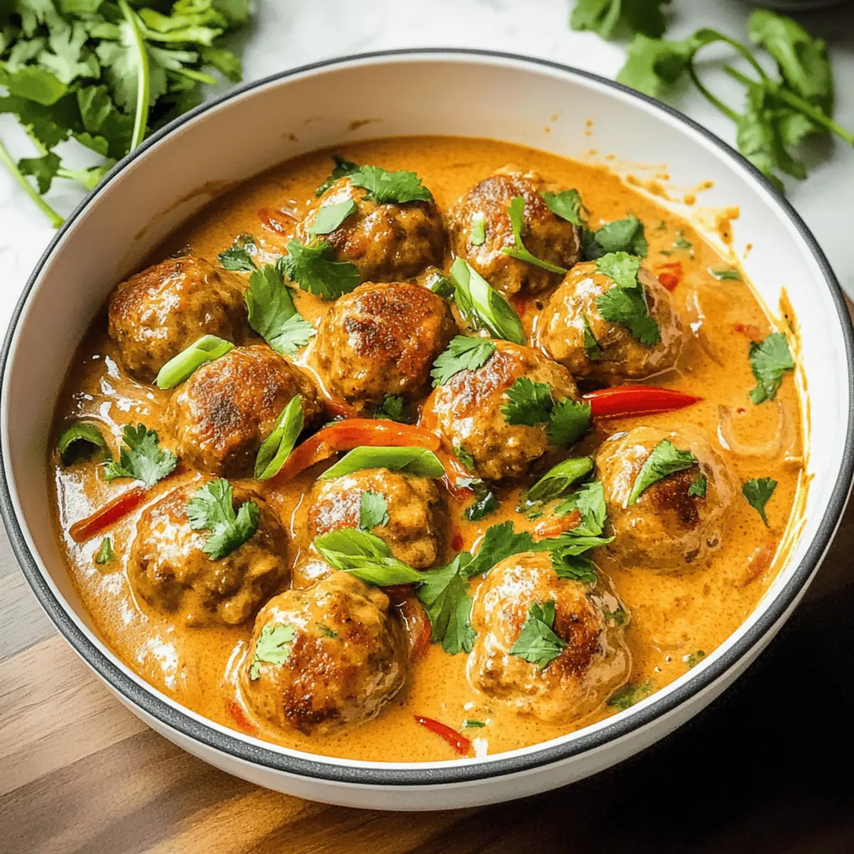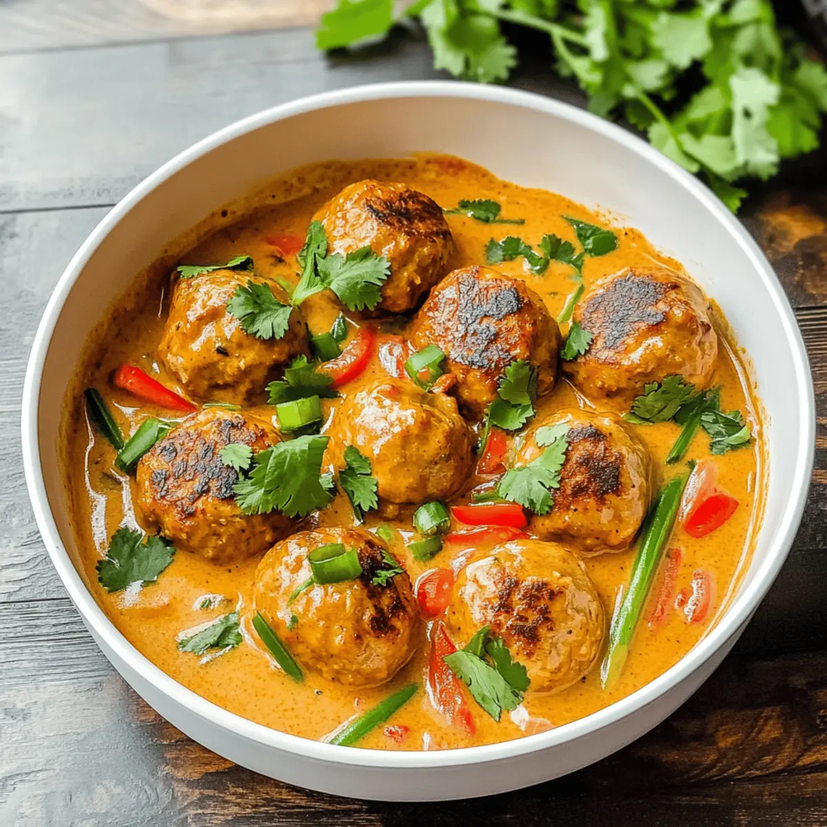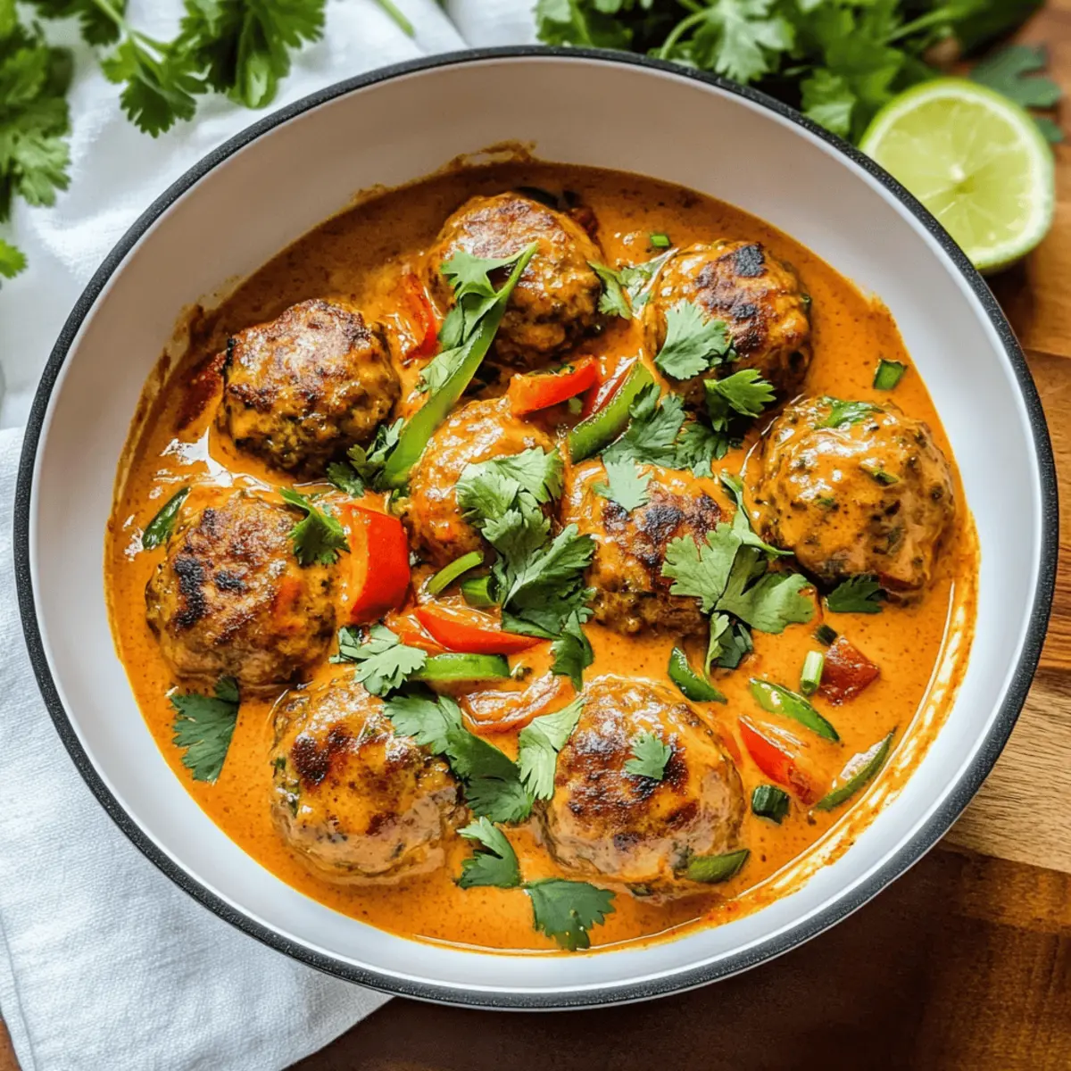 Beim letzten Abendessen mit Freunden hörte ich sie über das Bedürfnis sprechen, wieder frisch zu kochen, anstatt sich auf Fast Food zu verlassen. Diese Ein-Pfannen-Thailändischen-Hühnchenfleischbällchen sind die perfekte Lösung! In einer cremigen Kokos-Curry-Sauce köcheln sie zusammen mit knackigem Gemüse und liefern nicht nur satte Aromen, sondern sind auch schnell zubereitet – ideal für stressige Wochentage. Egal, ob du sie über duftendem Jasminreis oder zarten Nudeln servierst, diese köstlichen Fleischbällchen werden sicherlich zur neuen Lieblingsmahlzeit deiner Familie. Bist du bereit, deine Küche mit einem Hauch von Thailand zu verzaubern? Warum wirst du dieses Rezept lieben? Einfachheit: Die Zubereitung ist kinderleicht und erfordert nur grundlegende Kochfähigkeiten – perfekt für alle, die schnell etwas Leckeres auf den Tisch bringen möchten. Reichhaltiger Geschmack: Die Kombination aus Kokosmilch und roter Curry-Paste sorgt für ein unvergleichliches Aroma, das dir das Gefühl gibt, in Thailand zu sein. Vielseitigkeit: Du kannst mit verschiedenen Gemüsesorten experimentieren oder die Fleischbällchen an deine persönlichen Vorlieben anpassen – sei es mit Schweine- oder Rinderhackfleisch! Familienfreundlich: Besonders beliebt bei Kindern, da die Fleischbällchen in einer cremigen Sauce schwimmen, die einfach unwiderstehlich ist. Gesund und nahrhaft: Mit etwa 395 Kalorien pro Portion sind diese herzhaften Fleischbällchen eine großartige Wahl für gesundheitsbewusste Esser. Denke daran, sie mit frisch gepresstem Limettensaft zu servieren – ein kleiner, aber feiner Genuss! Ein-Pfannen-Thailändische-Hühnchenfleischbällchen Zutaten • Entdecke die köstlichen Zutaten dieser nahrhaften Ein-Pfannen-Thailändischen-Hühnchenfleischbällchen! Für die Fleischbällchen Gemischtes Hühnchen – Die proteinreiche Basis für die Fleischbällchen; verwende auch Puten- oder pflanzliche Alternativen für Variation. Panko-Brösel – Sorgt für Struktur und eine leichte Textur; ersetze sie bei Bedarf durch glutenfreie Brösel oder Mandelmehl. Ei – Bindet die Mischung; ein Flax-Ei (1 Esslöffel gemahlene Leinsamen + 3 Esslöffel Wasser) ist eine vegane Option. Knoblauch (gehackt) – Verstärkt den Geschmack; frischer Knoblauch ist ideal, aber Knoblauchpulver kann auch verwendet werden. Ingwer (gerieben) – Fügt Wärme und Tiefe hinzu; frischer Ingwer ist zu bevorzugen, aber gemahlener Ingwer in kleinerer Menge funktioniert ebenfalls. Sojasauce oder Tamari – Liefert Umami-Geschmack; benutze Tamari für eine glutenfreie Option. Limettensaft – Bringt Säure und Frische; kann bei Mangel durch Zitronensaft ersetzt werden. Gehackter Koriander und Frühlingszwiebeln – Frische Kräuter zum Garnieren; optional, falls gewünscht. Salz und schwarzer Pfeffer – Wesentliche Gewürze; nach Geschmack anpassen. Oliven- oder Avocadoöl – Zum Braten der Fleischbällchen und Sautieren des Gemüses; kann durch andere neutrale Öle ersetzt werden. Für die Sauce Kokosmilch – Schafft eine cremige Basis für die Sauce; Alternativen sind Schlagsahne oder pflanzliche Milch, wobei Geschmack und Textur abweichen. Thailändische rote Currypaste – Sorgt für geschmackliche Komplexität; die Menge je nach Schärfewunsch anpassen. Frisches Gemüse – Beinhaltet dünn geschnittene Karotten, Paprika und Zuckerschoten; ersetze es je nach Saison und Verfügbarkeit durch andere Gemüsesorten. Genieße diese köstlichen Ein-Pfannen-Thailändischen-Hühnchenfleischbällchen und erlebe, wie einfach es ist, gesunde und schmackhafte Gerichte zu zaubern! Schritt-für-Schritt-Anleitung für Ein-Pfannen-Thailändische-Hühnchenfleischbällchen Step 1: Fleischbällchen mischen In einer großen Schüssel kombinierst du das gemischte Hühnchen, Panko-Brösel, Ei, gehackten Knoblauch, geriebenen Ingwer, Sojasauce, Limettensaft, Koriander, Frühlingszwiebeln, Salz und Pfeffer. Mische alles gut mit den Händen oder einer Gabel, bis die Zutaten gerade so vermengt sind. Achte darauf, die Mischung nicht zu überarbeiten. Step 2: Fleischbällchen formen Mit deinen Händen formst du aus der Mischung kleine Fleischbällchen, etwa 2,5 cm groß. Platziere die geformten Fleischbällchen auf einem großen Teller oder einer sauberen Arbeitsfläche. Lass sie für einen Moment ruhen, damit sie ihre Form behalten, während du das Öl erhitzt. Step 3: Fleischbällchen anbraten Erhitze in einer großen Pfanne bei mittlerer Hitze 2 Esslöffel Oliven- oder Avocadoöl. Wenn das Öl heiß ist und leicht zu schimmern beginnt, gib die Fleischbällchen vorsichtig hinein. Brate sie für etwa 8-10 Minuten rundherum goldbraun, dabei gelegentlich wenden, bis sie gut durchgegart sind (eine innere Temperatur von 75°C sollte erreicht werden). Step 4: Gemüse sautieren Nimm die gebratenen Fleischbällchen aus der Pfanne und stelle sie beiseite. In derselben Pfanne fügst du bei Bedarf etwas mehr Öl hinzu und erhitzt es erneut. Gib die geschnittenen Zwiebeln, geriebenen Ingwer, Karotten, Paprika, Zuckerschoten, Salz und Pfeffer hinzu und sautiere alles etwa 3-4 Minuten lang, bis das Gemüse leicht zart ist, aber immer noch knusprig bleibt. Step 5: Sauce zubereiten Sobald das Gemüse gar ist, gieße die Kokosmilch in die Pfanne und füge die Sojasauce sowie die rote Currypaste hinzu. Rühre alles gut um, um die Aromen zu vereinen. Bringe die Mischung kurz zum Köcheln und reduziere die Hitze auf schwach, sodass es leicht simmernd bleibt. Step 6: Fleischbällchen hinzufügen Lege die bereits gebratenen Fleischbällchen vorsichtig zurück in die Pfanne zur Sauce. Lass die Fleischbällchen 8-10 Minuten in der Sauce köcheln, damit sie die Aromen aufnehmen können. Rühre sanft gelegentlich um, um ein Anbrennen zu vermeiden und die Sauce gleichmäßig zu verteilen. Step 7: Anrichten und servieren Serviere die Ein-Pfannen-Thailändischen-Hühnchenfleischbällchen warm über dampfendem Jasminreis oder Nudeln. Garniere das Gericht mit 