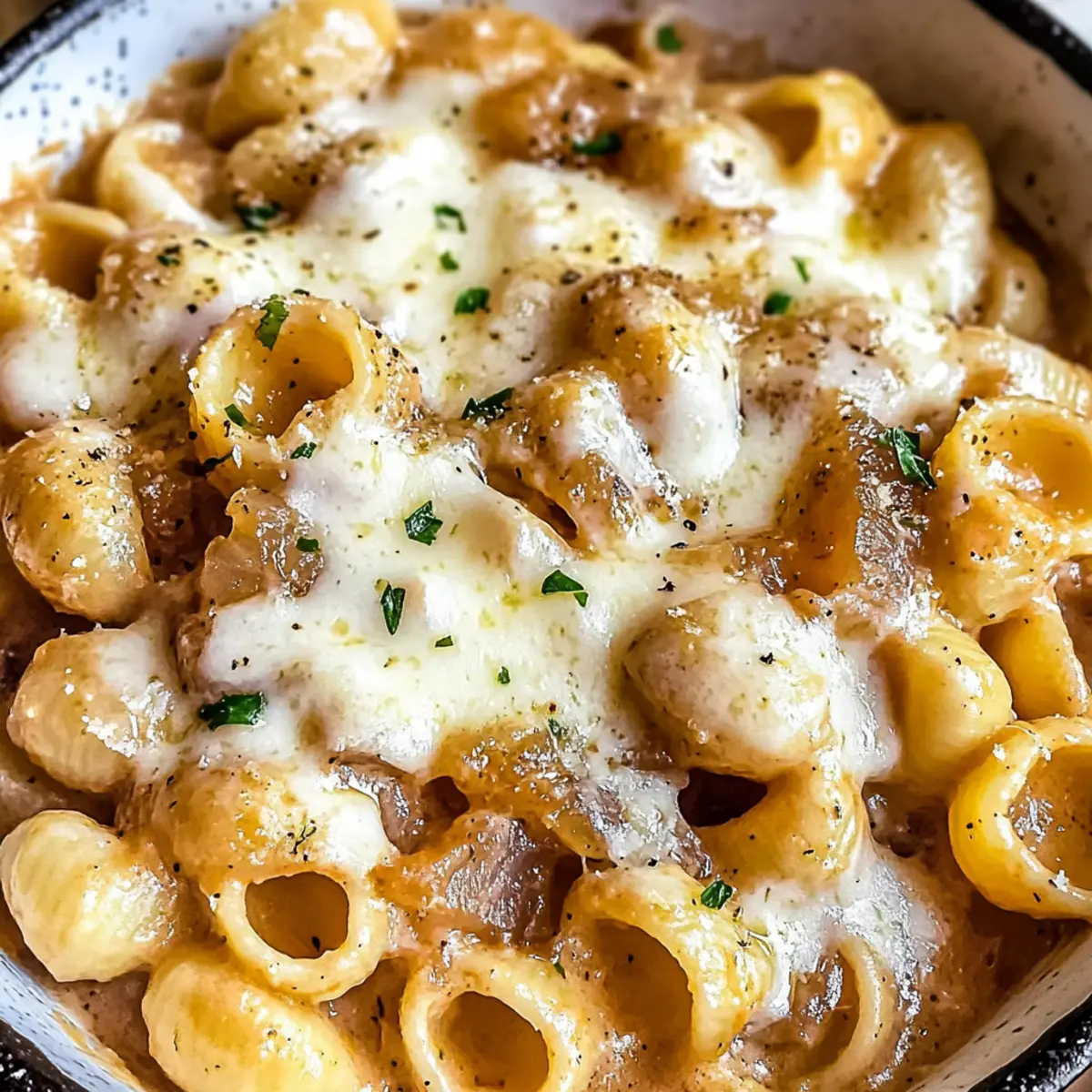 Plötzlich fiel mir der köstliche Duft von frisch karamellisierten Zwiebeln in die Nase. Diese einfache, aber unglaublich schmackhafte Ein-Topf Französische Zwiebel Pasta bringt das Bistro-Feeling direkt in deine Küche. Mit einer wunderbar cremigen Sauce, die ganz ohne schwere Sahne auskommt, wird dieses Gericht zu einem unverzichtbaren Wochenend-Schmeichler. Egal, ob du Vegetarier bist oder einfach nur eine schnelle und gesunde Mahlzeit suchst, diese Pasta bietet dir beide Vorteile! Lass uns gemeinsam herausfinden, wie wir dieses tröstende Gericht zubereiten können, das nicht nur den Hunger stillt, sondern auch dein Herz erwärmt. Bist du bereit für diesen Genuss? Warum wird diese Pasta dein Favorit? Einfachheit: Mit nur einem Topf und wenigen Zutaten ist die Zubereitung dieser Pasta kinderleicht. Schnell und praktisch: Perfekt für stressige Abende, benötigt dieses Gericht minimalen Aufwand und bietet schnell eine köstliche Mahlzeit. Wunderbare Aromen: Die Kombination aus karamellisierten Zwiebeln und cremigen Käsesorten sorgt für eine Geschmacksexplosion. Vielseitig: Ob vegetarisch oder mit zusätzlichen Gemüse-Highlights – diese Pasta lässt sich ganz nach deinem Geschmack anpassen. Wärmende Gemütlichkeit: Ein köstliches Erlebnis, das dich an Bistroabende erinnert und jedes Herz erwärmt! Ein-Topf Französische Zwiebel Pasta Zutaten Für die Pasta Orecchiette – Diese Pastaform hält die cremige Sauce optimal fest; du kannst auch Radiatori, Rotini oder Muscheln verwenden. Gelbe Zwiebeln – Der Schlüssel zur Karamellisierung, die diese Pasta so süß macht; gleichmäßige 1/8-Zoll-Ringe sorgen für gleichmäßiges Garen. Knoblauch – 4 Zehen, fein gehackt, geben ein intensives Aroma; ersetze sie durch 1 Teelöffel Knoblauchpulver, wenn nötig. Für die Flüssigkeiten Wasser + Rinderbrühe – Diese Kombination kreiert einen reichhaltigen Fond; für noch mehr Geschmack verwende Rinderbrühe anstelle von Wasser. Verdampfte Milch – Sorgt für eine cremige Textur; klassische Milch kann den Reichtum des Gerichts beeinträchtigen. Worcestershire-Sauce – Verstärkt den Umami-Geschmack und ist für die Tiefe des Gerichts unerlässlich. Sojasauce – Verwende die reduzierten Natriumvarianten, um den Salzgehalt im Zaum zu halten. Für die Gewürze Frischer Thymian und Petersilie – Fügen frische Aromen hinzu; getrocknete Kräuter können in Ermangelung frischer Kräuter verwendet werden. Getrockneter Oregano, Paprika, Rote Pfefferflocken – Für die Würze; passe die Menge nach deinem Geschmack an. Für die cremige Note Gruyère-Käse – Sorgt für eine süße und nussige Note; Schweizer Käse kann als Ersatz verwendet werden. Parmesan – Fügt eine salzige Note hinzu; frisch gerieben für den besten Geschmack ist am idealsten. Mit diesen köstlichen Zutaten wirst du die Ein-Topf Französische Zwiebel Pasta im Handumdrehen zubereiten können! Step-by-Step Instructions für Ein-Topf Französische Zwiebel Pasta Step 1: Zwiebeln karamellisieren Schmelze in einem großen Topf bei mittlerer Hitze Butter und Olivenöl. Füge die geschnittenen Zwiebeln hinzu und koche sie 30-35 Minuten lang, bis sie goldbraun und karamellisiert sind. Rühre gelegentlich um, um ein gleichmäßiges Garen zu gewährleisten. Diese karamellisierten Zwiebeln bilden die Basis für den köstlichen Geschmack der Ein-Topf Französische Zwiebel Pasta. Step 2: Knoblauch und Gewürze hinzufügen Gib den gehackten Knoblauch und die roten Pfefferflocken zu den Zwiebeln in den Topf und sautierte alles für etwa 30 Sekunden. Dieser Schritt bringt die Aromen zur Entfaltung. Füge anschließend die Worcestershire-Sauce und die Sojasauce hinzu, um der Mischung zusätzliche Tiefe und Umami-Geschmack zu verleihen. Step 3: Flüssigkeiten kombinieren Gieße das Wasser und die Hälfte der verdampften Milch in den Topf. Whisk die restliche Milch mit etwas Maisstärke in einer separaten Schüssel, um sie zu verdicken, und füge sie dann zur Zwiebelmischung hinzu. Diese Kombination sorgt für die cremige Grundlage der Ein-Topf Französische Zwiebel Pasta. Step 4: Pasta kochen Bringe die gesamte Mischung zum Kochen, dann füge die Orecchiette hinzu. Decke den Topf ab, reduziere die Hitze auf niedrig und lasse alles 20-25 Minuten köcheln, bis die Pasta al dente ist. Stelle sicher, dass du zwischendurch umrührst, um ein Ankleben zu verhindern und die Sauce gleichmäßig zu verteilen. Step 5: Mit Käse verfeinern Nimm den Topf vom Herd und rühre den Gruyère- und den Parmesan-Käse unter die Pasta, bis sie geschmolzen und cremig sind. Diese Käsezusätze geben der Ein-Topf Französische Zwiebel Pasta die richtige Konsistenz und bereichern den Geschmack. Schmecke abschließend die Pasta ab und passe die Gewürze nach deinem Belieben an. Was passt zu Ein-Topf Französische Zwiebel Pasta? Verwandle deine Mahlzeit mit diesen köstlichen Beilagen, die perfekt mit der cremigen Ein-Topf Französischen Zwiebel Pasta harmonieren. Frischer Garten-Salat: Ein leichter, knackiger Salat mit saisonalem Gemüse ergänzt die reichhaltige Pasta wunderbar und sorgt für einen farbenfrohen Kontrast. Knoblauchbrot: Das aromatische Knoblauchbrot ist perfekt, um die cremige Sauce aufzutunken, und ergänzt die herzhaften Aromen der Zwiebeln. Röstbrokkoli mit Parmesan: Die Röstung bringt die Süße des Brokkolis hervor und der Parmesan fügt einen salzigen Crunch hinzu, der die Texturen aufwertet. Glatter Rotwein: Ein seidiger Merlot oder Cabernet Sauvignon harmoniert hervorragend mit der Umami-Note der Pasta und rundet das Geschmackserlebnis ab. Einfache Tomatensuppe: Eine leichte, würzige Tomatensuppe sorgt für eine fruchtige Frische und ergänzt die Sättigung des Gerichts. Zitronen-Mascarpone-Dessert: Ein leichtes, frisches Dessert nach der Pasta bringt eine süße Note und rundet das Essen perfekt ab. Tipps zur Vorbereitung für die Ein-Topf Französische Zwiebel Pasta Mit ein wenig Planung kannst du die Ein-Topf Französische Zwiebe