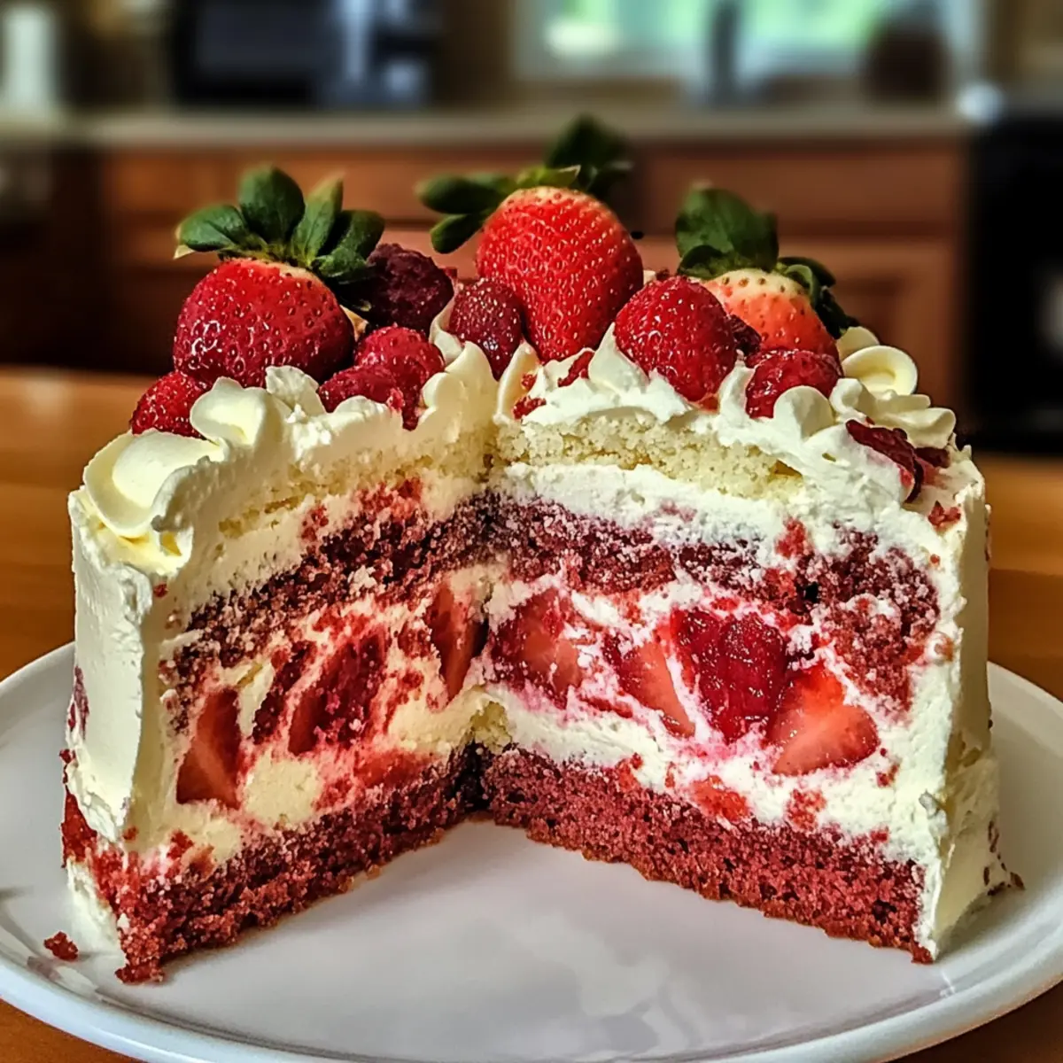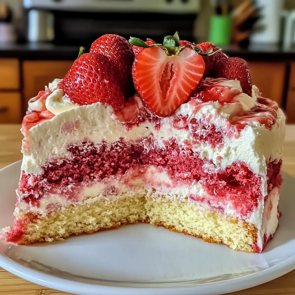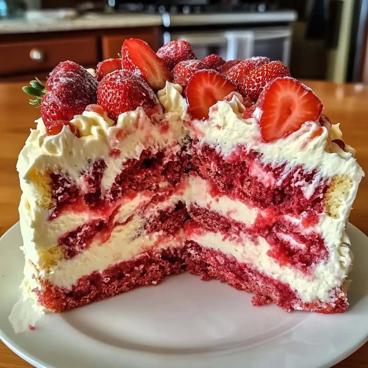Der erste Biss in diesen Erdbeer-Erdbeben-Kuchen lässt mich sofort an sonnige Nachmittage denken, an denen der Garten voller reifer Erdbeeren ist. Diese himmlische Kreation kombiniert die frischen Erdbeeren mit einer köstlich cremigen Frischkäse-Wirbelung und sorgt so für ein faszinierendes Geschmackserlebnis. Was diesen Kuchen besonders macht, ist nicht nur die einfache Zubereitung, sondern auch die Tatsache, dass er sich perfekt für Feiern oder entspannte Familienabende eignet. Mit seiner verspielten Marmorierung ist der Erdbeer-Erdbeben-Kuchen zudem ein echter Hingucker und wird deine Gäste begeistern. Wie würdest du ihn mit deinen Lieblingsfrüchten abwandeln? Warum wirst du diesen Kuchen lieben? Einzigartiger Erdbeer-Geschmack: Jeder Biss ist ein Genuss, der den frischen Geschmack von reifen Erdbeeren wunderbar zur Geltung bringt. Einfach zu machen: Mit nur wenigen Zutaten und grundlegenden Kochkenntnissen gelingt dieser Kuchen mühelos und ist perfekt für Anfänger. Vielfältige Variationen: Du kannst ihn ganz nach deinen Wünschen anpassen und zum Beispiel andere Früchte oder vegane Alternativen ausprobieren – die Möglichkeiten sind endlos! Eindrucksvoll: Die auffällige, gemischte Marmorierung macht diesen Kuchen zu einem echten Blickfang auf jeder Feier. Für jeden Anlass: Egal, ob bei einem Familienessen oder einer Grillparty, der Erdbeer-Erdbeben-Kuchen ist immer ein Hit und bleibt in Erinnerung. Damit du noch mehr Inspiration bekommst, schau dir doch auch unsere Tipps für die perfekte Kuchendekoration an! Erdbeer-Erdbeben-Kuchen Zutaten Für den Teig • Erdbeer-Kuchen-Mischung – bildet die süße Basis des Kuchens; du kannst auch ein selbstgemachtes Rezept verwenden. • Große Eier (3) – sorgen für Struktur und Feuchtigkeit im Kuchen. • Öl (1/2 Tasse) – bringt Feuchtigkeit und Reichhaltigkeit; geschmolzene Butter kann für zusätzlichen Geschmack verwendet werden. • Wasser (1 Tasse) – hydriert die trockenen Zutaten. • Frische Erdbeeren (2 Tassen) – sorgen für einen frischen Geschmack; bei gefrorenen Erdbeeren gut auftauen und abtropfen lassen, um überschüssige Feuchtigkeit zu vermeiden. • Weiße Schokoladenstückchen (1/2 Tasse) – fügen Süße und Cremigkeit hinzu; können durch Milch- oder Zartbitterschokolade ersetzt werden. • Gezuckerte Kokosraspeln (1 Tasse) – sorgt für Textur und einen tropischen Geschmack; optional, wenn nicht gewünscht. • Gehackte Pekannüsse oder Walnüsse (1/2 Tasse) – bringen Knusprigkeit; beliebige Nüsse verwenden oder ganz weglassen. Für die Frischkäse-Füllung • Frischkäse (8 oz) – sorgt für die köstliche Frischkäse-Wirbelung; sollte Zimmertemperatur haben für eine glatte Mischung. • Ungesalzene Butter (1/4 Tasse) – ebenfalls Zimmertemperatur; bringt Reichhaltigkeit in die Frischkäse-Mischung. • Puderzucker (1 Tasse) – süßt die Frischkäse-Füllung. • Vanilleextrakt (1 TL) – verbessert den Geschmack. Mit diesen Zutaten kannst du deinen eigenen Erdbeer-Erdbeben-Kuchen kreieren und ihn nach Belieben abwandeln! Schritt-für-Schritt-Anleitung für den Erdbeer-Erdbeben-Kuchen Step 1: Ofen vorheizen und Backform vorbereiten Heize den Backofen auf 175°C (350°F) vor und fette eine 9×13-Zoll-Backform großzügig ein. Achte darauf, dass die Form gleichmäßig gefettet ist, um ein Ankleben des Kuchens zu verhindern. Bereite dir auch einen großen Rührschüssel vor, um alle Zutaten mit Leichtigkeit mischen zu können. Step 2: Kuchenmischung zubereiten Bereite die Erdbeer-Kuchen-Mischung gemäß den Anweisungen auf der Verpackung vor. Vermische in deiner Rührschüssel die Kuchenmischung mit 3 großen Eiern, 1 Tasse Wasser und 1/2 Tasse Öl, bis der Teig glatt und gut kombiniert ist. Dies sollte etwa 2-3 Minuten dauern, um sicherzustellen, dass keine Klumpen mehr vorhanden sind. Step 3: Zutaten hinzufügen Falte vorsichtig 2 Tassen frische Erdbeeren, 1/2 Tasse weiße Schokoladenstückchen, 1 Tasse gezuckerte Kokosraspeln und 1/2 Tasse gehackte Nüsse (falls verwendet) in den Teig. Achte darauf, die Zutaten nur leicht unterzuheben, damit der Teig fluffig bleibt. Diese zusätzlichen Zutaten sorgen für einen herrlichen Geschmack und eine interessante Textur im Erdbeer-Erdbeben-Kuchen. Step 4: Teig in die Backform gießen Gieße die Hälfte des Teigs in die vorbereitete Backform und verteile ihn gleichmäßig, um eine gleichmäßige Backung zu gewährleisten. Achte darauf, dass der Boden der Form gut bedeckt ist. Der Teig sollte etwas aufgehen und in der Form gut harmonieren, sodass ein stabiler Boden entsteht. Step 5: Frischkäse-Mischung zubereiten In einer separaten Schüssel schlage 8 Unzen Frischkäse und 1/4 Tasse ungesalzene Butter mit einem Handmixer, bis die Mischung glatt und cremig ist. Dies sollte etwa 2 Minuten dauern. Füge anschließend 1 Tasse Puderzucker und 1 Teelöffel Vanilleextrakt hinzu und mixe alles gut durch, bis die Füllung eine homogene Konsistenz erreicht. Step 6: Frischkäse-Füllung einfüllen Nehme die Frischkäse-Mischung und löffele sie gleichmäßig über den Teig in der Form. Verwende ein Messer oder einen Holzlöffel, um die Füllung vorsichtig zu marmorieren, ohne sie vollständig einzuarbeiten. Dies schafft das charakteristische, hübsche Muster des Erdbeer-Erdbeben-Kuchens. Step 7: Restlichen Teig hinzufügen Gieße den verbleibenden Teig vorsichtig über die Frischkäse-Mischung, sodass der Kuchen eine gleichmäßige Schicht hat. Verwende einen Spatel, um die Oberfläche zu glätten und den Teig gleichmäßig zu verteilen. So entsteht ein schöner, gleichmäßiger Kuchen, der beim Backen seine Form behält. Step 8: Backen und prüfen Backe den Erdbeer-Erdbeben-Kuchen im vorgeheizten Ofen für 40-45 Minuten. Überprüfe die Doneness, indem du einen Zahnstocher in die Mitte stichst; er sollte sauber herauskommen, wenn der Kuchen fertig ist. Halte ein Auge auf die Oberseite des Kuchens, die goldbraun sein sollte. Step 9: Abkühlen lassen Lasse