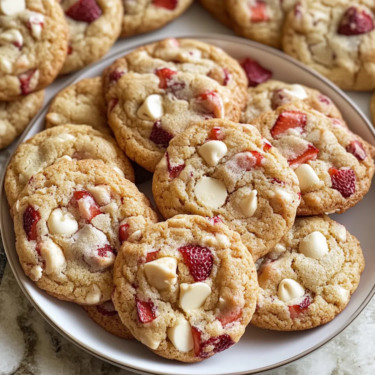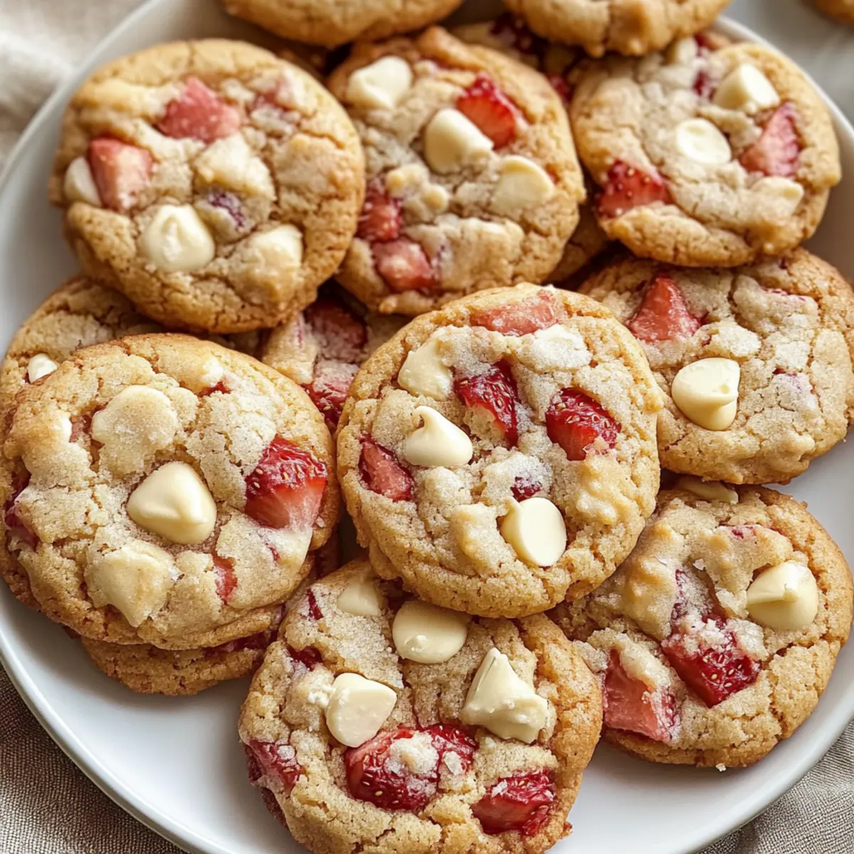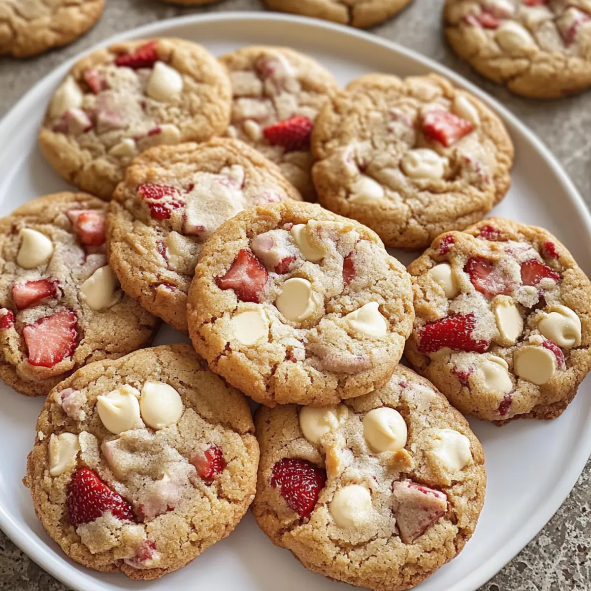 Es war an einem sonnigen Nachmittag, als ich in der Küche stand und die wunderbare Kombination aus Erdbeeren und Sahne in der Luft schwebte. Diese Erdbeeren und Sahne Kekse sind mehr als nur ein Snack; sie bringen die süßen Aromen des Sommers direkt auf den Tisch. Mit knackigen, gefriergetrockneten Erdbeeren und cremigen weißen Schokoladenstückchen bieten sie nicht nur einen fruchtigen Genuss, sondern sind auch superschnell in unter 30 Minuten zubereitet. Perfekt für jede warme Versammlung, sind diese Kekse ein echter Publikumsmagnet und ein Genuss für jeden Keks-Liebhaber. Bereit, den Ofen vorzuheizen und diesen verführerischen Genuss zu kreieren? Lass uns gemeinsam loslegen! Warum werden Sie dieses Rezept lieben? Einfachheit, die begeistert: Die Zubereitung dieser Kekse ist unkompliziert und benötigt keine speziellen Fähigkeiten – perfekt für jedermann. Fruchtige Frische: Die gefriergetrockneten Erdbeeren verleihen jedem Bissen einen intensiven Geschmack, der die sommerliche Stimmung einfängt. Schnell zubereitet: In unter 30 Minuten sind diese köstlichen Kekse servierbereit und ideal für unerwartete Gäste oder spontane Süßhunger-Attacken. Vielfältige Variationen: Experimentieren Sie mit verschiedenen Schokoladensorten oder Nüssen, um Ihre persönlichen Vorlieben zu treffen, und erweitern Sie Ihr Repertoire an Keksen mit verschiedenen Geschmäckern. Genuss für alle: Egal, ob Sie eine gemütliche Kaffeepause einlegen oder eine große Feier veranstalten, diese Kekse sind garantiert der Hit! Erdbeeren und Sahne Kekse Zutaten • Hinweis: Bereiten Sie sich auf eine köstliche Erfahrung mit diesen Erdbeeren und Sahne Keksen vor – perfekt für den Sommer! Für den Teig: Allzweckmehl – Gibt den Keksen Struktur; wiegen Sie es für beste Ergebnisse. Backpulver – Lässt die Kekse aufgehen; stellen Sie sicher, dass es frisch ist. Salz – Verstärkt den Geschmack und balanciert die Süße. Ungesalzene Butter – Sorgt für Reichhaltigkeit und Feuchtigkeit; zimmerwarm macht das Mischen einfacher. Zucker – Macht die Kekse süß und hilft bei der Struktur. Brauner Zucker – Fügt Feuchtigkeit und einen leichten Karamellgeschmack hinzu; gut festdrücken beim Messen. Vanilleextrakt – Verleiht Aroma und Geschmack; hebt den Keks-Geschmack hervor. Große Eier – Binden die Zutaten; zimmerwarme Eier ermöglichen ein gleichmäßiges Mischen. Weiße Schokoladenstückchen – Bringen Cremigkeit und Süße; sowohl Stückchen als auch gehackte Schokolade sind geeignet. Gefriergetrocknete Erdbeeren – Intensivieren den Erdbeergeschmack ohne zusätzliche Feuchtigkeit; frische oder gefrorene Erdbeeren sind nicht geeignet. Für die Aufbewahrung: Luftdichtes Behältnis – Halten Sie die Kekse frisch; bei Raumtemperatur bis zu einer Woche lagern oder für bis zu zwei Monate einfrieren. Schritt-für-Schritt-Anleitung für Erdbeeren und Sahne Kekse Step 1: Ofen vorheizen Heizen Sie Ihren Ofen auf 163°C (325°F) vor und legen Sie zwei große Backbleche mit Backpapier aus. Dies sorgt dafür, dass die Kekse gleichmäßig gebacken werden und nicht anhaften. Lassen Sie den Ofen während der nächsten Schritte vorheizen, um die perfekte Temperatur für das Backen Ihrer Erdbeeren und Sahne Kekse zu gewährleisten. Step 2: Trockene Zutaten vermengen In einer großen Schüssel das Allzweckmehl, das Backpulver und das Salz sorgfältig miteinander vermischen. Verwenden Sie einen Schneebesen, um die Zutaten gut zu kombinieren. Diese Mischung bildet die Basis der Kekse und sorgt dafür, dass sie die richtige Konsistenz bekommen. Stellen Sie die Schüssel beiseite, während Sie den Teig vorbereiten. Step 3: Butter und Zucker schlagen In einer Küchenmaschine die zimmerwarme ungesalzene Butter zusammen mit dem weißen und braunen Zucker auf hoher Stufe schlagen. Mischen Sie die Zutaten für etwa 3 Minuten, bis die Masse leicht und fluffig ist. Achten Sie darauf, die Seiten der Schüssel während des Mixens abzukratzen, um sicherzustellen, dass alle Zutaten gut vermischt sind und Ihre Erdbeeren und Sahne Kekse die perfekte Textur erhalten. Step 4: Vanille und Eier hinzufügen Fügen Sie den Vanilleextrakt hinzu und mixen Sie ihn gut unter die Butter-Zucker-Mischung. Geben Sie dann die großen Eier nacheinander hinzu und vermengen Sie alles gut, bis die Masse schön cremig ist. Achten Sie darauf, nach jedem Ei gründlich zu mixen, damit die Zutaten gleichmäßig verteilt sind und ein geschmackvoller Teig entsteht. Step 5: Trockene Zutaten einarbeiten Mischen Sie nun die zuvor vorbereitete Mehl-Mischung schrittweise unter die feuchten Zutaten. Rühren Sie nur so lange, bis alles gerade so vermischt ist. Vermeiden Sie es, den Teig zu übermixen, um die zarten Strukturen Ihrer Erdbeeren und Sahne Kekse zu bewahren. Step 6: Schokoladenstückchen und Erdbeeren falten Fügen Sie die weißen Schokoladenstückchen und die gefriergetrockneten Erdbeeren hinzu. Falten Sie diese vorsichtig in den Teig, bis sie gleichmäßig verteilt sind. Diese Mischung sorgt für einen wunderbaren fruchtigen Geschmack und das cremige Aroma in jedem Bissen Ihrer Kekse. Step 7: Teig portionieren Verwenden Sie einen Esslöffel, um gleichmäßige Portionen von etwa 3 Esslöffeln Teig auf die vorbereiteten Backbleche zu setzen. Achten Sie darauf, die Teigkugeln mindestens 5 cm voneinander entfernt zu platzieren, damit die Kekse beim Backen genügend Platz haben zu wachsen. Step 8: Kekse backen Backen Sie nun die Bleche nacheinander im vorgeheizten Ofen für 12-13 Minuten, oder bis die Ränder der Kekse goldbraun sind. Ihre Erdbeeren und Sahne Kekse sollten in der Mitte noch weich sein, um die perfekte Keksstruktur zu erzielen. Step 9: Kekse abkühlen lassen Lassen Sie die Kekse nach dem Backen für etwa 20 Minuten auf dem Backblech auskühlen, bevor Sie sie auf ein Kuchengitter übertragen. So können sie sich setzen und die Aromen können sich entfalten, während sie abkühlen. Dies bringt den ultimativen Genuss für Ihre Erdbeere