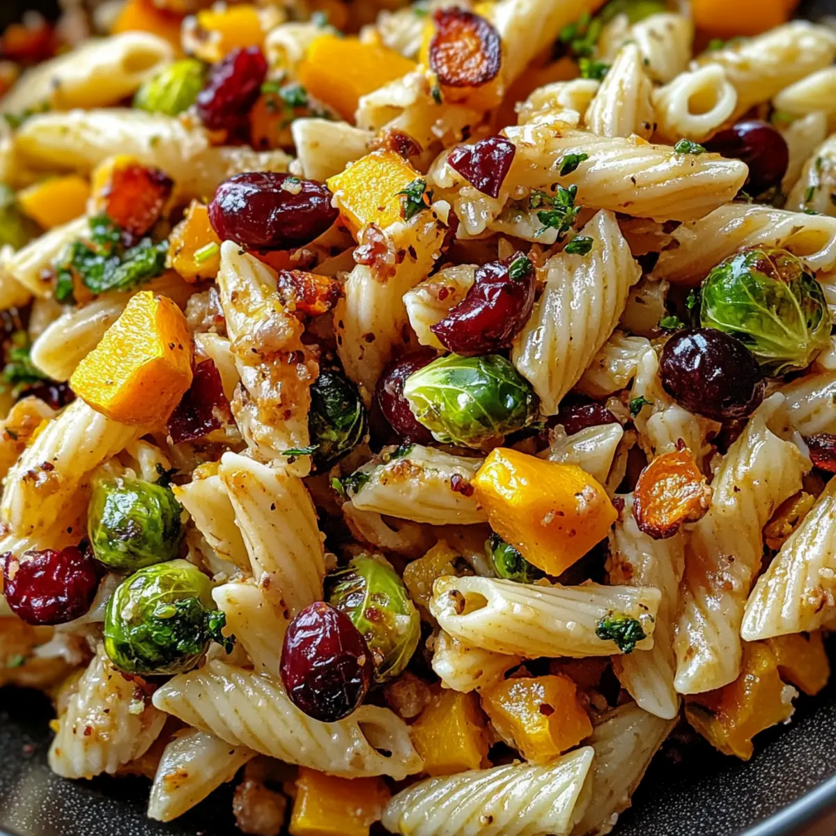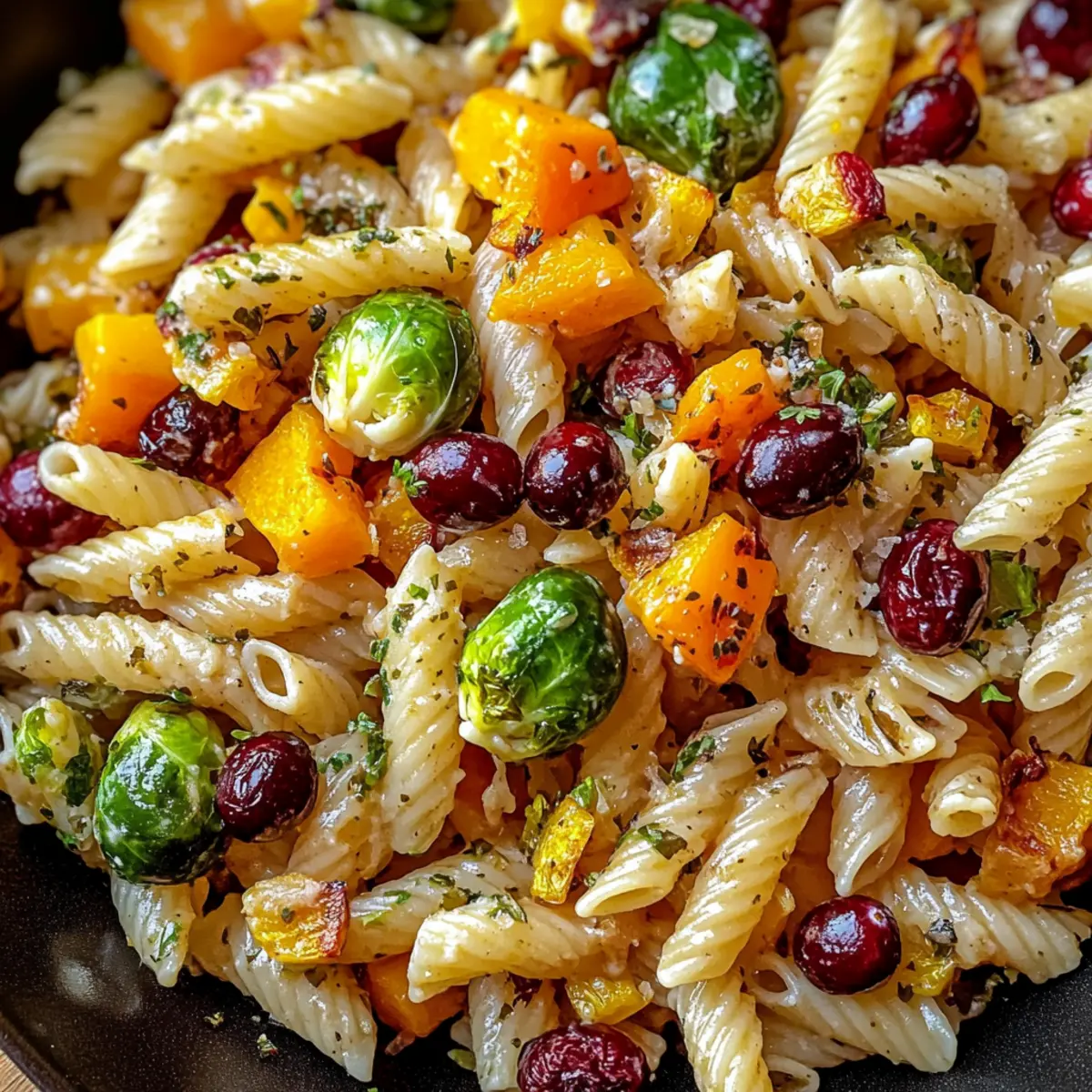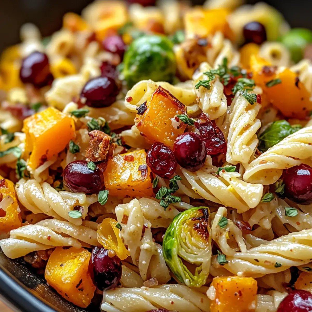 Die frische Herbstluft bringt nicht nur eine bunte Palette an Farben mit sich, sondern auch köstliche Aromen, die das Herzen erwärmen – genau wie dieser Ernte-Nudelsalat mit geröstetem Butternut-Kürbis und Cranberries. Dieses Gerichte ist nicht nur ein Fest für die Augen, sondern auch schnell und einfach zuzubereiten, ideal für gesellige Runden oder entspannte Familienessen. Der süße Kürbis harmoniert wunderbar mit dem herzhaften Crunch der Rosenkohl und den fruchtigen Noten der Cranberries, alles vereint durch ein spritziges Balsamico-Dressing. Egal, ob du ein leidenschaftlicher Koch oder einfach nur hungrig bist, dieser nahrhafte Salat wird dich begeistern. Bist du bereit, die herbstlichen Aromen auf deinem Tisch zum Leben zu erwecken? Warum wirst du diesen Ernte-Nudelsalat lieben? Vielfältige Aromen: Dieser Salat kombiniert herzhafte und süße Noten – der geröstete Butternut-Kürbis und die Cranberries verleihen eine besondere Geschmacksnuance. Schnelle Zubereitung: Mit einer einfachen Schritt-für-Schritt-Anleitung kannst du diesen erfrischenden Salat im Handumdrehen zaubern. Saisonale Zutaten: Dieser Rezept greift die lebendigen Aromen des Herbstes auf und macht ihn perfekt für die kühleren Monate. Beliebtes Gericht: Egal ob auf Partys oder als Beilage zum Hauptgericht, dieser Salat ist bei jedem beliebt. Flexibilität: Du kannst ihn leicht anpassen, indem du verschiedene Gemüsesorten hinzufügst oder ihn mit einem Bunter Kinder Nudelsalat kombinierst. Wohlfühl-Essen: Vollgepackt mit Nährstoffen, ist dieser Salat nicht nur lecker, sondern auch gesund – eine wahre Genussreise durch den Herbst! Ernte-Nudelsalat Zutaten Entdecke alle Zutaten für deinen köstlichen Ernte-Nudelsalat! Für die Pasta Pasta – Wähle eine Lieblingsform wie Rotini oder Schmetterlinge für die perfekte Textur. Für die Röstgemüse Butternut-Kürbis – Bringt Süße und Fülle; kann durch geröstete Süßkartoffeln ersetzt werden. Rosenkohl – Sorgt für einen herzhaften Crunch; bei Bedarf durch Kohl oder Grünkohl ersetzen. Für die Süße Getrocknete Cranberries – Fügen einen süßen und herzhaften Geschmack hinzu; alternativ können Rosinen oder Granatapfelkerne verwendet werden. Für das Dressing Balsamico-Dressing – Verbessert die Aromen; sowohl selbstgemachte als auch gekaufte Varianten sind hervorragend geeignet. Olivenöl – Zum Rösten des Gemüses und für zusätzlichen Geschmack; kann durch Avocadoöl substituiert werden. Salz & Pfeffer – Grundlegend für die Würze; nach Geschmack hinzufügen. Schritt-für-Schritt-Anleitung für Ernte-Nudelsalat mit Kürbis und Cranberries Step 1: Ofen vorheizen Heize den Ofen auf 200°C vor. Während der Ofen sich aufwärmt, kannst du die Zutaten für den Ernte-Nudelsalat vorbereiten. Achte darauf, alle benötigten Utensilien bereit zu haben, darunter ein Backblech und ein großes Schneidebrett, um das Gemüse zuzubereiten. Step 2: Gemüse vorbereiten Schäle den Butternut-Kürbis und schneide ihn in kleine Würfel. Wasche die Rosenkohl und halbiere sie. Gib das geschnittene Gemüse in eine große Schüssel und vermenge es mit Olivenöl, Salz und Pfeffer, sodass alles gleichmäßig bedeckt ist. Das Gemüse sollte glänzend und gut gewürzt aussehen. Step 3: Gemüse rösten Verteile das vorbereitete Gemüse gleichmäßig auf dem Backblech und schiebe es in den vorgeheizten Ofen. Röste das Gemüse für etwa 25–30 Minuten, bis der Kürbis zart und leicht karamellisiert ist. Rühre das Gemüse nach der Hälfte der Zeit um, um ein gleichmäßiges Garen zu gewährleisten. Step 4: Pasta kochen Während das Gemüse röstet, koche die Pasta nach Packungsanweisung in einem großen Topf mit Salzwasser. Achte darauf, die Pasta al dente zu garen, damit sie im Salat einen guten Biss hat. Nach dem Kochen, die Pasta abgießen und kurz abkühlen lassen. Step 5: Zutaten kombinieren In einer großen Schüssel vermischst du nun die gerösteten Gemüse mit der abgekühlten Pasta. Füge die getrockneten Cranberries hinzu und gieße das Balsamico-Dressing darüber. Rühre alles vorsichtig um, bis alle Zutaten gut miteinander vermengt sind und der Ernte-Nudelsalat appetitlich aussieht. Step 6: Servieren Der Ernte-Nudelsalat kann warm serviert oder für eine erfrischende kalte Variante im Kühlschrank gekühlt werden. Achte darauf, den Salat vor dem Servieren gut durchzuziehen, damit die Aromen sich entfalten können. Nutze ein schönes Serviergeschirr, um dein köstliches Herbstgericht ansprechend zu präsentieren. Meal Prep für deinen Ernte-Nudelsalat Du bist auf der Suche nach einem köstlichen Gericht, das sich hervorragend für die Vorbereitung eignet? Der Ernte-Nudelsalat kann bis zu 3 Tage im Voraus zubereitet werden, sodass du an hektischen Tagen Zeit sparst. Röste das Gemüse (Butternut-Kürbis und Rosenkohl) vor und lagere es in einem luftdichten Behälter im Kühlschrank, damit es frische Aromen behält. Auch die Pasta kannst du bereits kochen und abkühlen lassen, um sie später problemlos zu integrieren. Am Serviertag mischst du einfach das Gemüse, die Pasta, getrocknete Cranberries und das Balsamico-Dressing miteinander. So hast du ganz einfach einen gesunden, schmackhaften Salat, der genauso lecker bleibt wie frisch zubereitet! Variationen & Alternativen für Ernte-Nudelsalat Gestalte deinen Ernte-Nudelsalat ganz nach deinem Geschmack und entdecke die vielfältigen Möglichkeiten! Glutenfrei: Ersetze die Pasta durch Quinoa für eine nahrhafte, glutenfreie Option. Diese Körner bieten einen tollen Biss und sind ebenfalls proteinreich. Proteinreich: Füge gegrilltes Hähnchen oder Kichererbsen hinzu, um den Salat sättigender zu machen. Das bringt eine herzhafte Note und macht das Gericht zu einer vollständigen Mahlzeit. Cremig: Verwende ein cremiges Dressing wie Joghurt- oder Senfdressing, um einen anderen Geschmack zu erzielen. Dieser Twist verleiht dem Salat eine neue Dimension. Nussig: Streue gehackte Walnüsse oder Pekannüsse d
