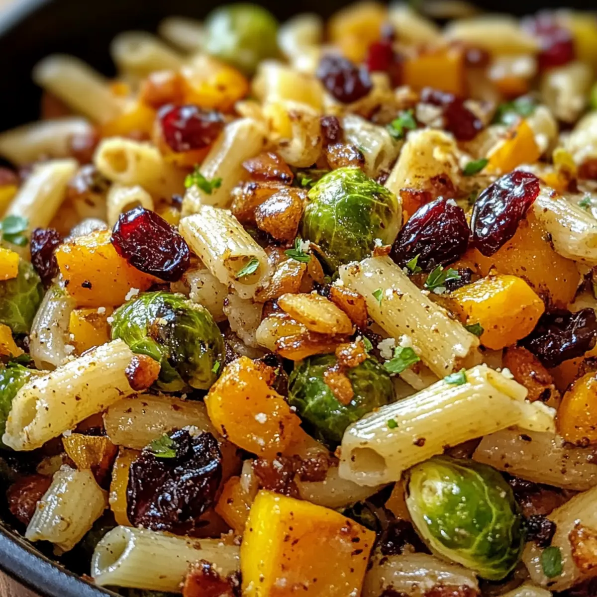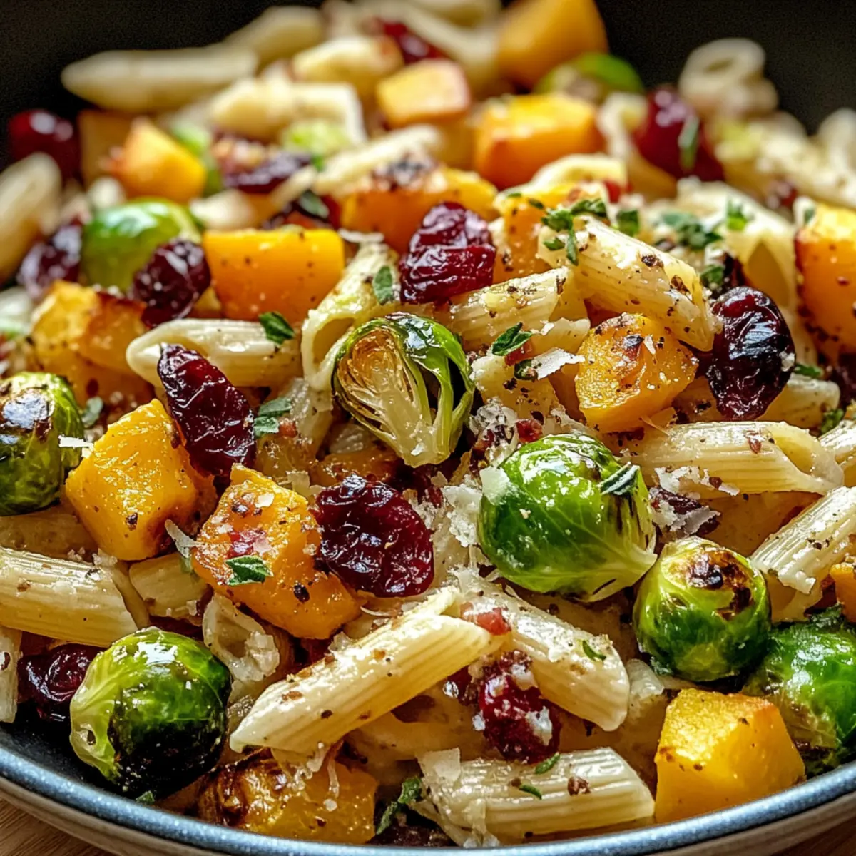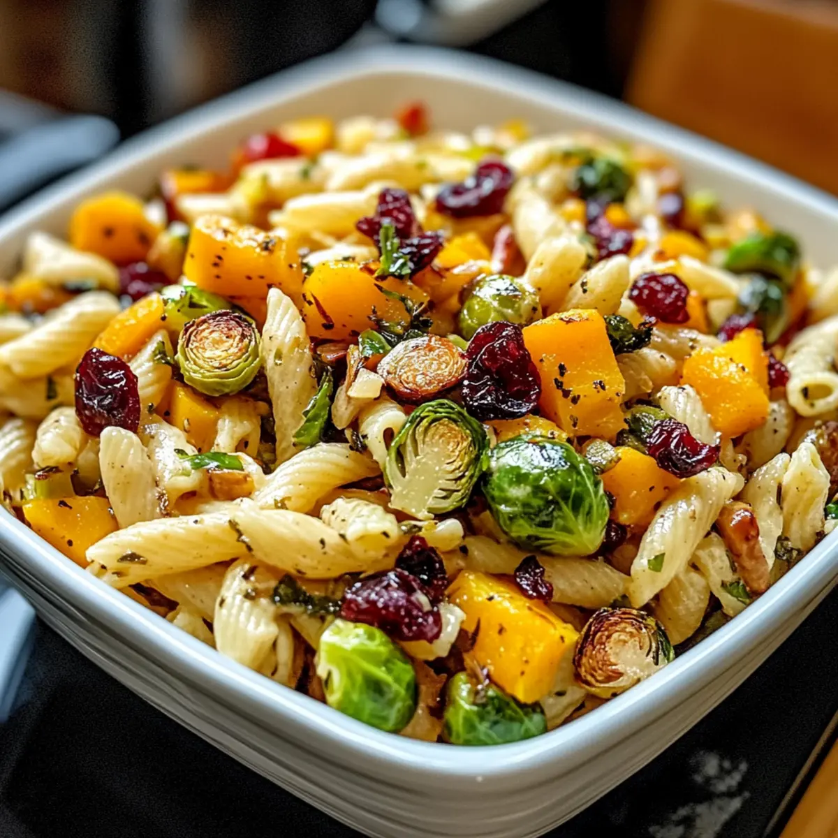 Dieser Ernte Pasta Salat vereint herbstliche Aromen aus geröstetem Butternut-Kürbis und Rosenkohl, perfekt für gesellige Zusammenkünfte.