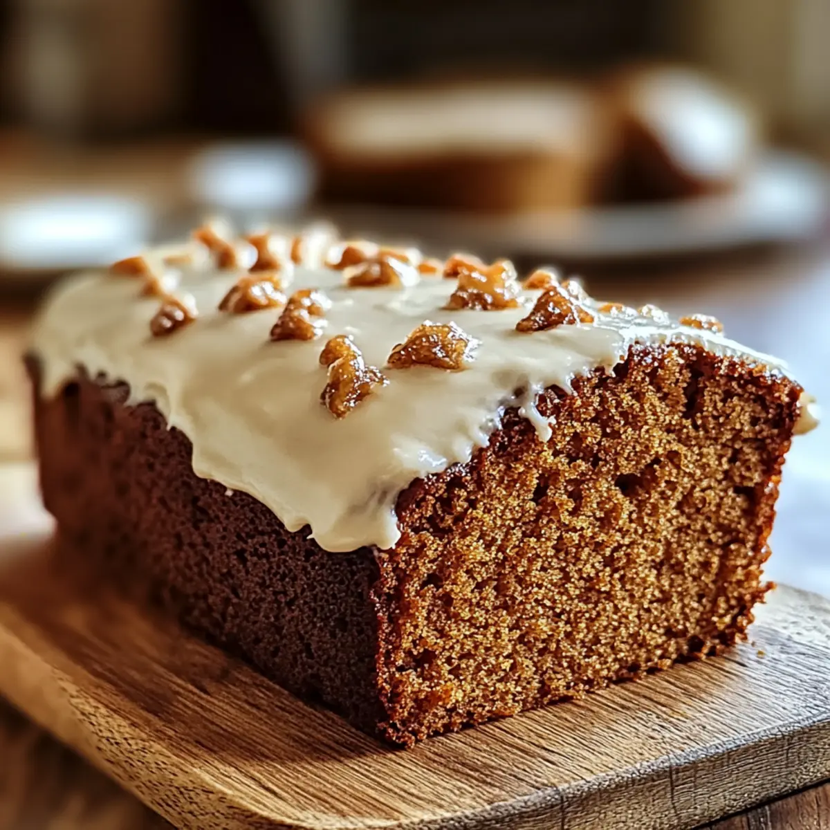 Sobald der Kuchen vollständig abgekühlt ist, verteile die Frischkäsetopierung großzügig auf der Oberseite des Kuchens. Verwende einen Spachtel oder ein Messer, um die Glasur gleichmäßig zu verteilen und ihm ein schönes Finish zu verleihen. Der feuchte Ingwerbrotlaib Kuchen ist jetzt bereit, deinen Gästen präsentiert zu werden!