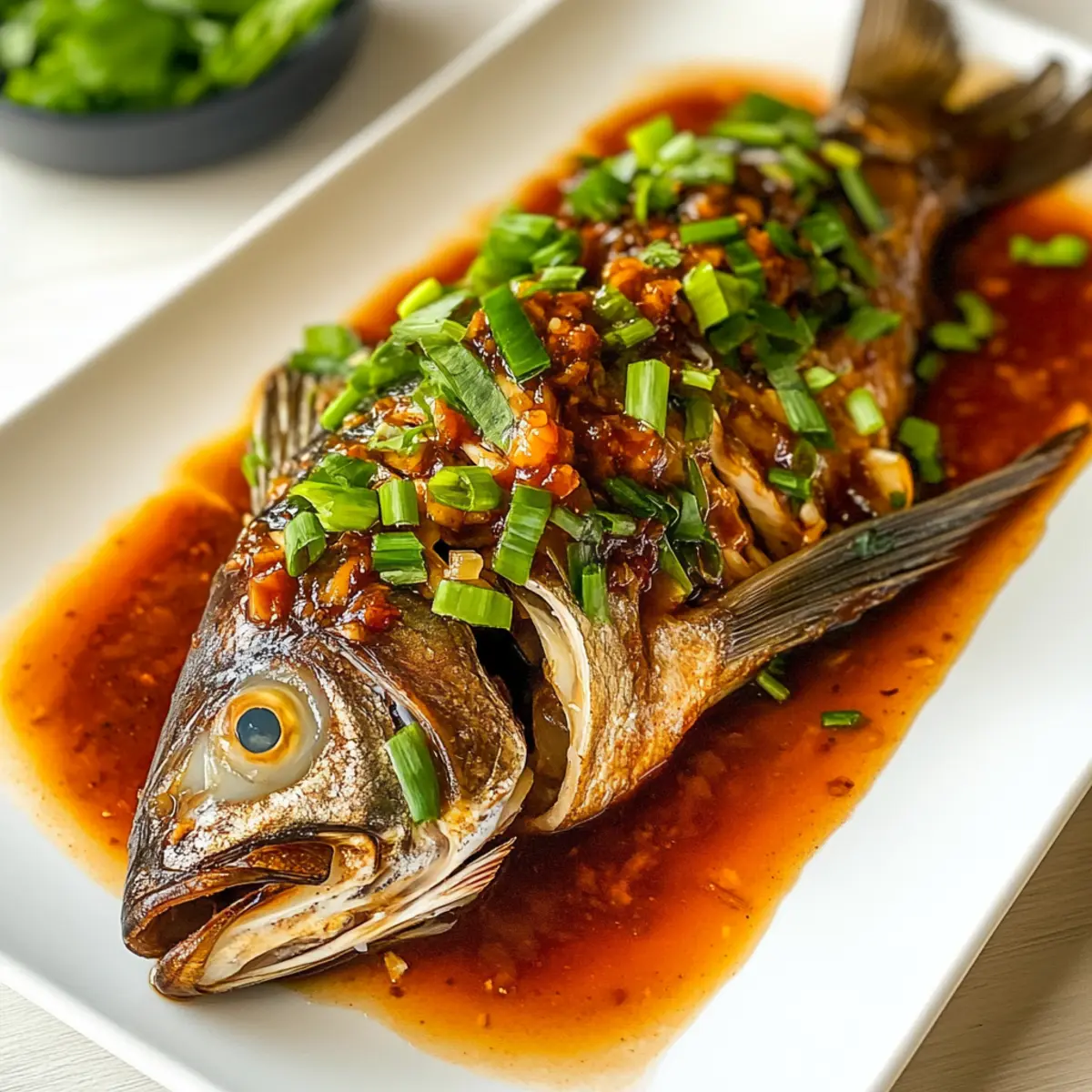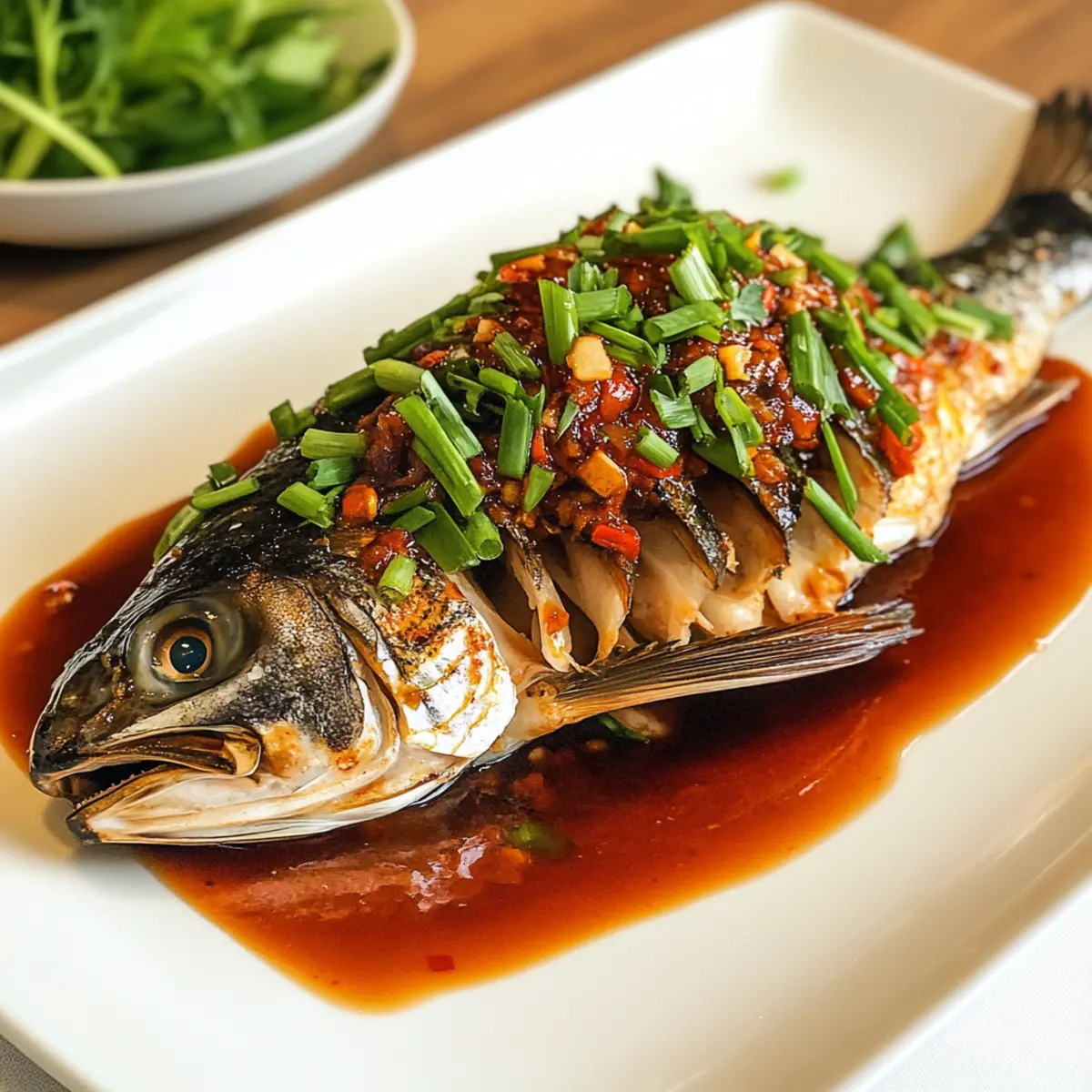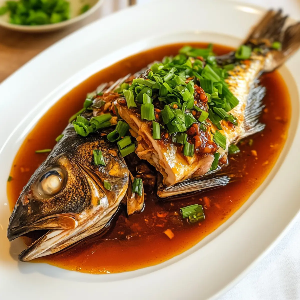 Als ich neulich in der Küche stand und mit frischen Zutaten experimentierte, kam die Idee für das perfekte Gericht: Fisch mit Chili-Bohnensauce. Diese traditionelle Speise ist nicht nur ein wahrer Genuss für die Sinne, sondern auch einfach und schnell zuzubereiten. Die zarte Textur eines gedämpften ganzen Fisches, sei es Tilapia oder Seebarsch, vereint sich mit der würzigen Note der Chili-Bohnensauce, um ein köstliches Geschmackserlebnis zu bieten. Ob für ein leichtes Abendessen oder festliche Anlässe, dieses Rezept bringt den Zauber der chinesischen Küche auf deinen Esstisch. Und das Beste daran? Es ist ein echter Blickfang, der sowohl deine Familie als auch Gäste beeindrucken wird. Bist du bereit, dieses geschmackvolle Abenteuer zu wagen? Warum wirst du dieses Rezept lieben? Einfachheit: Die Zubereitung ist kinderleicht und benötigt nur wenige Schritte, wodurch du auch als Anfänger im Kochen sofort loslegen kannst. Aromatische Explosion: Die Kombination aus frischem Fisch und der würzigen Chili-Bohnensauce sorgt für ein wahres Geschmackserlebnis, das deine Geschmacksknospen verwöhnt! Vielseitigkeit: Du kannst verschiedene Fischsorten wie Snapper oder andere weiße Fische ausprobieren und sogar Gemüse wie Pak Choi hinzufügen. Schnell zubereitet: Innerhalb von nur 30 Minuten ist dieses köstliche Gericht fertig, ideal für ein schnelles Abendessen nach einem langen Tag. Festliche Präsentation: Mit der beeindruckenden Optik dieses Gerichts hebst du jede Feier auf ein neues Level. Es eignet sich perfekt als Hauptgericht für besondere Anlässe, sei es das chinesische Neujahr oder ein Familienessen. Gesund und nahrhaft: Neben dem himmlischen Geschmack ist dieser Fisch auch gesund, kalorienarm und proteinreich, was ihn zu einer hervorragenden Wahl für jede Mahlzeit macht. Fisch mit Chili-Bohnensauce Zutaten • Hol dir die besten Zutaten für ein unvergessliches Geschmackserlebnis. Für den Fisch Ganze Tilapia oder Seebarsch – Hauptprotein, das sich hervorragend für das Dämpfen eignet; kann durch andere feste Weißfische wie Snapper oder Zander ersetzt werden. Salz – Zum Würzen; nach Geschmack anpassen. Shaoxing Wein – Fügt Tiefe hinzu; kann durch trockenen Sherry ersetzt werden. Für die Sauce Kochöl – Zum Anbraten der Aromaten; jedes neutrale Öl kann verwendet werden. Grüne Zwiebeln – Sorgt für Frische; austauschbar mit Schalotten oder Lauch. Knoblauch – Für aromatischen Geschmack; frisch empfohlen, aber Knoblauchpulver geht auch in der Not. Getrocknete Chilischoten – Für Schärfe und Geschmack; Menge je nach Vorliebe anpassen. Ingwer – Bringt Wärme; frischer Ingwer ist ideal, während pulverisierter Ingwer einen anderen Geschmack hat. Chili-Bohnensauce (Doubanjiang) – Hauptgeschmacksträger der Sauce; kann durch eine andere Chili-Paste ersetzt werden. Helle Sojasauce – Fügt Salzgehalt und Umami hinzu; kann durch natriumarme Sojasauce ersetzt werden. Dunkle Sojasauce – Für zusätzliche Tiefe und Farbe; optional, aber empfehlenswert für den Geschmack. Chinesischer schwarzer Essig – Für Säure; kann durch Balsamico-Essig ersetzt werden. Zucker – Balanciert das Gericht; nach Bedarf anpassen oder durch einen Zuckerersatz ersetzen. Wasser – Zum Verdünnen der Sauce. Mit diesen Zutaten bist du bestens vorbereitet, um das köstliche Fisch mit Chili-Bohnensauce zuzubereiten! Schritt-für-Schritt-Anleitung für Fisch mit Chili-Bohnensauce Step 1: Sauce vorbereiten In einer Schüssel vermische die Chili-Bohnensauce, die helle Sojasauce, die dunkle Sojasauce, den Shaoxing Wein, den schwarzen Essig, den Zucker und das Wasser. Rühre kräftig um, bis alle Zutaten gut miteinander verbunden sind. Diese würzige Mischung dient als Grundlage für die aromatische Sauce, die deinen Fisch mit Chili-Bohnensauce verfeinern wird. Step 2: Fisch marinieren Nimm den ganzen Fisch (Tilapia oder Seebarsch) und tupfe ihn mit Küchenpapier trocken. Reibe ihn großzügig mit Salz ein und gieße den Shaoxing Wein darüber. Lasse den Fisch für etwa 15 Minuten marinieren, damit er Geschmack aufnimmt. Währenddessen kannst du dich bereits auf die nächsten Schritte vorbereiten und die Dämpfstation einrichten. Step 3: Fisch dämpfen Setze derweil einen Dampfgarer auf den Herd und bringe das Wasser zum Kochen. Lege den marinierten Fisch auf einen hitzebeständigen Teller oder in den Dämpfkorb und platziere diesen in den Dampfgarer. Decke den Topf ab und dämpfe den Fisch bei hoher Hitze für 5-10 Minuten, bis er opak ist und sich leicht mit einer Gabel zerteilen lässt. Step 4: Aromaten anbraten Erhitze in einer Pfanne bei mittlerer bis hoher Temperatur etwas Öl. Gib den gehackten Knoblauch, den geriebenen Ingwer, die grünen Zwiebeln und die getrockneten Chilischoten hinzu. Brate die Mischung unter ständigem Rühren an, bis sie aromatisch ist und die Zwiebeln leicht transparent werden. Achte darauf, den Knoblauch nicht zu verbrennen, da er sonst bitter wird. Step 5: Sauce kombinieren Gieße die vorbereitete Sauce in die Pfanne zu den aromatischen Zutaten und lasse sie unter ständigem Rühren für einige Minuten köcheln, bis die Sauce leicht eingedickt ist. Achte darauf, die Aromen gut zu vermengen, damit dein Fisch mit Chili-Bohnensauce ein intensives Geschmackserlebnis erhält. Step 6: Servieren Sobald der Fisch gedämpft und die Sauce zubereitet ist, nimm den Fisch vorsichtig vom Dampfgarer und platziere ihn auf einer Servierplatte. Übergieße ihn großzügig mit der Sauce und garniere das Gericht mit zusätzlichen grünen Zwiebeln für mehr Frische. Serviere das Gericht sofort, um die zarten Aromen und die reichhaltige Textur des Fischs mit Chili-Bohnensauce optimal zu genießen. Zeit sparen mit der Vorbereitung deines Fischs mit Chili-Bohnensauce Die Zubereitung des Fischs mit Chili-Bohnensauce eignet sich hervorragend für Meal Prep und kann dir wertvolle Zeit in der Woche sparen! Du kannst den ganzen Fisch bereits bis zu 24 Stunden vor dem Kochen mari