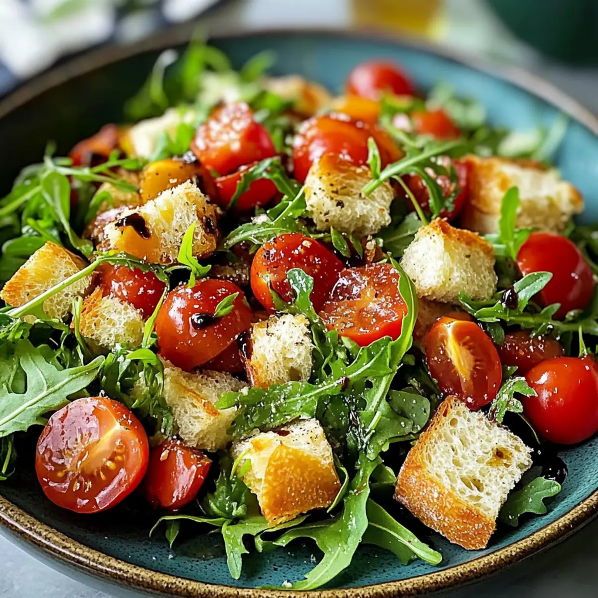 6. Rucola, Tomaten und Ciabatta-Würfel in einer Schüssel kombinieren und Dressing hinzufügen.