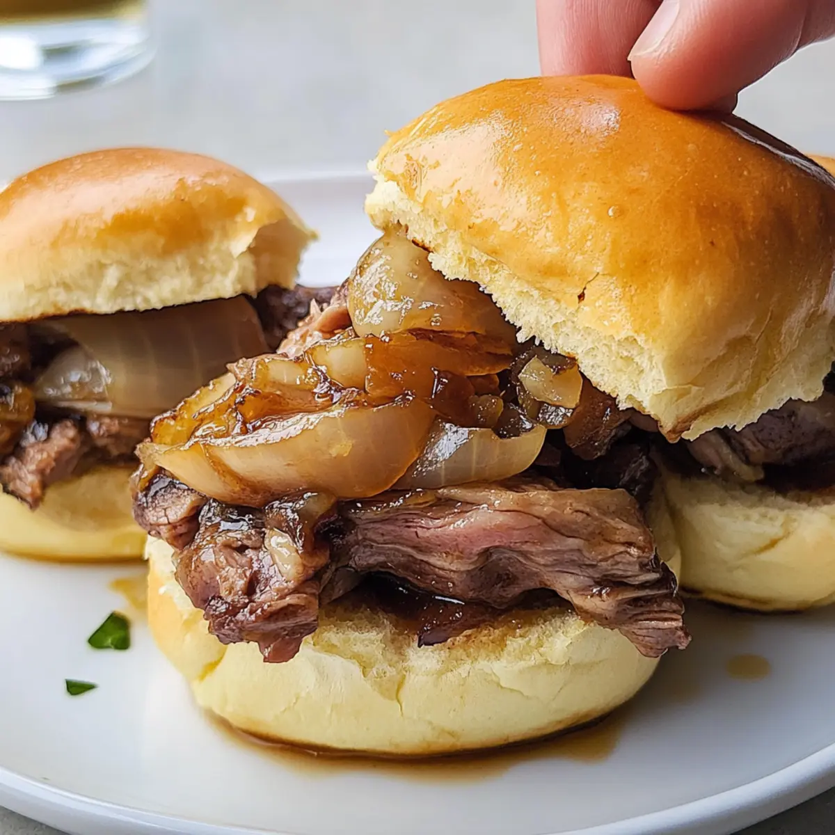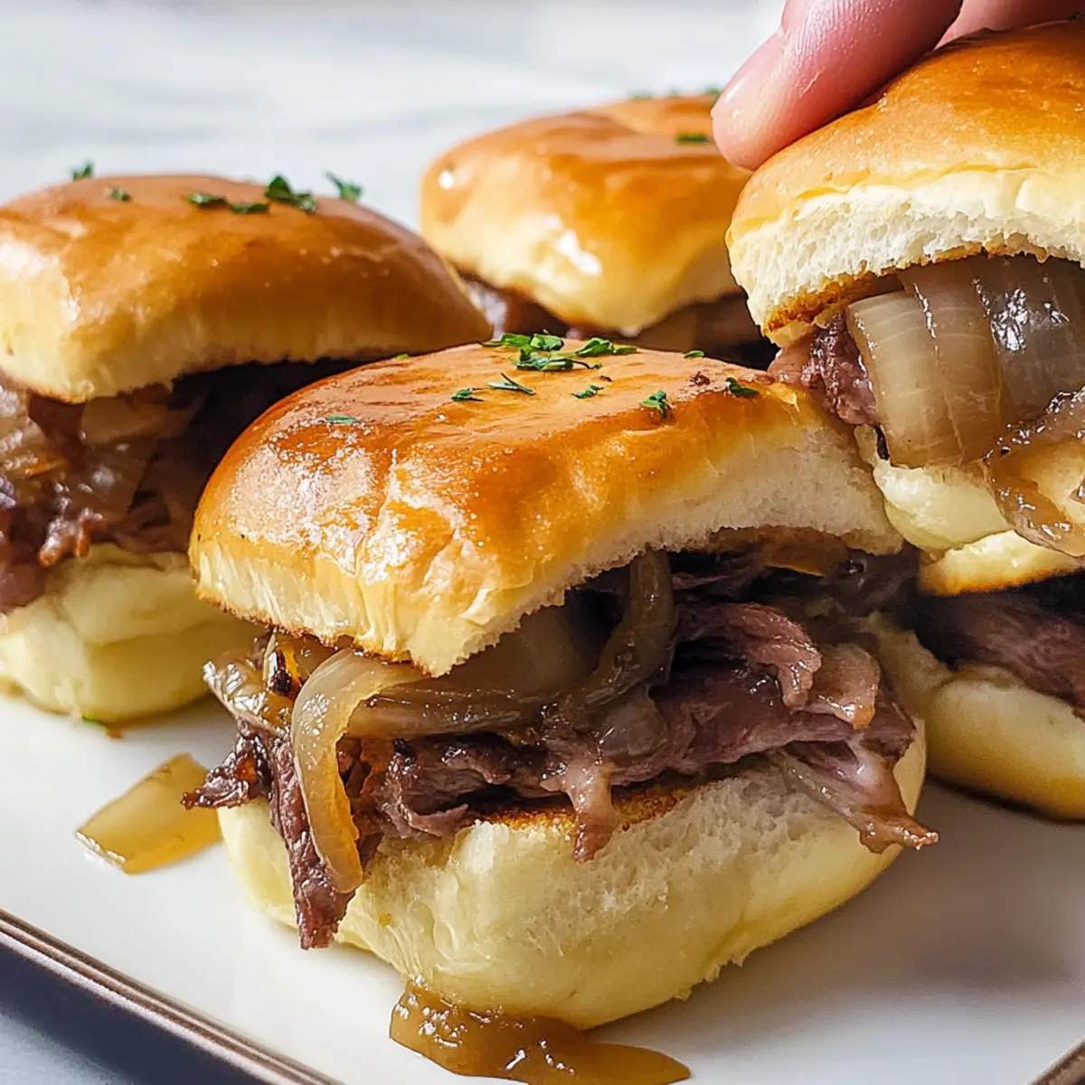 „Ich kann es kaum erwarten, unsere nächste große Versammlung zu feiern – und die perfekten Snacks dafür? Französische Dip-Schieber! Diese kleinen, herzhaften Leckerbissen vereinen alles, was wir an einem klassischen Sandwich lieben: zartes Rinderfilet, schmelzende Provolone-Käse und süße, karamellisierte Zwiebeln, alles in einem handlichen Brötchen. Diese französischen Dip-Schieber sind nicht nur unglaublich einfach zuzubereiten – sie sind auch in weniger als einer Stunde servierbereit! Perfekt für jeden Spieltag oder jede Feier, bei denen man den Geschmack von zuckerhaltigem Fast Food hinter sich lassen möchte. Glauben Sie mir, diese herzhaften Häppchen werden zum Star Ihres Buffets! Neugierig, wie Sie diese köstlichen Häppchen selbst zaubern können? Lassen Sie uns gleich mit dem Rezept beginnen!“ Warum werden Sie diese Schieber lieben? Einfache Zubereitung: Mit nur wenigen Schritten und alltäglichen Zutaten sind diese Französischen Dip-Schieber im Handumdrehen zubereitet. Perfekt, wenn Sie wenig Zeit haben! Herzhafter Geschmack: Die Kombination aus zartem Rinderfilet, cremigem Käse und süßen Zwiebeln sorgt für einen intensiven und befriedigenden Genuss, der Ihre Gäste begeistern wird. Vielseitig einsetzbar: Experimentieren Sie mit verschiedenen Fleischsorten oder Käsesorten für ganz individuelle Geschmäcker; probieren Sie beispielsweise Pulled Pork oder würzigen Cheddar! Perfekt für jedes Event: Egal, ob es sich um einen entspannten Filmabend handelt oder um eine große Feier, diese Schieber sind immer ein Hit! Lange Frische: Sie können die Reste problemlos aufbewahren – genau das Richtige für die nächsten Tage. Genießen Sie diese Wunderschnäppchen, wann immer Sie Lust darauf haben! Französische Dip-Schieber Zutaten Für die Füllung: Ungesalzene Butter – sorgt für reichhaltigen Geschmack, kann bei Bedarf durch Margarine ersetzt werden. Große gelbe Zwiebel – verleiht beim Karamellisieren Süße und Tiefe; nutzen Sie süße Zwiebeln wie Vidalia für einen milderen Geschmack. Thymianzweige – verstärken das herzhafte Aroma; bei Abwesenheit frischen Thymian durch eine Prise getrockneten Thymian ersetzen. Küchensalz – unerlässlich zum Würzen; kann durch Meersalz ersetzt werden. Frisch gemahlener schwarzer Pfeffer – für zusätzliche Würze; weißer Pfeffer kann als Alternative genutzt werden. Slider-Brötchen – dienen als Basis für die Schieber; Brioche- oder Vollkornbrötchen sind gute Alternativen. Dünn geschnittenes Rinderfilet – die Hauptproteinquelle; kann durch Truthahn oder Hühnchen für eine leichtere Version ersetzt werden. Provolone-Käse – schmilzt perfekt und sorgt für eine cremige Textur; Mozzarella ist ebenfalls eine geeignete Alternative. Frisch gehackte Petersilie – sorgt für Garnitur und Frische, kann jedoch weggelassen werden. Knoblauchpulver – fügt Aroma und Geschmack hinzu; kann durch frisch gehackten Knoblauch für einen intensiveren Geschmack ersetzt werden. Eine Knoblauchzehe – frischer Knoblauch verstärkt den Geschmack; Menge verringern, wenn Knoblauchpulver verwendet wird. Niedriger Natrium-Rinderbrühe – bildet die Dip-Sauce; Hühnerbrühe kann für eine leichtere Variante verwendet werden. Worcestershire-Sauce – sorgt für eine tiefere Umami-Note; Sojasauce kann als Ersatz dienen. Schritt-für-Schritt-Anleitung für Französische Dip-Schieber Step 1: Ofen vorheizen Heizen Sie den Ofen auf 175 °C (350 °F) vor. Dies ist der ideale Temperaturbereich, um die französischen Dip-Schieber später gleichmäßig zu erhitzen und den Käse perfekt schmelzen zu lassen. Während der Ofen vorheizt, können Sie vorbereitet werden und die anderen Schritte im Rezept durchführen. Step 2: Zwiebeln karamellisieren Schmelzen Sie in einer großen Pfanne bei mittlerer Hitze 2 Esslöffel ungesalzene Butter. Fügen Sie die in Scheiben geschnittenen Zwiebeln und die Thymianzweige hinzu. Würzen Sie großzügig mit Küchensalz und frisch gemahlenem schwarzen Pfeffer. Kochen Sie die Mischung 30–40 Minuten lang, bis die Zwiebeln goldbraun und süß sind. Entfernen Sie die Thymianzweige und stellen Sie die Pfanne beiseite. Step 3: Schieber zusammenstellen Legen Sie die unteren Hälften der Slider-Brötchen auf ein Backblech. Belegen Sie sie großzügig mit der dünn geschnittenen Rinderfilet und fügen Sie die karamellisierten Zwiebeln sowie die Provolone-Käse-Scheiben hinzu. Decken Sie die Schieber mit den oberen Hälften der Brötchen ab und bereiten Sie sich darauf vor, die aromatischen Häppchen einzubacken. Step 4: Butter-Mischung vorbereiten Smeltzen Sie 2 Esslöffel ungesalzene Butter und bestreichen Sie die Oberseite der Brötchen gleichmäßig damit. Streuen Sie frische gehackte Petersilie, Knoblauchpulver und eine Prise Küchensalz darüber, um den Schiebern einen zusätzlichen Geschmacksboost zu verleihen. Diese aromatische Butter-Mischung wird den Schiebern helfen, während des Backens Goldbraun zu werden. Step 5: Backen Schieben Sie das Backblech mit den Schiebern in den vorgeheizten Ofen und backen Sie sie 10–15 Minuten lang. Achten Sie darauf, dass der Käse geschmolzen und die Brötchen goldbraun sind. Die köstlichen Aromen werden Ihre Küche erfüllen und die Vorfreude auf die Französischen Dip-Schieber steigern. Step 6: Jus zubereiten In der gleichen Pfanne, die Sie zum Karamellisieren der Zwiebeln verwendet haben, schmelzen Sie erneut 2 Esslöffel ungesalzene Butter bei mittlerer Hitze. Fügen Sie eine zerdrückte Knoblauchzehe, die Rinderbrühe, Worcestershire-Sauce und die restlichen Thymianzweige hinzu. Lassen Sie die Mischung 10 Minuten lang köcheln, bis sie gut durchgezogen ist und eine herrliche Aromatik entwickelt hat. Step 7: Servieren Nehmen Sie die Französischen Dip-Schieber aus dem Ofen und servieren Sie sie warm auf einem großen Teller. Stellen Sie die aromatische Jus in einer Schüssel dazu, damit jeder Schieber nach Belieben darin eintauchen kann. Diese herzhaften Sna