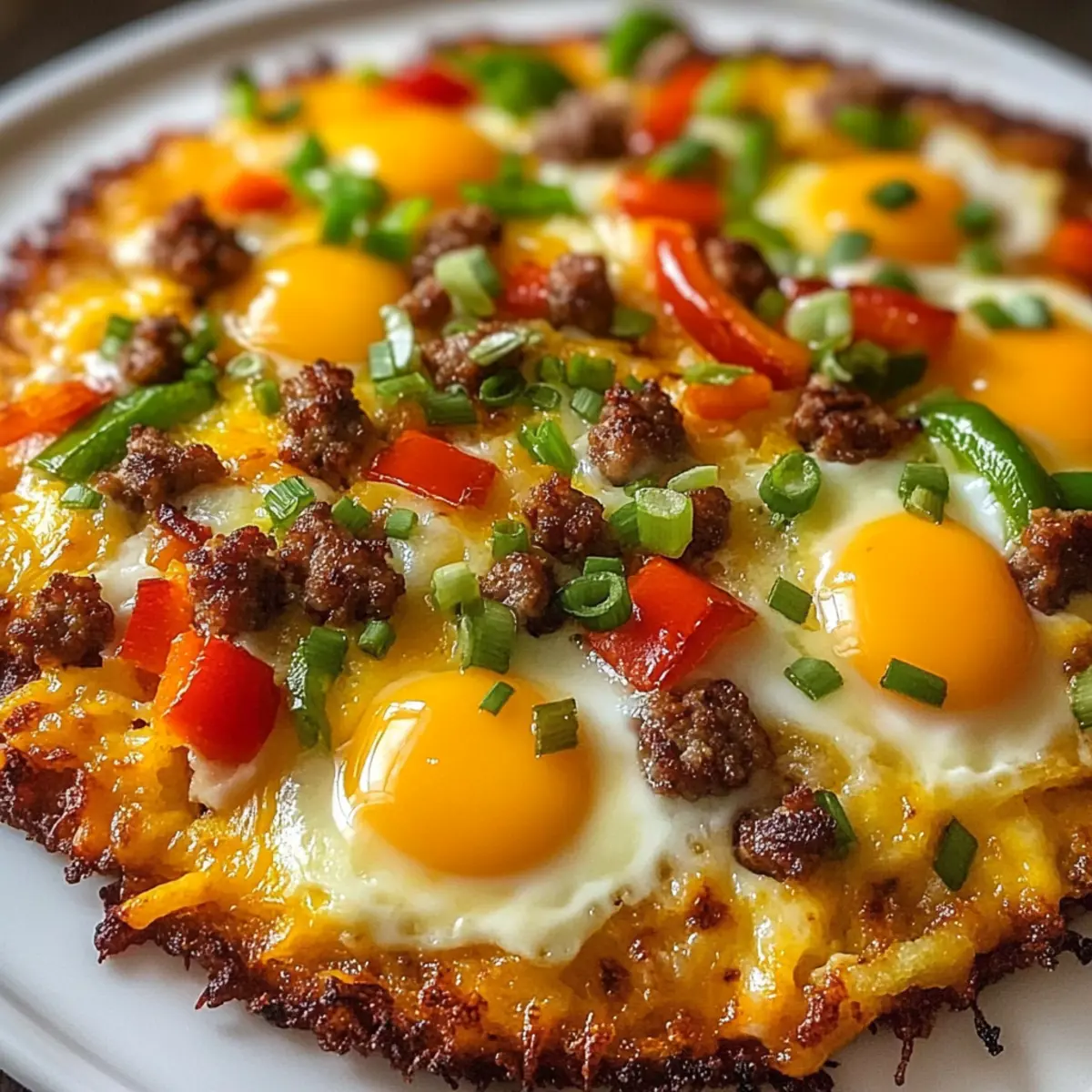 Eine goldbraune und knusprige Kruste, die nach dem ersten Bissen einfach begeistert: Das ist meine Frühstücks-Pizza mit Rösti-Boden! Diese kreative Variante des klassischen Frühstücks vereint die geliebten Aromen von Eiern, Käse und würzigem Gemüse auf einem herzhaften Hash-Brown-Boden. Neben ihrer schnellen Zubereitung ist sie vollkommen anpassbar – egal ob du Fleischtiger oder Vegetarier bist, hier findet jeder seinen perfekten Belag. Ideal für ein geselliges Brunch mit Freunden oder als herzhaftes Frühstück an einem entspannten Sonntag. Welche Variationen wirst du auf deine Pizza bringen? Warum wirst du diese Frühstücks-Pizza lieben? Einfachheit: Die Zubereitung ist unkompliziert und erfordert keine speziellen Kochkünste – perfekt für jeden, der ein schnelles, leckeres Frühstück möchte. Vielfalt: Mit unzähligen Variationen kannst du diese Frühstücks-Pizza ganz nach deinem Geschmack gestalten. Füge Gemüse, verschiedene Käsesorten oder Fleischalternativen hinzu, um deinen eigenen Twist zu kreieren! Herzhafter Genuss: Der knusprige Rösti-Boden mit den cremigen Eiern und würzigen Toppings macht jede Biss zu einem Genuss. Geselliges Essen: Ideal für Brunch mit Freunden oder für ein entspanntes Familienfrühstück – sie wird garantiert bei jedem beliebt sein! Zeitersparnis: Diese Frühstücks-Pizza lässt sich im Handumdrehen vorbereiten, sodass du mehr Zeit mit deinen Lieben verbringen kannst. Kombiniere sie mit einem erfrischenden Salat oder deinem Lieblingsgetränk für ein rundum gelungenes Frühstück! Frühstücks-Pizza Rösti-Boden Zutaten • Diese vielseitige Frühstücks-Pizza Rösti-Boden ist eine kreative und köstliche Art, den Tag zu beginnen! Für den Boden Gefrorene geriebene Rösti – Sorgt für die knusprige Basis; unbedingt vollständig auftauen und gut ausdrücken. Ungesalzene Butter – Verleiht dem Boden Reichtum und hilft beim Bräunen; klärende Butter sorgt für extra Knusprigkeit. Salz – Betont den Geschmack und optimiert die Aromen. Schwarzer Pfeffer – Frisch gemahlen bietet das beste Aroma. Für die Beläge Geriebener Cheddar-Käse – Bietet Cremigkeit und einen würzigen Geschmack; kann durch Mozzarella oder eine pflanzliche Alternative für vegetarische Variationen ersetzt werden. Gekochte und zerbröselte Frühstückswurst oder Speck – Fügt Protein und eine herzhafte Tiefe hinzu; kann durch pflanzliche Wurst oder ganz weggelassen werden, um eine vegetarische Option zu kreieren. Würfelige Paprika – Bringt Süße und Farbe; ersetzt durch Pilze oder Spinat für zusätzliche Nährstoffe. Gehackte Frühlingszwiebeln – Fügt Frische und einen milden Zwiebelgeschmack hinzu; können durch Schalotten ersetzt oder nach Geschmack weggelassen werden. Große Eier – Servieren als proteinreiches Topping, das beim Backen eine cremige Textur erzeugt; gleichmäßige Vertiefungen für ein einheitliches Garen sorgen. Paprika – Verleiht Farbe und Geschmack; kann durch Chili-Pulver für mehr Schärfe ersetzt werden. Salz und Pfeffer – Nach Geschmack anpassen. Schritt-für-Schritt-Anleitung für Frühstücks-Pizza Rösti-Boden Step 1: Ofen vorheizen und Pfanne vorbereiten Heize den Ofen auf 220 °C (425 °F) vor. Während der Ofen aufheizt, füge etwas ungesalzene Butter oder Öl in eine 30 cm große Pfanne oder Pizzapfanne hinzu und verteile es gleichmäßig, um ein Anhaften zu verhindern. Das ist wichtig, damit der Boden der Frühstücks-Pizza Rösti-Boden später knusprig wird. Step 2: Rösti-Boden vorbereiten Gib die aufgetauten geriebenen Rösti in eine große Schüssel und vermische sie gründlich mit geschmolzener Butter, Salz und frisch gemahlenem Pfeffer. Achte darauf, dass die Rösti gleichmäßig beschichtet sind, damit sie beim Backen gut zusammenhalten und eine aromatische Basis für deine Frühstücks-Pizza Rösti-Boden bilden. Step 3: Boden formen Drücke die Rösti-Mischung gleichmäßig in die vorbereitete Pfanne. Achte darauf, dass die Masse einen leicht erhöhten Rand bildet, um die Toppings später gut zu halten. Glätte die Oberfläche mit einem Spatel, um sicherzustellen, dass die Temperatur gleichmäßig verteilt wird, was zu einer tollen Knusprigkeit führt. Step 4: Rösti-Boden backen Backe den Rösti-Boden im vorgeheizten Ofen für 20–25 Minuten, bis er goldbraun und knusprig ist. Behalte ihn im Auge, um sicherzustellen, dass er nicht zu dunkel wird. Ein perfekt gebackener Boden hat eine schöne goldene Farbe und hört sich beim Klopfen fest an – ideal für deine Frühstücks-Pizza Rösti-Boden. Step 5: Beläge hinzufügen Nimm den knusprigen Boden aus dem Ofen und verteile eine Schicht geriebenen Cheddar-Käse gleichmäßig darüber. Füge optional die gekochte und zerbröselte Frühstückswurst oder Speck, Würfel von Paprika und gehackte Frühlingszwiebeln hinzu. Die bunten Zutaten sorgen nicht nur für Geschmack, sondern auch für eine ansprechende Optik. Step 6: Vertiefungen für die Eier formen Mache mit einem Löffel kleine Vertiefungen in die Beläge, um Platz für die Eier zu schaffen. Achte darauf, dass die Vertiefungen gleichmäßig verteilt sind, damit die Eier gleichmäßig garen und du eine köstliche Frühstücks-Pizza Rösti-Boden erhältst. Step 7: Eier hinzufügen Schlage vorsichtig ein Ei in jede Vertiefung und würze sie nach Belieben mit Paprika, Salz und Pfeffer. Eine Prise Paprika bietet nicht nur Geschmack, sondern verleiht der Frühstücks-Pizza Rösti-Boden auch eine schöne Farbe. Sei vorsichtig, dass du die Eier nicht zerbrichst, während du sie zur Vorbereitung hinzufügst. Step 8: Backen, bis die Eier gesetzt sind Setze die Pfanne zurück in den Ofen und backe die Pizza für weitere 10–12 Minuten, bis die Eier gar sind und die Klarheit nicht mehr glänzend ist, sondern fest. Die ideale Konsistenz der Eier sollte cremig und leicht wackelig sein, je nach deinem persönlichen Geschmack für deine Frühstücks-Pizza Rösti-Boden. Step 9: Abkühlen und servieren Lass die Fr