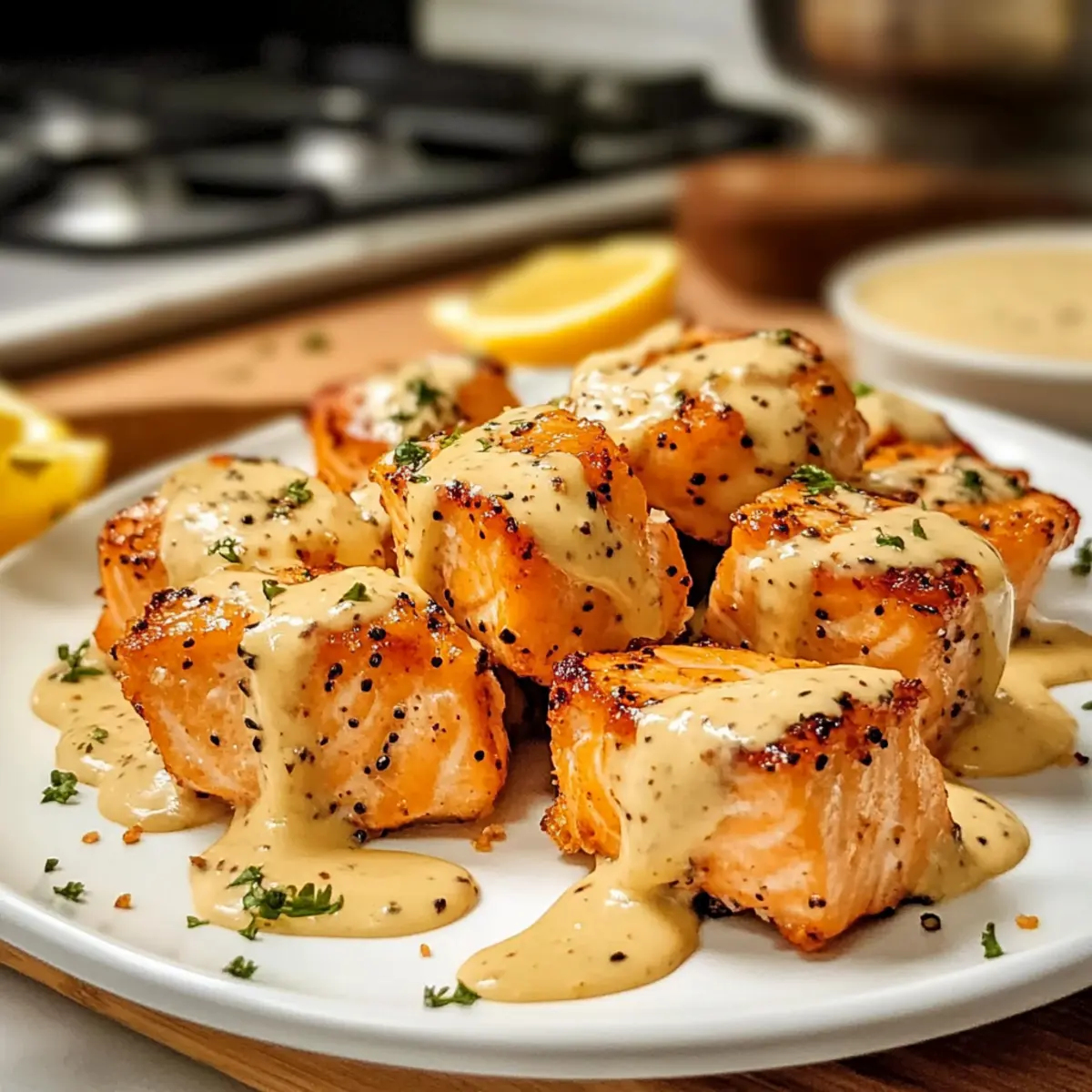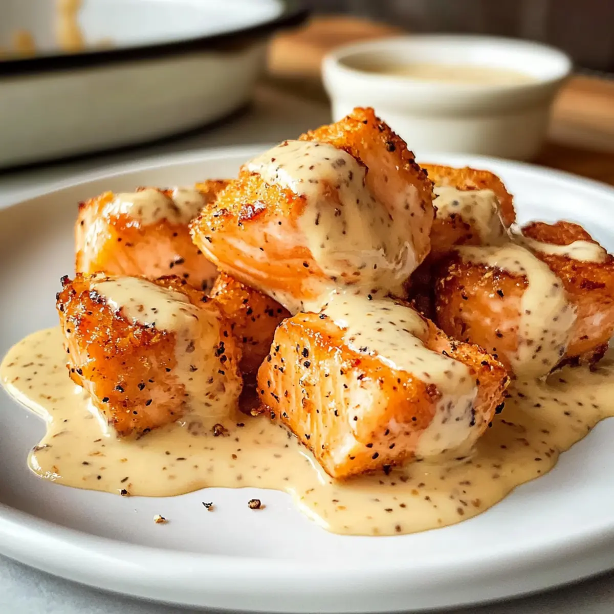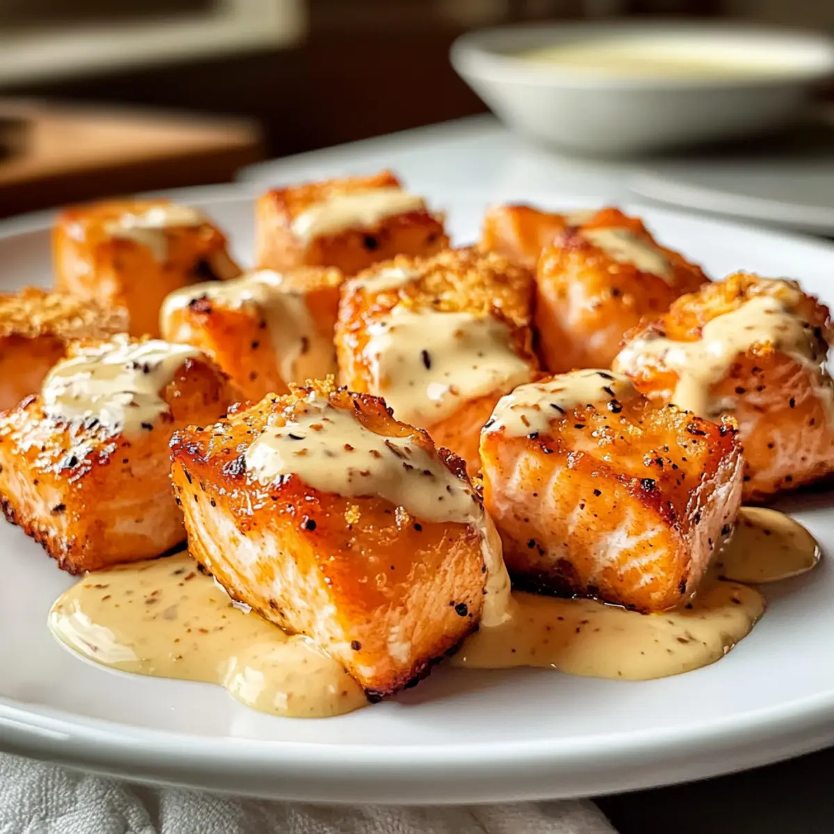 In der Küche kam es zu einem unerwarteten Ereignis: Der Duft von frisch gebackenem Lachs drang durch das ganze Haus und verkündete, dass etwas Besonderes auf dem Tisch landete. Diese gebackenen Bang Bang Lachs Bissen sind nicht nur ein toller Snack für jede Gelegenheit, sondern sind auch eine gute Wahl für alle, die gesunde Alternativen zu frittierten Snacks suchen. Mit nur wenigen Zutaten und einer schnellen Zubereitungszeit eignen sich diese herzhaften Happen perfekt für Familientreffen oder als elegant präsentierte Vorspeise. Der Kontrast zwischen dem zarten Lachs und der cremigen Bang Bang Sauce wird selbst anspruchsvollste Gaumen begeistern. Was wäre, wenn du deine nächste Zusammenkunft mit diesem einfachen, aber beeindruckenden Rezept verfeinerst? Warum wirst du gebackene Lachs Bissen lieben? Einfachheit: Die Zubereitung ist kinderleicht und benötigt keine besonderen Kochkünste – perfekt für jeden! Gesundheitlich: Diese gebackenen Lachs Bissen bieten eine köstliche, fettärmere Alternative zu frittierten Snacks, ideal für einen gesunden Lebensstil. Vielfältig: Mit unseren einfachen Variationen kannst du dein Lieblingsrezept ganz nach deinem Geschmack anpassen, sei es durch verschiedene Soßen oder Beilagen. Familienfreundlich: Sie sind so lecker, dass die ganze Familie sie lieben wird – selbst Kinder werden nach einer zweiten Portion fragen! Schnell zubereitet: In nur 20 Minuten sind diese köstlichen Happen fertig, perfekt für hektische Wochentage oder spontane Besuche. Gebackene Bang Bang Lachs Bissen Zutaten • Diese Zutaten bringen frischen Geschmack und köstliche Aromen auf deinen Tisch! Für die Lachs Bissen Lachs (2,5 lb) – Zartes Hauptprotein, das eine hervorragende Grundlage für die Bissen bildet. Mayonnaise (3 EL + 3/4 Tasse) – Sorgt für eine cremige Beschichtung; du kannst griechischen Joghurt für eine leichtere Variante verwenden. Zwiebelpulver (1,5 TL) – Fügt der Beschichtung herzhaften Geschmack hinzu. Knoblauchpulver (1,5 TL) – Verstärkt die Aromen; frischer gehackter Knoblauch kann als Ersatz verwendet werden. Chili-Pulver (1 TL) – Gibt einen Hauch von Wärme. Knoblauchpaste (2 TL) – Liefert intensiven Knoblauchgeschmack; frischer Knoblauch wird empfohlen. Knoblauchsalz – Verbessert die Geschmackstiefe. Schwarzer Pfeffer – Fügt eine leichte Schärfe hinzu. Für die Bang Bang Sauce Süße Chili-Sauce (1/2 Tasse) – Kombination aus Süße und Schärfe, ideal für die Bang Bang Sauce; Mae Ploy ist besonders empfehlenswert. Sriracha (1,5 EL) – Für zusätzliche Schärfe; nach Belieben anpassen. Sojasauce (1 EL) – Bringt einen umami Geschmack; für glutenfreie Optionen kann Tamari verwendet werden. Honig (1 TL) – Süßt die Sauce; Agavensirup ist ein geeigneter Ersatz. Frischer Knoblauch (1) – Frisch gerieben sorgt er für einen pikanten Kick in der Sauce. Frischer Ingwer (1/2 TL) – Für einen Hauch Frische und Würze; geriebener Ingwer ist bevorzugt. Sesamöl (1/2 TL) – Fügt ein nussiges Aroma hinzu. Diese gebackenen Bang Bang Lachs Bissen sind nicht nur lecker, sondern auch einfach zuzubereiten – die perfekte Wahl für Familienessen oder gesellige Abende! Schritt-für-Schritt-Anleitung für Gebackene Bang Bang Lachs Bissen Schritt 1: Ofen vorheizen Heize deinen Ofen auf 230°C (450°F) vor, um eine schnelle und gleichmäßige Garung zu gewährleisten. Diese Temperatur hilft dabei, dass die Oberfläche der gebackenen Bang Bang Lachs Bissen knusprig wird, während der Lachs saftig bleibt. Lass den Ofen gründlich aufheizen, während du die anderen Zutaten vorbereitest. Schritt 2: Lachs vorbereiten Trockne die Lachsstücke gründlich mit Küchenpapier ab, um überschüssige Feuchtigkeit zu entfernen. Dadurch wird sichergestellt, dass die Beschichtung besser haftet und die Bissen nach dem Backen einen perfekten Biss haben. Cubes sollten gleichmäßig geschnitten sein, um sicherzustellen, dass sie gleichmäßig garen. Schritt 3: Beschichtung herstellen In einer großen Schüssel gib die Mayonnaise, das Zwiebelpulver, das Knoblauchpulver, das Chili-Pulver, die Knoblauchpaste, Knoblauchsalz und den schwarzen Pfeffer hinein. Mische alles gut durch, bis eine homogene Mischung entsteht. Diese aromatische Beschichtung sorgt für den besonderen Geschmack deiner gebackenen Bang Bang Lachs Bissen. Schritt 4: Lachs mit Beschichtung vermengen Füge die vorbereiteten Lachsstücke zur Mischung in der Schüssel hinzu und vermenge sie vorsichtig, um sicherzustellen, dass alle Stücke gut bedeckt sind. Sei sanft, damit der Lachs nicht zerfällt. Achte darauf, dass jede Bissgröße einen gleichmäßigen Überzug hat für den besten Geschmack und die Textur. Schritt 5: Lachs anrichten Lege die mit der Beschichtung versehenen Lachsstücke auf ein mit Backpapier ausgelegtes Backblech. Achte darauf, dass zwischen den Bissen genügend Platz ist, damit die heiße Luft zirkulieren kann und die Stücke knusprig werden. Dies ist der Moment, in dem sich der köstliche Duft des Lachses entfalten wird. Schritt 6: Lachs backen Backe die Lachs Bissen im vorgeheizten Ofen für etwa 10 Minuten. Die Bissen sollten am Ende dieser Zeit durchgegart sein, aber behalte sie im Auge, damit sie nicht austrocknen. Du wirst sehen, dass der Lachs opak wird und eine goldene Farbe annimmt. Schritt 7: Broil für die Kruste Schalte den Ofen auf die Grillfunktion (Broil) und lasse die gebackenen Bang Bang Lachs Bissen für zusätzliche 2-3 Minuten weitergrillen. Achte darauf, dass du sie nicht aus den Augen lässt, denn sie können schnell anbrennen. Dies verleiht den Bissen die charakteristische knusprige Oberfläche. Schritt 8: Bang Bang Sauce zubereiten Während die Lachs Bissen backen, bereite die Bang Bang Sauce vor. Vermische in einer Schüssel die süße Chili-Sauce, Sriracha, Sojasauce, Honig, frisch geriebenen Knoblauch, Ingwer und Sesamöl. Rühre alles gut um, bis die Sauce eine glatte Konsistenz erreicht. Diese Sauce wird das Highlight deiner gebackenen