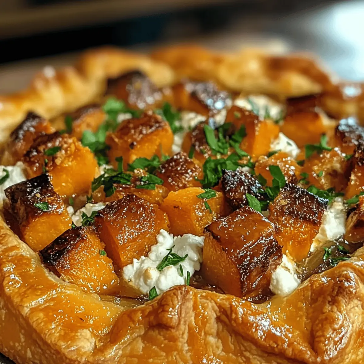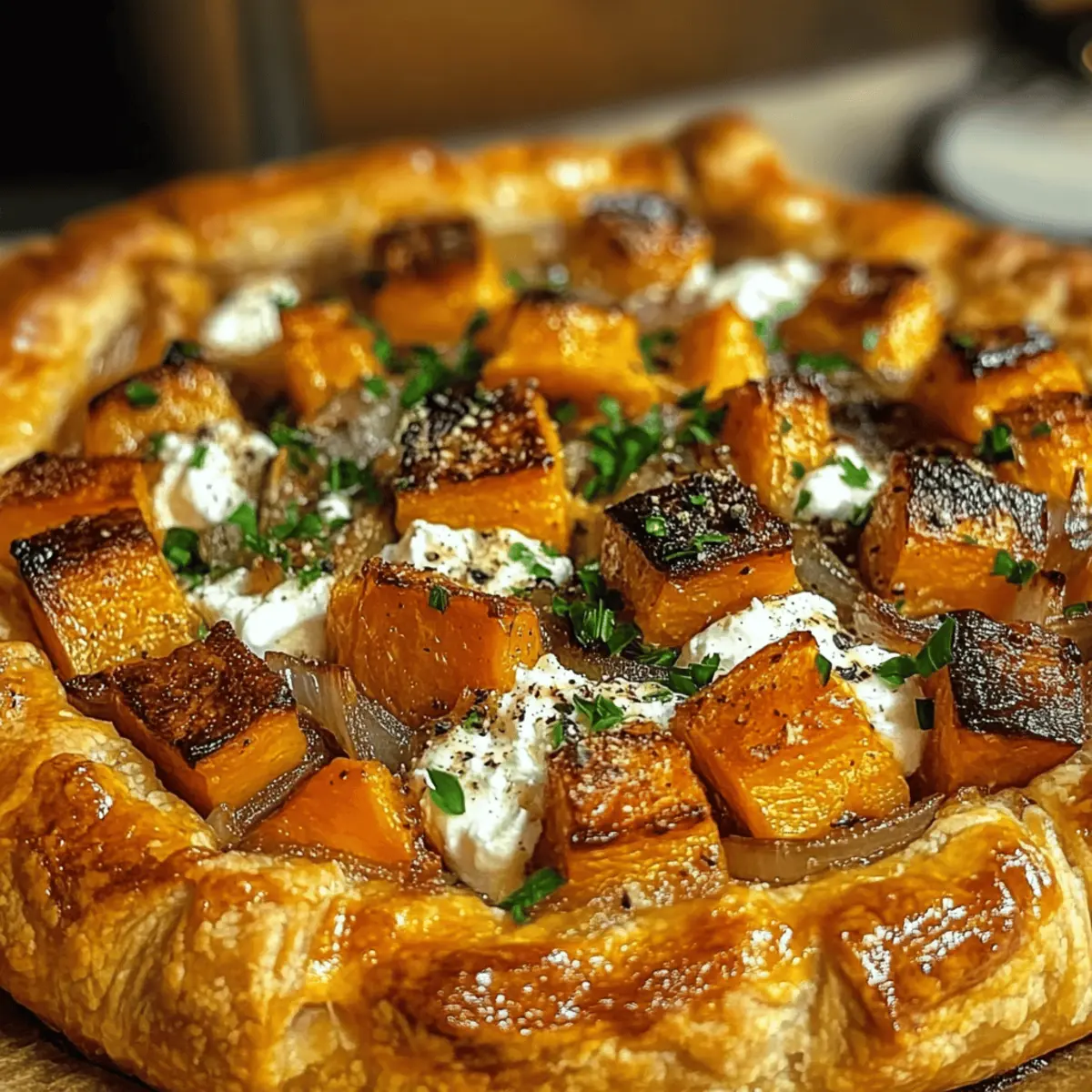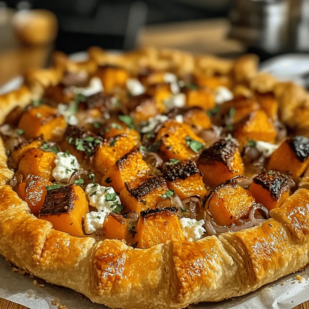 Wenn ich an den Herbst denke, schwirren sofort Gedanken an warmes, leckeres Essen in meinem Kopf. Einer meiner absoluten Favoriten in dieser Zeit sind die goldenen Butternusskürbis- und Ziegenkäse-Galetten. Diese herrliche Galette vereint den süßen, nussigen Geschmack von geröstetem Butternusskürbis mit der cremigen Frische von Ziegenkäse, verfeinert mit der aromatischen Essenz von Thymian und karamellisierten Zwiebeln. Sie ist nicht nur vegetarisch und gesund, sondern auch einfach zuzubereiten und perfekt für gesellige Abende oder elegante Dinner. Jede Gabel ist ein kleiner Genuss und zeigt auf bunte Weise die besten Zutaten der Saison. Neugierig, wie Sie diese köstliche Galette selbst zaubern können? Lassen Sie uns direkt in das Rezept eintauchen! Warum werden Sie diese Galette lieben? Einfachheit trifft Kreativität: Das Rezept ist erstaunlich einfach, ideal für Köche aller Levels, von Anfängern bis zu Profis. Herzhafter Geschmack: Die Kombination aus geröstetem Butternusskürbis und cremigem Ziegenkäse sorgt für ein Geschmackserlebnis, das Herzen höher schlagen lässt. Vielseitigkeit: Sie können die Galette nach Belieben anpassen, sei es mit unterschiedlichen Kräutern oder durch das Hinzufügen von Nüssen für extra Crunch. Perfekte Präsentation: Ideal für Dinnerpartys oder alltägliche Mahlzeiten – jeder wird vom ansprechenden Aussehen begeistert sein. Saisonale Highlights: Dieses Rezept feiert die Aromen des Herbstes und bietet eine gesunde, schmackhafte Alternative zu Fast Food. Probieren Sie es auch mit einer einfachen Rucola-Salat. Goldene Butternusskürbis- und Ziegenkäse-Galetten Zutaten • Für den Teig: Mehl – sorgt für die perfekte Basis; verwenden Sie solche mit einem hohen Proteingehalt für die beste Textur. Butter – bringt einen reichhaltigen Geschmack; kalte Butter sorgt für einen knusprigen Teig. Salz – verstärkt den Geschmack; verwenden Sie feines Salz für eine gleichmäßige Verteilung. Eiskaltes Wasser – hilft, den Teig zusammenzuhalten; nur so viel hinzufügen, dass der Teig formbar ist. • Für die Füllung: Butternusskürbis – fügt Süße und eine cremige Textur hinzu; wählen Sie fest und schwer für die beste Qualität. Ziegenkäse – bringt eine herzhafte Cremigkeit ins Spiel; verwendet die weiche Variante für einen geschmeidigen Genuss. Olivenöl – verstärkt den Geschmack der Zutaten; kann durch geschmolzene Butter ersetzt werden, wenn gewünscht. Thymian – verleiht der Füllung eine aromatische Note; frisch ist am besten, aber getrockneter Thymian kann auch genutzt werden (Menge anpassen). Zwiebeln – sorgen für natürliche Süße und Tiefe; fein gehackt für gleichmäßiges Garen. Honig (optional) – für einen zusätzlichen Hauch Süße nach dem Backen; perfekt zum Ausgleichen der Aromen. Eier (für das Eigelb-Waschen) – macht die Kruste goldbraun und glänzend; dafür ein verquirltes Ei verwenden. • Für die Garnitur (optional): Frische Petersilie oder Rucola – fügt Farbe und eine frische Note hinzu; sorgt für einen schönen visuellen Kontrast. Diese köstliche Goldene Butternusskürbis- und Ziegenkäse-Galette wird sicherlich nicht nur Ihre Familie, sondern auch Ihre Gäste begeistern! Schritt-für-Schritt-Anleitung für Goldene Butternusskürbis- und Ziegenkäse-Galetten Step 1: Ofen vorheizen Heizen Sie den Ofen auf 200 °C vor, um sicherzustellen, dass Ihre Goldene Butternusskürbis- und Ziegenkäse-Galette gleichmäßig gebacken wird. Dies ist wichtig, um eine schön knusprige Kruste zu erhalten. Während der Ofen vorheizt, können Sie mit der Vorbereitung der Füllung beginnen. Step 2: Butternusskürbis vorbereiten Schneiden Sie den Butternusskürbis in Würfel und werfen Sie ihn in einer großen Schüssel mit Olivenöl, Salz, Pfeffer und frischem Thymian. Sorgen Sie dafür, dass die Würfel gleichmäßig bedeckt sind. Verteilen Sie die Mischung anschließend auf einem Backblech und rösten Sie sie 25-30 Minuten lang im Ofen, bis sie goldbraun und zart sind. Step 3: Teig ausrollen Nehmen Sie den Teig für die Galette und legen Sie ihn auf eine leicht bemehlte Arbeitsfläche. Rollen Sie den Teig vorsichtig zu einem Kreis von etwa 30 cm Durchmesser aus. Übertragen Sie den ausgerollten Teig auf ein mit Backpapier ausgelegtes Blech und stellen Sie sicher, dass er gleichmäßig dick ist, um eine perfekte Kruste zu gewährleisten. Step 4: Zwiebeln sautieren Erhitzen Sie einen Esslöffel Olivenöl in einer Pfanne bei mittlerer Hitze. Fügen Sie die fein gehackten Zwiebeln hinzu und sautieren Sie sie für etwa 5-7 Minuten, bis sie weich und leicht karamellisiert sind. Diese aromatischen Zwiebeln bilden die geschmackvolle Grundlage für die Füllung der Goldenen Butternusskürbis- und Ziegenkäse-Galette. Step 5: Galette zusammenstellen Verteilen Sie die sautierten Zwiebeln gleichmäßig auf dem Teigkreis, lassen Sie dabei einen kleinen Rand frei. Legen Sie anschließend die gerösteten Butternusskürbiswürfel darauf und streuen Sie großzügig die zerkleinerten Ziegenkäse und eventuell Parmesan darüber. Step 6: Ränder falten Falten Sie die Ränder des Teigs vorsichtig über die Füllung, sodass ein schöner Sichtschutz entsteht. Die Falten müssen nicht perfekt sein; rustikale ist der Charme dieser Galette. Bestreichen Sie die Ränder mit einem verquirlten Ei, um eine goldene Farbe beim Backen zu erzielen. Step 7: Backen Schieben Sie die Galette in den vorgeheizten Ofen und backen Sie sie 25-30 Minuten lang, bis die Kruste goldbraun und knusprig ist. Überprüfen Sie nach einer Weile, ob der Rand schön aufgeht und eine appetitliche Farbe annimmt. Step 8: Fertigstellen & Servieren Nehmen Sie die fertige Goldene Butternusskürbis- und Ziegenkäse-Galette aus dem Ofen und lassen Sie sie kurz abkühlen. Nach Belieben mit Honig beträufeln und mit frischer Petersilie oder Rucola garnieren. Die Galette kann warm oder bei Zimmertemperatur serviert werden und bringt die Aromen des Herbstes wunderbar