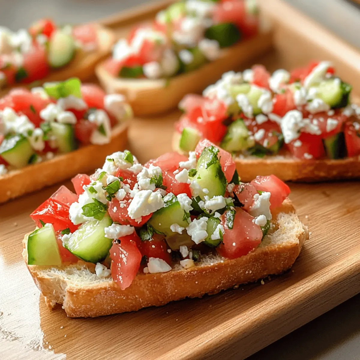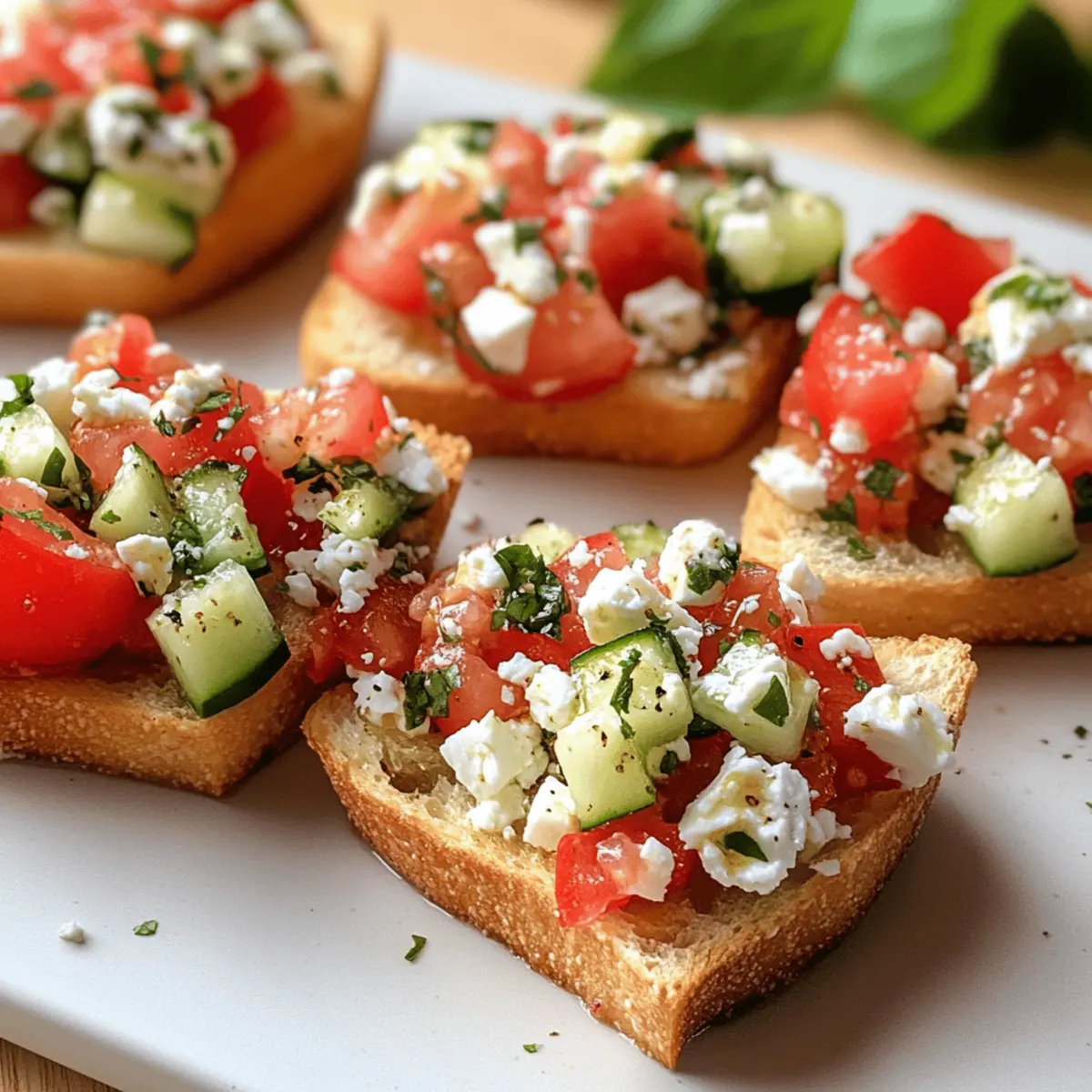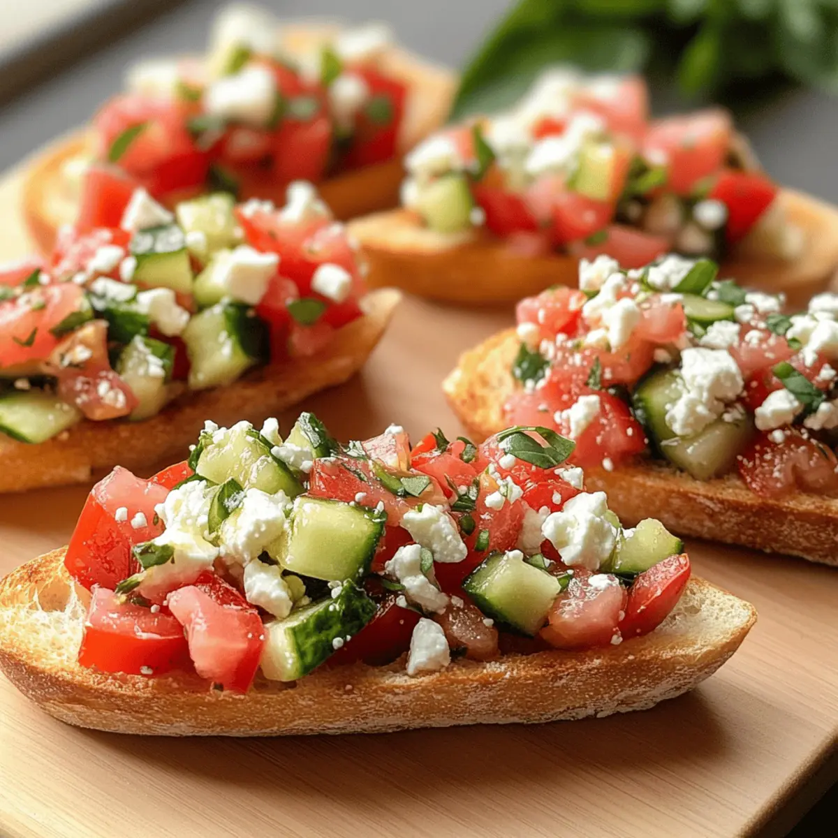 Die frischen Aromen der Mittelmeerküche können direkt in Ihrer Küche erweckt werden – und das mit der einfachen Zubereitung dieser griechischen Bruschetta. In nur 20 Minuten zaubern wir eine bunte Kombination aus saftigen Tomaten, knackigen Gurken und cremigem Feta, die jeden Snackmoment zu einem Highlight macht. Dieses Rezept ist nicht nur blitzschnell zuzubereiten, sondern auch ein echter Publikumsliebling, der hervorragend als Appetizer bei geselligen Zusammenkünften fungiert. Ob als Teil eines Buffets oder einfach nur als gesunde Zwischenmahlzeit – mit dieser griechischen Bruschetta bringen Sie mediterranes Flair auf den Tisch. Sind Sie bereit, Ihre Gäste mit dieser köstlichen Kombination zu begeistern? Warum diese griechische Bruschetta begeistert Einfachheit: Die Zubereitung ist kinderleicht und benötigt nur 20 Minuten – ideal für spontane Dinnerpartys. Frische Aromen: Mit saftigen Tomaten und knackigen Gurken erleben Sie das Beste der mediterranen Küche. Kreative Anpassungen: Variieren Sie mit Feta, Ziegenkäse oder sogar Oliven – dieser Snack bleibt spannend! Gesund und leicht: Ideal für alle, die auf eine gesunde Ernährung achten, ohne auf Geschmack zu verzichten. Publikumsliebling: Ob zu Getränken oder als Teil eines Buffets, diese Bruschetta wird immer für Begeisterung sorgen. Wenn Sie mehr über ähnliche Snacks erfahren möchten, schauen Sie sich Bruschetta Huehnchen Einfaches an oder entdecken Sie Gegrilltes Bruschetta Huehnchen. Zutaten für griechische Bruschetta Hier sind die notwendigen Zutaten für Ihre köstliche griechische Bruschetta, die das mediterrane Flair in Ihre Küche bringt. Für das Brot Baguette – Die perfekte Basis für die Bruschetta, kann knusprige Crostini oder frisches Brot ergeben. Für das Topping Roma-Tomaten – Sorgen für Frische und Saftigkeit, alternativ können auch heirloom oder schmackhafte Weinsorten verwendet werden. Seedless English Cucumber – Verleiht einen knackigen Biss und kann durch persische Gurken ersetzt werden. Frisch zerbröckelter Feta – Die cremige Komponente, die jeden Bissen bereichert; Ziegenkäse bietet eine leckere Abwechslung. Gehackte Frühlingszwiebeln – Bringt einen milden Zwiebelgeschmack; reguläre Zwiebeln können in kleineren Mengen verwendet werden. Zitrone – Frischt das Gericht mit der nötigen Säure auf; Limette ist eine spannende Alternative. Natives Olivenöl extra – Verstärkt den Geschmack und die Reichhaltigkeit; Avocadoöl kann ebenfalls verwendet werden. Rotweinessig – Fügt eine herzhafte Säure hinzu; Apfelessig ist eine gute Ersatzoption. Knoblauchpulver – Für aromatischen Geschmack ohne die Schärfe von frischem Knoblauch; für eine mildere Note weglassen. Salz und schwarzer Pfeffer – Unverzichtbar für die Würze; nach Geschmack anpassen. Getrockneter Oregano, Dill und Basilikum – Stellt ein mediterranes Kräuterprofil bereit; frische Kräuter bringen noch mehr Aroma. Mit diesen Zutaten können Sie eine köstliche griechische Bruschetta herstellen, die nicht nur gesund, sondern auch einfach zuzubereiten ist! Schritt-für-Schritt-Anleitung für griechische Bruschetta mit Feta und frischem Gemüse Step 1: Crostini vorbereiten Heizen Sie den Ofen auf 190 °C vor. Schneiden Sie das Baguette in ½ cm dicke Scheiben oder halbieren Sie es längs für größere Stücke. Bestreichen Sie beide Seiten leicht mit nativem Olivenöl extra, um Geschmack und eine goldene Farbe zu erzielen. Legen Sie die Scheiben auf ein Backblech, und sorgen Sie dafür, dass sie nicht überlappen. Step 2: Scheiben backen Backen Sie die Baguettescheiben im vorgeheizten Ofen für 10-12 Minuten, bis sie goldbraun und knusprig sind. Wenden Sie die Brotscheiben nach der Hälfte der Backzeit, damit sie gleichmäßig bräunen. Nehmen Sie sie heraus und lassen Sie sie auf einem Gitterrost abkühlen, während Sie die Bruschetta-Füllung zubereiten. Step 3: Bruschetta-Topping zubereiten Würfeln Sie die Roma-Tomaten und die englische Gurke in kleine Stücke für ein ansprechendes Topping. In einer Schüssel kombinieren Sie den Saft einer Zitrone, nativem Olivenöl, Rotweinessig, Knoblauchpulver, Salz, Pfeffer, getrocknetem Oregano, Dill und Basilikum. Whiskieren Sie alles gründlich, bis sich die Zutaten gut verbunden haben. Step 4: Zutaten mischen Fügen Sie die gewürfelten Tomaten, Gurken, gehackte Frühlingszwiebeln und den zerbröckelten Feta in die Schüssel mit dem Dressing hinzu. Mischen Sie die Zutaten vorsichtig, bis alle Teile gut mit dem aromatischen Dressing überzogen sind. Achten Sie darauf, die Feta-Stücke nicht zu zerdrücken, um eine schöne Textur zu erhalten. Step 5: Servieren Legen Sie die vorbereiteten Topping-Mischung großzügig auf die Crostini oder die frischen Baguettescheiben. Stellen Sie sicher, dass jede Scheibe mit der köstlichen Füllung gut bedeckt ist. Servieren Sie die griechische Bruschetta sofort, damit die Gäste den köstlichen Geschmack der frischen Zutaten in vollen Zügen genießen können. Variationen & Alternativen zur griechischen Bruschetta Gestalten Sie dieses köstliche Rezept ganz nach Ihrem Geschmack und lassen Sie Ihrer Kreativität freien Lauf! Vegan: Tauschen Sie den Feta durch cremige Avocado aus, um eine gesunde, pflanzliche Variante zu kreieren. Sie erhalten eine wunderbare Textur und einen reichhaltigen Geschmack. Glutenfrei: Verwenden Sie glutenfreies Baguette, um diesen Snack jedem zugänglich zu machen. Ideal für Ihre glutenempfindlichen Gäste! Extra würzig: Fügen Sie gewürfelte Jalapeños oder Paprika hinzu, um der Mischung einen zusätzlichen Kick zu verleihen. So bringen Sie ordentlich Schwung auf den Tisch! Mediterraner Twist: Ersetzen Sie Feta durch Ziegenkäse oder Ricotta für eine cremigere und schmackhaft andere Note. Diese Veränderungen erweitern das Aroma erheblich. Frische Kräuter: Verwenden Sie frische Kräuter wie Minze oder Petersilie anstelle von getrocknetem Oregano für einen lebendigen Geschmack. Frische Kräute
