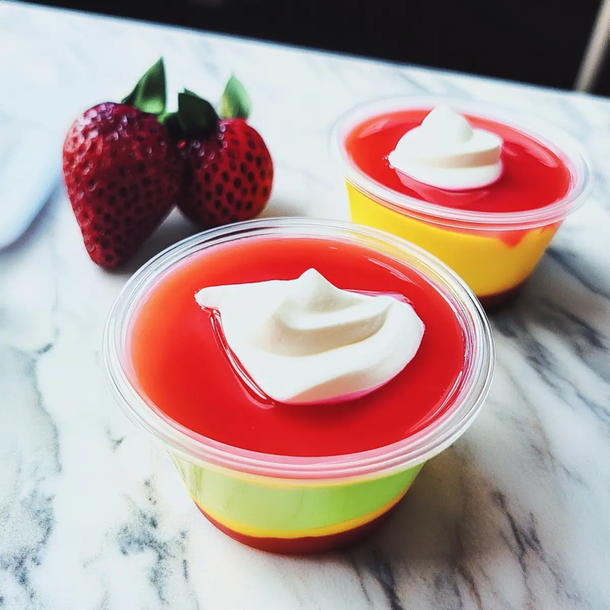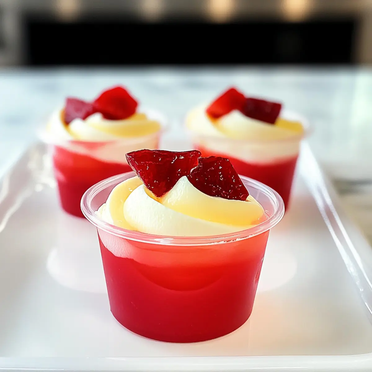 Als ich letzte Woche in meiner Küche stand, überkam mich die Ahnung, dass ich eine süße Erfrischung brauche, die nicht nur lecker, sondern auch gesund ist. Diese Griechischer Joghurt Gelee Cups sind genau das, was ich brauchte – eine harmonische Verbindung aus der Fruchtigkeit von Jell-O und der cremigen Textur von griechischem Joghurt. Mit nur drei Zutaten und einer Zubereitungszeit von wenigen Minuten lassen sich diese Low-Calorie-Desserts ganz leicht zaubern. Ob als Snack für zwischendurch oder als leichter Abschluss zu einem Dinner; die Kombination aus Geschmack und Nährstoffen macht sie zu einem echten Publikumsmagneten. Welche Geschmacksrichtung wird dein Favorit? Warum du diesen Griechischer Joghurt Gelee lieben wirst Einfachheit: Die Zubereitung ist kinderleicht und benötigt nur drei Zutaten – perfekt für jeden Kochlevel! Vielfältige Geschmacksrichtungen: Du kannst mit verschiedenen Jell-O Geschmäckern experimentieren, wie Himbeere oder Zitrone, um jedes Mal ein neues Dessert zu kreieren. Gesund und Lecker: Mit griechischem Joghurt bekommst du nicht nur einen cremigen Geschmack, sondern auch wertvolles Protein – eine ideale Kombination! Schnell zubereitet: In nur wenigen Minuten kannst du diese köstlichen Desserts zubereiten, was sie zu einer idealen Option für unerwartete Gäste macht. Publikumsliebling: Ob bei einer Grillparty oder als erfrischender Snack – diese Cups werden bei deinen Freunden und deiner Familie garantiert gut ankommen. Wenn du auf der Suche nach mehr gesunden Dessertideen bist, schau dir auch unseren Artikel über leichte Fruchtsalate an! Griechischer Joghurt Gelee Zutaten • Diese einfachen Zutaten verwandeln deine Küche in eine Dessert-Experimentierstätte! Für den Gelee Flavored Gelatin Dessert (z.B. Jell-O) – sorgt für die süße Frische; wähle deine Lieblingssorte wie Himbeere oder Zitrone für abwechslungsreiche Geschmackserlebnisse. Kochen Wasser – aktiviert das Geliermittel, um die perfekte jellyartige Konsistenz zu erzielen. Kaltes Wasser – wird verwendet, um die Mischung schnell abzukühlen, bevor der Joghurt hinzugefügt wird. Vanilla griechischer Joghurt – bringt Cremigkeit und Protein; Vollfett-Joghurt wird empfohlen, um die beste Textur zu erzielen. Viel Spaß beim Zubereiten deiner köstlichen Griechischer Joghurt Gelee Cups! Schritt-für-Schritt-Anleitung für Griechischer Joghurt Gelee Schritt 1: Gelatine auflösen In einer großen, hitzebeständigen Schüssel das gefärbte Gelatinepulver mit 1 Tasse kochendem Wasser verrühren. Rühre die Mischung für etwa 2 Minuten kräftig mit einem Schneebesen, bis sich die Gelatine vollständig aufgelöst hat. Achte darauf, dass keine Klumpen übrig bleiben, um die perfekte Konsistenz für deinen Griechischer Joghurt Gelee zu erzielen. Schritt 2: Kaltes Wasser hinzufügen Füge nun 1 Tasse kaltes Wasser zur Gelatine-Mischung hinzu und rühre erneut um. Diese Phase hilft, die Mischung schnell abzukühlen, bevor du den griechischen Joghurt hinzufügst. Es ist wichtig, die Mixtur gut zu vermengen, sodass die Gelatine gleichmäßig verteilt ist und eine homogene Basis für dein Dessert entsteht. Schritt 3: Joghurt einrühren Sobald die Mischung etwas abgekühlt ist, füge 1 bis 1,5 Tassen Vanille griechischen Joghurt hinzu. Rühre mit einem Schneebesen weiter, bis alles glatt und klumpenfrei ist. Achte darauf, dass der Joghurt gut mit der Gelatine kombiniert wird, um die cremige Textur des Griechischer Joghurt Gelee optimal zu gestalten. Schritt 4: In Portionen füllen Verteile die fertige Mischung gleichmäßig auf vier 180 ml Ramekins oder Dessertbecher. Stelle sicher, dass die Mischung gleichmäßig in jedem Becher verteilt ist, damit alle Portionen gleich groß und ansprechend aussehen. Die cremige Konsistenz sollte sofort sichtbar sein, wenn du die Mischung aus der Schüssel nimmst. Schritt 5: Kühlen und Fest werden lassen Die Dessertbecher für die ersten 2 Stunden unbedeckt in den Kühlschrank stellen, um Kondensation zu vermeiden. Nach dieser Zeit kannst du sie mit Frischhaltefolie abdecken und weitere 2 Stunden im Kühlschrank fest werden lassen. Die Gelee Cups sollten am Ende fest und leicht wackelig, aber nicht flüssig in der Mitte sein. Schritt 6: Servieren und Garnieren Serviere deinen Griechischer Joghurt Gelee direkt aus den Ramekins oder dekoriere sie nach Belieben. Eine Schicht aus Schlagsahne, frischen Früchten oder Minzblättern kann das Aussehen und das Geschmackserlebnis noch verbessern. Diese selbstgemachten Desserts sind nicht nur lecker, sondern bieten auch eine gesunde Alternative zu gekauften Süßigkeiten. Expert Tips für Griechischer Joghurt Gelee Gelatine richtig auflösen: Achte darauf, dass die Gelatine in kochendem Wasser vollständig aufgelöst ist, um ein grainiges Ergebnis zu vermeiden. Zusätzliche Kälte: Verwende kaltes Wasser, um die Mischung schnell abzukühlen. So bleibt der griechische Joghurt kühl und cremig. Perfekte Konsistenz: Ein Schneebesen hilft, eine klumpenfreie Mischung zu erhalten. Ein Löffel könnte zu einer ungleichmäßigen Textur führen. Kühlzeit beachten: Behalte die Kühlschranktemperatur im Auge, da zu hohe oder niedrige Temperaturen das Setzen des Griechischer Joghurt Gelee beeinflussen können. Variationen nutzen: Experimentiere mit verschiedenen Jell-O-Geschmäckern, um jedem Dessert eine persönliche Note zu verleihen. Was passt zu Griechischem Joghurt Gelee? Diese köstlichen Gelee Cups sind nicht nur ein Genuss für den Gaumen, sondern lassen sich auch wunderbar mit verschiedenen Beilagen kombinieren! Frische Früchte: Eine Auswahl an Beeren oder tropischen Früchten wie Mango bringt zusätzliche Frische und ergänzt die süßen Aromen des Gelees. Sie verleihen dem Dessert eine lebendige Note und fördern die gesunde Ernährung. Minzblätter: Einige frische Minzblätter sorgen für einen erfrischenden Kontrast und einen zusätzlichen Aromakick. Die Kombination aus Minze und Frucht ist nicht nur geschma