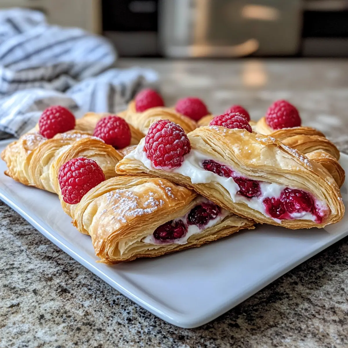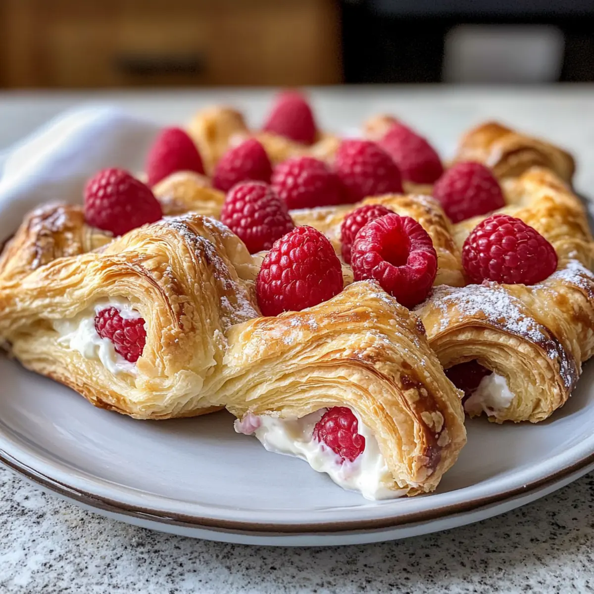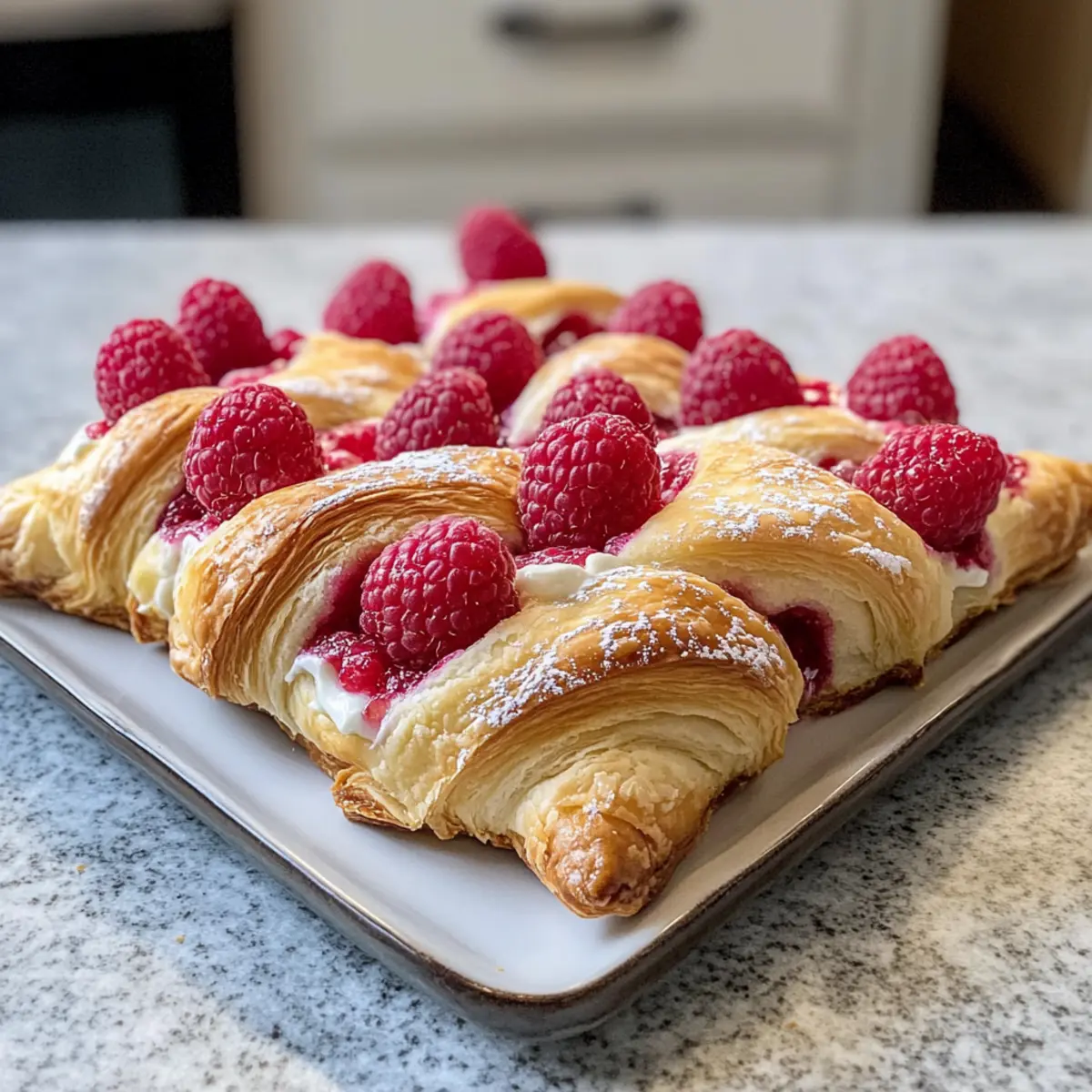 Als ich neulich in meiner Küche stand und den verführerischen Duft von frisch gebackenem Gebäck entdeckte, wusste ich sofort, dass es Zeit für Himbeer-Dänisch war. Diese zarten und buttrigen Teilchen sind nicht nur ein Genuss zum Frühstück, sondern auch ein köstliches Dessert, das deine Familie und Freunde begeistern wird. Mit einer cremigen Füllung aus süßem Frischkäse und saftigen Himbeeren ist dieses Rezept einfach in der Zubereitung und eignet sich perfekt für ein entspanntes Brunch oder einen süßen Snack zwischendurch. In gerade mal einer Stunde kannst du diese verführerischen Leckerbissen zaubern, die nicht nur deinen Gaumen verwöhnen, sondern auch das Herz jeder Kaffeetafel erobern. Bist du bereit, deinem nächsten Frühstück einen fruchtigen Twist zu verleihen? Lass uns loslegen! Warum wirst du dieses Rezept lieben? Einfache Zubereitung: Das Rezept für Himbeer-Dänisch ist so unkompliziert, dass sogar Anfänger in der Küche schnell Freude daran finden. Fruchtiger Genuss: Die Kombination aus frischen Himbeeren und cremigem Frischkäse sorgt für ein himmlisches Geschmackserlebnis, das nicht nur die Geschmacksknospen verführt, sondern auch das Auge erfreut. Kreative Variationen: Du kannst dieses Rezept leicht anpassen, indem du andere Früchte wie Aprikosen oder Kirschen verwendest oder zusätzlich Zitronenzesten für einen erfrischenden Kick hinzufügst. Ideal für jede Gelegenheit: Ob zum Frühstück, Brunch oder als süßer Snack – diese Dänisch sind die perfekte Wahl für jede Veranstaltung. Zeitersparnis: In nur einer Stunde zauberst du eine köstliche Leckerei, die deine Gäste beeindruckt und dir wertvolle Zeit spart, um den Moment zu genießen. Genieße diese Himbeer-Dänisch und entdecke auch unsere anderen dänischen Variationen, die deine Geschmackspalette erweitern könnten! Himbeer-Dänisch Zutaten Für den Teig • Blätterteig – Der Hauptbestandteil, der die angenehme, buttrige Textur liefert; verwende gefrorenen Blätterteig, der im Kühlschrank aufgetaut wurde. Für die Füllung • Frische Himbeeren – Bringen Fruchtigkeit und eine leicht säuerliche Note; koste vorher, und wenn sie zu sauer sind, erhöhe den Puderzucker. • Frischkäse – Der reichhaltige, cremige Kern; sollte vor der Verwendung weich sein, damit er sich gut vermischt. • Puderzucker – Süßt die Frischkäsemischung; passe ihn nach Geschmack an, je nach Süße der Himbeeren. • Vanilleextrakt – Verleiht der Füllung eine zusätzliche Geschmacksnote mit einem Hauch von Süße. • Ei – Wird für die Eierwaschschicht verwendet, um eine goldbraune Farbe zu erzielen. Für die Zubereitung • Mehl – Zum Bestäuben der Arbeitsfläche, damit der Teig nicht kleben bleibt. Mit diesen Zutaten zauberst du im Handumdrehen ein köstliches Himbeer-Dänisch, das nicht nur den Gaumen, sondern auch das Herz erfreut! Schritt-für-Schritt-Anleitung für Himbeer-Dänisch Schritt 1: Frischkäsefüllung vorbereiten In einer mittelgroßen Schüssel den weichen Frischkäse mit Puderzucker und Vanilleextrakt gut vermengen, bis eine glatte und cremige Konsistenz erreicht ist. Dies dauert etwa 2–3 Minuten. Je nach Süße der Himbeeren kannst du die Menge an Puderzucker anpassen. Stelle die Füllung beiseite, während du den Blätterteig vorbereitest. Schritt 2: Blätterteig ausrollen Bestäube eine saubere Arbeitsfläche mit etwas Mehl, um ein Kleben zu verhindern. Rolle den aufgetauten Blätterteig vorsichtig zu einem Quadrat von etwa 26 cm x 26 cm aus, bis er ungefähr 0,5 cm dick ist. Schneide den Teig anschließend in 9 gleich große Quadrate, die etwa 9 cm groß sind. Achte darauf, dass der Teig kühl bleibt, um seine Blätterstruktur zu bewahren. Schritt 3: Dänisch zusammenbauen Nimm ein Quadrat des Blätterteigs und setze einen kleinen Löffel der Frischkäsefüllung in die Mitte. Füge einige frische Himbeeren hinzu und achte darauf, dass es nicht zu viel wird, damit der Teig nicht überläuft. Fette eine Ecke des Quadrats mit dem verquirlten Ei ein, um den Teig beim Falten zu versiegeln, und klappe die gegenüberliegende Ecke darüber. Schritt 4: Kühlen Lege die vorbereiteten Himbeer-Dänisch auf ein mit Backpapier ausgelegtes Blech. Stelle sicher, dass sie genügend Platz zwischen den einzelnen Teilchen haben, damit sie beim Backen aufgehen können. Kühle die Dänisch im Gefrierfach für mindestens 30 Minuten, um das Aufgehen während des Backens zu fördern und die Blätterteigstruktur zu bewahren. Schritt 5: Backen Heize deinen Ofen auf 200 °C (Umluft) vor. Nimm die Dänisch aus dem Gefrierfach und bestreiche sie großzügig mit dem restlichen Ei für eine goldbraune, glänzende Oberfläche. Backe die Himbeer-Dänisch 25–30 Minuten lang, bis sie goldbraun und knusprig sind. Achte darauf, dass die Füllung nach dem Backen schön blubbert, was ein Zeichen für ein gelungenes Ergebnis ist. Schritt 6: Servieren Lass die Himbeer-Dänisch kurz auf dem Blech abkühlen, bevor du sie servierst. Du kannst sie nach Belieben mit einer feinen Schicht Puderzucker bestäuben, um ihnen ein dekoratives Finish zu verleihen. Serviere sie warm für einen besonders köstlichen Genuss! Vorbereitung für Himbeer-Dänisch, die Zeit spart Diese Himbeer-Dänisch sind ideal für die Vorbereitung im Voraus, sodass Sie Zeit sparen und dennoch frisch gebackene Leckereien genießen können. Sie können die Frischkäsefüllung bis zu 3 Tage im Voraus zubereiten und im Kühlschrank aufbewahren. Auch die bestehenden Dänisch lassen sich bereits geformt und gefroren für bis zu 24 Stunden im Gefrierfach aufbewahren; dies sorgt dafür, dass der Blätterteig beim Backen schön aufgeht. Wenn Sie bereit sind, die Dänisch zu backen, heizen Sie den Ofen auf 200 °C vor, bestreichen Sie die gefrorenen Teilchen mit dem Ei und backen Sie sie 25–30 Minuten, bis sie goldbraun sind. So genießen Sie das Aroma und die Frische eines gebackenen Gebäcks, ohne lange in der Küche stehen zu müssen! Lagerungstipp