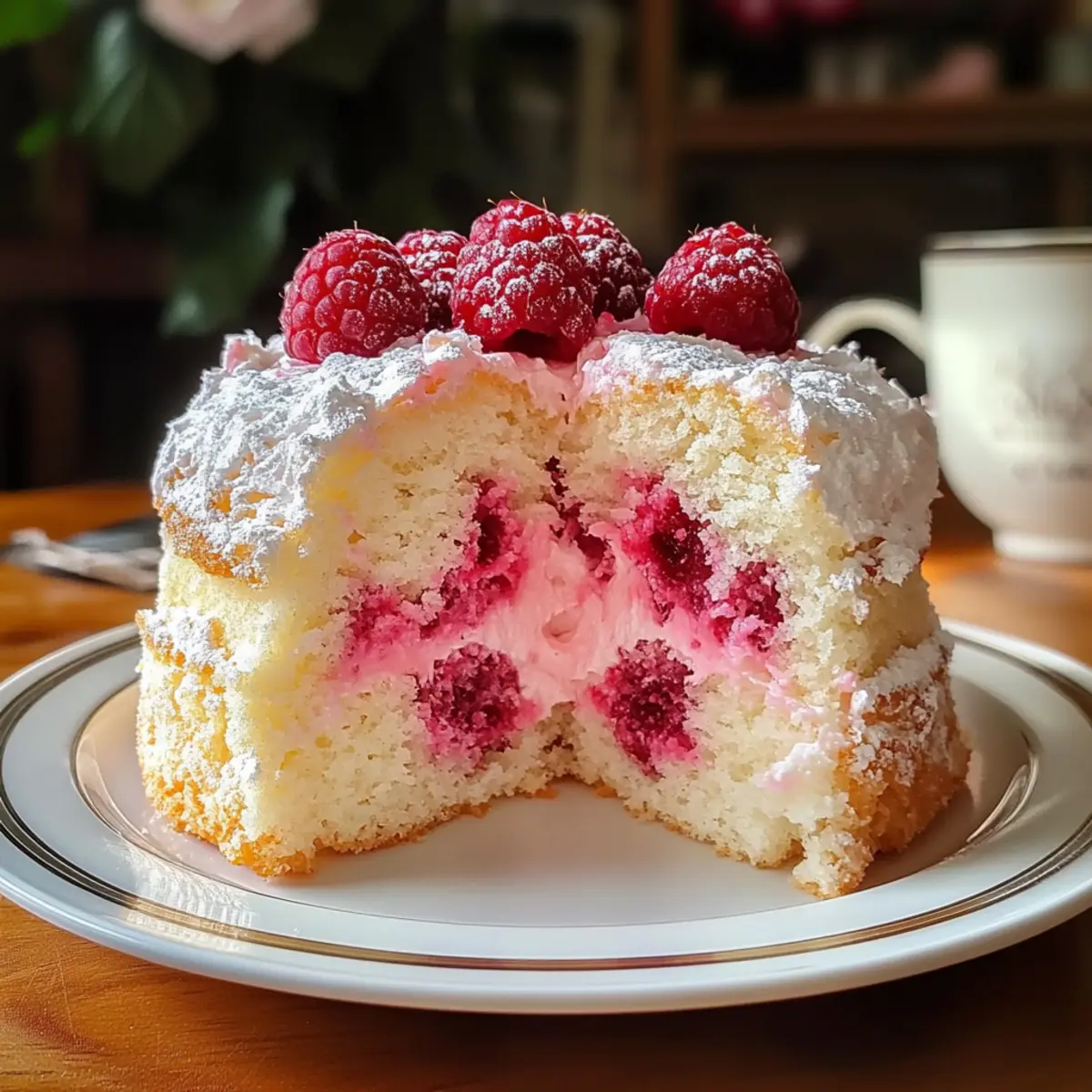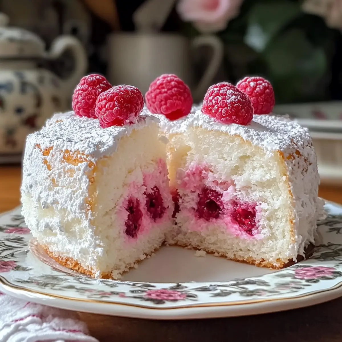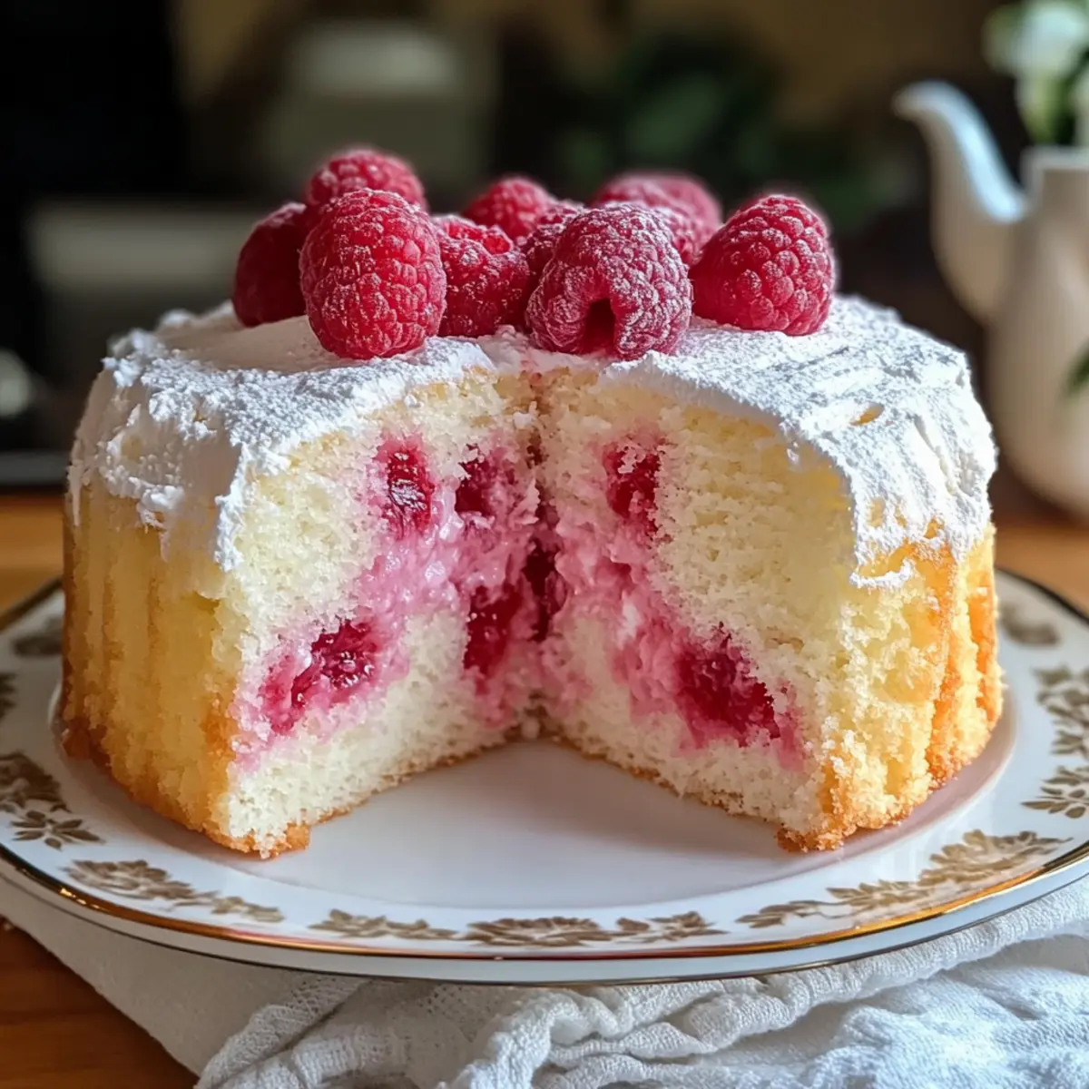 Ein Hauch von Sommer weht durch die Küche, während ich die frisch gepflückten Himbeeren zubereite. Diese Himbeer-Engelsfoodkuchen ist nicht nur ein Lichtblick, sondern auch eine köstliche Möglichkeit, sich von schweren Desserts zu verabschieden. Mit seiner luftigen Textur und der frischen Süße der Himbeeren ist dieser Kuchen eine wunderbare Wahl für jeden Anlass – sei es ein geselliges Familienessen oder eine elegante Feier. Wenn du auf der Suche nach einem schnell zuzubereitenden und kalorienbewussten Dessert bist, wird dich dieses Rezept sicherlich begeistern. Glaub mir, die Kombination aus Himmelstortenteig und fruchtigem Genuss wird deine Geschmacksknospen verzaubern! Bist du bereit, gemeinsam diesen himmlischen Kuchen zu zaubern? Warum dieser Kuchen dein Herz erobern wird Leichtigkeit pur: Der Himbeer-Engelsfoodkuchen besticht durch seine luftig-leichte Textur, die jedem Bissen ein Gefühl von Frische verleiht. Fruchtige Note: Die Kombination aus zarten Himbeeren und dem fluffigen Teig sorgt für einen unvergleichlichen Geschmack, der für Freude sorgt. Einfach zuzubereiten: Auch ohne große Backkünste gelingt dir dieser Kuchen mühelos, perfekt für spontane Dessertgelüste. Gesunde Wahl: Mit weniger Kalorien als traditionelle Kuchen ist er die ideale Lösung für Naschkatzen, die auf ihre Linie achten wollen. Vielseitig: Du kannst die Himbeeren je nach Saison durch andere Früchte ersetzen, was dir unendliche Variationsmöglichkeiten bietet. Tolle Präsentation: Dieser Kuchen sieht nicht nur gut aus, sondern wird durch weiße Sahne und frische Himbeeren zum echten Hingucker auf jedem Tisch. Himbeer-Engelsfoodkuchen Zutaten • Himbeer-Engelsfoodkuchen ist eine perfekte Wahl für einen leichten und fruchtigen Genuss. Für den Teig Eiweiß – sorgt für die luftige Struktur des Kuchens. Achte darauf, dass kein Eigelb enthalten ist. Zucker – verleiht Süße und hilft bei der Stabilität des Teigs. Verwende keinen braunen Zucker, da er die Textur beeinträchtigen kann. Kuchenmehl – sorgt für die leichte Krume. Allzweckmehl könnte das Ergebnis schwerer machen. Himbeeren – bringen Farbe und Geschmack. Frische oder gefrorene Himbeeren sind möglich; bei gefrorenen die Flüssigkeit gut abtropfen lassen. Für das Topping Puderzucker – ideal zum Bestäuben für eine hübsche Dekoration. Schlagsahne – optional für eine cremige Note, die den Kuchen wunderbar ergänzt. Genieße es, diesen Himbeer-Engelsfoodkuchen bei deinem nächsten Anlass zu servieren und deine Gäste mit einem leichten, fruchtigen Dessert zu begeistern! Schritt-für-Schritt-Anleitung für Himbeer-Engelsfoodkuchen Step 1: Ofen vorheizen und Form vorbereiten Heize den Ofen auf 175 °C vor. Bereite eine Röhren- oder Engelsfoodform vor, indem du sie nicht fettest, da der Teig an der Wand haften muss, um aufzugehen. Die richtige Vorbereitung ist entscheidend, damit dein Himbeer-Engelsfoodkuchen die perfekte Höhe und Luftigkeit erhält. Step 2: Eiweiße schlagen Gib die Eiweiße in eine große Rührschüssel und schlage sie mit einem elektrischen Mixer, bis weiche Spitzen entstehen. Füge langsam den Granulated Zucker hinzu und schlage weiter, bis ein fester, glänzender Eischnee entsteht. Dieser Schritt ist wichtig für die luftige Struktur des Kuchens. Step 3: Trocken Zutaten kombinieren Siebe das Kuchenmehl zusammen mit einer Prise Salz in eine separate Schüssel. Hebe dann vorsichtig die Mehlmischung mit einem großen Spatel unter den Eischnee. Achte darauf, die Luftigkeit des Teigs nicht zu verlieren, da dies für einen gelungenen Himbeer-Engelsfoodkuchen entscheidend ist. Step 4: Himbeeren hinzufügen Falte vorsichtig die frisch oder aufgetauten Himbeeren unter den Teig, bis sie gleichmäßig verteilt sind. Sei behutsam, um die zarten Beeren nicht zu zerdrücken. Diese fruchtige Zugabe verleiht dem Kuchen nicht nur Geschmack, sondern auch eine ansprechende Farbe. Step 5: Backen Gieße den Teig in die vorbereitete Form und backe ihn im vorgeheizten Ofen für 30 bis 35 Minuten. Der Kuchenteig sollte leicht golden sein und ein Zahnstocher sollte sauber herauskommen. Achte darauf, die Ofentür während des Backens nicht zu öffnen, damit der Teig nicht zusammenfällt. Step 6: Abkühlen lassen Sobald der Kuchen goldbraun ist, hole ihn aus dem Ofen und lasse ihn umgedreht in der Form abkühlen. Dies hilft, seine luftige Struktur zu bewahren. Lass den Himbeer-Engelsfoodkuchen mindestens eine Stunde abkühlen, bevor du ihn servierst oder aus der Form nimmst. Step 7: Servieren Wenn der Kuchen vollständig abgekühlt ist, löse ihn vorsichtig aus der Form. Bestäube ihn mit Puderzucker und serviere ihn nach Belieben mit einer Portion Schlagsahne und frischen Himbeeren. Diese Dekoration macht den Himbeer-Engelsfoodkuchen zu einem echten Fest für die Sinne! Expertentipps für Himbeer-Engelsfoodkuchen Eiweiß richtig schlagen: Achte darauf, dass die Eiweiße vollständig fettfrei sind. Jedes bisschen Eigelb kann die Luftigkeit des Teigs beeinträchtigen und das Ergebnis schwerer machen. Korrektes Sieben: Siebe das Kuchenmehl gründlich, bevor du es unter den Eischnee hebst. Dies sorgt für eine feine Textur und verhindert Klumpen, die den Himbeer-Engelsfoodkuchen schwer machen könnten. Sanftes Falten: Falte die Himbeeren vorsichtig unter den Teig. Zu starkes Umrühren kann die Beeren zerdrücken und die leichte Struktur des Kuchens ruinieren. Ofentür geschlossen halten: Während des Backens solltest du die Ofentür nicht öffnen. Ein plötzlicher Temperaturwechsel kann dafür sorgen, dass der Kuchen zusammenfällt. Richtig Abkühlen: Lass den Kuchen auf dem Kopf in der Form abkühlen. Dadurch bleibt seine luftige Struktur erhalten und er lässt sich leichter aus der Form lösen. Himbeer-Engelsfoodkuchen Variationen Du kannst diesen Himbeer-Engelsfoodkuchen ganz nach deinem Geschmack anpassen und ihm deine persönliche Note verleihen. Lass deiner Kreativität freien Lauf und entdecke diesen fruchtigen Genuss