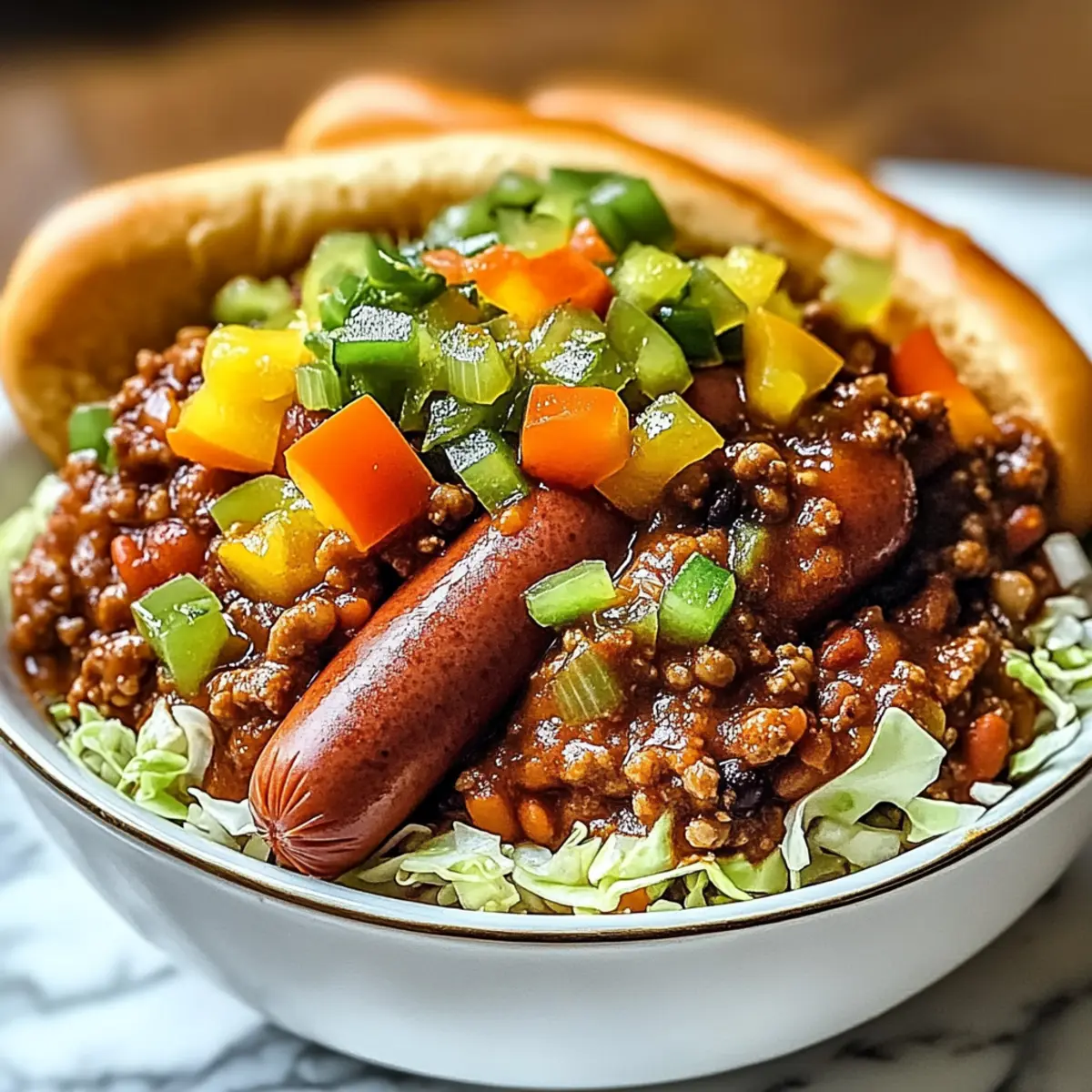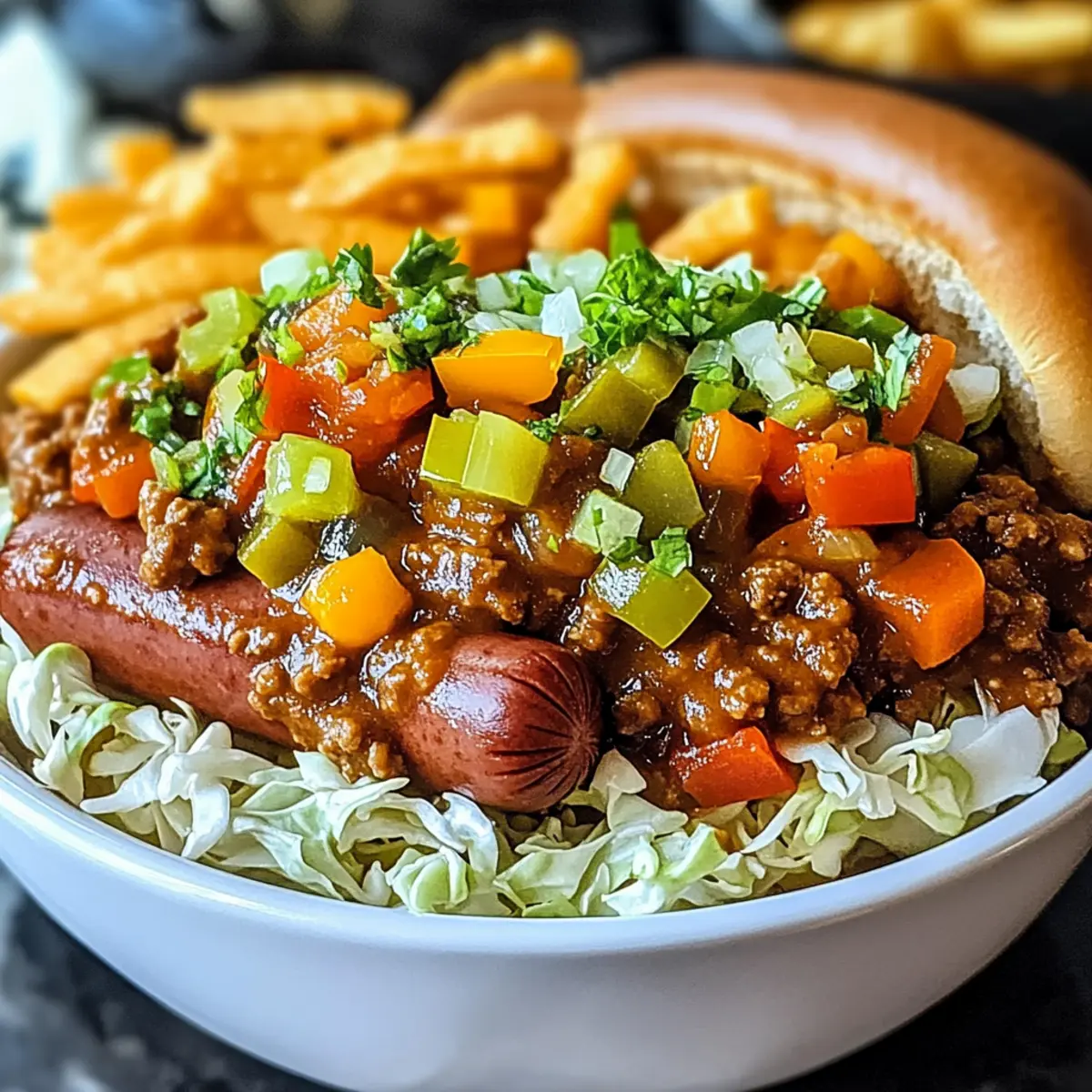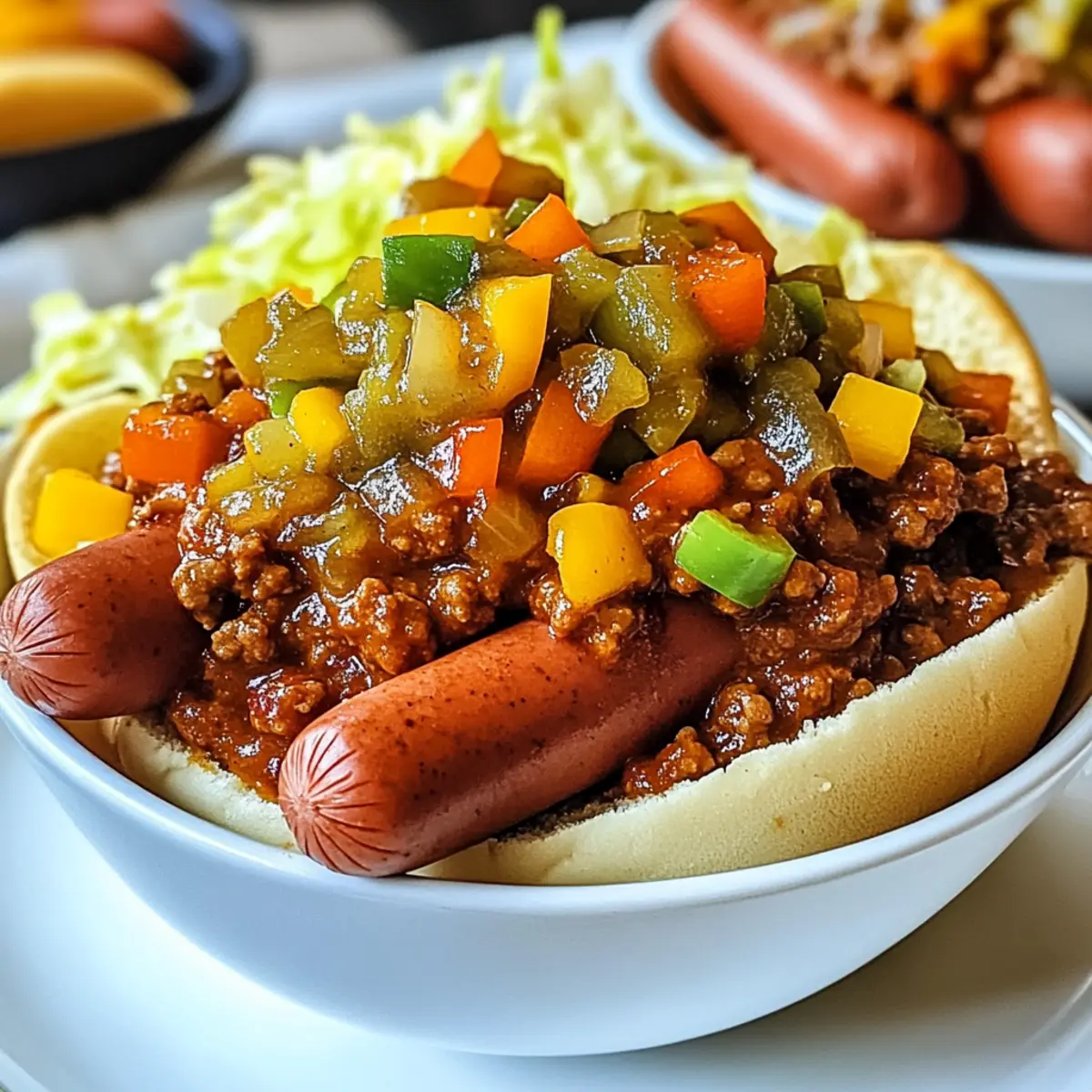 Als meine Freunde beim letzten Spieltag um die letzten Stücke von meinem Ultimate Hot Dog Chili kämpften, wusste ich, dass ich etwas Besonderes kreiert hatte. Dieses Chili verwandelt ganz gewöhnliche Würstchen in ein herzhaftes Erlebnis, das Erinnerungen an warme Sommerabende und Grillpartys weckt. Egal, ob ihr Gluten meiden oder eine vegetarische Version mit Linsen und Pilzen probieren möchtet, dieses Rezept passt sich spielend jeder Vorliebe an. Die Zubereitung ist schnell und einfach, perfekt für gemütliche Familienessen oder an aufregenden Spieltagen. Seid ihr bereit, eure Grillkünste auf ein ganz neues Level zu heben? Warum ist dieses Rezept ein Muss? Einfachheit: Die Zubereitung dieses Chilis ist unkompliziert und benötigt nur grundlegende Kochfähigkeiten – sodass jeder es meistern kann. Vielseitigkeit: Egal, ob ihr Fleischliebhaber oder Vegetarier seid, diese Rezeptur bietet Anpassungen für jeden Geschmack, wie die köstliche Kombination von Linsen und Pilzen. Herzhafter Geschmack: Mit einer Mischung aus Gewürzen und frisch gegrillten Würstchen bietet dieses Chili eine Geschmacksexplosion, die man nicht vergessen kann. Perfekte Partyoption: Ob beim Spieltag oder einfach nur für ein gemütliches Abendessen, dieses Chili wird garantiert Ihre Gäste beeindrucken und ihre Teller füllen. Zeitersparnis: In weniger als einer Stunde zubereitet, könnt ihr schnell und einfach ein großartiges Gericht auf den Tisch bringen. Gesunde Alternativen: Nutzt glutenfreie Brötchen oder ersetzt das Fleisch durch eine pflanzliche Variante und genießt dennoch ein authentisches Geschmackserlebnis. Hot Dog Chili Zutaten Für die Chili-Basis Braune Zwiebel – Verleiht der Chili Süße und Tiefe; Alternativ: Verwenden Sie gelbe oder süße Zwiebeln für einen milderen Geschmack. Butter – Dient zum Anbraten der Zwiebel und verleiht Reichhaltigkeit. Meersalz – Unverzichtbar zur Geschmacksverstärkung. Gemahlener Pfeffer – Sorgt für milde Schärfe; nach Belieben anpassen. Chilipulver – Verleiht dem Chili einen reichen Geschmack; kann durch geräuchertes Paprikapulver für zusätzliche Rauchnote ersetzt werden. Granulierter Knoblauchpulver – Sorgt für einen kräftigen Knoblauchgeschmack; Frischer Knoblauch kann verwendet werden; Menge entsprechend anpassen. Getrockneter Oregano – Ergänzt die Aromen mit erdigen Noten; Alternativ kann frischer Oregano verwendet werden. Getrockneter Kreuzkümmel – Bringt eine essentielle, warme, erdige Note in das Chili. Rinderhackfleisch – Hauptproteinquelle, die dem Chili Fülle verleiht; Alternativ: Linsen und Pilze für eine vegetarische Option verwenden. Bier (Pub Ale) – Verbessert die Geschmacksintensität; Alternativ: Brühe für eine alkoholfreie Version verwenden. Salsa – Führt zu einer pikanten und feuchten Basis; wählen Sie Ihre Lieblingssorte. Refried Beans – Dickt die Mischung und sorgt für Cremigkeit; Schwarze Bohnen als Variation verwenden. Für die Garnitur Gegrillte Würstchen – Stars des Gerichts; kann auch Geflügel- oder pflanzenbasierte Würstchen verwendet werden. Hot Dog Brötchen – Geröstete Brötchen verbessern die Textur; glutenfreie Brötchen sind für besondere Ernährungsbedürfnisse erhältlich. Paprika – Bringt Knusprigkeit und Farbe in die Garnitur; jede Farbe kann verwendet werden. Dillgurken – Sorgt für eine pikante Note in der Garnitur; süße Gurken können alternativ verwendet werden. Geriebener grüner Kohl – Sorgt für Frische und Knusprigkeit; andere Blattgemüse können ebenfalls benutzt werden. Gehackte Zwiebel – Für zusätzliche Frische in der Garnitur; unterschiedliche Zwiebelvarianten können verwendet werden. Apfelessig – Verleiht eine säuerliche Note; Alternativen sind weißer Essig oder Zitronensaft. Gelber Senf – Klassischer Begleiter für Hot Dogs; Dijon-Senf für eine interessante Abwandlung verwenden. Schritt-für-Schritt-Anleitung für Ultimate Hot Dog Chili Step 1: Zwiebel anbraten Erhitze 2 Esslöffel Butter in einem großen Topf bei mittlerer Hitze. Füge 1 gewürfelte braune Zwiebel hinzu und brate sie etwa 5 Minuten lang, bis sie glasig und weich ist. Achte darauf, dass sie nicht anbrennt, denn das gibt dem Hot Dog Chili eine tolle Basis mit süßem Geschmack. Step 2: Gewürze hinzufügen Streue 1 Teelöffel Meersalz, ½ Teelöffel gemahlenen Pfeffer, 2 Esslöffel Chilipulver, ½ Teelöffel Knoblauchpulver, 1 Teelöffel getrockneten Oregano und ½ Teelöffel Kreuzkümmel in den Topf. Rühre alles für etwa 1-2 Minuten um, bis die Gewürze zu duften beginnen. Diese Aromen machen dein Chili besonders würzig und einladend. Step 3: Rinderhackfleisch braten Gib 1 Pfund Rinderhackfleisch zum Gewürzmix im Topf. Zerkleinere das Fleisch mit einem Holzlöffel und brate es etwa 6-8 Minuten lang, bis es gründlich gebräunt und nicht mehr rosa ist. Dies erfolgt bei mittlerer Hitze und ist entscheidend für den herzhaften Geschmack deines Hot Dog Chilis. Step 4: Flüssigkeiten hinzufügen Gieße 1 Tasse Bier (oder Brühe) und 2 Tassen Salsa in den Topf. Rühre alles gut durch, um die Aromen zu kombinieren, und lasse es für etwa 2-3 Minuten köcheln. Dies sorgt dafür, dass sich die Zutaten gut vermischen und eine aromatische Basis für dein Chili bilden. Step 5: Refried Beans einrühren Incorporiere eine Dose Refried Beans und rühre sie gut unter die Mischung. Reduziere die Hitze und lasse das Chili 20-30 Minuten lang ohne Deckel köcheln, dabei gelegentlich umrühren, bis es eingedickt ist. Diese Phase ist entscheidend, um die Aromen zu intensivieren und das Chili perfekt zuzubereiten. Step 6: Relish zubereiten Während das Chili simmert, kombinierst du gewürfelte Paprika, Dillgurken, geriebenen grünen Kohl, gehackte Zwiebeln, Apfelessig und gelben Senf in einer Schüssel. Mische alles gründlich, um ein frisches und knackiges Relish zu erhalten, das das Hot Dog Chili perfekt ergänzt. Step 7: Hot Dogs grillen und servieren Grille die Würstchen, bis sie schön 