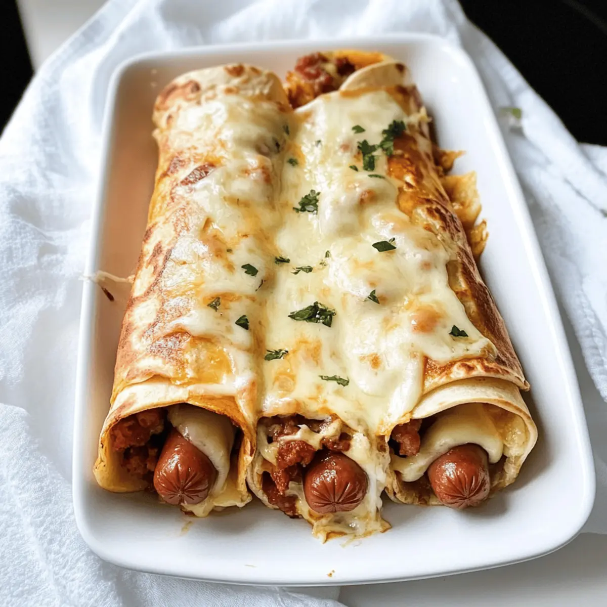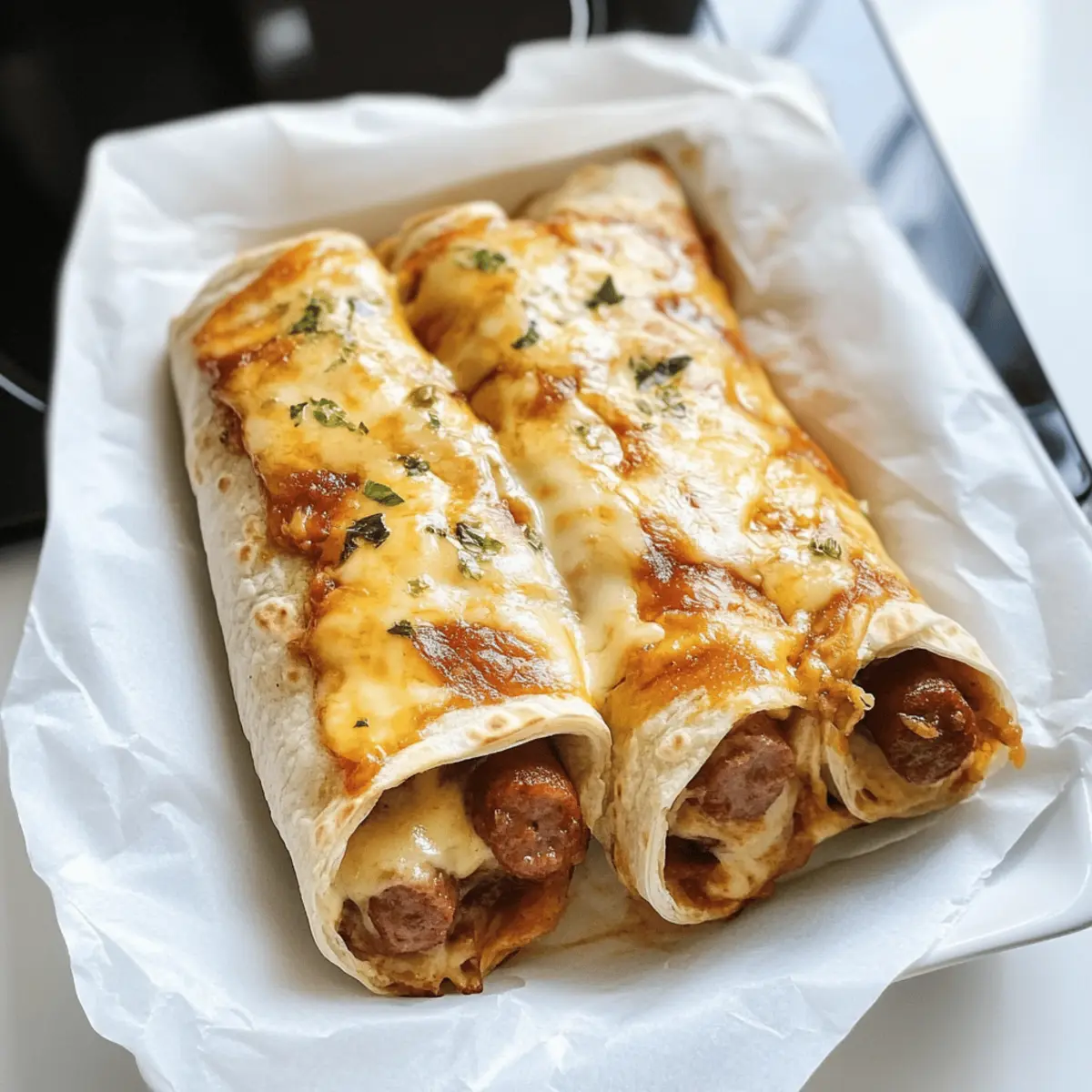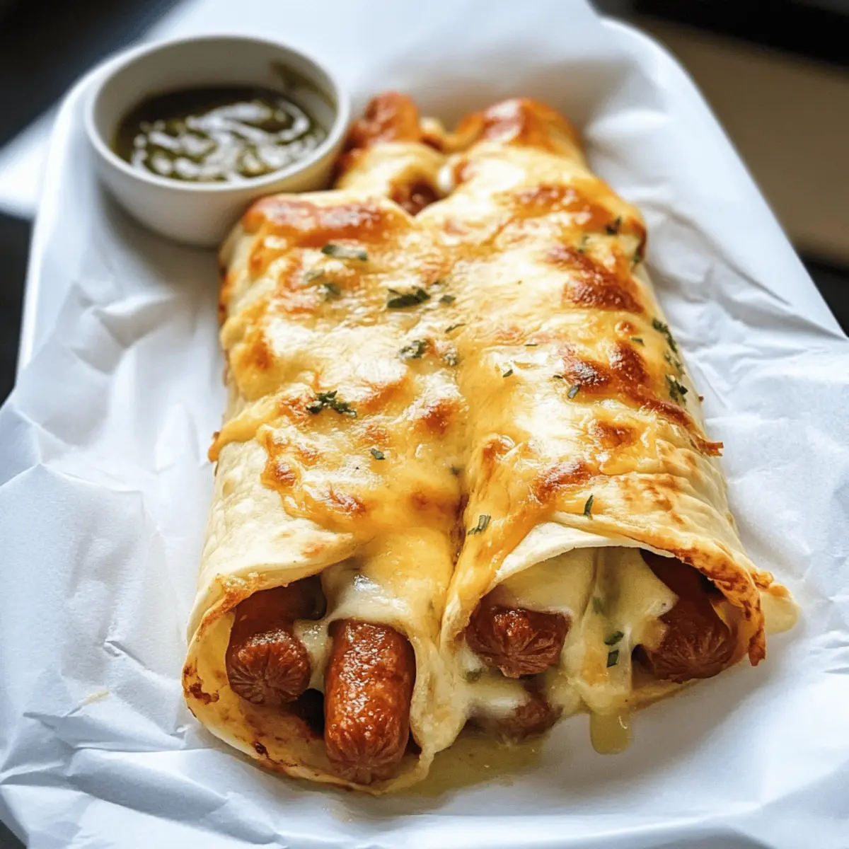 Gerade als ich mich gemütlich auf der Couch niedergelassen hatte, überkam mich der Hunger auf etwas, das sowohl knusprig als auch herzhaft ist. Voilà – diese Airfryer Hot Dog Wraps mit hausgemachter Sauce sind die Antwort auf meine kulinarische Sehnsucht! Die perfekte Kombination aus würzigen Würstchen und schmelzendem Käse, umhüllt von einem warmen Wrap, bringt das Mittagessen oder Abendessen auf ein neues Niveau. Darüber hinaus sind diese Wraps blitzschnell zubereitet und lassen sich ganz nach Belieben variieren, ob mit fleischlichen oder vegetarischen Würstchen. So wird sogar der stressigste Wochentag zum Genuss! Lust auf ein großartiges Rezept, das dir nicht nur Zeit spart, sondern auch alle Gäste begeistert? Lass uns gemeinsam in die Welt der Hot Dog Wraps eintauchen! Warum sind Hot Dog Wraps ein Hit? Schnelle Zubereitung: Diese Hot Dog Wraps sind im Handumdrehen fertig – ideal für hektische Abendessen. Vielseitigkeit pur: Egal, ob mit Fleisch- oder Veggiesticks, jeder findet hier sein Lieblingsrezept! Hausgemachte Sauce: Die selbstgemachte Hot Dog Sauce verleiht dem Gericht eine besondere Note, die du so in Fast Food nicht findest. Köstlicher Komfort: Diese Wraps kombinieren den herzhaften Geschmack von Würstchen mit dem schmelzenden Genuss von Käse – ein echter Gaumenschmaus! Perfekt für die ganze Familie: Die Wraps sind bei Groß und Klein beliebt und eignen sich hervorragend für jede Feier oder einfach für einen gemütlichen Abend zu Hause. Einfache Lagerung: Reste lassen sich problemlos im Kühlschrank aufbewahren und sind schnell wieder aufgewärmt. Du kannst sogar mit dieser Rezept-Varianten spielen, um immer wieder neue Geschmäcker zu entdecken! Hot Dog Wraps Zutaten Für die Sauce • 1 Zwiebel (Onion) – Fügt Süße und Geschmackstiefe hinzu; kann durch Schalotten für einen milderen Geschmack ersetzt werden. • 3 kleine saure Gurken (Pickles) – Sorgt für Crunch und Würze; verwende Dillpickles für intensiveren Geschmack. • 100 g Mayonnaise – Verleiht Cremigkeit und Reichhaltigkeit; für eine pflanzliche Option veganen Mayo nutzen. • 150 g Schmand oder Creme Vega (Sour Cream or Vegan Alternative) – Steigert die Cremigkeit; griechischer Joghurt kann als Substitute verwendet werden. • 2 TL Senf (Mustard) – Fügt Schärfe hinzu; teste ganzem Senf für zusätzliche Textur. • 2 TL Currypulver (Curry Powder) – Infundiert Wärme und Komplexität; die Menge nach Geschmack anpassen. • 1/4 TL Salz – Essentiell zur Geschmacksverbesserung; je nach diätetischen Bedürfnissen anpassen. • Pfeffer (Pepper) – Fügt Würze hinzu; frisch gemahlener Pfeffer bietet den besten Geschmack. Für die Wraps • 4-6 Wraps – Die Basis für die Wraps; glutenfreie Wraps können als Alternative verwendet werden. • 8-12 Würstchen (Sausages) – Hauptproteine; wähle zwischen Rind, Schwein oder vegetarischen Optionen nach Vorliebe. • Röstzwiebeln (Fried Onions) – Bietet Crunch und zusätzliche Aromen; kann weggelassen werden, wenn gewünscht. • 4-6 Käse-Scheiben (Cheese Slices) – Fügt Cremigkeit und Geschmack hinzu; veganer Käse kann verwendet werden. • Geriebener Käse (Grated Cheese) – Wird zum Topping verwendet; kann durch Nährhefe für eine milchfreie Option ersetzt werden. • 1 EL Tomatenmark (Tomato Paste) – Verleiht der Sauce Tiefe; Tomatenpüree kann als Substitute genutzt werden. Für das Servieren • Ketchup (optional) – Zum Servieren; wähle hausgemachten oder im Geschäft gekauften nach Vorliebe. Diese köstlichen Hot Dog Wraps sind die perfekte Lösung, um sowohl dich als auch deine Gäste zu begeistern! Schritt-für-Schritt-Anleitung für Airfryer Hot Dog Wraps Step 1: Sauce vorbereiten Schneide die Zwiebel und die sauren Gurken in feine Stücke. Vermenge diese mit Mayonnaise, Schmand, Senf, Currypulver, Salz und frisch gemahlenem Pfeffer in einer Schüssel. Rühre alles gründlich, bis die Mischung cremig und gut vermengt ist. Diese hausgemachte Sauce wird deinem Hot Dog Wraps einen kräftigen Geschmack verleihen. Step 2: Wraps vorbereiten Lege die Wraps auf eine saubere Arbeitsfläche und verstreiche eine dünne Schicht der vorbereiteten Hot Dog Sauce auf jedem Wrap. Platziere einige Käsescheiben und die Würstchen in der Mitte der Wraps. Klappe die Seiten der Wraps ein und rolle sie dann fest auf, damit die Füllung nicht herausfällt. Achte darauf, dass alles gut verpackt ist. Step 3: Airfryer-Routine Liniere den Airfryer-Korb mit Backpapier und platziere die Roll-Wraps darin. Bestreiche die Oberseite der Wraps leicht mit der Hot Dog Sauce und streue geriebenen Käse darüber. Erhitze den Airfryer auf 200 °C und koche die Wraps für 10 Minuten. Sie sollten golden braun und knusprig sein, wenn sie fertig sind. Step 4: Ofen-Methode Wenn du den Backofen bevorzugst, heize ihn auf 200-220 °C vor. Lege die Wraps in eine Auflaufform und bestreiche die Oberseite erneut mit der Sauce. Streue den geriebenen Käse gleichmäßig darüber und backe sie für etwa 20 Minuten. Sie sind fertig, wenn die Käseoberfläche blubbert und eine goldene Farbe angenommen hat. Step 5: Servieren Nimm die Hot Dog Wraps aus dem Airfryer oder Ofen und lasse sie kurz abkühlen. Serviere die Wraps warm, garniert mit knusprigen Röstzwiebeln und zusätzlichen Hot Dog Sauce oder Ketchup. Diese köstlichen Hot Dog Wraps sind perfekt für einen gemütlichen Abend oder ein schnelles Mittagessen! Was passt zu Hot Dog Wraps? Diese köstlichen Wraps sind nicht nur ein Genuss für sich, sondern lassen sich auch wunderbar mit weiteren Beilagen kombinieren! Crispy Salat: Ein frischer, knackiger Salat bringt zusätzliche Frische ins Spiel und ergänzt die herzhaften Wraps perfekt. Süßkartoffel-Pommes: Diese süßen und salzigen Pommes sind eine köstliche Ergänzung und bieten einen schönen Kontrast zu den Wraps. Eingelegtes Gemüse: Ein bisschen eingelegtes Gemüse bringt Säure und Crunch und harmoniert hervorragend mit der würzigen Füllun