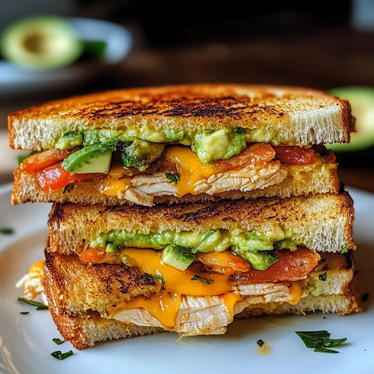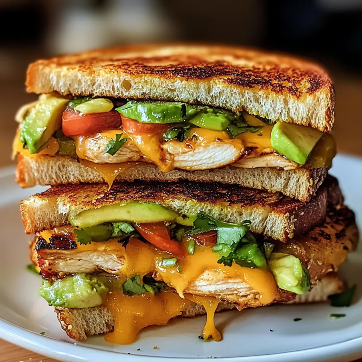 Während ich durch den Markt schlenderte, fiel mir der verführerische Duft von frisch gegrilltem Hühnchen in die Nase. Der Gedanke an ein Hühnchen-Avocado-Schmelz-Sandwich ließ mir das Wasser im Mund zusammenlaufen. Dieses köstliche Sandwich kombiniert saftiges, gegrilltes Hühnchen mit cremigem Avocado und geschmolzenem Käse – eine absolute Freude für den Gaumen! Und das Beste daran? Es ist eine schnelle Lösung für Lunch oder Dinner, ideal für hektische Tage, an denen man keine Zeit verschwenden möchte. Egal, ob Sie bei einer Familienfeier Eindruck schinden oder einfach nur sich selbst etwas Gutes tun wollen, dieses Rezept zaubert im Nu ein Lächeln auf Ihr Gesicht. Also, bereit, etwas richtig Köstliches zu zaubern? Warum werden Sie dieses Rezept lieben? Einfachheit pur: Die Zubereitung ist unkompliziert und benötigt keine speziellen Kochkünste. Schnell und lecker: Perfekt für ein schnelles Mittagessen oder Abendessen, wenn die Zeit drängt. Vielseitig: Experimentieren Sie mit verschiedenen Käsesorten oder der Verwendung von Tofu anstelle von Hühnchen. Kräftiger Geschmack: Die Kombination aus saftigem Hühnchen, cremiger Avocado und geschmolzenem Käse sorgt für ein Geschmackserlebnis, das Sie lieben werden. Ideale Textur: Ein knuspriges Äußeres und ein schmelzender, herziger Innenraum – eine perfekte Kombination! Großes Publikum: Dieses Sandwich eignet sich hervorragend für gesellige Anlässe oder einfach zum Genießen zu Hause. Wenn Sie auf der Suche nach weiteren inspirierenden Rezepten sind, schauen Sie sich auch unser Rezept für schnelle und gesunde Sandwiches an! Hühnchen-Avocado-Schmelz-Sandwich Zutaten Wichtiger Hinweis: Um das beste Hühnchen-Avocado-Schmelz-Sandwich zu kreieren, wählen Sie frische und reife Zutaten! Für das Sandwich: Hühnchenbrust ohne Knochen und Haut – die Hauptquelle für Protein; grillen Sie es, bis die Säfte klar sind für den besten Geschmack. Avocado – sorgt für Cremigkeit und gesunde Fette; reife Avocados bieten das beste Aroma. Käse (Schweizer, Cheddar oder Provolone) – fügt geschmolzene Reichhaltigkeit hinzu; verwenden Sie Ihren Lieblingskäse oder eine Kombination für Abwechslung. Brot – gibt Struktur; wählen Sie Vollkorn für zusätzliche Nährstoffe oder Sauerteig für eine säuerliche Note. Für die Sauce: Mayonnaise – verbessert die Cremigkeit und Feuchtigkeit; substituieren Sie mit griechischem Joghurt für eine gesündere Option. Dijon-Senf – fügt eine würzige Note hinzu; kann weggelassen werden, wenn Sie es milder mögen. Für die Frische: Rote Zwiebel und Tomate – bringen zusätzliche Frische und Crunch; verwenden Sie frische Zutaten für lebendigen Geschmack. Schritt-für-Schritt-Anleitung für das Hühnchen-Avocado-Schmelz-Sandwich Step 1: Hühnchen würzen Würzen Sie die Hühnchenbrust großzügig mit Salz und Pfeffer, um den Geschmack zu intensivieren. Legen Sie das Fleisch zur Seite, während Sie die Pfanne vorbereiten. Dies sorgt dafür, dass die Gewürze gut einziehen und Ihr Hühnchen-Avocado-Schmelz-Sandwich ein unverwechselbares Aroma erhält. Step 2: Hühnchen kochen Erhitzen Sie 2 Esslöffel Olivenöl in einer beschichteten Pfanne bei mittlerer bis hoher Hitze. Legen Sie die Hühnchenbrust in die Pfanne und braten Sie sie 6-7 Minuten auf jeder Seite, bis sie goldbraun ist und die Säfte klar herauslaufen. Nehmen Sie das Hühnchen aus der Pfanne und lassen Sie es für einige Minuten ruhen. Step 3: Zutaten vorbereiten Während das Hühnchen ruht, schneiden Sie die Avocado, den Käse, die rote Zwiebel und die Tomate in dünne Scheiben. Vin der Frische dieser Zutaten hängt das Geschmacksprofil Ihres Hühnchen-Avocado-Schmelz-Sandwich ab, also wählen Sie die besten frischen Zutaten aus. Step 4: Sandwich zusammenstellen Verteilen Sie eine großzügige Menge Mayonnaise und Dijon-Senf auf zwei Scheiben Brot. Legen Sie das Hühnchen auf das Brot, gefolgt von einer Schicht cremiger Avocado, dem geschnittenen Käse und einer Handvoll frischer Zwiebel- und Tomatenscheiben. Decken Sie das Sandwich mit den anderen Brotscheiben ab und drücken Sie leicht darauf, um es zusammenzuhalten. Step 5: Sandwich grillen In der gleichen Pfanne, in der Sie das Hühnchen gekocht haben, fügen Sie ein wenig Butter oder Olivenöl hinzu und erhitzen Sie sie bei mittlerer Hitze. Legen Sie die Sandwiches hinein und grillen Sie jedes Sandwich 3-4 Minuten pro Seite, bis das Brot goldbraun und der Käse geschmolzen ist. Achten Sie darauf, die Sandwiches nicht zu überfüllen, um ein gleichmäßiges Grillen zu gewährleisten. Step 6: Warm servieren Lassen Sie die Sandwiches nach dem Grillen kurz abkühlen, bevor Sie sie diagonal durchschneiden. Diese kurze Wartezeit hilft, die Füllung zu setzen und das Sandwich einfacher zu handhaben. Servieren Sie Ihr Hühnchen-Avocado-Schmelz-Sandwich warm, um die köstlichen Aromen voll zur Geltung zu bringen. Tipps für das beste Hühnchen-Avocado-Schmelz-Sandwich Hühnchen ruhen lassen: Lassen Sie das Hühnchen nach dem Kochen für einige Minuten ruhen, um die Säfte zu bewahren und das Fleisch zart zu halten. Die richtige Hitze: Grillen Sie die Sandwiches bei mittlerer Hitze, damit das Brot schön knusprig wird, ohne dass der Käse verbrennt oder die Füllung kalt bleibt. Frische Zutaten: Wählen Sie reife Avocado und frisches Gemüse, um das Geschmackserlebnis Ihres Hühnchen-Avocado-Schmelz-Sandwichs zu maximieren. Experimentieren: Trauen Sie sich, verschiedene Käsesorten oder sogar Kräuter hinzuzufügen, um neue Aromen zu entdecken, die das Sandwich aufpeppen. Pressen beim Grillen: Verwenden Sie einen Spatel, um sanften Druck auf das Sandwich auszuüben, während Sie es grillen, damit der Käse gleichmäßig schmilzt. Was passt gut zu einem Hühnchen-Avocado-Schmelz-Sandwich? Ein köstliches Sandwich ist nur der Anfang für eine herzliche Mahlzeit, die alle Sinne anspricht. Bunte Gartensalat: Dieser frische Salat bringt eine Vielzahl von Texturen und Aromen mit kna