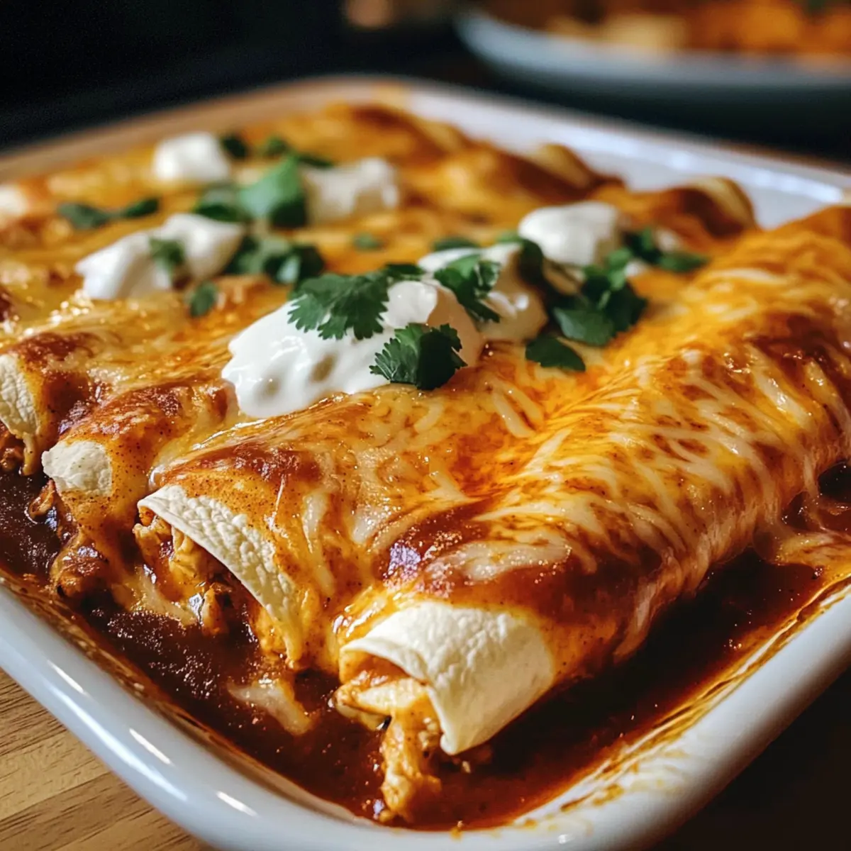 • Verpackte Variante: Mache einen Enchiladatablett, indem du die gefüllten Tortillas übereinander schichtest und mit Sauce und Käse überbackst. Eine praktische Art, mehrere Portionen zu servieren!