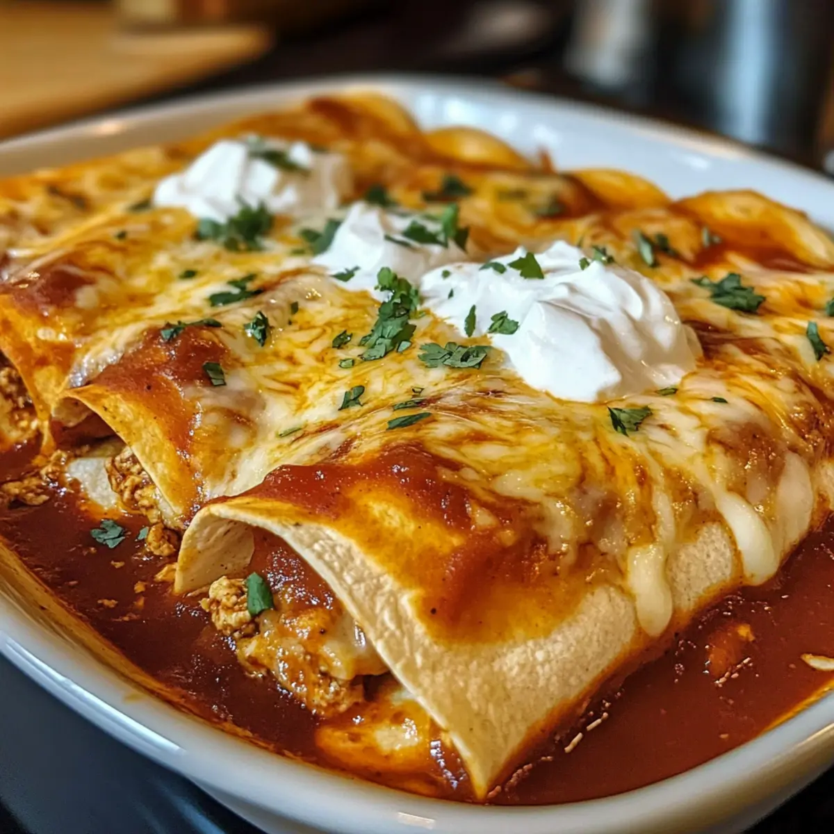 Lasse die Hühnchen Enchiladas nach dem Backen kurz ruhen, damit der Käse etwas fester wird. Garniere die Enchiladas mit frischem Koriander und serviere sie zusammen mit Sauerrahm. Diese köstlichen Enchiladas sind der perfekte Höhepunkt eines gemütlichen Abends, bereit, deine Familie und Freunde zu begeistern.