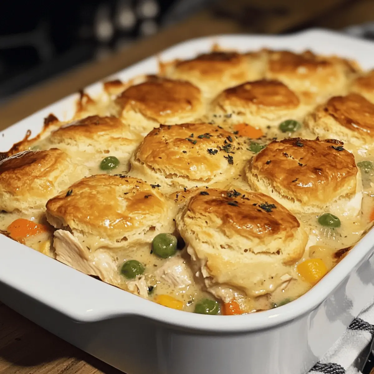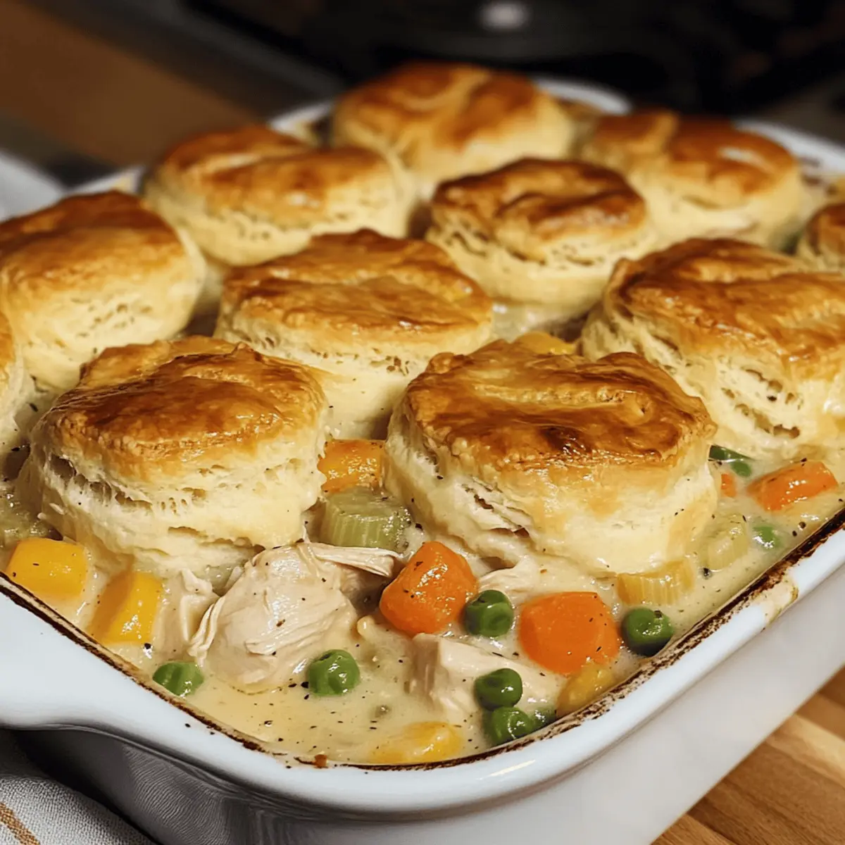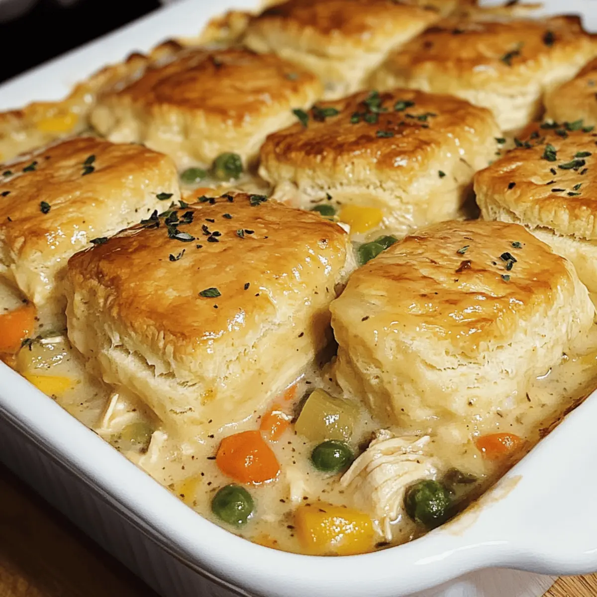 In einer kleinen, gemütlichen Küche war der Duft von frisch gebackenem Auflauf unverkennbar. Der Gedanke, die ganze Familie um den Tisch zu versammeln, erfüllte mich mit Freude. Mein Rezept für einen Hühnchen-Pot-Pie-Auflauf vereint zartes Hühnchen und knackiges Gemüse in einer cremigen Sauce, alles gekrönt von einem fluffigen Biscuit-Topping. Diese einfache und schnelle Zubereitung sorgt dafür, dass wir mehr Zeit miteinander verbringen können, ohne auf den leckersten Komfort zu verzichten. Außerdem ist der Auflauf perfekt für Reste – wenn es denn überhaupt welche gibt! Bereit, herauszufinden, wie dieses warme Gericht in deinem Zuhause zum neuen Lieblingsessen werden kann? Warum wirst du dieses Rezept lieben? Simplicity: Die Zubereitung dieses Auflaufs könnte nicht einfacher sein und benötigt keine komplizierten Kochkenntnisse – perfekt für den hektischen Alltag. Herzhafter Geschmack: Die Kombination von zartem Hühnchen, frischem Gemüse und einer cremigen Sauce sorgt für ein unvergleichliches Geschmackserlebnis, das die Sinne verwöhnt. Zeitersparnis: Mit der Möglichkeit, rotisserie Hühnchen zu verwenden, lässt sich dieses Gericht im Handumdrehen zubereiten, sodass du mehr Zeit mit deinen Liebsten verbringen kannst. Vielseitigkeit: Dieser Auflauf lässt sich leicht anpassen! Experimentiere mit verschiedenen Gemüsesorten oder verwende glutenfreie Alternativen, um deinen Bedürfnissen gerecht zu werden. Köstliche Reste: Solltest du tatsächlich Reste haben, schmeckt der Auflauf am nächsten Tag sogar noch besser – ideal für ein schnelles Mittagessen! Lass dich von der warmen, einladenden Atmosphäre dieses Hühnchen-Pot-Pie-Auflaufs begeistern und entdecke, warum er bei Familienessen so beliebt ist. Hühnchen-Pot-Pie-Auflauf Zutaten Hinweis: Alle Zutaten tragen zur köstlichen Füllung und dem zarten Teig bei, um dein neues Lieblingscomfort-Food zu kreieren! Gekochtes Hühnchen – Hauptproteinquelle, die das Gericht herzhaft macht; ideal ist rotisserie Hühnchen für schnellen Genuss. Gefrorenes Gemüse – Praktisch und zeitsparend; eine Mischung aus Erbsen und Karotten passt hervorragend. Frisches Gemüse kann auch leicht angebraten werden. Ungesalzene Butter – Basis für die Roux und verleiht Geschmack; kann durch Olivenöl oder vegane Butter ersetzt werden, wenn du es milchfrei möchtest. Weißes Mehl – Wichtig für die Bindung der Sauce; stellt die Roux her. Vermeide Mandelmehl, da die Konsistenz variieren könnte. Hühnerbrühe – Sorgt für Tiefe im Geschmack der Füllung; auch fettarme Varianten sind möglich. Milch – Fügt Cremigkeit hinzu; kann durch pflanzliche Alternativen wie Mandel- oder Hafermilch ersetzt werden. Biscuit-Teig – Bildet die köstliche Kruste; Dosen sind praktisch, aber selbstgemachte oder Blätterteig bieten verschiedene Texturen. Vollkorn-Biscuits sind eine gesunde Variante. Lass uns nun gemeinsam diesen köstlichen Hühnchen-Pot-Pie-Auflauf zubereiten und die Freude des gemeinsamen Essens erleben! Schritt-für-Schritt-Anleitung für Hühnchen-Pot-Pie-Auflauf Schritt 1: Ofen vorheizen Heize deinen Ofen auf 190°C (375°F) vor. Dies ist eine wichtige Grundlage, um sicherzustellen, dass dein Hühnchen-Pot-Pie-Auflauf gleichmäßig und perfekt gebacken wird. Während der Ofen auf Temperatur kommt, kannst du die anderen Schritte vorbereiten. Schritt 2: Butter schmelzen Erhitze eine große Pfanne bei mittlerer Hitze und füge die ungesalzene Butter hinzu. Lasse sie schmelzen und darauf achten, dass sie nicht bräunt, etwa 1-2 Minuten. Die geschmolzene Butter ist die Basis für die Roux, die deinem Auflauf die Cremigkeit verleiht. Schritt 3: Roux herstellen Füge das Mehl, Salz, schwarzen Pfeffer, Knoblauchpulver und Zwiebelpulver zur geschmolzenen Butter hinzu. Rühre alles gut um, um eine gleichmäßige Roux zu bilden und koche diese Mischung für ca. 1-2 Minuten, bis sie leicht blubbert und beginnt, einen goldenen Farbton anzunehmen. Schritt 4: Brühe und Milch einrühren Schlage langsam die Hühnerbrühe und die Milch in die Roux ein, während du kontinuierlich rührst. Lasse die Mischung 3-5 Minuten köcheln, bis sie dickflüssig wird. Achte darauf, dass sie eine cremige Konsistenz hat, die sich leicht vom Pfannenboden löst. Schritt 5: Hühnchen und Gemüse hinzufügen Nimm die Pfanne vom Herd und mische das gekochte Hühnchen sowie das gefrorene Gemüse unter die dicke Sauce. Rühre alles gut um, bis alles gleichmäßig bedeckt ist. Diese Kombination sorgt für das herzhafte Herzstück deines Hühnchen-Pot-Pie-Auflaufs. Schritt 6: Mischung in die Backform übertragen Fette eine 9×13-Zoll (ca. 23×33 cm) Auflaufform leicht ein und gebe die Hühnchen-Gemüse-Mischung gleichmäßig hinein. Verteile sie auf der gesamten Fläche, sodass der Auflauf beim Backen gleichmäßig aufgeht und die Aromen gut miteinander vermischt werden. Schritt 7: Biscuit-Teig vorbereiten Nimm den Biscuit-Teig und forme ihn auf einer bemehlten Fläche nach Belieben. Du kannst die einzelnen Biscuit-Stücke leicht plattdrücken. Platziere die flachen Biscuits gleichmäßig auf der Hühnchenmischung in der Auflaufform. Dies sorgt für eine köstliche Kruste beim Backen. Schritt 8: Backen Schiebe die Backform in den vorgeheizten Ofen und lasse den Hühnchen-Pot-Pie-Auflauf für etwa 25-30 Minuten backen. Halte Ausschau nach einer goldbraunen Farbe auf den Biscuits sowie einem blubbernden, köstlichen Inneren. Schritt 9: Auskühlen lassen Nach dem Backen nimm den Auflauf aus dem Ofen und lasse ihn für 5 Minuten ruhen. Dies gibt der Füllung Zeit, sich zu setzen, bevor du den Hühnchen-Pot-Pie-Auflauf anschneidest. Die Aromen entwickeln sich weiter und das Gericht wird perfekt servierfertig. Was passt gut zum Hühnchen-Pot-Pie-Auflauf? In einem gemütlichen Ambiente, ergänzt mit frischen Aromen, wird jedes Gericht zur Einladung, den gemeinsamen Gaumen zu erfreuen. Frischer grüner Salat: Ein leichter, knackiger Salat mit einem zitronigen Vinaigrette