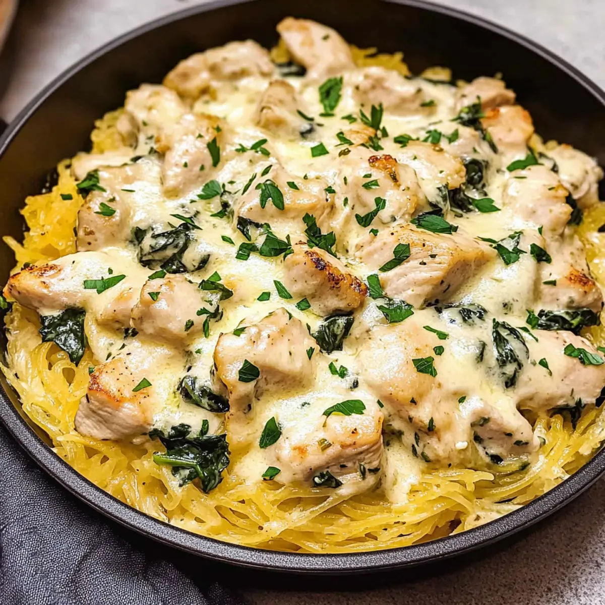 Diese Hühnchen und Spinat Spaghetti Kürbis Alfredo ist ideal für eine stressfreie Mahlzeit, die du im Voraus zubereiten kannst! Um Zeit zu sparen, kannst du den Spaghetti Kürbis bis zu 24 Stunden vorher rösten und die Stränge im Kühlschrank aufbewahren. Das angebratene Hühnchen und der Spinat können ebenfalls innerhalb von 3 Tagen vorgekocht werden – einfach in einem luftdichten Behälter im Kühlschrank lagern. Wenn du bereit bist zu genießen, erhitze die Hühnchen-Spinat-Mischung sanft in einer Pfanne und füge die vorbereiteten Kürbisstränge sowie die Soßenzutaten hinzu. Durch das schonende Erhitzen bleibt die Qualität hervorragend, und du hast mit minimalem Aufwand ein köstliches, gesundes Abendessen!