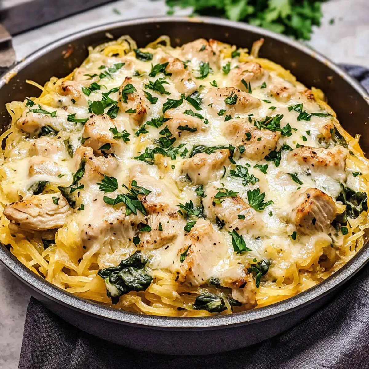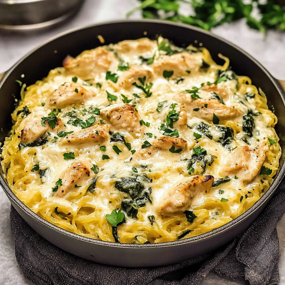Vor dem Servieren solltest du das Hühnchen und Spinat Spaghetti Kürbis Alfredo mit gehackter Petersilie garnieren. Das bringt nicht nur Farbe, sondern auch einen frischen Geschmack dazu. Serviere das Gericht heiß und genieße die gesunde und köstliche Option!