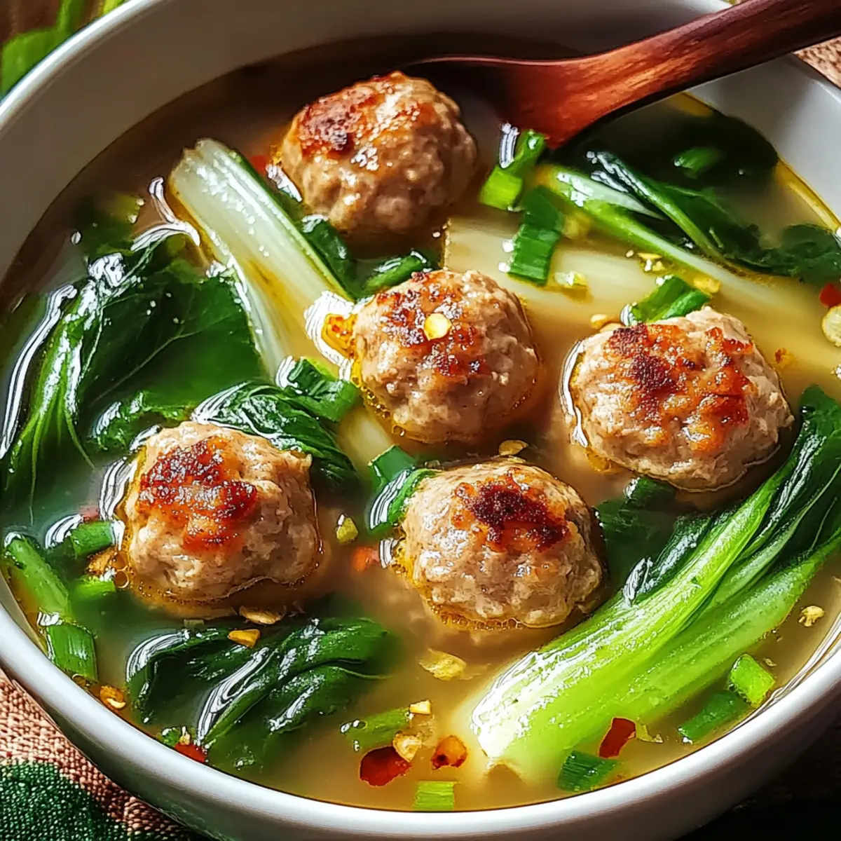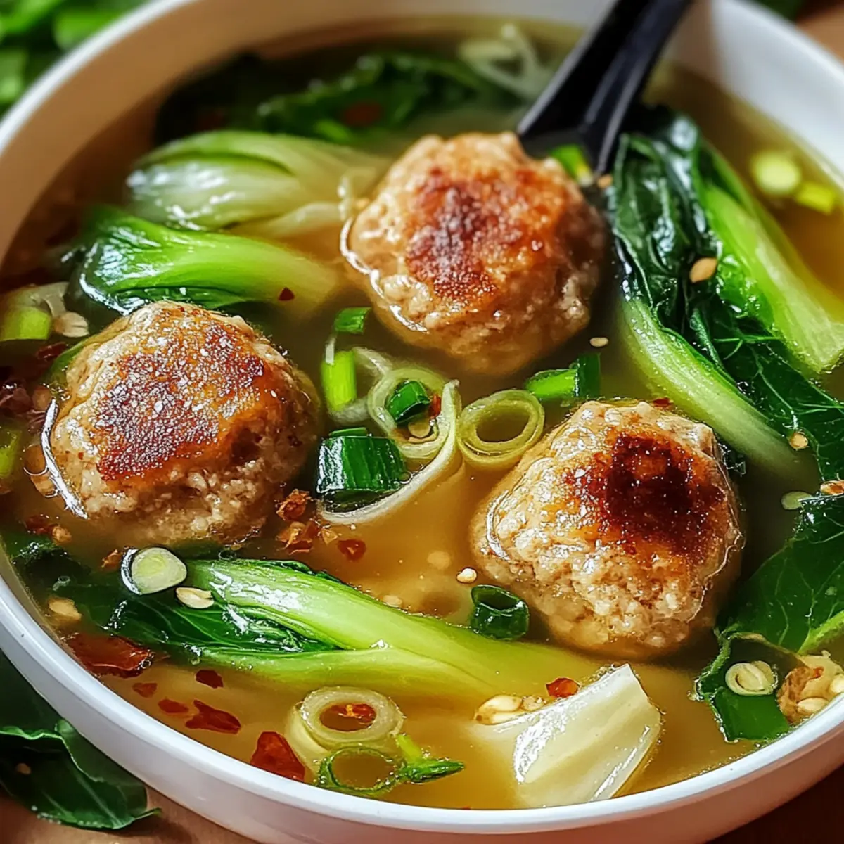 Ich hatte neulich einen dieser Tage, an denen ich einfach nach etwas Warmem und Beruhigendem verlangte – und da kam mir die Ingwer-Hühnchen-Fleischball-Suppe in den Sinn. Diese asiatisch inspirierte Suppe vereint zarte, im Ofen gebackene Fleischbällchen mit einem aromatischen Ingwer-Knoblauch-Bouillon und frischem Baby-Bok-Choy. In nur 40 Minuten zubereitet, ist sie perfekt für hektische Abende, an denen man trotzdem nicht auf gutes Essen verzichten möchte. Zudem ist sie nicht nur budgetfreundlich, sondern auch leicht und nährstoffreich. Wer kann da schon widerstehen? Lass uns gemeinsam eintauchen in diese köstliche Suppe und herausfinden, wie sie zu deinem neuen Lieblingsrezept werden kann! Warum wirst du diese Suppe lieben? Wärme und Gemütlichkeit: Diese Ingwer-Hühnchen-Fleischball-Suppe bringt sofortige Behaglichkeit in kalten Tagen. Einfache Zubereitung: Mit nur 40 Minuten Kochzeit ist sie perfekt für hektische Abendessen. Vielseitigkeit: Du kannst die Zutaten leicht anpassen, sei es durch glutenfreie Alternativen oder das Hinzufügen von frischen Gemüse wie Shiitake-Pilzen. Gesunde Wahl: Mit wenigen Kalorien und nährstoffreichen Inhaltsstoffen ist sie ideal für eine leichte, gesunde Ernährung. Köstlicher Geschmack: Die Kombination aus aromatischem Ingwer und zarten Fleischbällchen bietet ein unvergleichliches Geschmackserlebnis, das dich an dein Lieblingsrestaurant erinnert. Entdecke auch alternative Rezepte, um diese Köstlichkeit immer wieder neu zu gestalten! Ingwer-Hühnchen-Fleischball-Suppen-Zutaten • Perfekte Kombination für ein schnelles Abendessen. Für die Fleischbällchen Gemahlenes Hühnchen – Hauptproteinquelle, die Feuchtigkeit und Textur bietet. Ersetze es durch Puten- oder Rinderhack für unterschiedliche Geschmacksrichtungen. Frische geriebene Ingwer (für Fleischbällchen) – Verstärkt die Geschmacksintensität. Bei Bedarf kann auch pulverisierter Ingwer verwendet werden, aber frisch ist bevorzugt für mehr Aroma. Frischer Knoblauch – Fügt aromatische Tiefe hinzu; verwende frischen Knoblauch für die besten Ergebnisse. Sojasauce – Sorgt für Umami und Würze in den Fleischbällchen. Tamari kann für eine glutenfreie Variante verwendet werden. Sesamöl – Verleiht einen nussigen Geschmack; nach Geschmack anpassen. Semmelbrösel – Bindet die Fleischbällchen. Nutze glutenfreie Brösel als Alternative. Ei – Bindet die Zutaten der Fleischbällchen. Salz & schwarzer Pfeffer – Würze nach Geschmack anpassen. Für die Suppe Zwiebel – Sorgt für zusätzlichen Geschmack im Bouillon. Hühnerbrühe – Basis für die Suppe, die den Geschmack intensiviert. Gemüseöl – Zum Anbraten der Zwiebeln und Frittieren der Teigstreifen. Baby-Bok-Choy – Bringt Frische und Textur in die Suppe; kann bei Bedarf durch Spinat ersetzt werden. Reisessig (optional) – Fügt dem Bouillon eine frische Note hinzu; kann weggelassen werden. Für die Garnitur Teigstreifen – Für ein knuspriges Topping. Kann weggelassen werden, wenn weniger Kohlenhydrate gewünscht sind. Zusätzliches Gemüseöl – Zum Frittieren der Teigstreifen. Diese Ingwer-Hühnchen-Fleischball-Suppe ist ein Geschmackserlebnis, das nicht nur gesund, sondern auch einfach zuzubereiten ist! Schritt-für-Schritt-Anleitung für Ingwer-Hühnchen-Fleischball-Suppe Step 1: Ofen vorheizen Heize den Ofen auf 200°C (400°F) vor und lege ein Backblech mit Backpapier aus. Dies sorgt dafür, dass die Fleischbällchen gleichmäßig gebacken werden und nicht ankleben. Sobald der Ofen die Temperatur erreicht hat, bist du bereit, die Fleischbällchen zu formen. Step 2: Fleischbällchen mixen In einer großen Schüssel kombinierst du das gemahlene Hühnchen, die gehackten Frühlingszwiebeln, 2 Teelöffel frischen Ingwer, die Hälfte des Knoblauchs, Sojasauce, Sesamöl, Semmelbrösel, das Ei, Salz und Pfeffer. Mische alle Zutaten vorsichtig, bis sie gerade so miteinander verbunden sind, um die Textur der Fleischbällchen zu erhalten. Step 3: Fleischbällchen formen Forme aus der Mischung kleine Fleischbällchen von etwa 2,5 cm Durchmesser. Platziere sie gleichmäßig auf dem vorbereiteten Backblech. Achte darauf, genug Platz zwischen den Bällchen zu lassen, damit sie beim Backen gleichmäßig garen. Schiebe das Blech für 15–18 Minuten in den Ofen, bis sie goldbraun sind und eine Kerntemperatur von 74°C (165°F) erreicht haben. Step 4: Zwiebel anbraten Erhitze in einem großen Topf bei mittlerer Hitze etwas Gemüseöl. Füge die gehackte Zwiebel hinzu und brate sie etwa 5 Minuten lang, bis sie weich und glasig ist. Dies bildet die aromatische Basis für deine Ingwer-Hühnchen-Fleischball-Suppe und sorgt für einen köstlichen Geschmack. Step 5: Ingwer und Knoblauch hinzufügen Gib den restlichen Knoblauch und den frischen Ingwer in den Topf und brate sie für etwa 30 Sekunden mit. Rühre häufig um, damit das Aroma sich entfalten kann, ohne dass die Zutaten verbrennen. Du solltest einen intensiven, würzigen Duft wahrnehmen. Step 6: Brühe zubereiten Gieße die Hühnerbrühe in den Topf und füge die verbleibende Sojasauce, optional Reisessig und den restlichen Sesamöl hinzu. Lass die Mischung zum Kochen bringen und dann 5 Minuten lang köcheln, damit sich die Aromen gut vermischen. Die Brühe sollte leicht sprudelnd, aber nicht zu stark kochen. Step 7: Bok Choy und Nudeln hinzufügen Füge den Baby-Bok-Choy und die optionalen Nudeln zur Brühe hinzu. Lasse alles für weitere 3-5 Minuten köcheln, bis der Bok Choy zart und die Nudeln weich sind. Achte darauf, dass das Gemüse seine leuchtende Farbe behält, was Frische und Knackigkeit bedeutet. Step 8: Fleischbällchen einrühren Nehme die gebackenen Fleischbällchen aus dem Ofen und füge sie zur Brühe hinzu. Rühre vorsichtig um und lasse die Suppe für weitere 2-3 Minuten köcheln, bis die Fleischbällchen durchgewärmt sind. Jetzt vereinigen sich die Aromen für die Ingwer-Hühnchen-Fleischball-Suppe. Step 9: Teigstreifen frittieren In einer kl