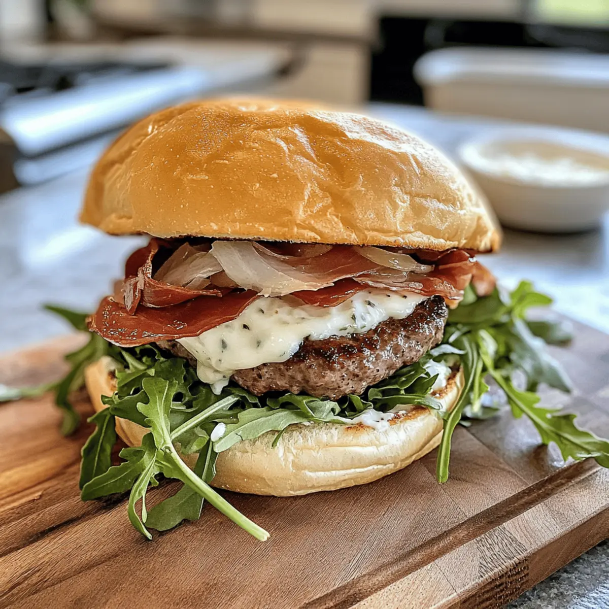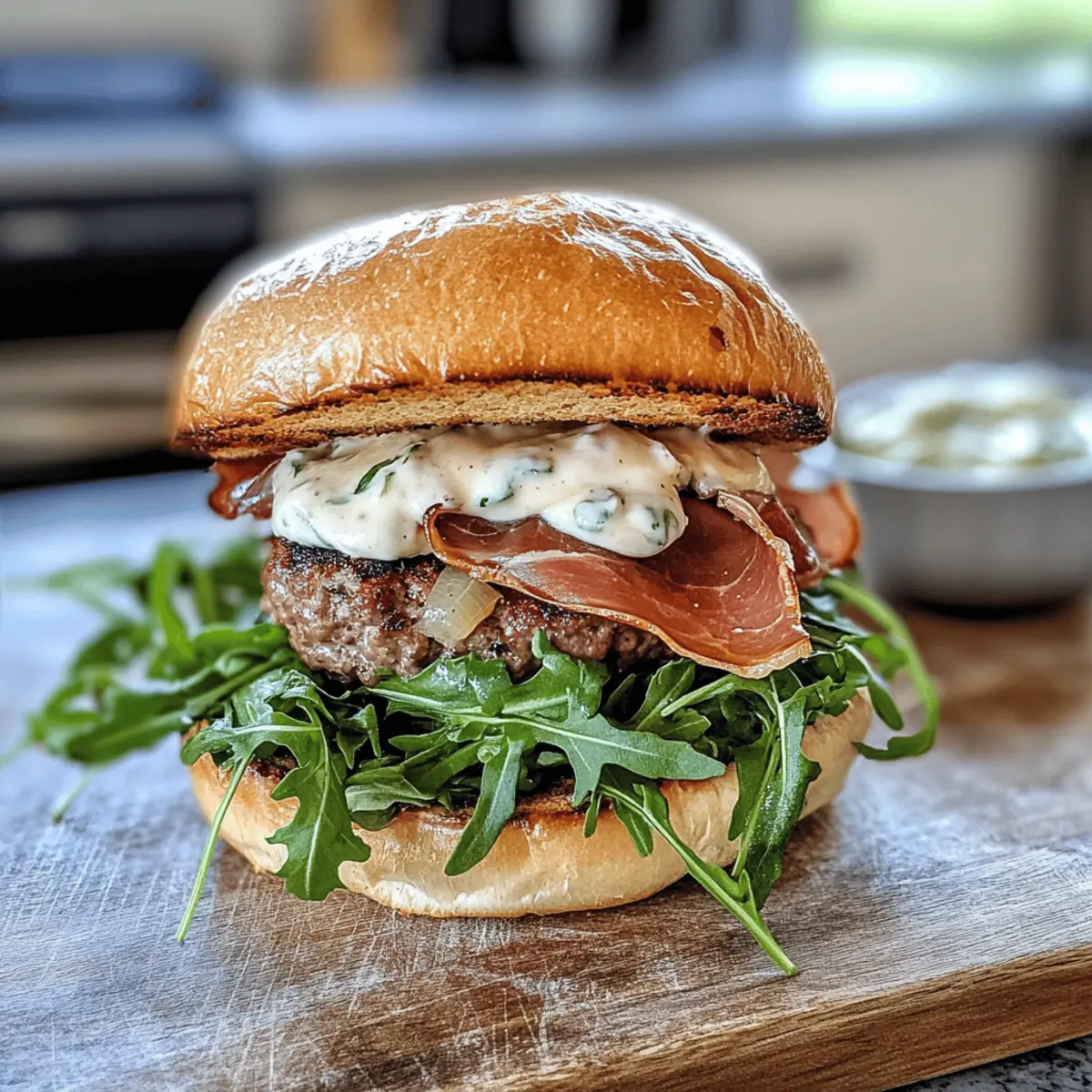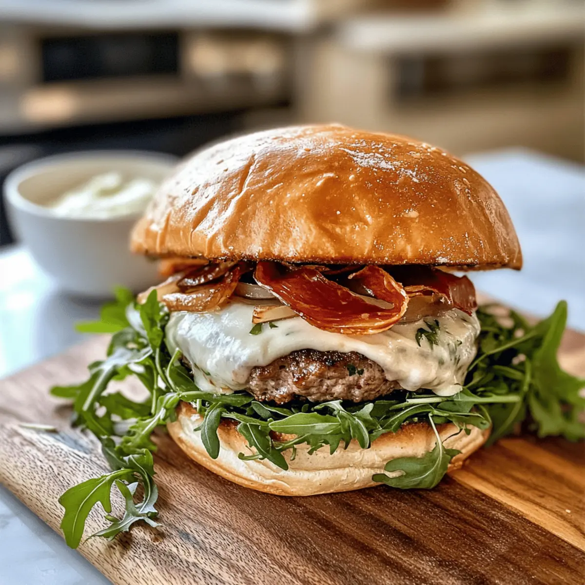 Als ich kürzlich einen kleinen Weg durch Italien unternahm, bemerkte ich überall, wo ich hinblickte, die Liebe zu gutem Essen. Kein Wunder, dass ich von der Idee eines Italienischen Burgers mit knusprigem Prosciutto begeistert war! Dieser Burger verbindet die Traditionen der italienischen Küche mit der herzhaften Schlichtheit eines Burgers und bietet eine unwiderstehliche Kombination aus saftigem Rindfleisch und schmelzendem Mozzarella. In weniger als 30 Minuten zubereitet, ist dieser Burger nicht nur perfekt für Wochenabende, sondern auch ein echter Publikumsliebling, der mit seiner knusprigen Textur und dem frischen Geschmack begeistert. Bereit, Ihre nächste Grillrunde zu revolutionieren? Lassen Sie uns gemeinsam in die Zubereitung eintauchen! Warum ist dieser Burger ein Muss? Abwechslungsreiche Aromen: Der italienische Burger kombiniert saftiges Rindfleisch mit cremigem Mozzarella und knusprigem Prosciutto, was für ein unverwechselbares Geschmackserlebnis sorgt. Schnelle Zubereitung: In nur unter 30 Minuten genießen Sie ein schmackhaftes Gericht, ideal für beschäftigte Abende! Gesunde Optionen: Für eine leichtere Variante können Sie mageres Putenfleisch oder sogar pflanzliche Alternativen verwenden. Publikumsliebling: Egal, ob bei Grillpartys oder Familienessen, dieser Burger wird garantiert die Herzen (und Mägen) aller Gäste erobern! Einfache Anpassungen: Überraschen Sie Ihre Lieben mit verschiedenen Käsevariationen wie Gorgonzola oder Provolone und entdecken Sie neue Geschmacksrichtungen. Italienischer Burger mit knusprigem Prosciutto Zutaten • Für alle, die neugierig sind, was für einen köstlichen Burger sie zubereiten können, finden Sie hier die benötigten Zutaten! Für die Patties Mageres Rinderhackfleisch – sorgt für eine proteinreiche Basis; verwenden Sie mageres Puten- oder Hühnerhack für eine leichtere Option. Dehydrierte Zwiebel – fügt Süße und Tiefe hinzu; frische Zwiebeln können ebenfalls verwendet werden. Balsamico-Essig – verstärkt den umami Geschmack des Fleisches; Apfelessig ist eine gute Alternative. Meersalz – unerlässlich für den Geschmack; kann auch mit Koscher Salz ersetzt werden. Knoblauchpulver – bietet einen kräftigen Knoblauchgeschmack; frischer gehackter Knoblauch ergänzt das Aroma. Für die Aioli Leichte Mayonnaise – dient als cremige Basis; vegane Mayo ist eine großartige pflanzliche Alternative. Knoblauchzehen – verleihen der Aioli aromatische Nuancen; gerösteter Knoblauch bietet eine süßere Note. Zitronensaft – bringt Frische in die Aioli; Weißweinessig kann in einer Notlage verwendet werden. Frisches Basilikum – sorgt für einen kräuterigen Geschmack; getrocknetes Basilikum kann in kleineren Mengen genutzt werden. Für den Burger Ciabatta-Brötchen – die perfekte Grundlage für den Burger; Vollkornbrötchen oder glutenfreie Alternativen sind ebenfalls möglich. Prosciutto di Parma – verleiht eine knusprige, herzhafte Tiefe; kann durch knusprigen Speck ersetzt oder für eine vegetarische Variante weggelassen werden. Zwiebel – sorgt für Süße und Textur beim Sautieren; rote Zwiebeln können für einen kräftigeren Geschmack verwendet werden. Fettfreier Mozzarella – schmilzt köstlich auf dem Burger; jede Käsesorte kann als Ersatz genutzt werden. Rucola – bringt eine pfeffrige Frische; Spinat ist eine mildere Alternative. Für das Dressing Rotweinessig – verleiht dem Rucola Säure; Balsamico-Essig kann ebenfalls verwendet werden. Dieser italienische Burger mit knusprigem Prosciutto wird das Highlight Ihrer nächsten Mahlzeit sein! Schritt-für-Schritt-Anleitung für den italienischen Burger mit knusprigem Prosciutto Step 1: Prosciutto und Zwiebeln vorbereiten Erhitzen Sie eine Pfanne bei mittlerer Hitze und fügen Sie die Prosciutto-Scheiben hinzu. Braten Sie sie etwa 5-10 Minuten lang, bis sie schön knusprig sind, und nehmen Sie sie dann heraus und stellen Sie sie beiseite. In derselben Pfanne die Zwiebeln dünn schneiden und mit einer Prise Koscher-Salz sowie etwas Olivenöl 5 Minuten lang sautieren, bis sie weich und goldbraun sind. Step 2: Patties zubereiten In einer großen Schüssel das mageres Rinderhackfleisch mit dehydrierter Zwiebel, Balsamico-Essig, Koscher-Salz und Knoblauchpulver gut vermengen. Formen Sie aus der Mischung vier gleich große Patties, die etwa 113 Gramm wiegen. Stellen Sie sicher, dass die Patties gleichmäßig dick sind, um eine gleichmäßige Garzeit zu gewährleisten. Step 3: Patties garen Legen Sie die Patties in die gleiche Pfanne, in der Sie die Zwiebeln gebraten haben. Braten Sie sie etwa 3 Minuten pro Seite an, bis sie eine schöne Bräune haben und für mittlere Garstufe gut durchgegart sind. Kurz bevor sie fertig sind, legen Sie eine Scheibe fettfreien Mozzarella auf jedes Patty und decken Sie die Pfanne ab, damit der Käse schmilzt. Step 4: Aioli vorbereiten In einer kleinen Schüssel die leichte Mayonnaise mit gehacktem Knoblauch, Zitronensaft und frischem Basilikum vermengen. Rühren Sie kräftig um, bis alles gut vermischt ist, und schmecken Sie mit Koscher-Salz ab. Diese einfache Aioli wird dem italienischen Burger mit knusprigem Prosciutto eine wunderbare Cremigkeit verleihen. Step 5: Burger zusammenstellen Tossen Sie den Rucola in einer Schüssel mit Rotweinessig und einer Prise Salz, um ihn leicht zu würzen. Nehmen Sie die Ciabatta-Brötchen, bestreichen Sie die Innenseiten mit der Aioli, und schichten Sie dann das Burgerpatty darauf. Fügen Sie die knusprigen Prosciuttostücke, die sautierten Zwiebeln und den gewürzten Rucola hinzu, bevor Sie die Brötchenhälften schließen. Expertentipps für den italienischen Burger mit knusprigem Prosciutto Perfekte Patties: Achten Sie darauf, das Rinderhackfleisch nicht zu überarbeiten; nur leicht vermengen, um zarte Patties zu erhalten. Ausgewogene Gewürze: Verlassen Sie sich auf die genaue Menge an Koscher-Salz, um den Geschmack zu intensivieren, ohne zu überwürzen; es ist der Schlüssel für