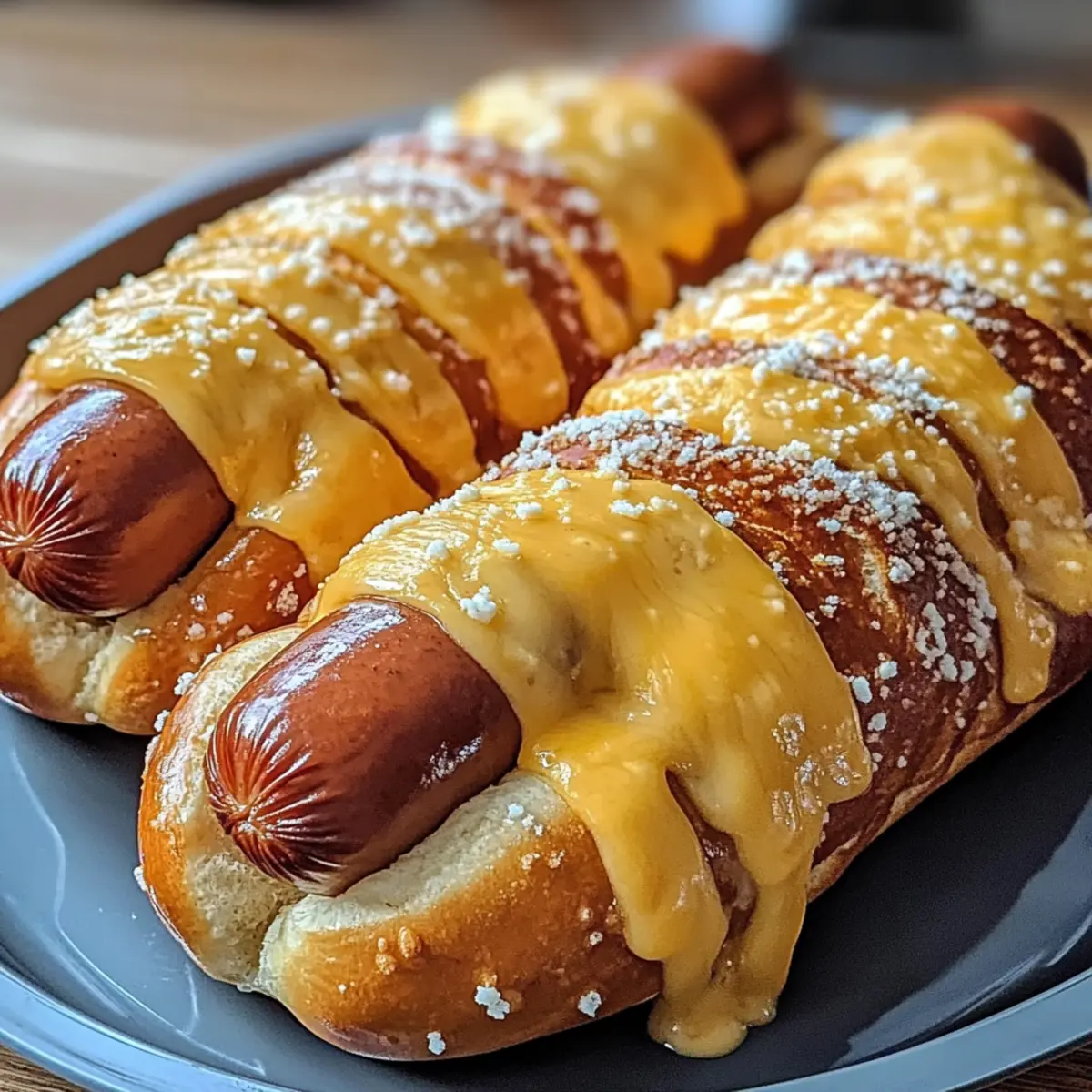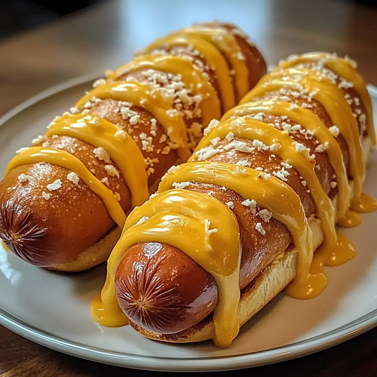 Enen leckeren Snack auf die Schnelle zaubern ist manchmal eine kleine Kunst für sich, nicht wahr? Mit meinen Käsebrezelhunden lade ich euch ein, die ultimative Kombination aus deftigen Hot Dogs und schmelzendem Käse in einem himmlisch weichen Teig zu entdecken. Dieses Rezept ist nicht nur einfach und schnell zuzubereiten, sondern auch perfekt für gesellige Abende mit Freunden oder für einen gemütlichen Filmeabend mit der Familie. Ob würziger Cheddar oder cremiger Mozzarella – eurer Kreativität sind keine Grenzen gesetzt. Lasst uns gemeinsam herausfinden, wie diese köstlichen Bissen zum echten Showstopper auf eurem Tisch werden! Warum wirst du Käsebrezelhunde lieben? Einfachheit: Die Zubereitung ist unkompliziert und erfordert nur grundlegende Backfähigkeiten, sodass ihr schnell und ohne großen Aufwand genießen könnt. Vielfalt: Mit individuell anpassbaren Käsesorten, wie Cheddar oder Mozzarella, könnt ihr diese Käsebrezelhunde nach eurem Geschmack gestalten. Perfekter Snack: Ideal für jede Gelegenheit, sei es eine Gartenparty, ein Familienfilmabend oder einfach nur ein Snack für zwischendurch. Wohlfühlfaktor: Der köstliche Duft und die warmen, weichen Teigbissen erinnern an Jahrmärkte und machen jeden Biss zu einem Erlebnis. Praktisch: Ideal zum Vorbereiten; ihr könnt sie im Voraus zubereiten und bei Bedarf schnell aufwärmen, was sie perfekt für hektische Tage macht! Käsebrezelhunde Zutaten • Diese Liste der Zutaten garantiert dir die besten Käsebrezelhunde! Für den Teig Warme Wasser – aktiviert die Hefe zum Aufgehen; verwende Wasser mit 43°C für beste Ergebnisse. Aktive Trockenhefe – fermentiert den Teig, wodurch Kohlendioxid entsteht und eine luftige Struktur entsteht. Zucker – füttert die Hefe und bringt die perfekte Balance zur Salzigkeit; für süßeren Teig erhöhen. Weißes Mehl – sorgt für die Struktur und ergibt ein zartes, zähes Innenleben. Salz – verstärkt den Geschmack und stärkt das Gluten im Teig für elastische Eigenschaften. Backsoda (für die Brezelbad) – schafft eine alkalische Umgebung für eine glänzende Kruste. Großes Ei (verquirlt) – verleiht dem Teig Glanz und hilft, das Salz zu haften. Für die Füllung Hot Dogs – die herzhafte Füllung; könnt ihr auch traditionelle Wurst oder pflanzliche Optionen verwenden. Käse (Cheddar, Mozzarella, oder Pepper Jack) – sorgt für ein schmelzendes Zentrum; nach Belieben austauschbar. Für das finishing Grobkörniges Salz – zum Bestreuen, fügt einen zusätzlichen Geschmack und Textur hinzu. Optionale Dipsauce – Senf oder Käsesauce für das gewisse Extra. Schritt-für-Schritt-Anleitung für Käsebrezelhunde Step 1: Hefe aktivieren Erhitze 240 ml warmes Wasser auf etwa 43°C und gib die aktive Trockenhefe sowie den Zucker dazu. Rühre leicht um und lasse die Mischung etwa 5 Minuten stehen, bis sie schaumig wird. Dies zeigt an, dass die Hefe aktiv ist und bereit, den Teig aufgehen zu lassen. Step 2: Teig herstellen Vermische 400 g weißes Mehl und 10 g Salz in einer großen Schüssel. Füge nun die Hefe-Mischung hinzu und rühre alles mit einem Holzlöffel, bis sich ein schlaffer Teig bildet. Manchmal ist es hilfreich, die Hände zum Kneten zu benutzen, um sicherzustellen, dass alles gut vermischt ist. Step 3: Teig kneten Streue etwas Mehl auf eine floured Fläche und forme den Teig zu einer Kugel. Knete ihn für 5–7 Minuten, bis er glatt und elastisch ist. Achte darauf, dass der Teig nicht zu klebrig ist; falls nötig, füge schrittweise mehr Mehl hinzu, um die richtige Konsistenz zu erreichen. Step 4: Teig gehen lassen Platziere die geknetete Teigkugel in einer leicht geölten Schüssel und decke sie mit einem feuchten Küchentuch ab. Stelle die Schüssel an einen warmen Ort und lasse den Teig etwa 1 Stunde ruhen, bis er sich in der Größe verdoppelt hat. Dies sorgt dafür, dass die Käsebrezelhunde schön luftig werden. Step 5: Ofen vorheizen Heize deinen Ofen auf 230°C vor und lege ein Backblech mit Backpapier aus. Diese Vorbereitungen sind wichtig, um sicherzustellen, dass die Käsebrezelhunde gleichmäßig und goldbraun gebacken werden. Step 6: Brezelbad zubereiten Bringe 1 Liter Wasser in einem großen Topf zum Kochen und füge 50 g Backsoda hinzu. Reduziere die Hitze, sodass das Wasser leicht köchelt. Dieses Brezelbad sorgt für die typische Textur und den Glanz der Käsebrezelhunde. Step 7: Teig formen Schlage den gegangenen Teig nach dem Gehen sanft zusammen und teile ihn in 8 gleich große Stücke. Rolle jedes Stück zu einem langen Strang und wickele ihn um die Hot Dogs. Stelle sicher, dass der Teig die Würste gut umschließt und die Enden fest verschlossen sind. Step 8: Käse einfüllen Platziere eine Scheibe Käse deiner Wahl, wie Cheddar oder Mozzarella, auf jeden Hot Dog, bevor du den Teig darum wickelst. Achte darauf, dass die Käsestücke mitten im Teig versteckt sind, damit sie beim Backen schmelzen und nicht auslaufen. Step 9: Brezelbad durchführen Setze die vorbereiteten Käsebrezelhunde vorsichtig in das köchelnde Wasser und lasse sie für 30 Sekunden auf jeder Seite baden. Verwende eine Schaumlöffel, um sie herauszunehmen und auf das Backblech zu setzen. Dieser Schritt sorgt für die typische Brezelgeschmack und Textur. Step 10: Backen Bestriche die Käsebrezelhunde mit dem verquirlten Ei und streue grobes Salz darüber. Schiebe das Blech in den vorgeheizten Ofen und backe die Käsebrezelhunde etwa 12-15 Minuten lang, bis sie goldbraun und knusprig sind. Step 11: Abkühlen und Servieren Nachdem du die Käsebrezelhunde aus dem Ofen genommen hast, lasse sie kurz auf einem Kuchengitter abkühlen. Serviere sie warm mit deinen Lieblings-Dipsaucen wie Senf oder Käsesauce für ein noch besseres Geschmackserlebnis. Lagerungstipps für Käsebrezelhunde Raumtemperatur: Bewahre die Käsebrezelhunde in einem abgedeckten Behälter für bis zu 24 Stunden auf, um die Frische zu erhalten. Kühlschrank: Wickele sie in Frischhaltefolie und lagere sie bis