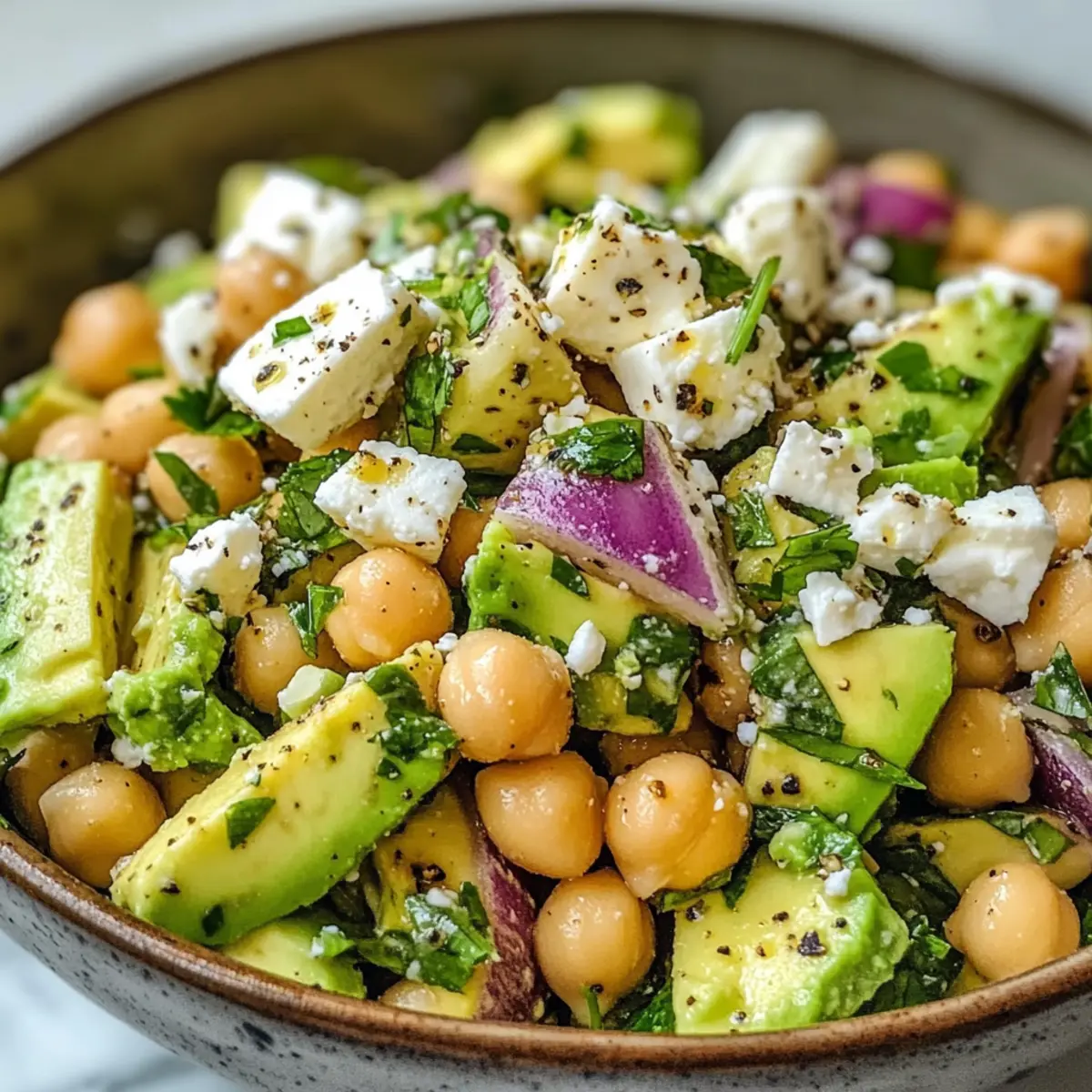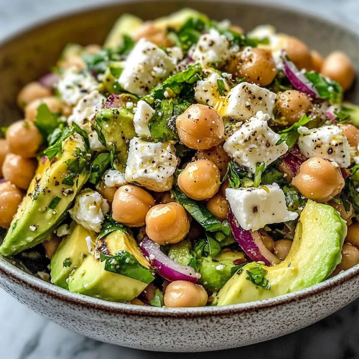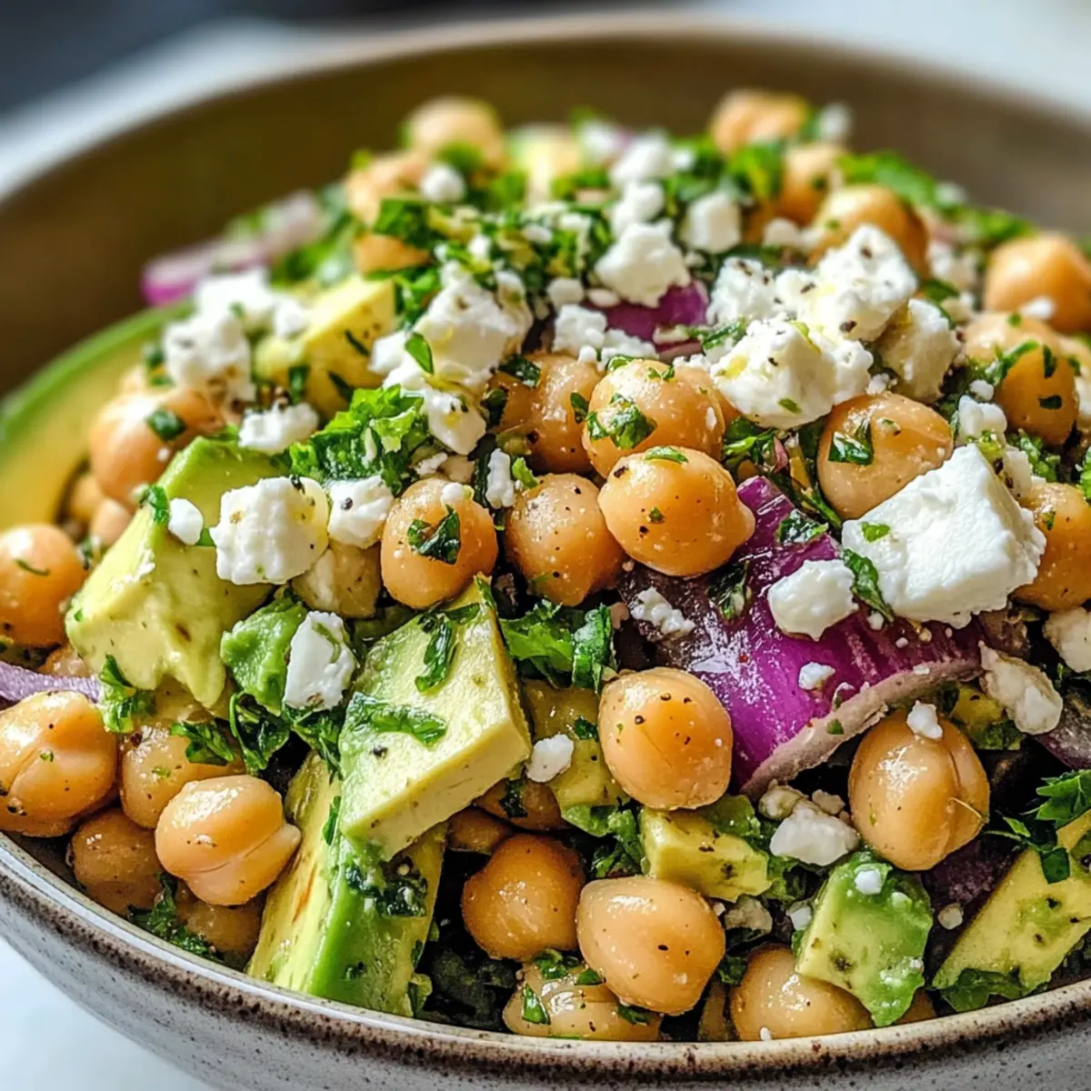 Stell dir vor, du beißt in eine erfrischende Mischung aus Aromen, die die Sinne beleben – genau das erwartet dich mit meinem Kichererbsen Feta Avocado Salat. Die cremige Textur des reifen Avocados harmoniert perfekt mit dem salzigen Feta und den herzhaften Kichererbsen, sodass dieses Gericht zum idealen leichten Mittagessen oder als schmackhafte Beilage für das Abendessen wird. In nur 15 Minuten zubereitet, ist dieser Salat nicht nur gesund und glutenfrei, sondern auch eine unkomplizierte Möglichkeit, frische mediterrane Geschmäcker zu genießen. Du wirst begeistert sein, wie schnell und einfach du mit minimalem Aufwand ein Gericht zubereiten kannst, das sowohl nährstoffreich ist als auch den Gaumen erfreut. Neugierig, wie du beim nächsten Mal mit Variationen spielen kannst? Warum solltest du diesen Salat ausprobieren? Frische Geschmacksexplosion: Der Kichererbsen Feta Avocado Salat vereint Aromen, die dich begeistern werden. Einfacher Genuss: In nur 15 Minuten zubereitet, ist dieser Salat perfekt für stressige Tage. Vielseitig anpassbar: Verleihe deinem Gericht persönliche Noten, indem du Zutaten wie Paprika oder Kirschtomaten hinzufügst. Gesund und herzhaft: Mit proteinreichen Kichererbsen und gesunden Fetten aus der Avocado unterstützt er einen aktiven Lebensstil. Perfekt für jede Gelegenheit: Ob als leichtes Mittagessen oder als Beilage zu gegrilltem Fleisch, dieser Salat wird jeden begeistern. Genuss mit gutem Gewissen: Glutenfrei und nährstoffreich ist er eine ideale Wahl für gesundheitsbewusste Esser. Du möchtest noch mehr frische Inspiration? Schau dir auch unseren Bunter Kinder Nudelsalat an, oder entdecke unsere Zarten Rinderbissen Mit! Kichererbsen Feta Avocado Salat Zutaten • Gesundheit im Fokus: Diese Zutaten machen deinen Kichererbsen Feta Avocado Salat zum Highlight! Für den Salat Kichererbsen – sorgen für wertvolles Protein und Ballaststoffe; gründlich abtropfen und abspülen. Avocado – bringt eine cremige Konsistenz und gesunde Fette; wähle eine reife, aber feste Frucht. Feta-Käse – liefert einen salzigen, würzigen Geschmack; achte auf qualitativ hochwertigen Feta und zerbrösele ihn für die beste Textur. Rote Zwiebel – fügt Crunch und milde Schärfe hinzu; dünn schneiden für eine gleichmäßige Verteilung. Frische Petersilie – bringt frische Kräuternoten; fein gehackt für ein gleichmäßiges Aroma. Frische Minze – verleiht eine erfrischende Note; ebenfalls fein gehackt verwenden. Für das Dressing Olivenöl – dient als Basis für das Dressing und sorgt für reichhaltigen Geschmack; extra vergine für das beste Aroma wählen. Zitronensaft – bringt Säure ins Spiel, die die Cremigkeit der Avocado und den Käse ausgleicht; frisch gepresst ist am besten. Knoblauch – fügt Tiefe und Würze hinzu; fein gehackt für eine gleichmäßige Verteilung. Getrockneter Oregano – bringt erdige Noten ins Dressing; ideal für einen mediterranen Geschmack. Salz und Pfeffer – heben die Geschmäcker hervor; nach Geschmack anpassen. Schritt-für-Schritt-Anleitung für Kichererbsen Feta Avocado Salat Schritt 1: Kichererbsen vorbereiten Spüle die Kichererbsen gründlich unter kaltem Wasser ab und lasse sie in einem Sieb abtropfen. Dieser Schritt reduziert den Natriumgehalt und sorgt dafür, dass deine Kichererbsen für den Kichererbsen Feta Avocado Salat frisch und knackig bleiben. Stelle sicher, dass alle Kichererbsen gut abgespült sind, bevor du fortfährst. Schritt 2: Gemüse und Kräuter schneiden Halbiere die reife Avocado, entferne den Kern und würfele das Fruchtfleisch sorgfältig. Schneide die rote Zwiebel in feine Ringe und hacke die frische Petersilie sowie die Minze klein. Gib diese Zutaten zusammen mit den Kichererbsen in eine große Schüssel, sodass sich die verschiedenen Aromen gleichmäßig vermischen können. Schritt 3: Feta zubereiten Zerbrösele den hochwertigen Feta-Käse über die anderen Zutaten in der Schüssel. Der Feta bringt seinen salzigen und würzigen Geschmack in den Kichererbsen Feta Avocado Salat ein und sorgt für eine herrliche Cremigkeit. Achte darauf, die Stücke gleichmäßig zu verteilen, damit jeder Bissen wunderbar geschmackvoll ist. Schritt 4: Dressing zubereiten In einer separaten kleinen Schüssel vermischst du das Olivenöl, den frisch gepressten Zitronensaft, den gehackten Knoblauch, den getrockneten Oregano, sowie Salz und Pfeffer nach Geschmack. Verquirle die Zutaten gründlich für etwa 1-2 Minuten, bis sie gut verbunden sind und das Dressing eine cremige Konsistenz erhält. Schritt 5: Salat anrichten Gieße das vorbereitete Dressing über die Salatzutaten in der großen Schüssel. Mische alles vorsichtig mit einem großen Löffel, um die Avocado nicht zu zerdrücken. Diese Methode bewahrt die Integrität der Avocados und sorgt für eine angenehme Textur im Kichererbsen Feta Avocado Salat. Schritt 6: Servieren und genießen Der Kichererbsen Feta Avocado Salat kann sofort serviert werden oder etwa 2 Stunden im Kühlschrank gekühlt werden, um die Aromen weiter zu intensivieren. Gerne kannst du ihn als leichte Hauptspeise genießen oder als Beilage zu gegrilltem Fleisch reichen. Beachte die appetitliche Farbenpracht, die die Zutaten gemeinsam kreieren! Expert Tips für Kichererbsen Feta Avocado Salat Avocado frisch halten: Vermeide die Braunfärbung, indem du das gewürfelte Avocado direkt nach dem Schneiden mit Zitronensaft vermischst. Hasten mit Vorbereitung: Vorbereitetes Gemüse sparen Zeit; greife auf vorgehackte Optionen zurück, um deinen Kichererbsen Feta Avocado Salat im Handumdrehen fertigzustellen. Kräuter gut dosieren: Bei der Verwendung von getrockneten Kräutern solltest du die Menge halbieren, um den Geschmack nicht zu überlagern. Richtig servieren: Dieser Salat wird am besten kalt oder bei Zimmertemperatur serviert; vermeide es, ihn aufzuwärmen, um die frischen Aromen zu bewahren. Variationen erkunden: Experimentiere mit farbenfrohen Gemüsesorten wie Paprika oder Kirschtomate