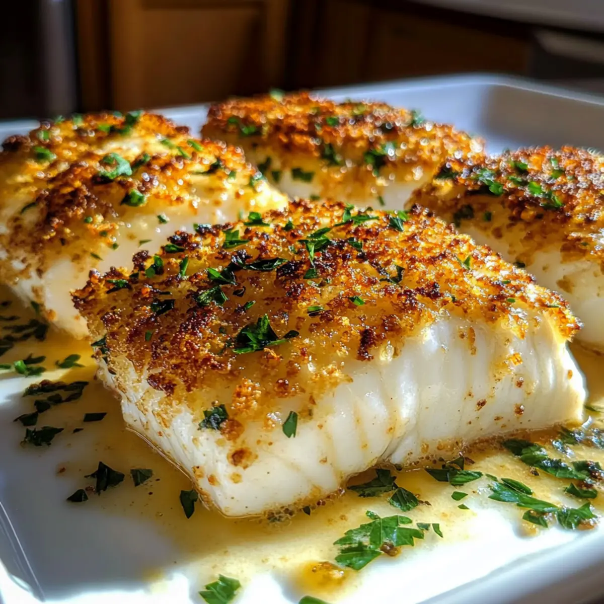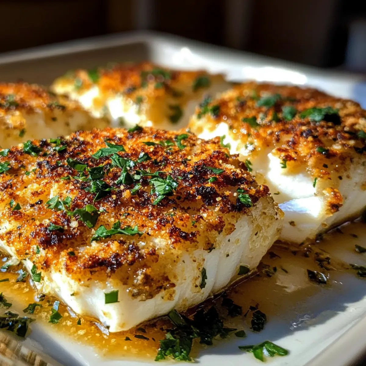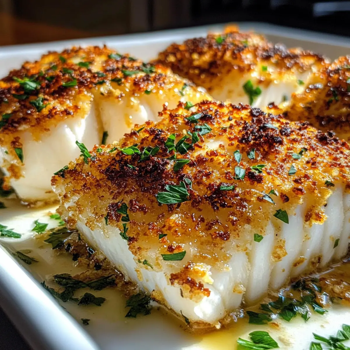 Wenn ich den köstlichen Duft von gebackenem Knoblauch in der Luft schnuppern kann, fühle ich mich sofort in meine eigene kleine Küchente Oase versetzt. Mein neues Lieblingsrezept, die Knoblauch Parmesan Kruste Heilbutt, ist nicht nur eine Freude für die Sinne, sondern auch eine wahre Feier der Einfachheit. In nur 10 Minuten Zubereitung und 15 Minuten im Ofen zaubern wir ein Gericht, das sich perfekt für ein schnell zubereitetes Abendessen an Wochentagen eignet. Diese Kombination aus einer knusprigen, goldfarbenen Kruste und zartem Fisch ist nicht nur ein absoluter Leckerbissen, sondern auch kalorienbewusst – ideal für alle, die auf gesunde Ernährung achten, ohne auf Genuss zu verzichten. Bist du bereit, deine Gäste mit diesem unkomplizierten Rezept zu beeindrucken? Lass uns gemeinsam ins Backvergnügen eintauchen! Warum wirst du dieses Rezept lieben? Einfachheit in Perfektion: Die Zubereitung ist kinderleicht, sodass auch Kochanfänger in 10 Minuten starten können. Aromatische Kombination: Der kräftige Knoblauchgeschmack vermischt sich wunderbar mit dem herzhaften Parmesan, um den Heilbutt zu verfeinern. Familienfreundlich: Dieses Gericht begeistert Groß und Klein und eignet sich ideal für ein schnelles Abendessen während der Woche. Variation möglich: Du kannst den Heilbutt problemlos durch anderen Fisch, wie Lachs, ersetzen oder verschiedene Kräuter hinzufügen, um neue Geschmäcker auszuprobieren. Probiere dazu beispielsweise unser Rezept für Cremiges Parmesan Hühnchen. Gesunde Wahl: Mit nur 280 Kalorien pro Portion ist es perfekt für alle, die auf ihre Ernährung achten möchten, ohne auf Genuss zu verzichten! Knoblauch Parmesan Kruste Heilbutt Zutaten • Bereite dich darauf vor, den ultimativen Genuss zu erleben! Für den Heilbutt Heilbuttfilets – Hauptzutat, die beim Garen zart und leicht flockig wird; frische Filets sorgen für das beste Ergebnis. Für die Kruste Geriebener Parmesan – Fügt herzhaften Geschmack hinzu und sorgt für die knusprige Kruste; vermeide pulverisierte Varianten für höhere Qualität. Breadcrumbs – Verleiht der Kruste eine tolle Textur; ersetze sie durch Panko für zusätzlichen Crunch. Gehackter Knoblauch – Bringt intensiven Knoblauchgeschmack in die Kruste; frischer Knoblauch sorgt für die beste Note. Geschmolzene Butter – Verbindet die Zutaten der Kruste und fügt Reichhaltigkeit hinzu; kann durch Olivenöl für eine leichtere Option ersetzt werden. Olivenöl – Unterstreicht den Geschmack und sorgt für Feuchtigkeit; optional, wenn genug Butter verwendet wird. Zitronensaft – Bringt Frische in das Gericht und balanciert die Reichhaltigkeit; frische Zitrone ist vorzuziehen. Salz und Pfeffer – Wesentliche Gewürze, um die Aromen zu verstärken. Für die Garnitur Frische Petersilie – Für eine bunte und frische Note, die das Gericht perfekt abrundet. Mit diesen Zutaten wirst du eine köstliche Knoblauch Parmesan Kruste Heilbutt kreieren, die deine Gäste beeindrucken wird! Schritt-für-Schritt-Anleitung für Knoblauch Parmesan Kruste Heilbutt Step 1: Ofen vorheizen Heize deinen Ofen auf 200°C vor. Dies ist wichtig, damit der Heilbutt gleichmäßig gart und die Kruste schön knusprig wird. Nutze ein Backblech und lege es mit Backpapier aus, um das Ankleben des Fischs zu vermeiden und die Reinigung zu erleichtern. Step 2: Krustenmischung herstellen In einer mittelgroßen Schüssel vermischst du den geriebenen Parmesan, die Breadcrumbs, den gehackten Knoblauch, die geschmolzene Butter, das Olivenöl, den Zitronensaft sowie Salz und Pfeffer. Rühre, bis die Mischung die Konsistenz von feuchtem Sand erreicht; lasse sie 5 Minuten ruhen, damit die Aromen sich entfalten können. Step 3: Heilbutt vorbereiten Platziere die Heilbuttfilets gleichmäßig auf dem vorbereiteten Backblech. Achte darauf, dass sie genug Platz haben, damit die heiße Luft zirkulieren kann. Überprüfe, dass die Filets vollständig trocken sind, damit die Kruste besser haftet und gleichmäßig gebacken wird. Step 4: Kruste auftragen Nehme die Krustenmischung und drücke sie großzügig auf jede Seite der Heilbuttfilets, sodass eine etwa 1/2 cm dicke Schicht entsteht. Diese Knoblauch Parmesan Kruste sorgt für ein tolles Aroma und eine herrliche Textur, also achte darauf, dass jeder Fisch gut bedeckt ist. Step 5: Backen Schiebe das Backblech in den vorgeheizten Ofen und backe die Heilbuttfilets für 12-15 Minuten. Achte darauf, dass die Kruste goldbraun und knusprig wird. Der Fisch sollte leicht mit einer Gabel zerfallen, wenn er gar ist. Step 6: Servieren Nimm die Knoblauch Parmesan Kruste Heilbutt aus dem Ofen und lasse sie kurz ruhen. Bestreue die Filets mit frischer Petersilie für eine farbenfrohe Garnitur. Serviere das Gericht sofort, damit die Kruste schön knusprig bleibt und der Geschmack der Aromen voll zur Geltung kommt. Was passt gut zu Knoblauch Parmesan Kruste Heilbutt? Genieße die köstliche Knoblauch Parmesan Kruste Heilbutt mit perfekten Beilagen, die die Aromen auf ein neues Level heben. Knusprige Ofenpommes: Diese goldbraunen Pommes sind einfach zuzubereiten und bieten einen tollen Kontrast zur zarten Textur des Fisches. Ihre knusprige Oberfläche harmoniert perfekt mit der Kruste. Gerösteter Spargel: Die erdigen Aromen des Spargels ergänzen den reichen Geschmack des Knoblauch-Parmesan-Fisches. Ein Spritzer Zitrone darauf verstärkt die Frische des Gerichts. Zitronige Rucolasalat: Dieser Salat bringt eine leichte, pfeffrige Note und ergänzt die Reichhaltigkeit der Kruste. Mit etwas Parmesan und Pinienkernen wird er zum perfekten, knackigen Antipasto. Cremige Kartoffelpüree: Das seidig-weiche Püree bietet einen wunderbaren Kontrast zur knusprigen Kruste. Der Geschmack von Butter und Knoblauch im Püree passt ideal zu dem würzigen Fisch. Weißwein: Ein trockener Sauvignon Blanc unterstützt die Aromen des Knoblauch Parmesan Kruste Heilbutt und wertet das gesamte Essen auf. Frische Kräuterbutter: Dezent mit Kräutern verfeinert, ei