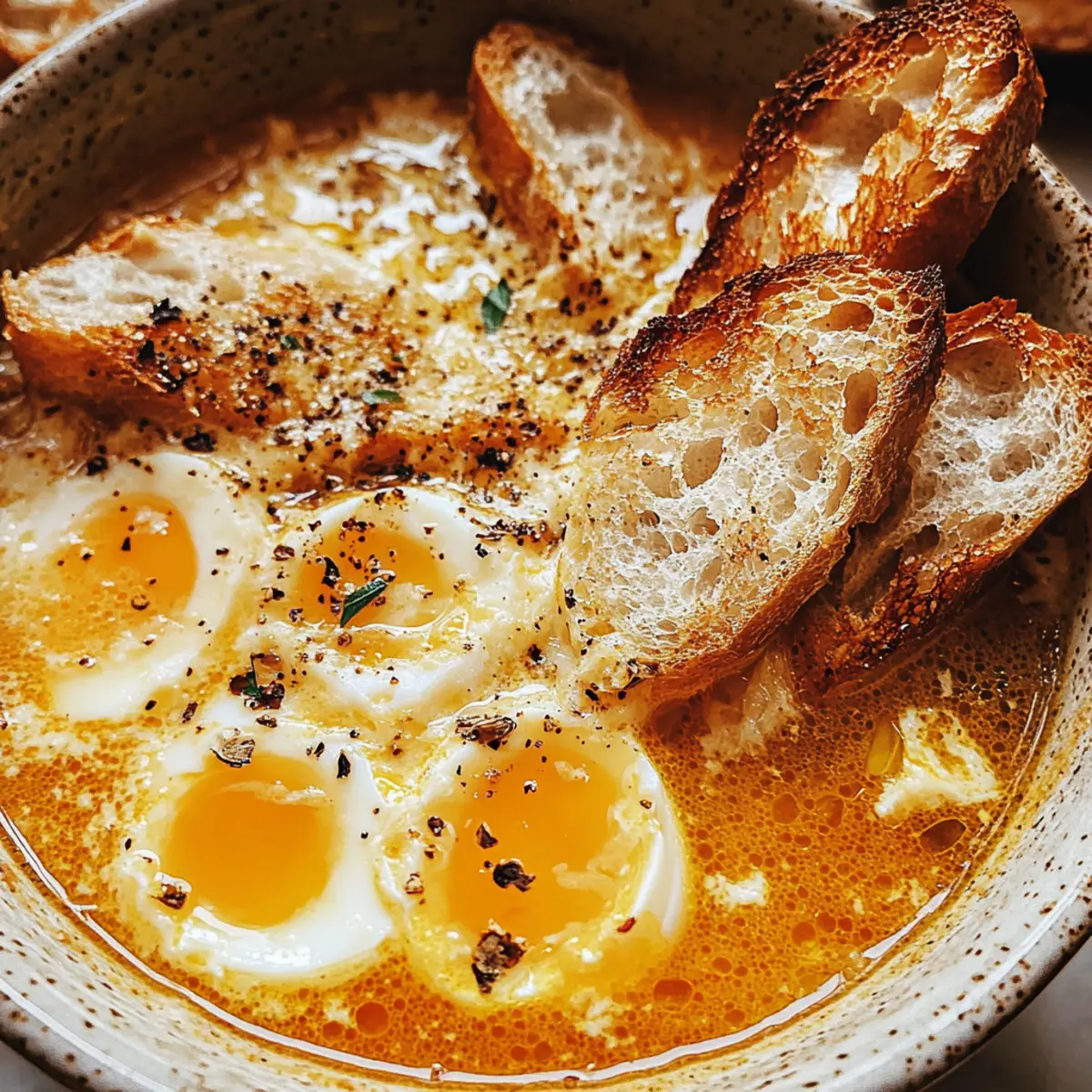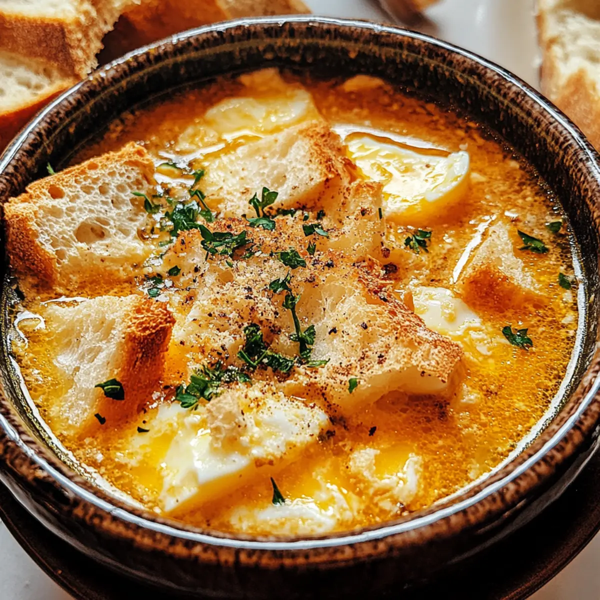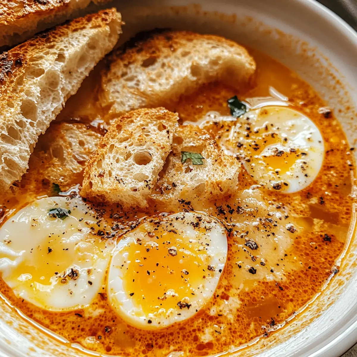 Wenn die kalten Tage anbrechen und man nach etwas Warmem sucht, schleicht sich oft ein ganz besonderer Gedanke in den Kopf: Knoblauchsuppe! Diese traditionelle spanische Sopa de Ajo begeistert nicht nur mit ihrem kräftigen Knoblauchgeschmack, sondern auch mit zarten Eierfäden, die der Suppe eine zugleich luxuriöse und herzliche Note verleihen. Perfekt für gemütliche Abende oder als nährende Umarmung für die Seele, lässt sich diese unkomplizierte Suppe aus wenigen, aber sättigenden Zutaten zubereiten. Ein weiterer Vorteil? Sie ist schnell gezaubert und eignet sich hervorragend zum Vorkochen. Wer könnte da widerstehen? Was wäre, wenn ich dir sage, dass du mit ein paar einfachen Zutaten ein Stück Spanien in deine Küche bringen kannst? Warum ist Knoblauchsuppe so besonders? Herzhaft und nahrhaft: Diese Knoblauchsuppe ist ein wirkliches Seelenwärmer-Rezept, das dich mit seinem kräftigen Aroma und der cremigen Textur sofort umhüllt. Einfach zuzubereiten: Die Zutaten sind unkompliziert und du benötigst kein Meisterkoch zu sein, um sie zu meistern. Vielseitig: Du kannst die Suppe mit Gemüse wie Spinat oder Grünkohl ergänzen oder sogar etwas Schärfe mit Cayennepfeffer hinzufügen, um das Geschmackserlebnis zu individualisieren. Schnelle Zubereitung: In nur wenigen Schritten verwandelst du frische Zutaten in ein köstliches Gericht – ideal für geschäftige Wochentage. Traditionell und kulturell: Diese traditionelle spanische Suppe ist nicht nur ein Genuss, sondern bringt auch einen Hauch von mediterranem Flair in dein Zuhause. Perfekt für jede Gelegenheit: Egal, ob als sättigende Hauptspeise oder als köstliche Vorspeise, die Knoblauchsuppe ist immer ein Hit. Probiere sie auch mal mit einem Stück Cremige Champignon Suppe, wenn du Lust auf Abwechslung hast! Knoblauchsuppe Zutaten Für die Suppe • Olivenöl – verleiht dem Sauté von Knoblauch eine reiche Tiefe. • Knoblauch – sorgt für die starke, aromatische Basis der Suppe; nutze 8 bis 10 Zehen, je nach gewünschter Intensität. • Stales Brot – dient als Verdicker und sorgt für eine traditionelle Konsistenz; frisches Brot kann verwendet werden, wenn es geröstet wird, um die Matschsuppe zu vermeiden. • Räucherpaprika (Pimentón) – bringt einen rauchigen Geschmack und eine schöne Farbe in die Suppe; keine direkte Substitution empfohlen. • Hühnerbrühe oder Gemüsebrühe – bildet die Basis der Suppe; verwende 6 bis 7 Tassen für die gewünschte Dicke. • Eier – geschlagen und hinzugefügt für Protein und eine luxuriöse, seidige Textur; plane 4 große Eier ein. • Salz und Pfeffer – sind entscheidend für die Geschmacksanpassung; nach Belieben anpassen. Verpasse nicht die Chance, diese herzliche Knoblauchsuppe zu genießen! Schritt-für-Schritt-Anleitung für Knoblauchsuppe Step 1: Knoblauch und Brot anbraten Erhitze in einem großen Topf bei mittlerer Hitze 3 Esslöffel Olivenöl. Füge die in Scheiben geschnittenen 8 bis 10 Knoblauchzehen hinzu und brate sie 2-3 Minuten lang an, bis sie goldbraun und aromatisch sind. Jetzt vorsichtig 1 Teelöffel rauchige Paprika hinzufügen und gut umrühren. Danach reiße 2-3 Scheiben altbackenes Brot in Stücke und gib sie für weitere 3 Minuten dazu, damit sie leicht knusprig werden. Step 2: Suppe köcheln lassen Gieße 6 bis 7 Tassen Hühner- oder Gemüsebrühe in den Topf und bringe die Mischung zum Kochen. Während die Brühe aufkocht, zerbrich das Brot mit einem Holzlöffel in kleinere Stücke, um die gewünschte Konsistenz zu erreichen. Lasse die Suppe dann bei niedriger Hitze 10 Minuten köcheln, bis das Brot und der Knoblauch gut verbunden sind und die Suppe eine leicht dickliche Konsistenz hat. Step 3: Eier hinzufügen Rühre die Suppe vorsichtig um, um einen kleinen Strudel zu erzeugen. Schlage 4 große Eier in einer Schüssel auf und gieße sie langsam in die heiße Suppe. Während du das tust, rühre sanft weiter, damit sich die Eier in feine Fäden verwandeln. Lasse die Suppe für weitere 2-3 Minuten leicht köcheln, bis die Eier durchgegart und in seidige Ribbons verwandelt sind. Step 4: Würzen Nimm die Suppe vom Herd und überprüfe ihre Konsistenz. Falls nötig, kannst du noch etwas Brühe hinzufügen, um die Suppe zu verdünnen. Schmecke die Knoblauchsuppe mit Salz, Pfeffer und eventuell noch etwas Paprika ab, um den Geschmack auszugleichen und zu intensivieren. Step 5: Servieren Lade die heiße Knoblauchsuppe in Schalen und genieße sie sofort. Du kannst sie optional mit einem Spritzer Olivenöl, etwas zusätzlicher Paprika oder frischer Petersilie garnieren. Serviere dazu knuspriges Brot oder einen frischen Salat für eine vollständige Mahlzeit. Expertentipps für Knoblauchsuppe • Richtige Temperatur: Achte darauf, den Knoblauch nur bis zur goldenen Farbe zu braten, damit er nicht bitter wird. • Brotwahl: Verwende altbackenes Brot für die traditionelle Konsistenz; frisches Brot sollte geröstet werden, um Matschsuppe zu vermeiden. • Eierschalen: Schlage die Eier in einer separaten Schüssel auf, bevor du sie in die heiße Suppe gießt, um gleichmäßige Ribbons zu erhalten. • Würzen nach Geschmack: Geschmack ist subjektiv, also passe Salz, Pfeffer und Paprika direkt in der Suppe an, um perfekt abgestimmte Knoblauchsuppe zu erzielen. • Einfrieren: Falls du Reste hast, bewahre die Suppe ohne das Brot auf; friere die Flüssigkeit ein, damit du sie später wieder genießen kannst. Lagerung und Einfrieren von Knoblauchsuppe Kühlschrank: Bewahre die Knoblauchsuppe in einem luftdichten Behälter auf und genieße sie innerhalb von 2 bis 3 Tagen für die beste Frische. Einfrieren: Friere die Suppe ohne das Brot in einem gefrierfreundlichen Behälter für bis zu 3 Monate ein. Füge das Brot beim Aufwärmen hinzu, um die Konsistenz zu bewahren. Aufwärmen: Erwärme die gefrorene Suppe langsam auf dem Herd und füge bei Bedarf einen Schuss Brühe hinzu, um die cremige Textur zu erhalten. Vorbereitung: Um eine matschige Textur zu ver