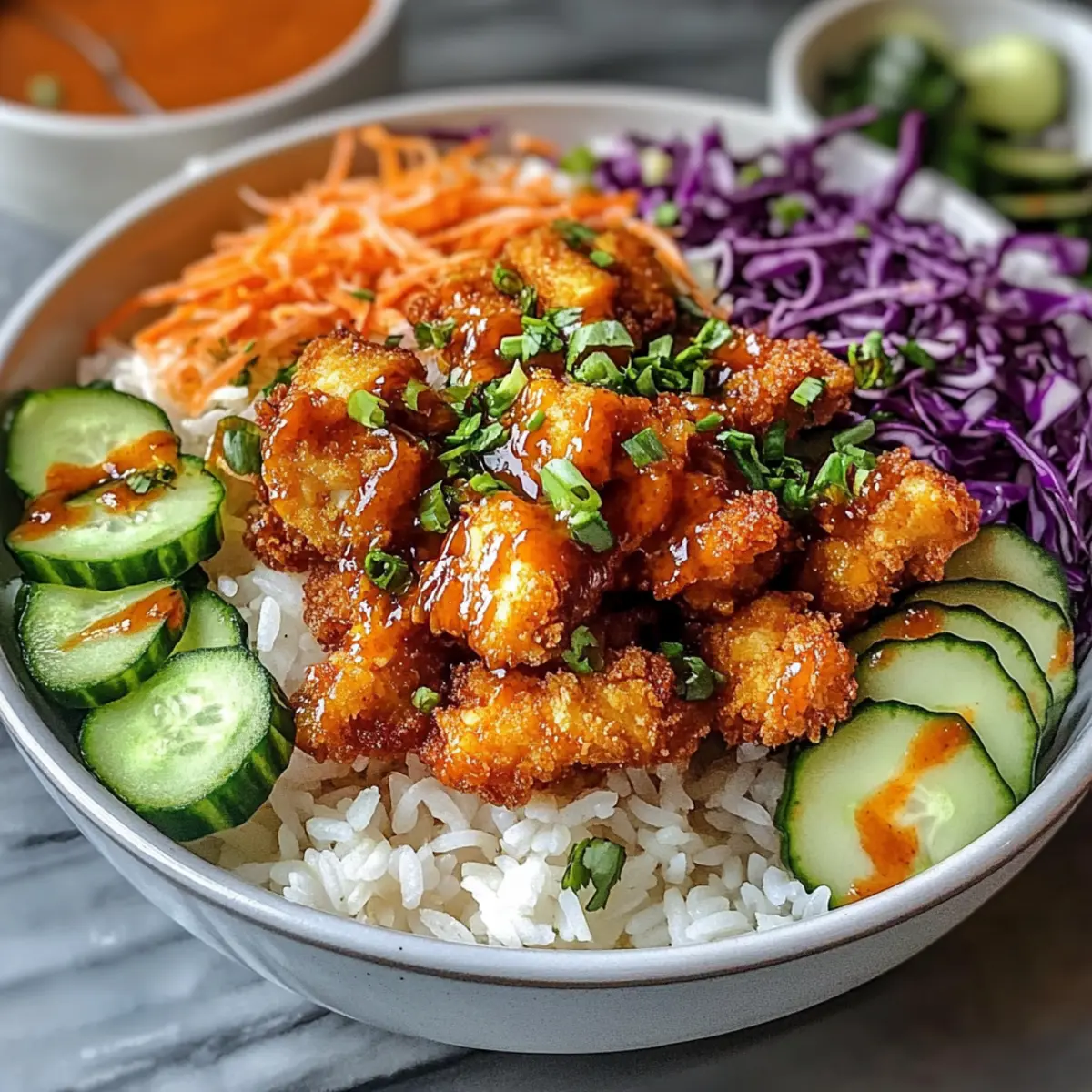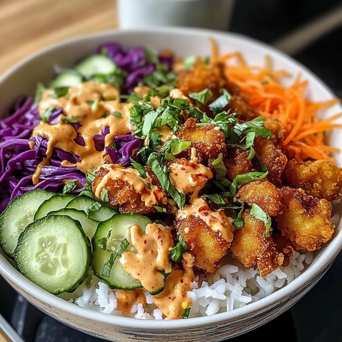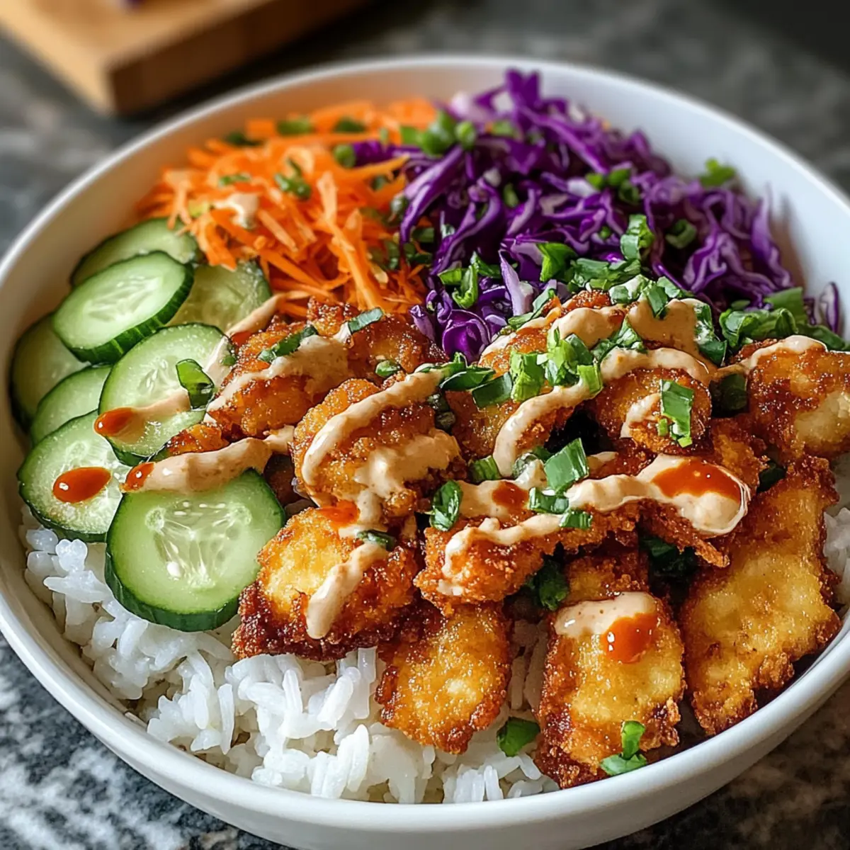 Die Knusprige Bang Bang Hühnchen Schüssel vereint knusprig gebratenes Hähnchen mit einer cremigen, leicht scharfen Sauce und frischem Gemüse.