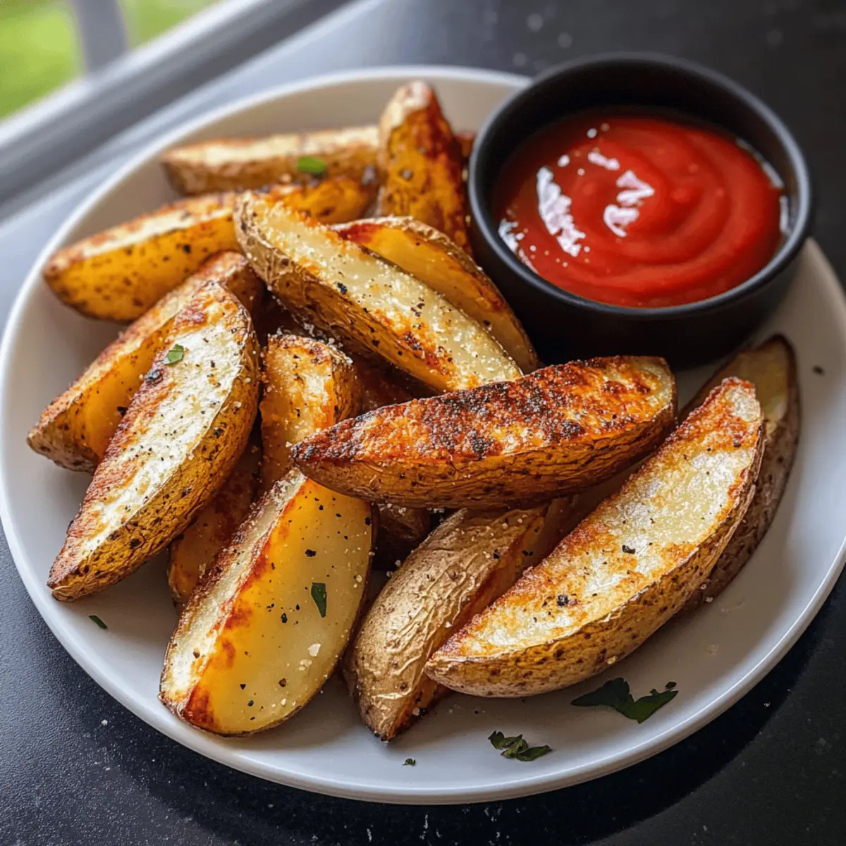 Genießen Sie knusprige Heißluftfritteusen-Kartoffelspalten als gesunde Beilage, die schnell zubereitet ist.